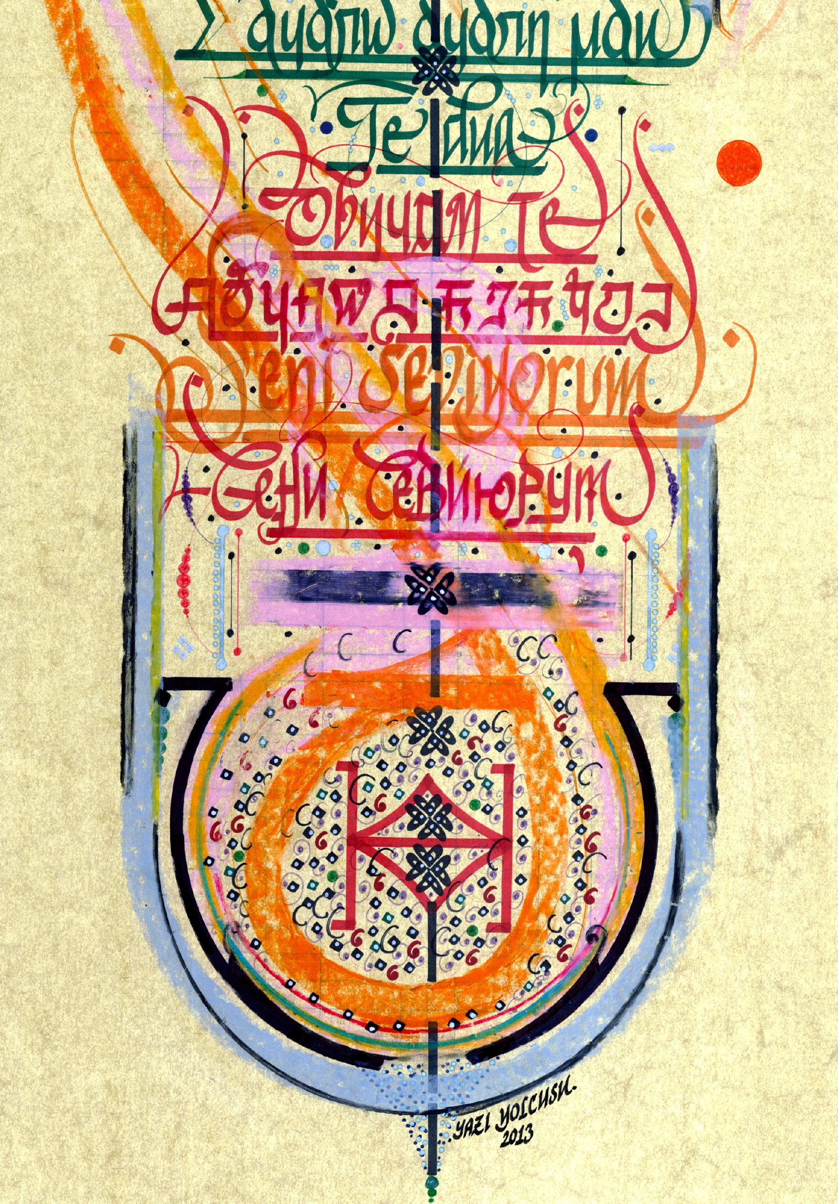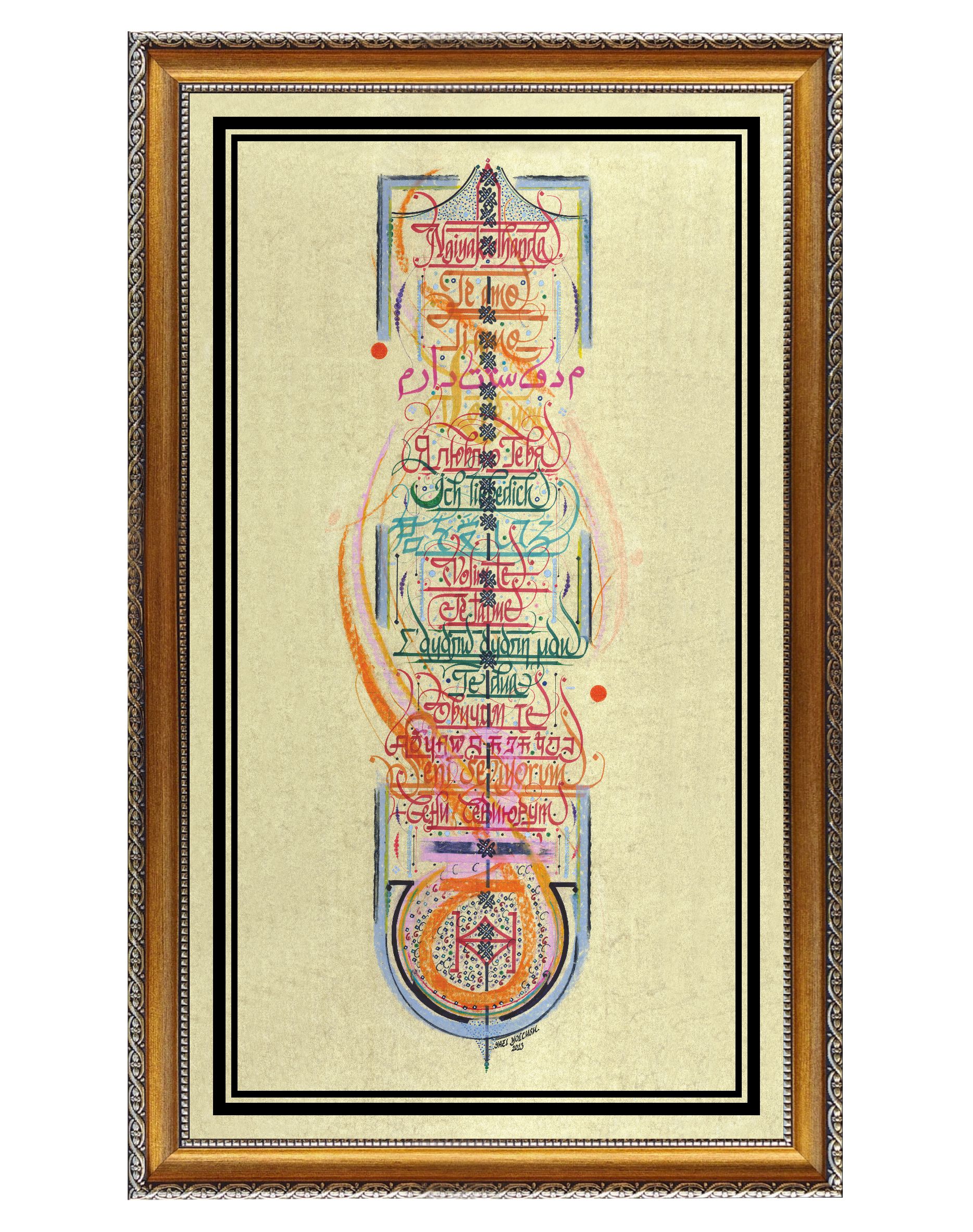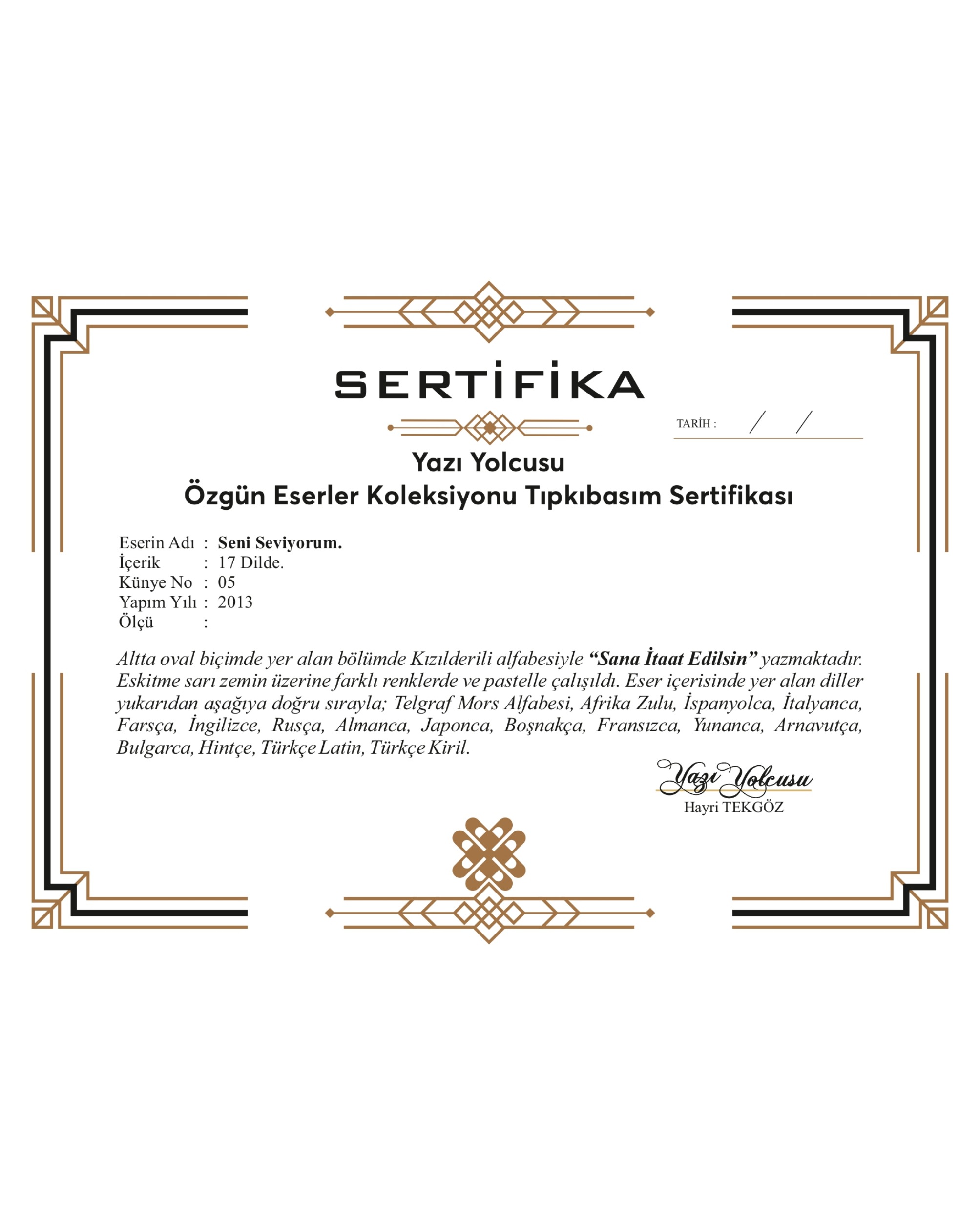 17 Dilde “Seni Seviyorum”. Altta oval biçimde yer alan bölümde Kızılderili alfabesiyle “Sana İtaat Edilsin” yazmaktadır. Eskitme sarı zemin üzerine farklı renklerde ve pastelle çalışıldı. Eser içerisinde yer alan diller, yukarıdan aşağıya doğru sırasıyla; “Telgraf Mors Alfabesi, Afrika Zulu, İspanyolca, İtalyanca, Farsça, İngilizce, Rusça, Almanca, Japonca, Boşnakça, Fransızca, Yunanca, Arnavutça, Bulgarca, Hintçe, Türkçe Latin, Türkçe Kiril”.