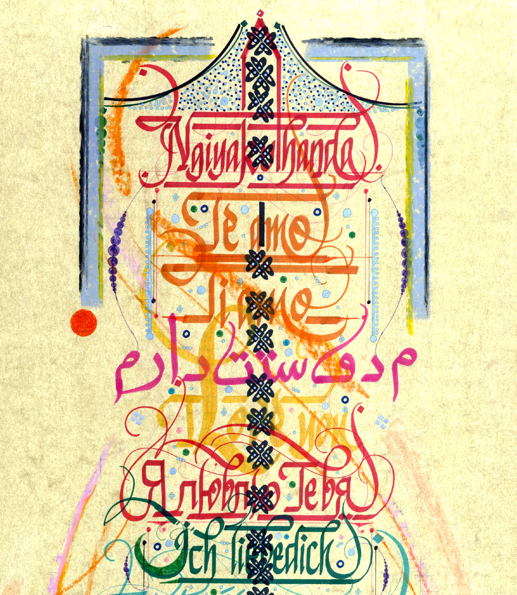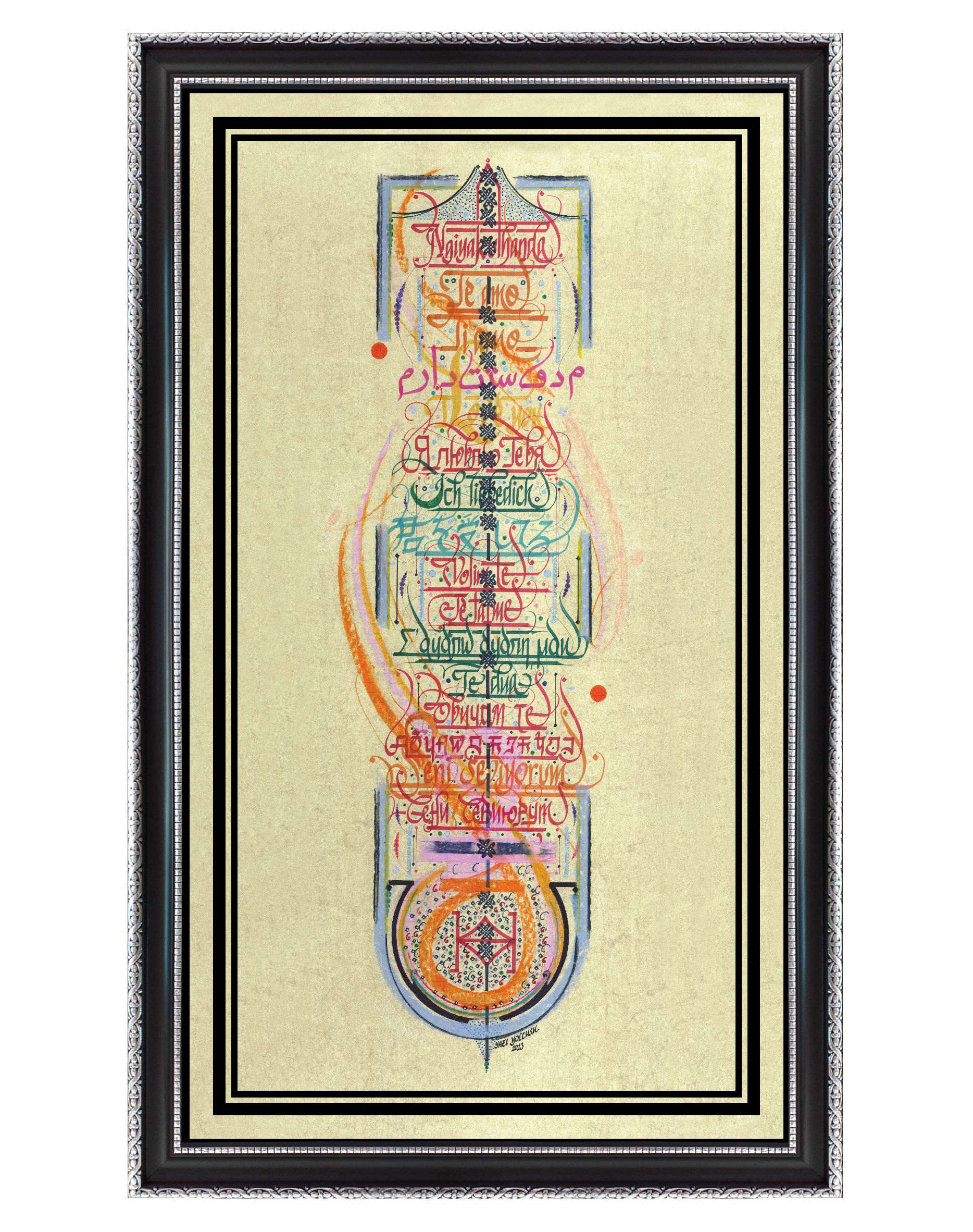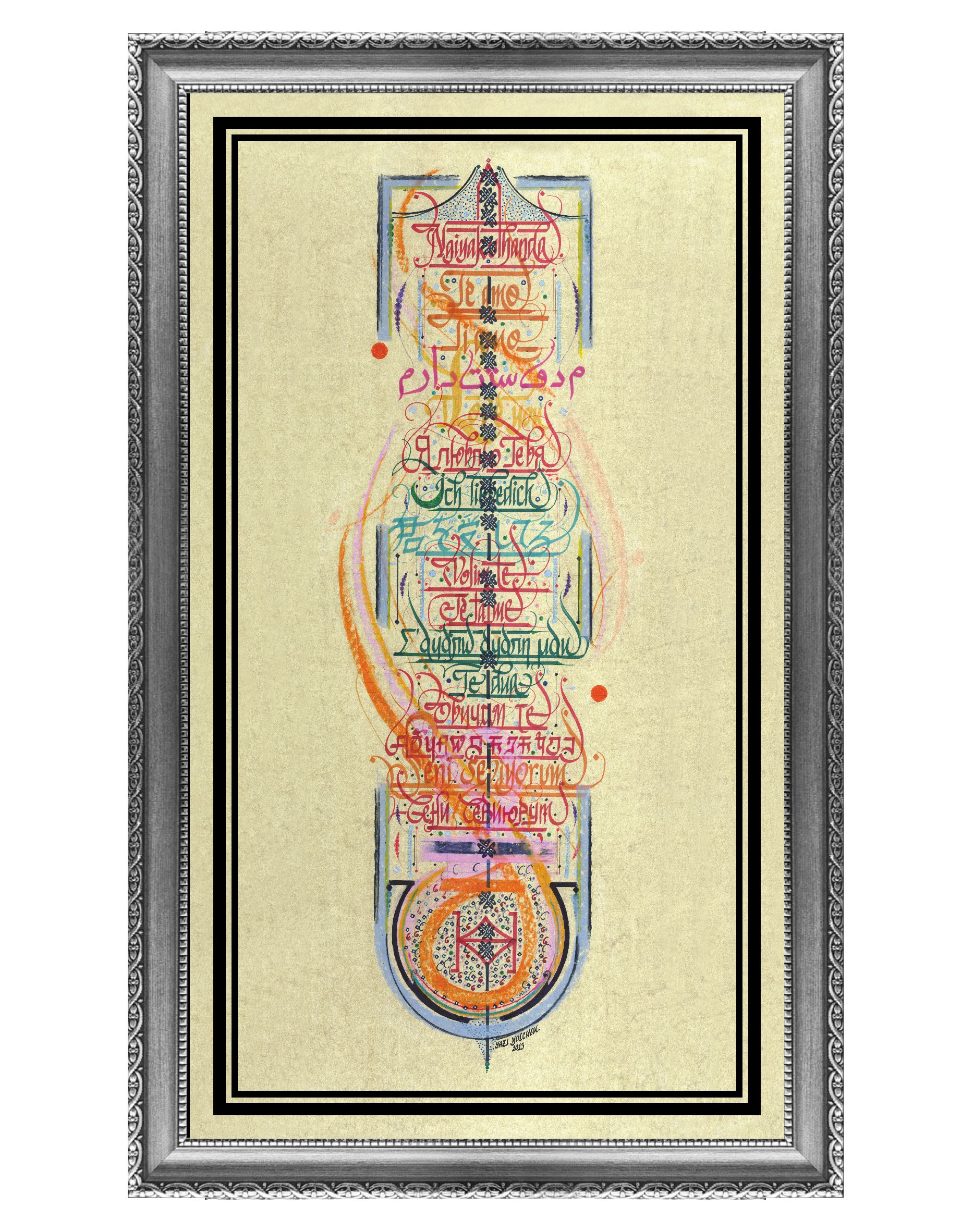 17 Dilde “Seni Seviyorum”. Altta oval biçimde yer alan bölümde Kızılderili alfabesiyle “Sana İtaat Edilsin” yazmaktadır. Eskitme sarı zemin üzerine farklı renklerde ve pastelle çalışıldı. Eser içerisinde yer alan diller, yukarıdan aşağıya doğru sırasıyla; “Telgraf Mors Alfabesi, Afrika Zulu, İspanyolca, İtalyanca, Farsça, İngilizce, Rusça, Almanca, Japonca, Boşnakça, Fransızca, Yunanca, Arnavutça, Bulgarca, Hintçe, Türkçe Latin, Türkçe Kiril”.