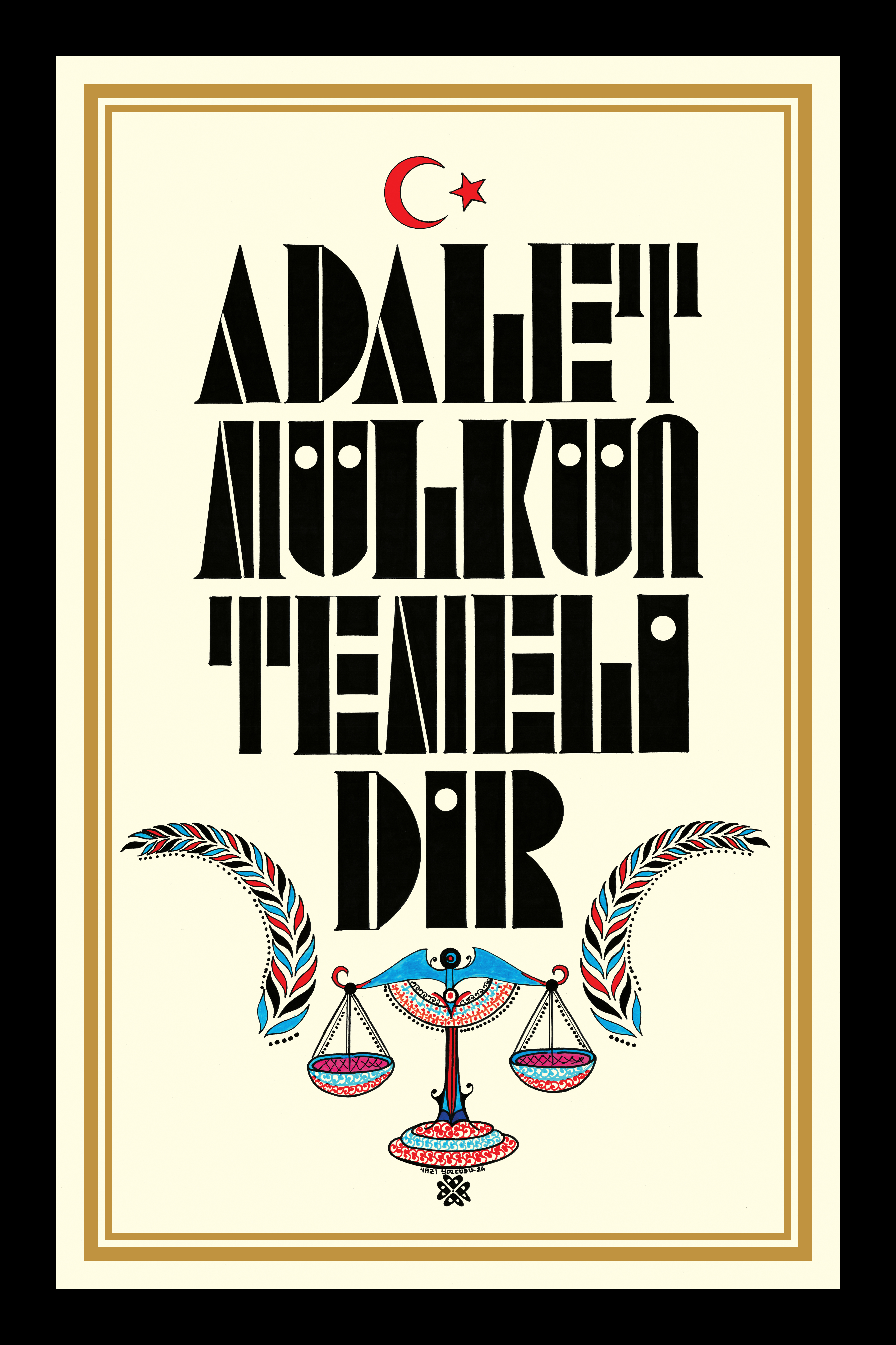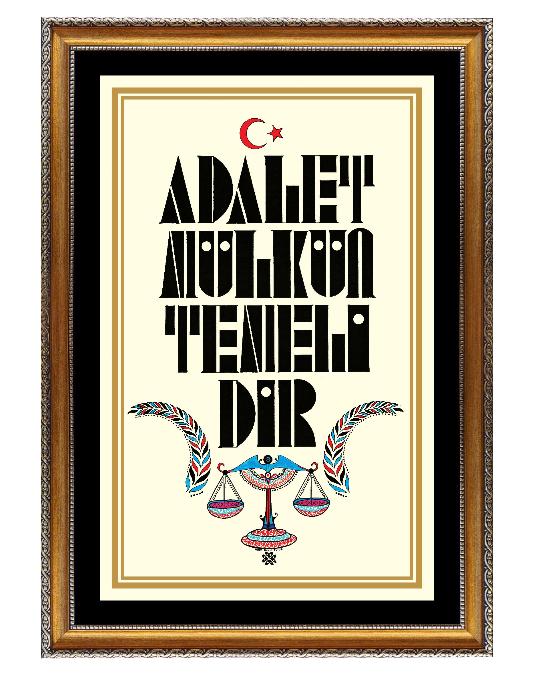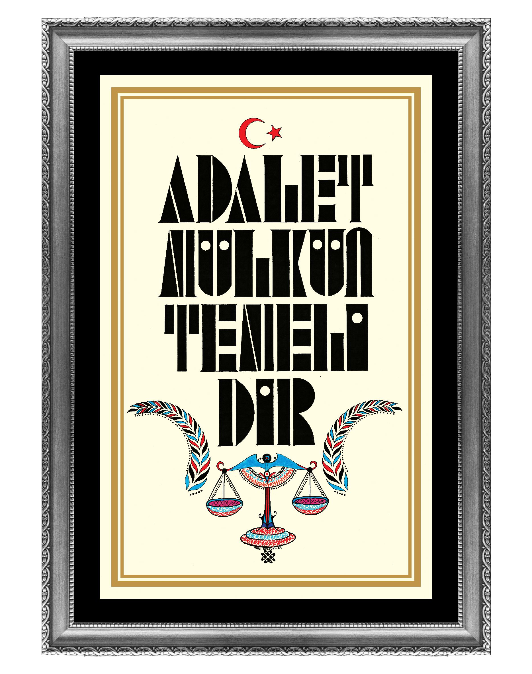 “Adalet Mülkün Temelidir.” Harfler geometrik şekillerden meydana getirilerek alt bölüme adaletin simgesi “terazi” resmedildi. Sağ ve sola bereket vurgusu yapılarak “buğday” görseli betimlendi ve üst bölüme “Ay Yıldız” tasarımıyla eser bütünlüğü sağlandı. Krem zemine çalışıldı.