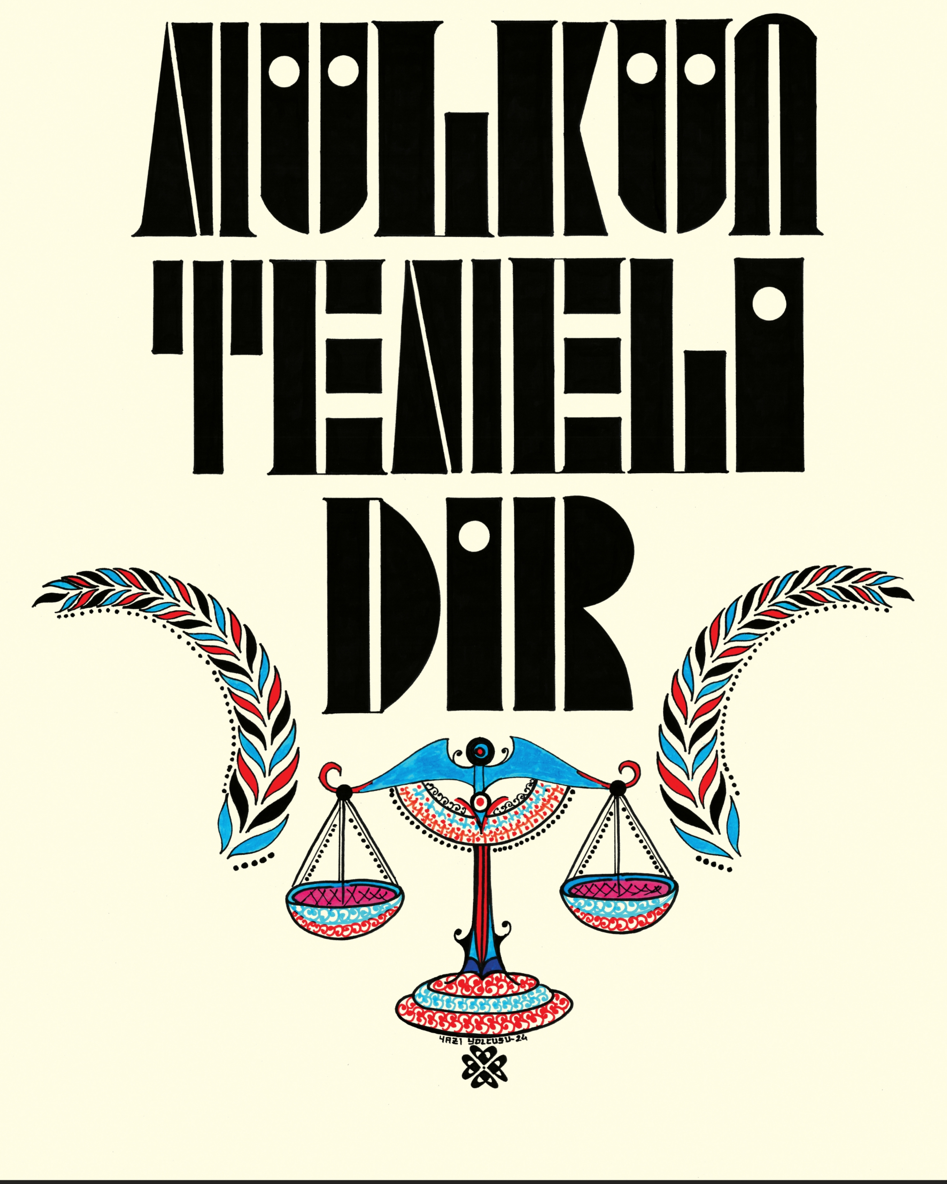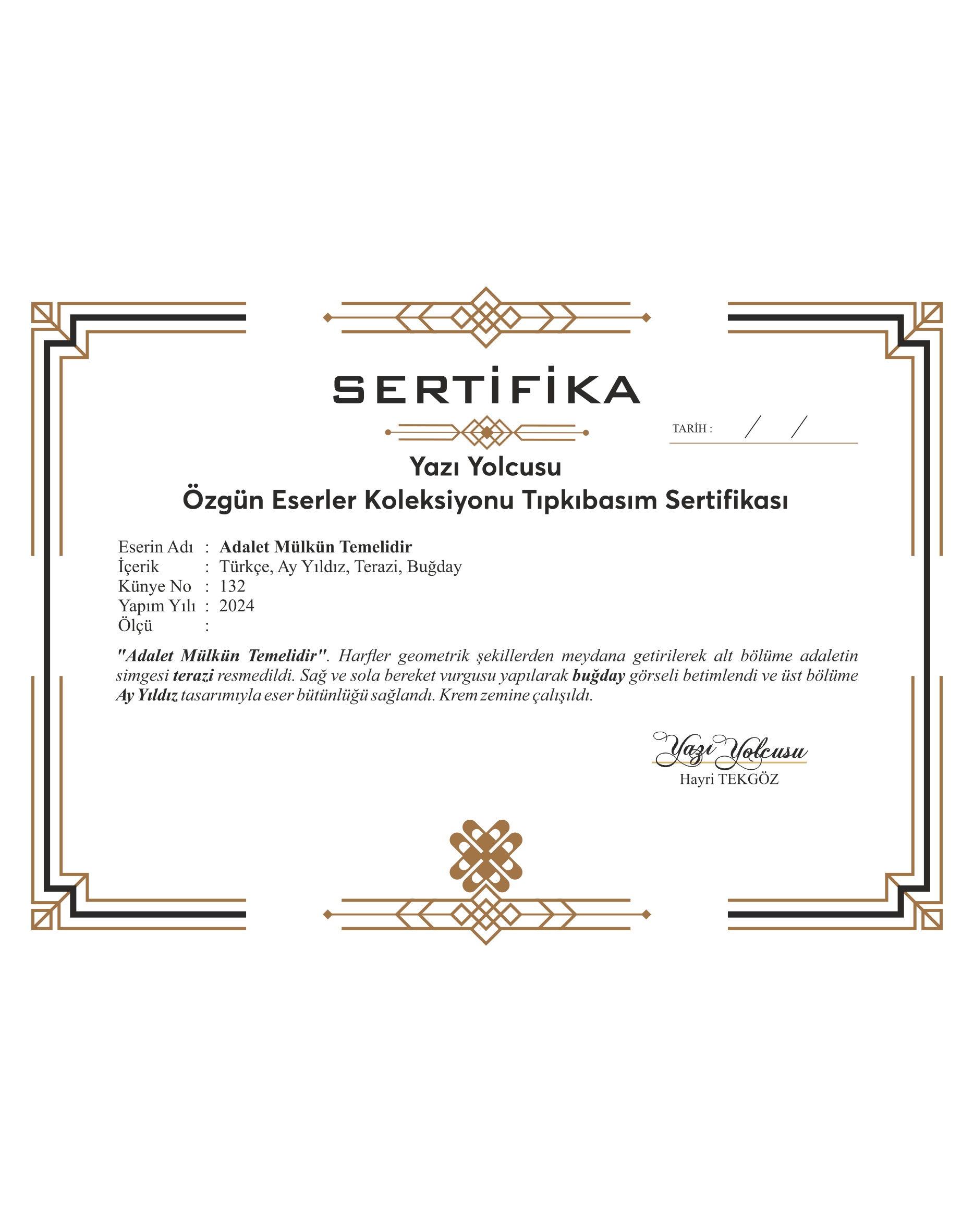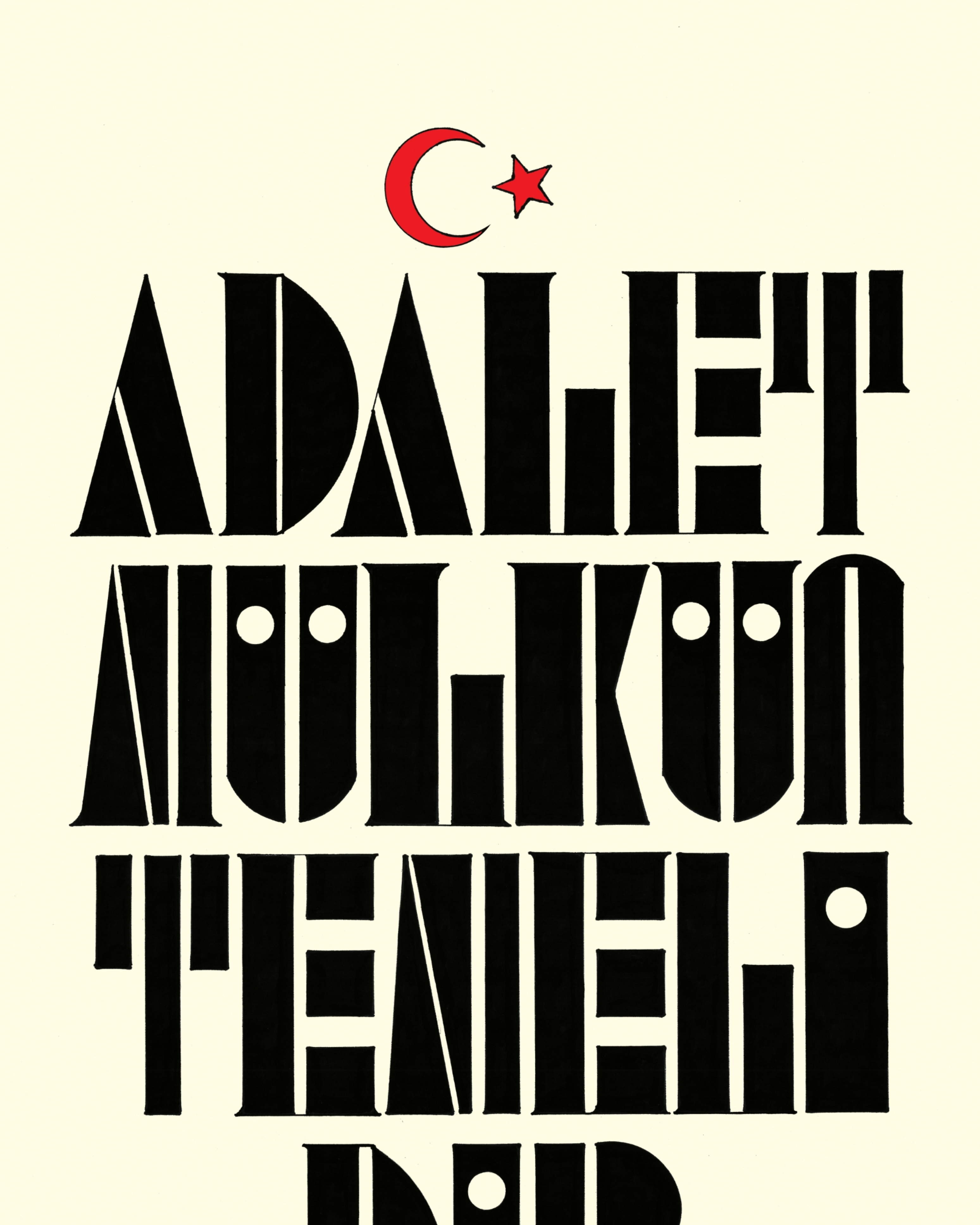 “Adalet Mülkün Temelidir.” Harfler geometrik şekillerden meydana getirilerek alt bölüme adaletin simgesi “terazi” resmedildi. Sağ ve sola bereket vurgusu yapılarak “buğday” görseli betimlendi ve üst bölüme “Ay Yıldız” tasarımıyla eser bütünlüğü sağlandı. Krem zemine çalışıldı.