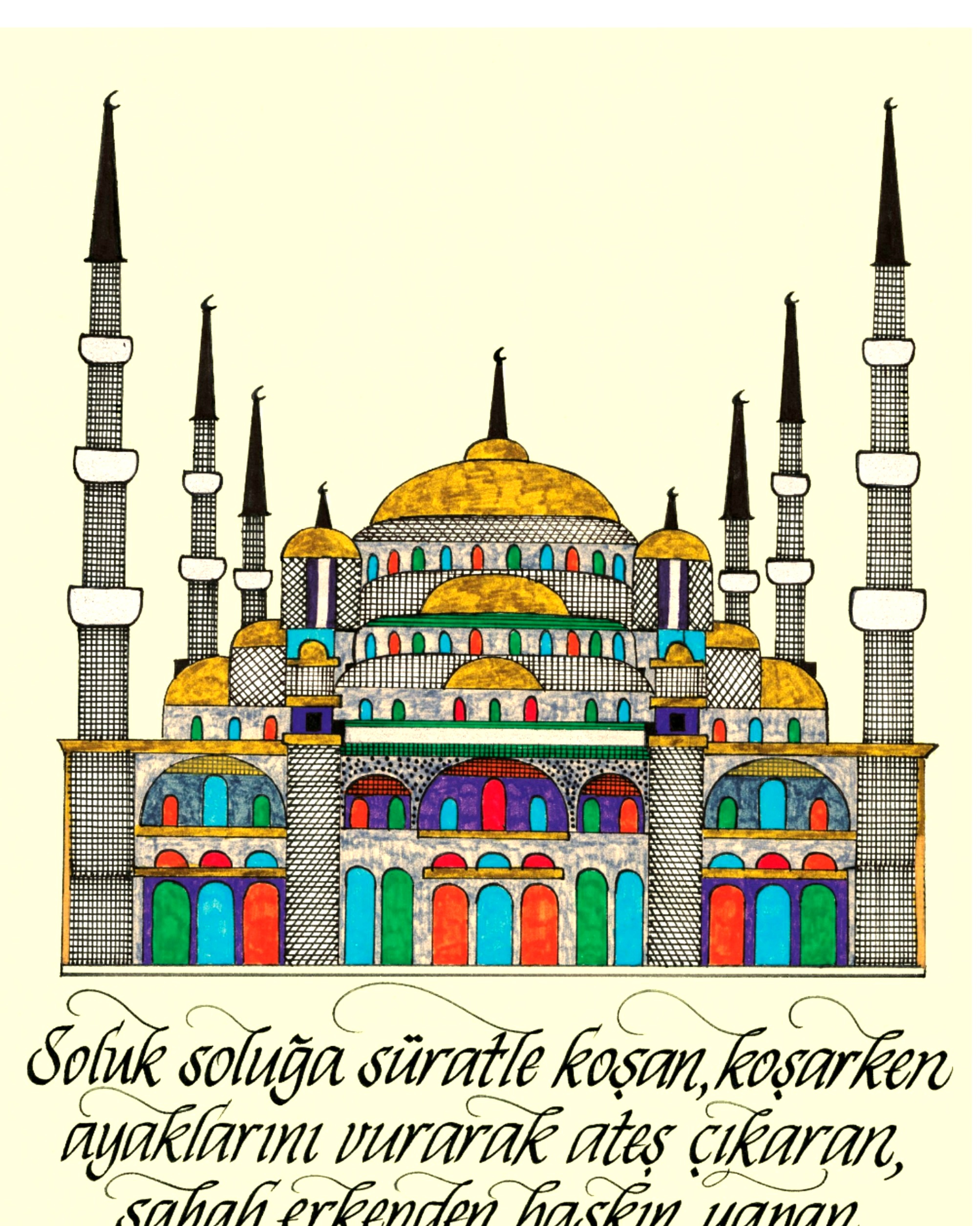 Sarı eskitme zemine 11 ayetten oluşan Adiyat Suresi’nin tamamı. Sağ üst bölüme Sultanahmet Camisi ve sol alta şahlanmış at görseli tasarlanarak atın üstünde yer alan küçük yazılar da surenin dokuz defa tekrarıdır. Krem zemin üzerine çalışıldı.