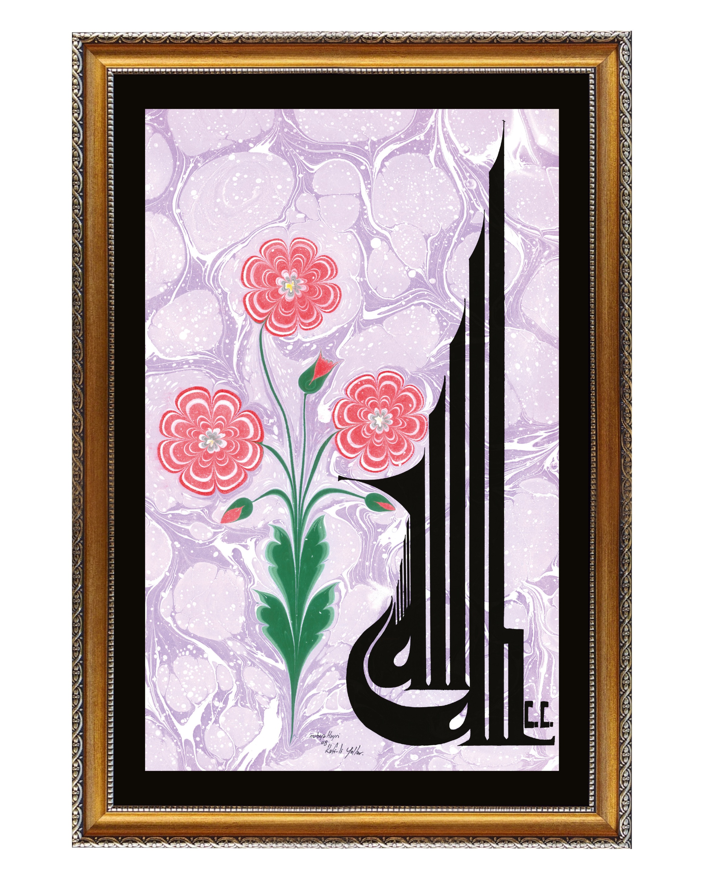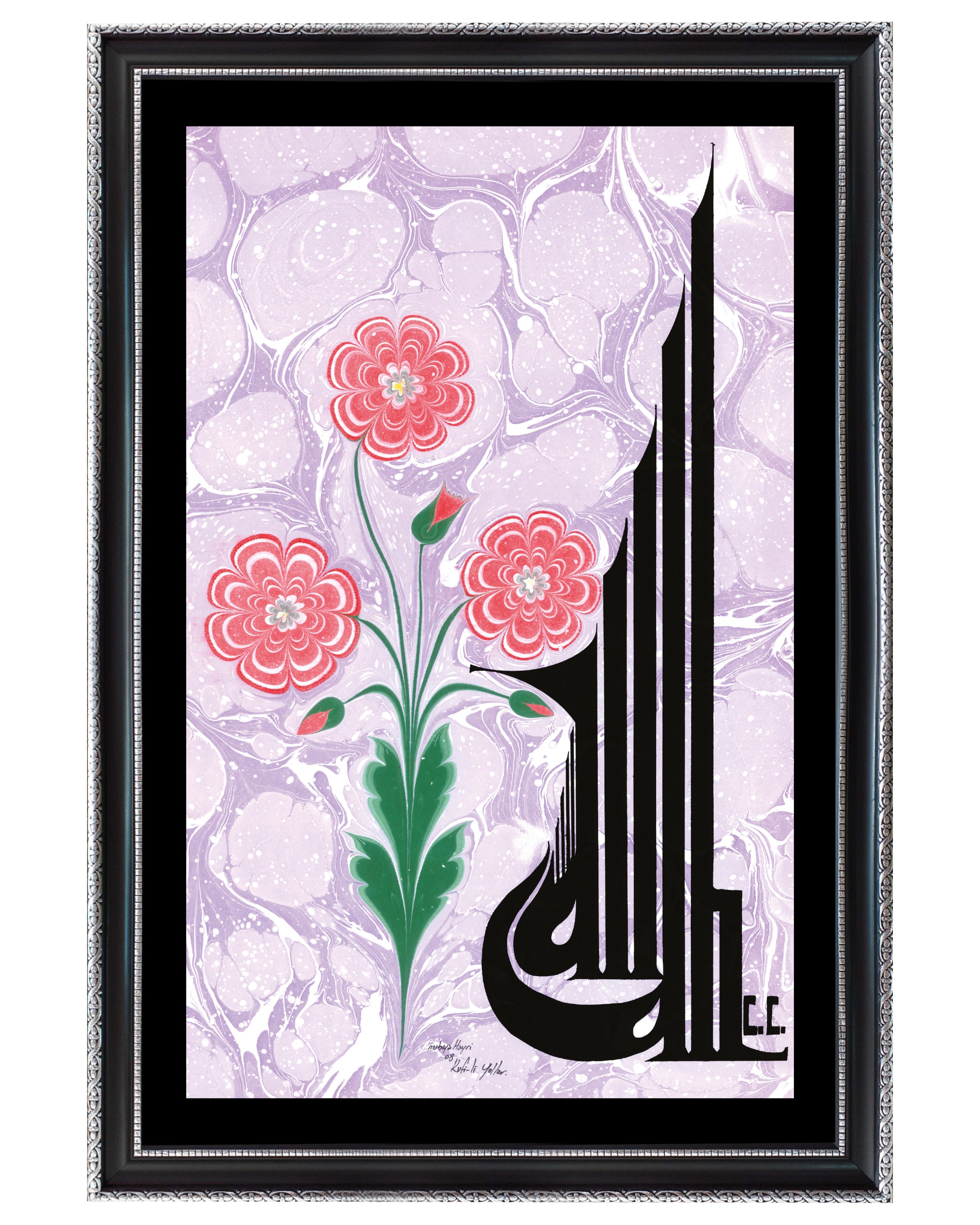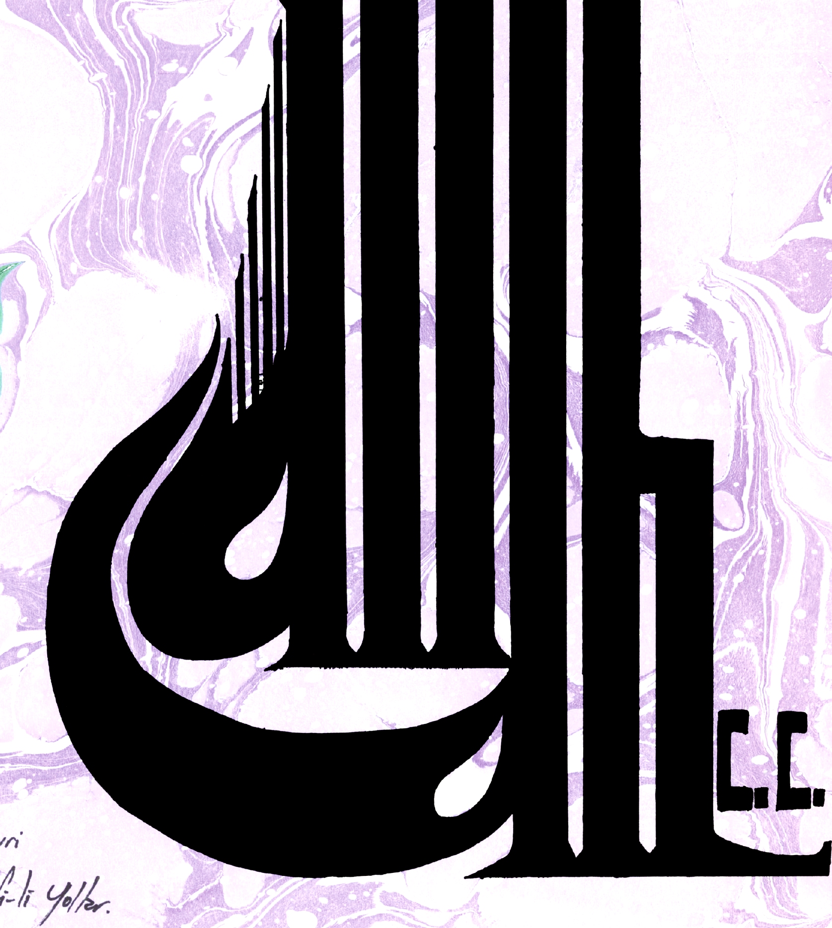 Ebru üzerine Latin harfleriyle “ALLAH C.C.” Sağ elimizin birliğe ve tekliğe atıfla, işaret parmağımızın şekline vurgu yapılarak betimlenmiştir.