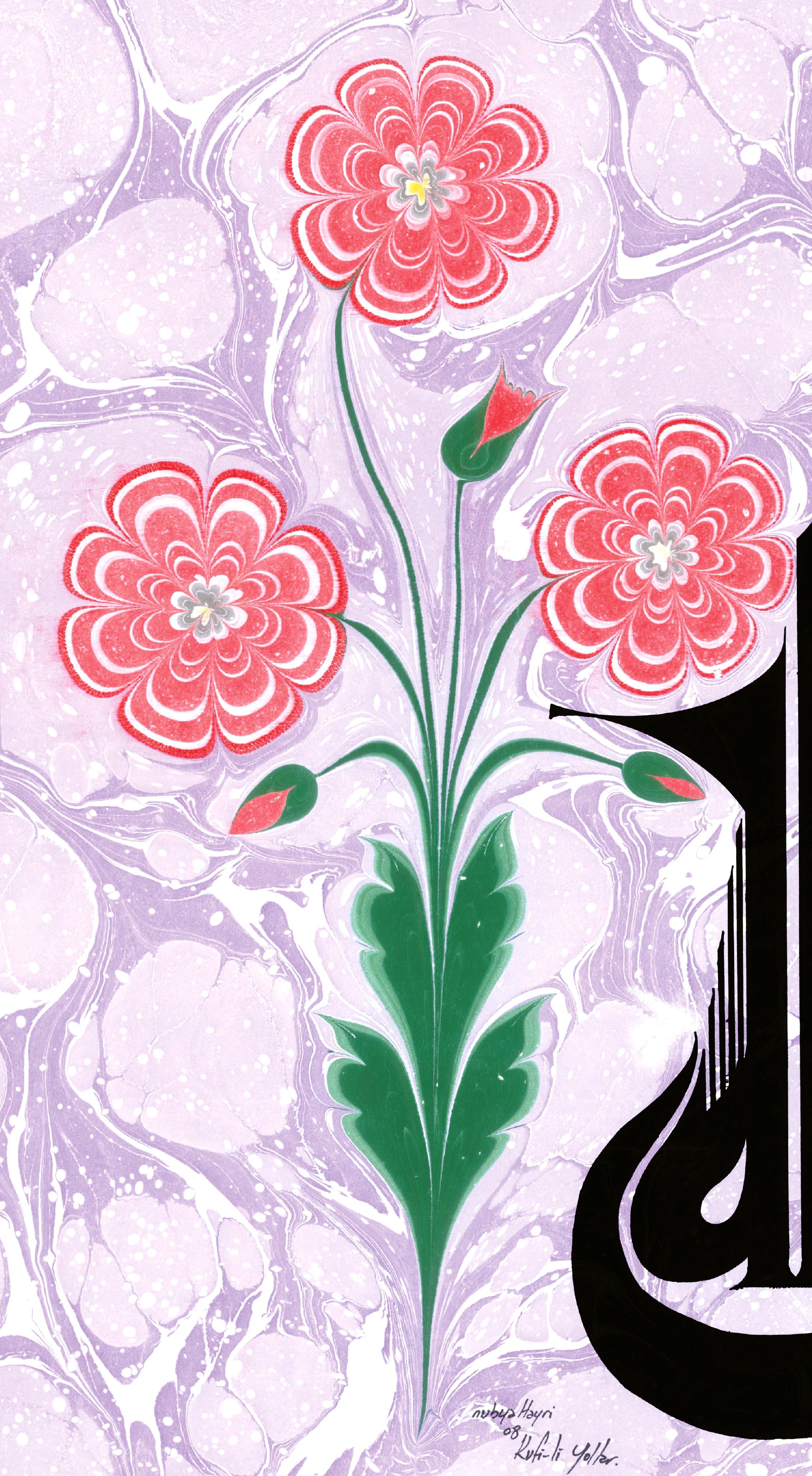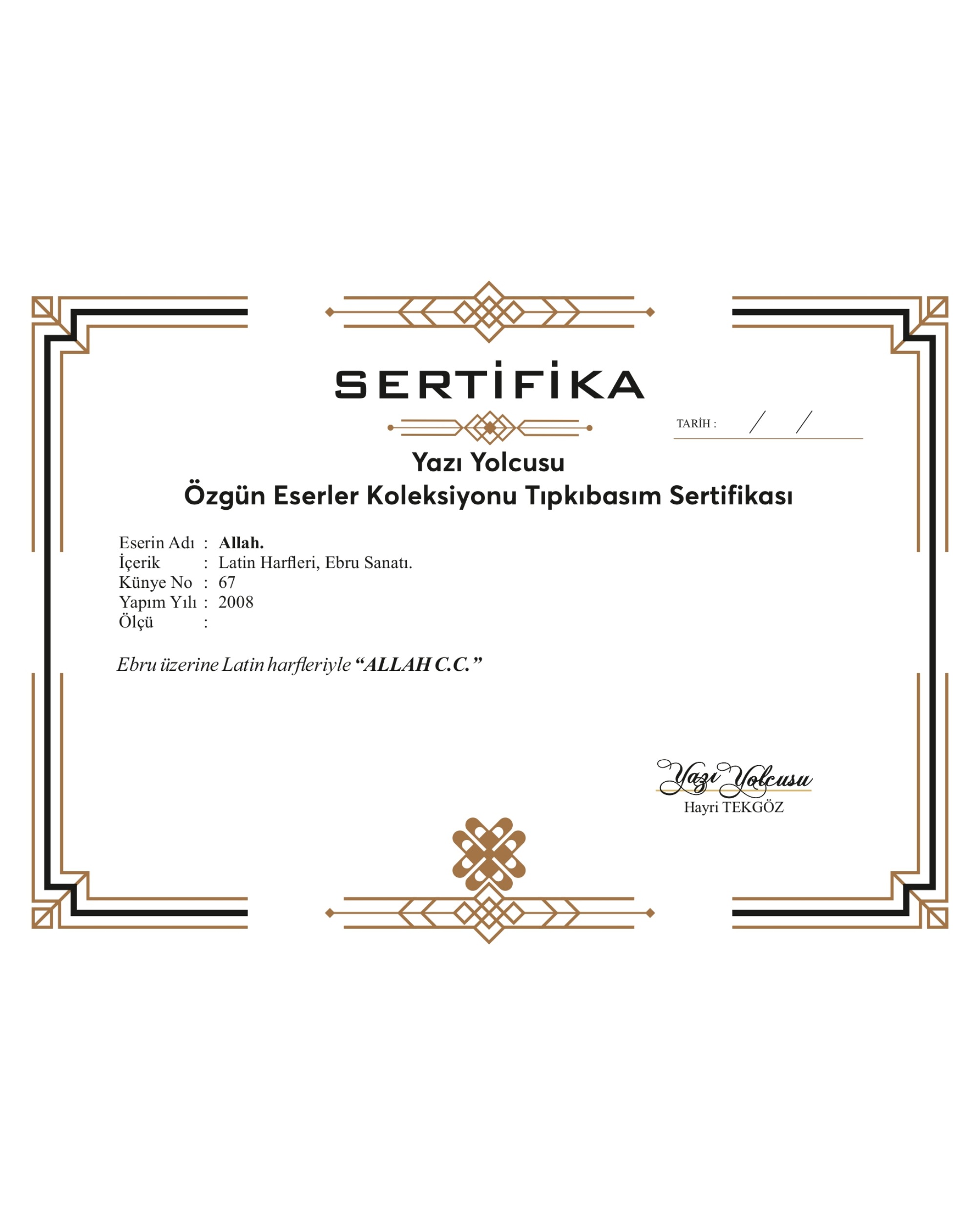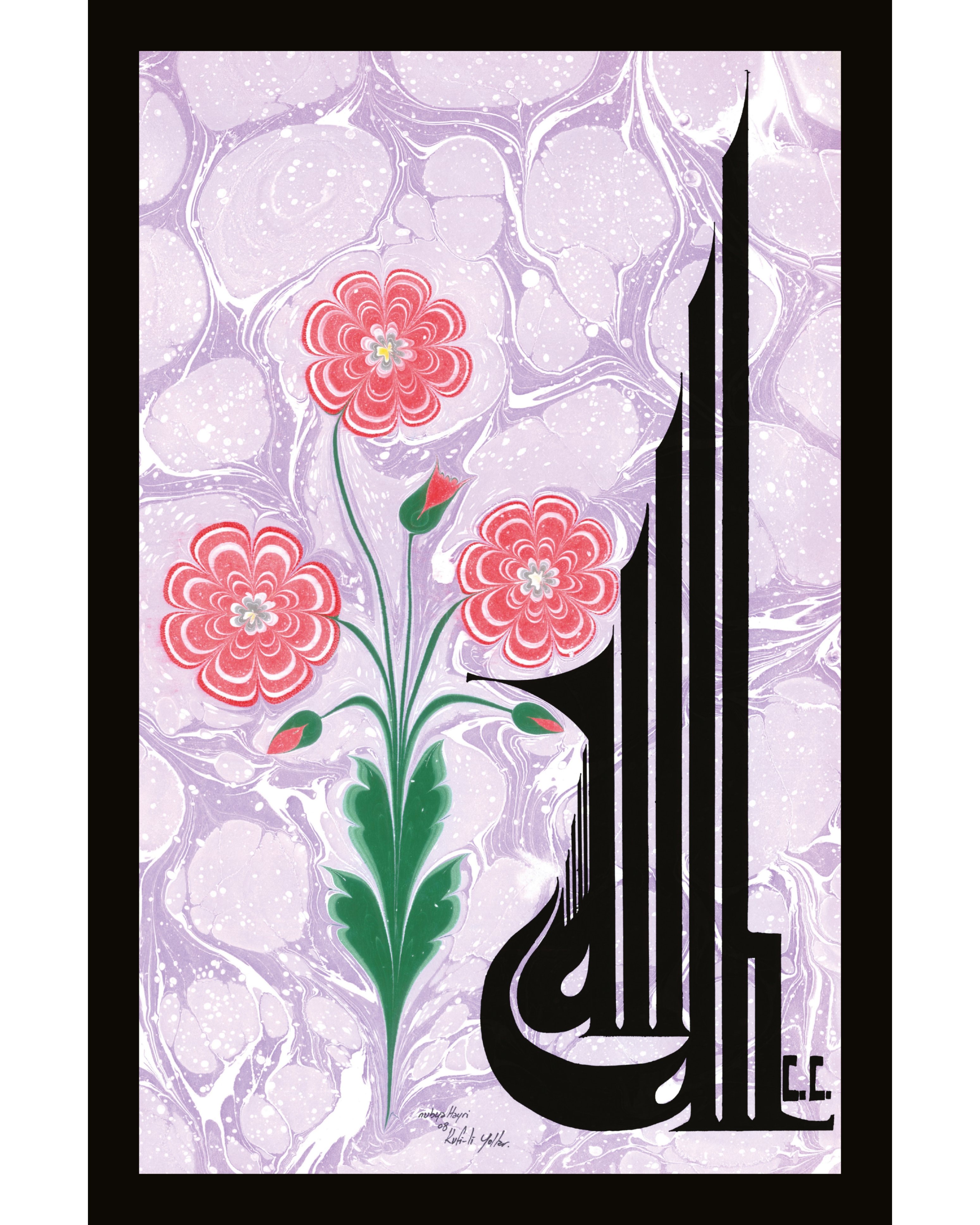 Ebru üzerine Latin harfleriyle “ALLAH C.C.” Sağ elimizin birliğe ve tekliğe atıfla, işaret parmağımızın şekline vurgu yapılarak betimlenmiştir.