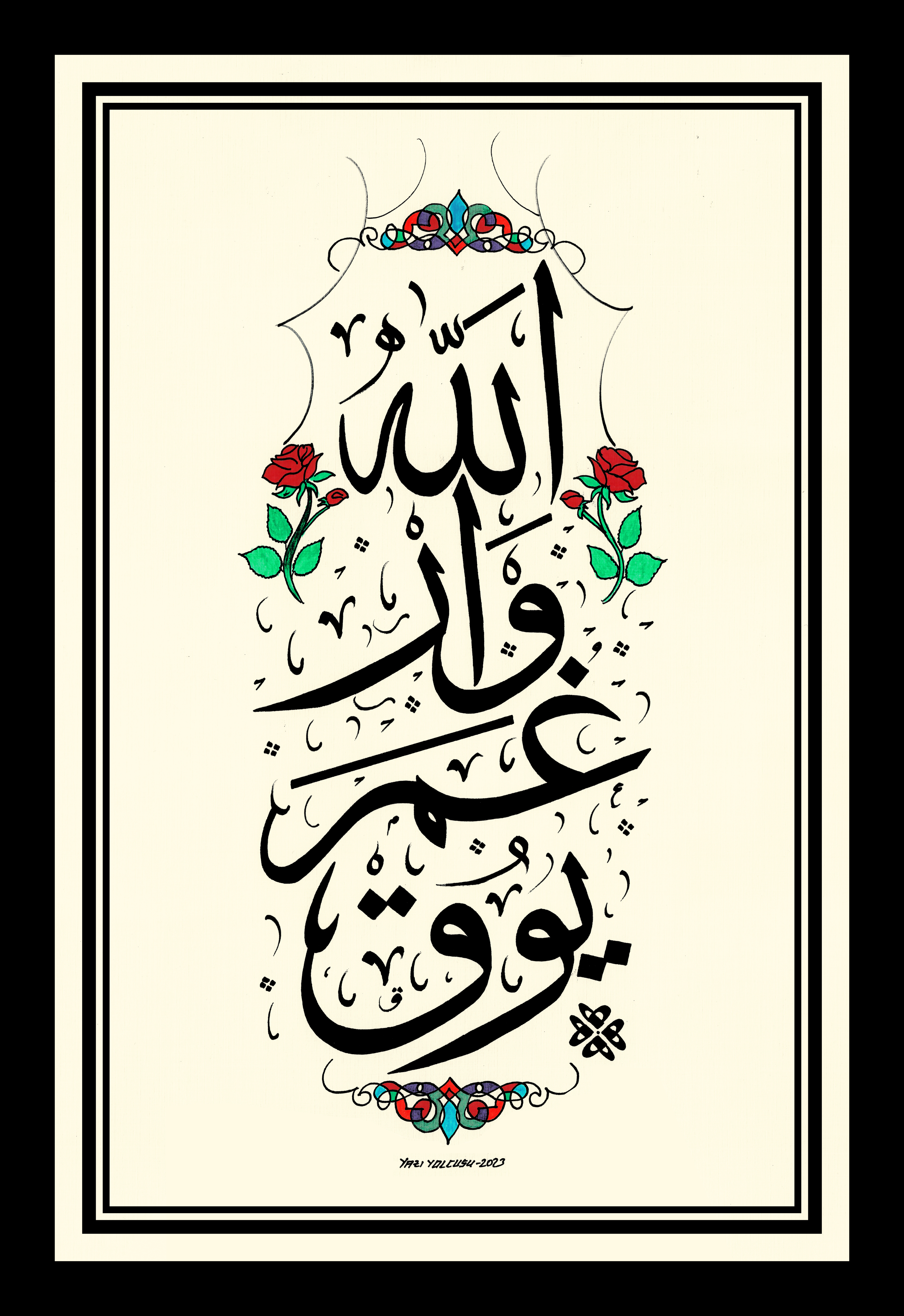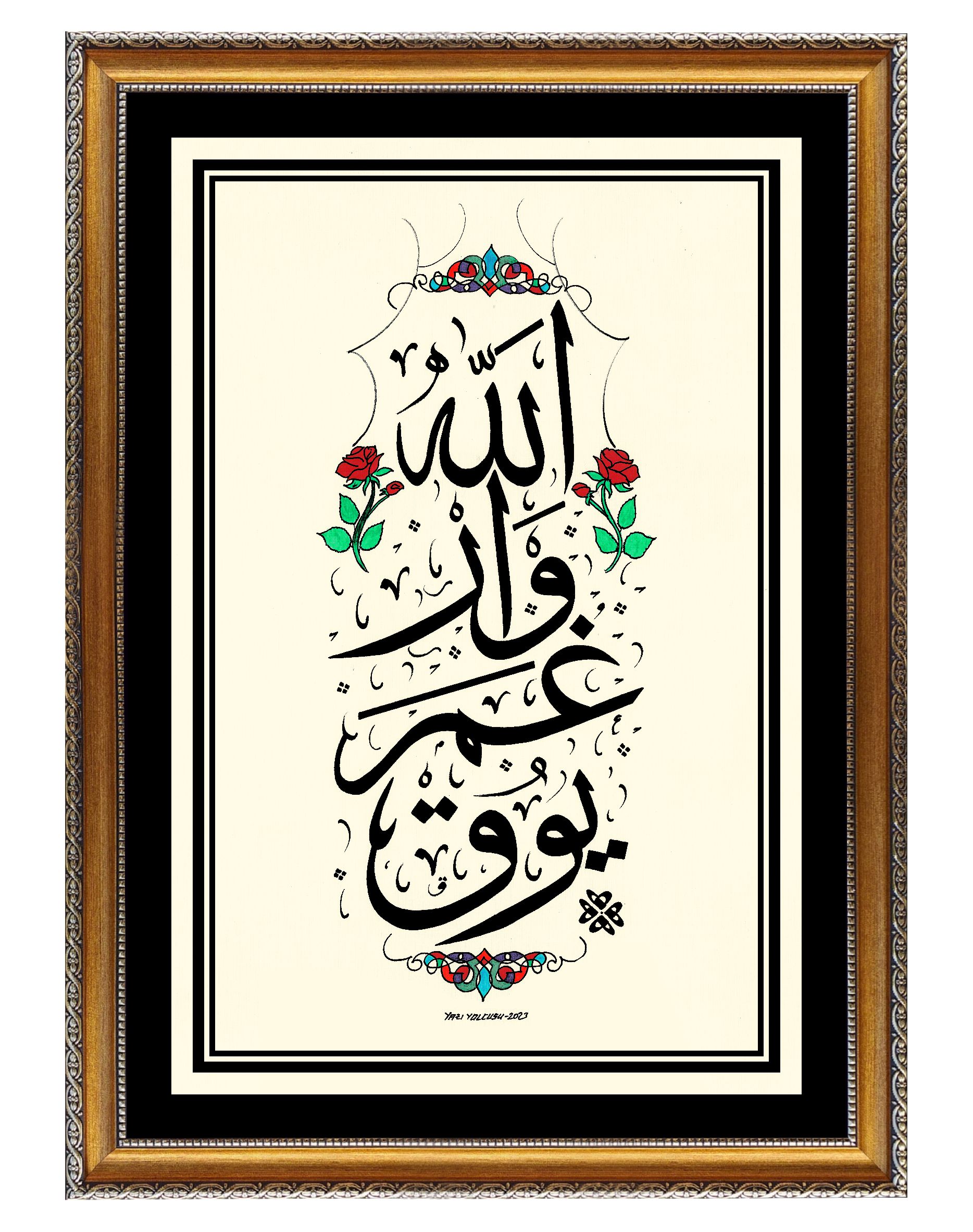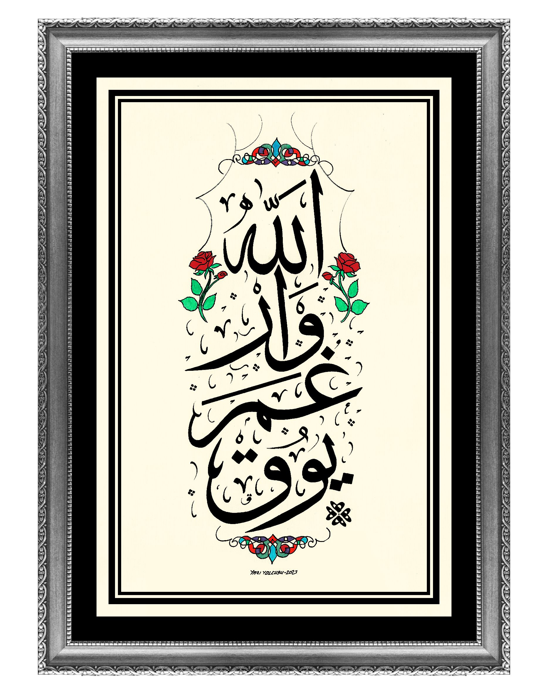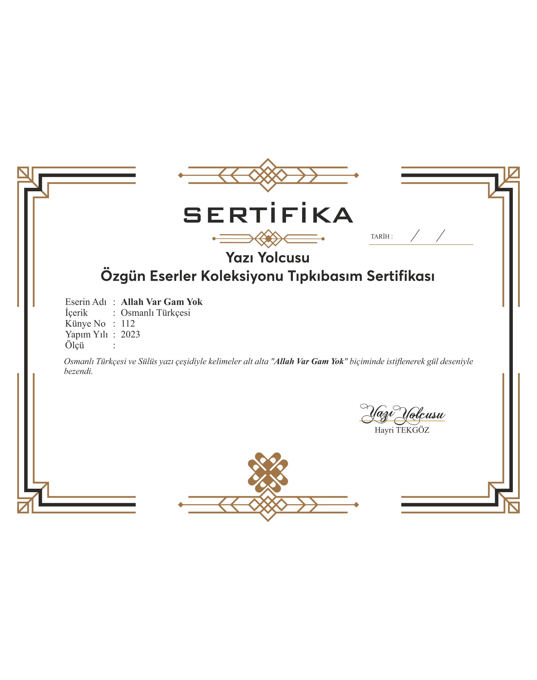 Osmanlı Türkçesi ve Sülüs yazı çeşidiyle kelimeler alt alta “Allah var gam yok” biçiminde istiflenerek gül deseniyle bezendi.