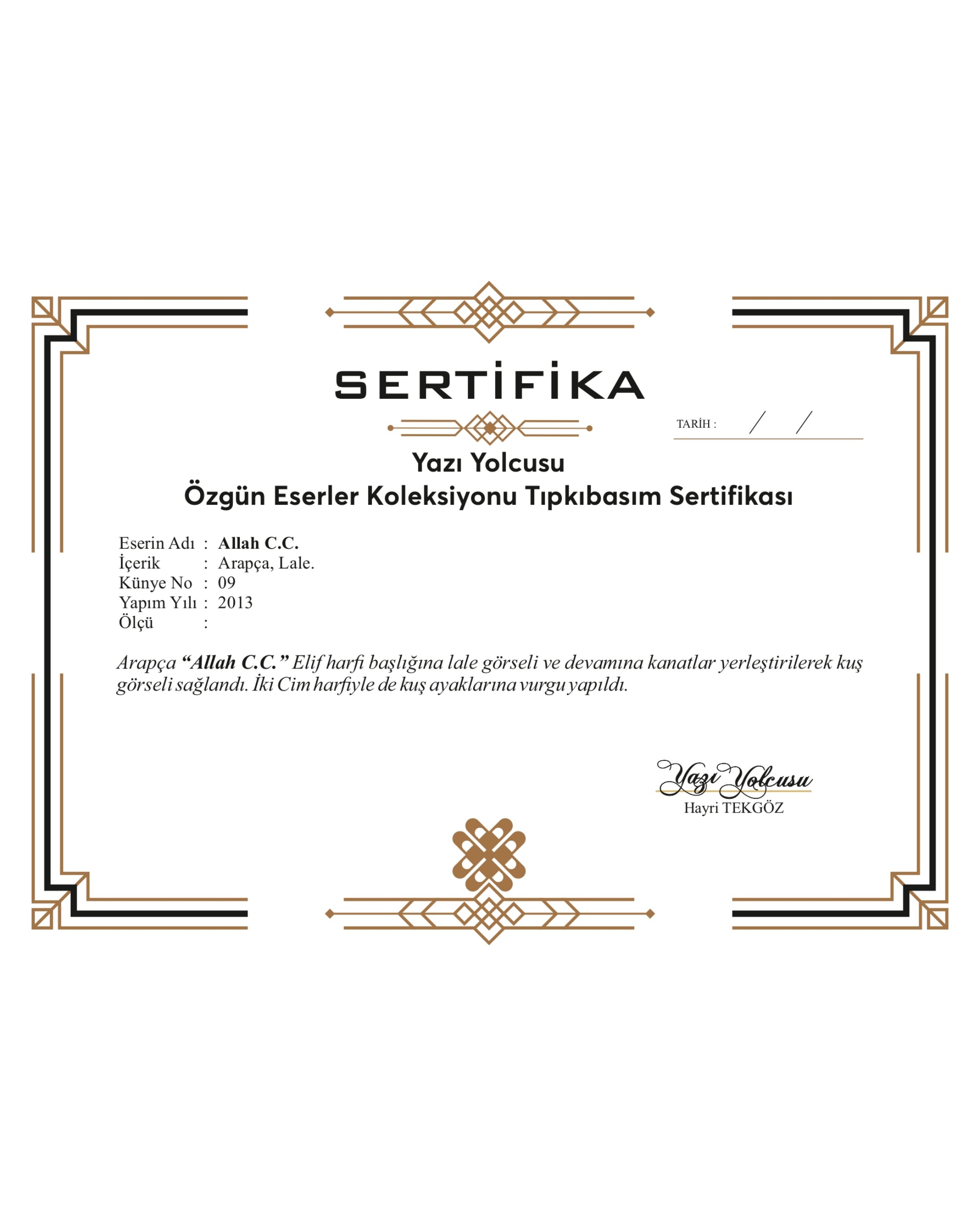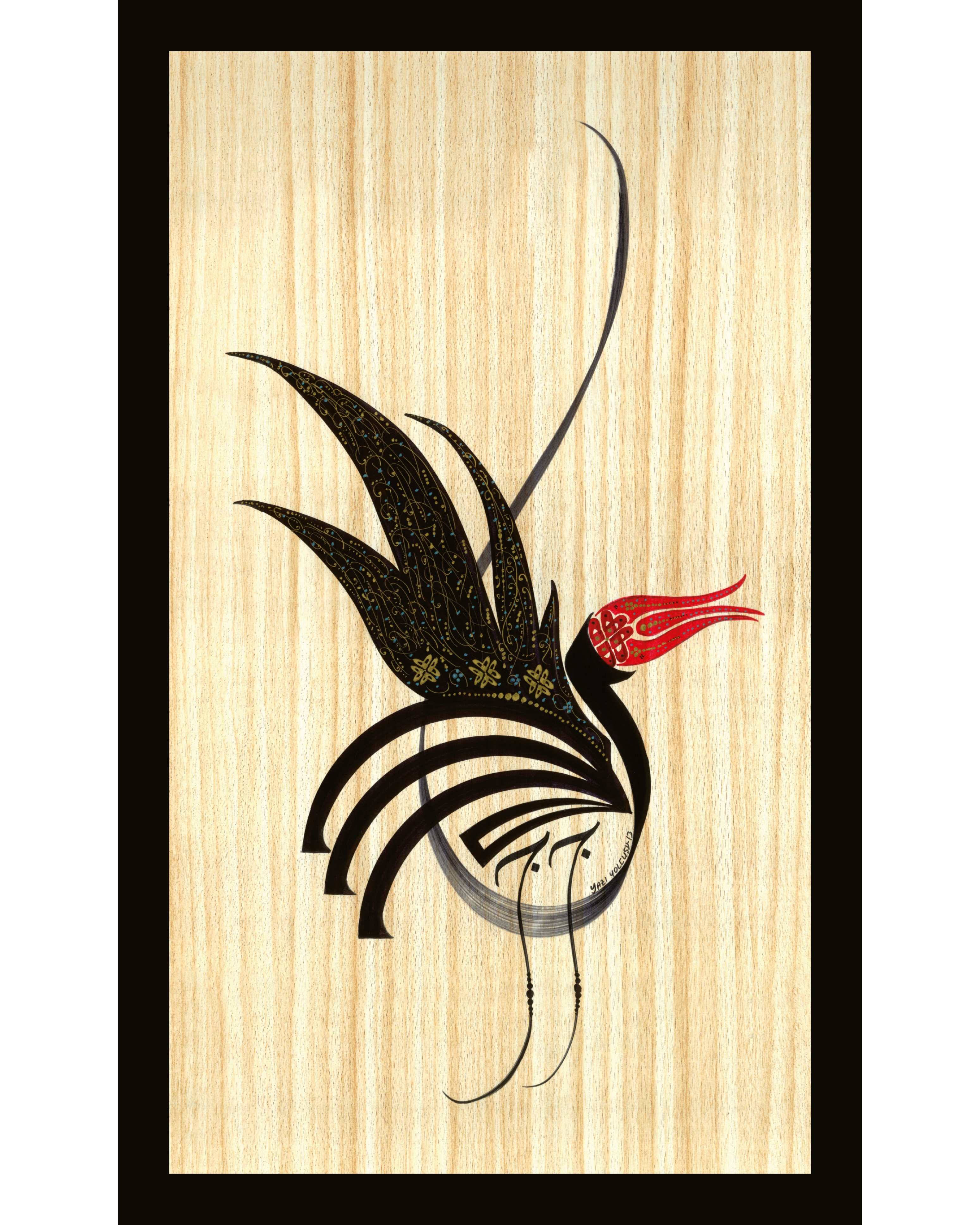 Arapça “Allah C.C.” Elif harfi başlığına lale görseli ve devamına kanatlar yerleştirilerek kuş görseli sağlandı. İki cim harfiyle de kuş ayaklarına vurgu yapıldı.