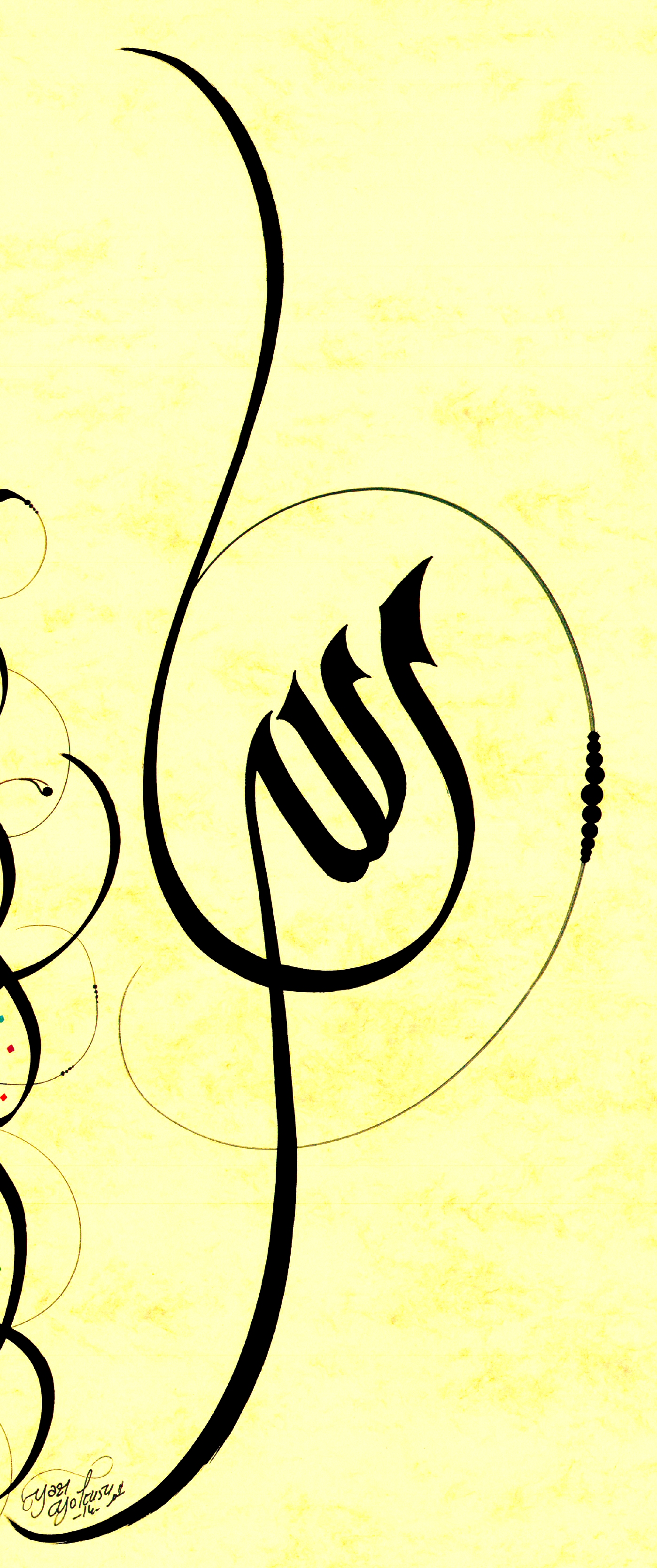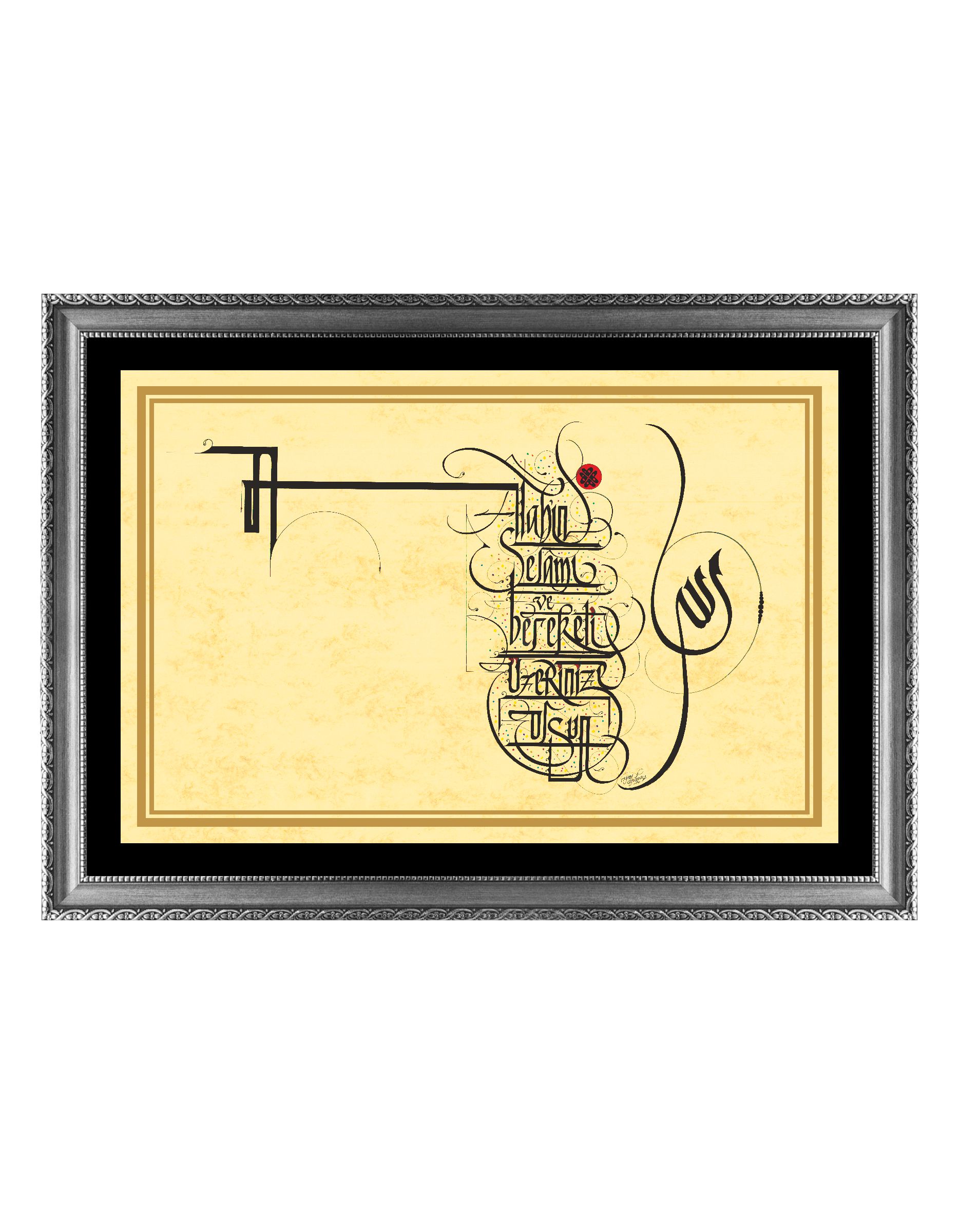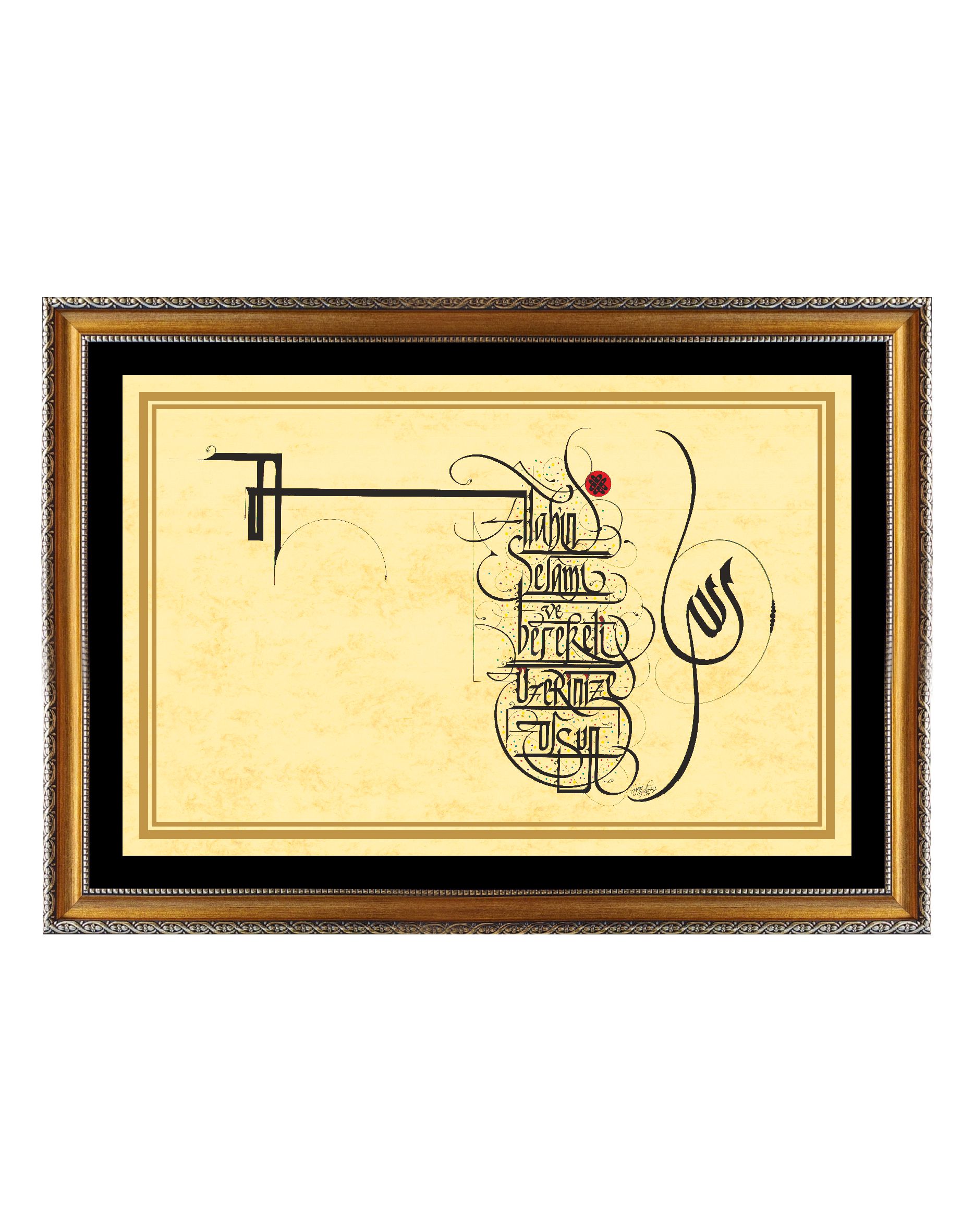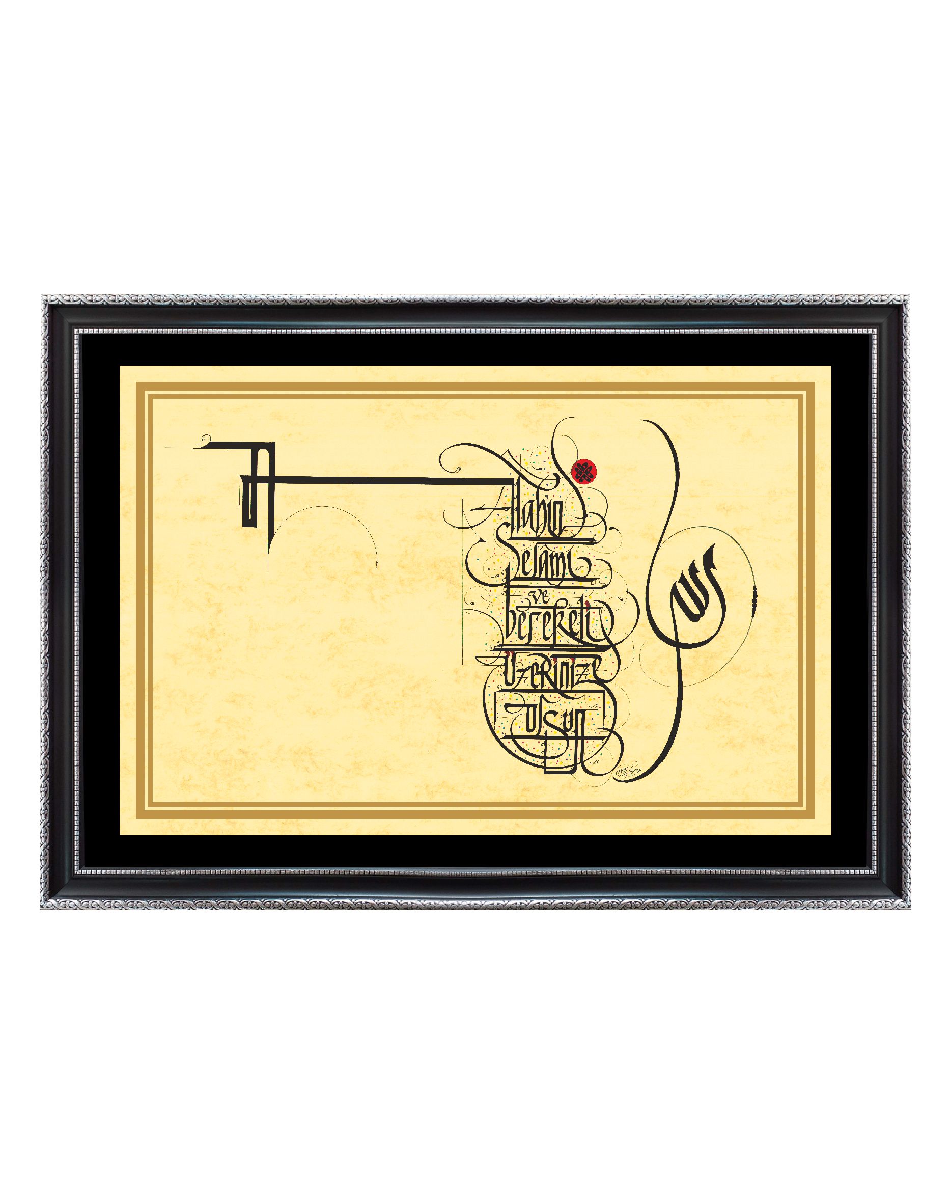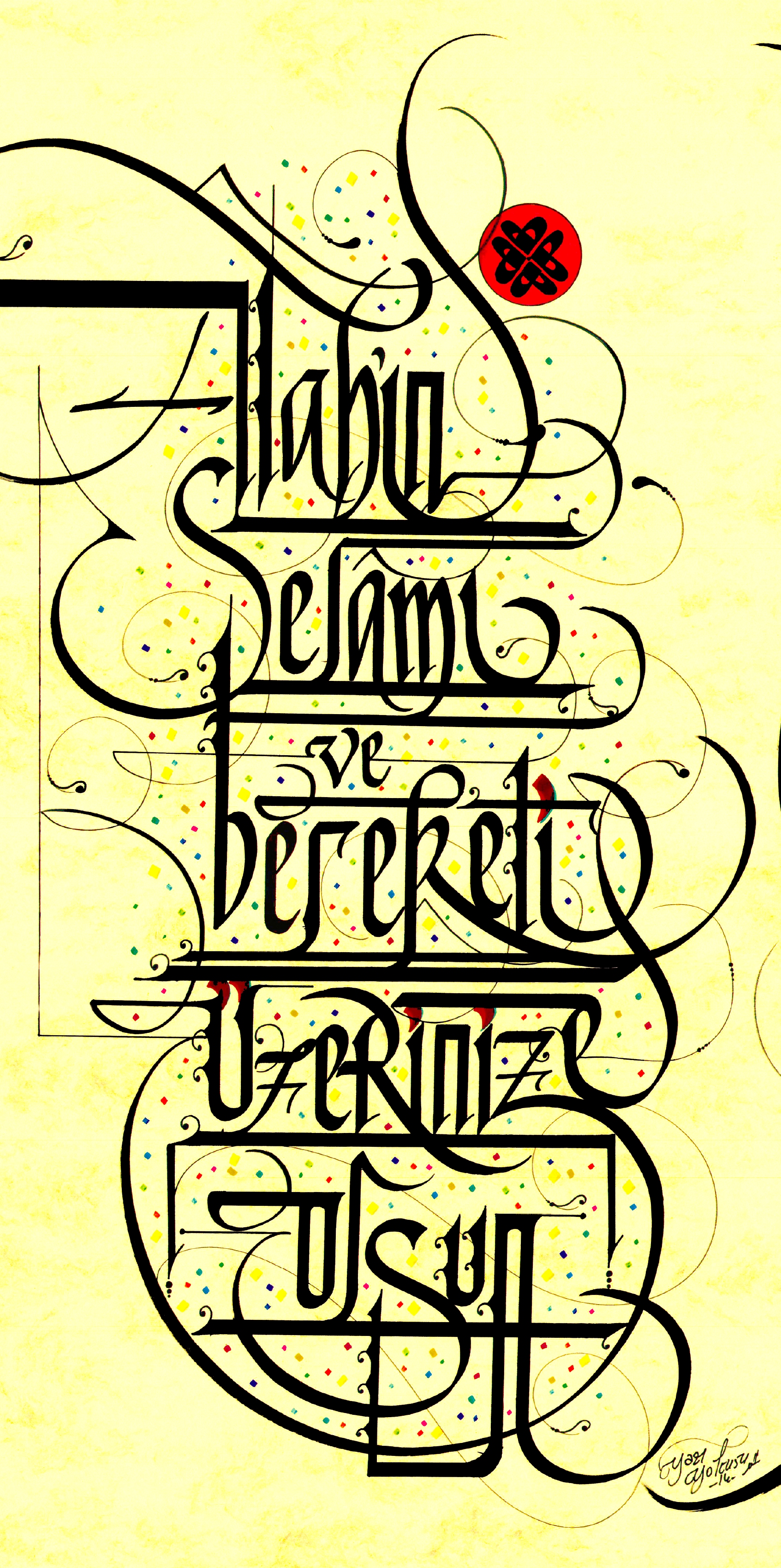 Sağ tarafta Arapça “Allah”, solda Türkçe Selam “Allah’ın Selamı ve Bereketi Üzerinize Olsun”. Eskitme sarı zemin üzerine çalışıldı. Latin harfleriyle yazılan sol bölümde büyük harfle bir tane A harfi yapılarak devamında ikinci bir A harfiyle devam ettirildi. Bir bakıma selam; Allah lafzının A harfine asılı bir ip gibi bağlaç yorumu getirilmiş oldu.
