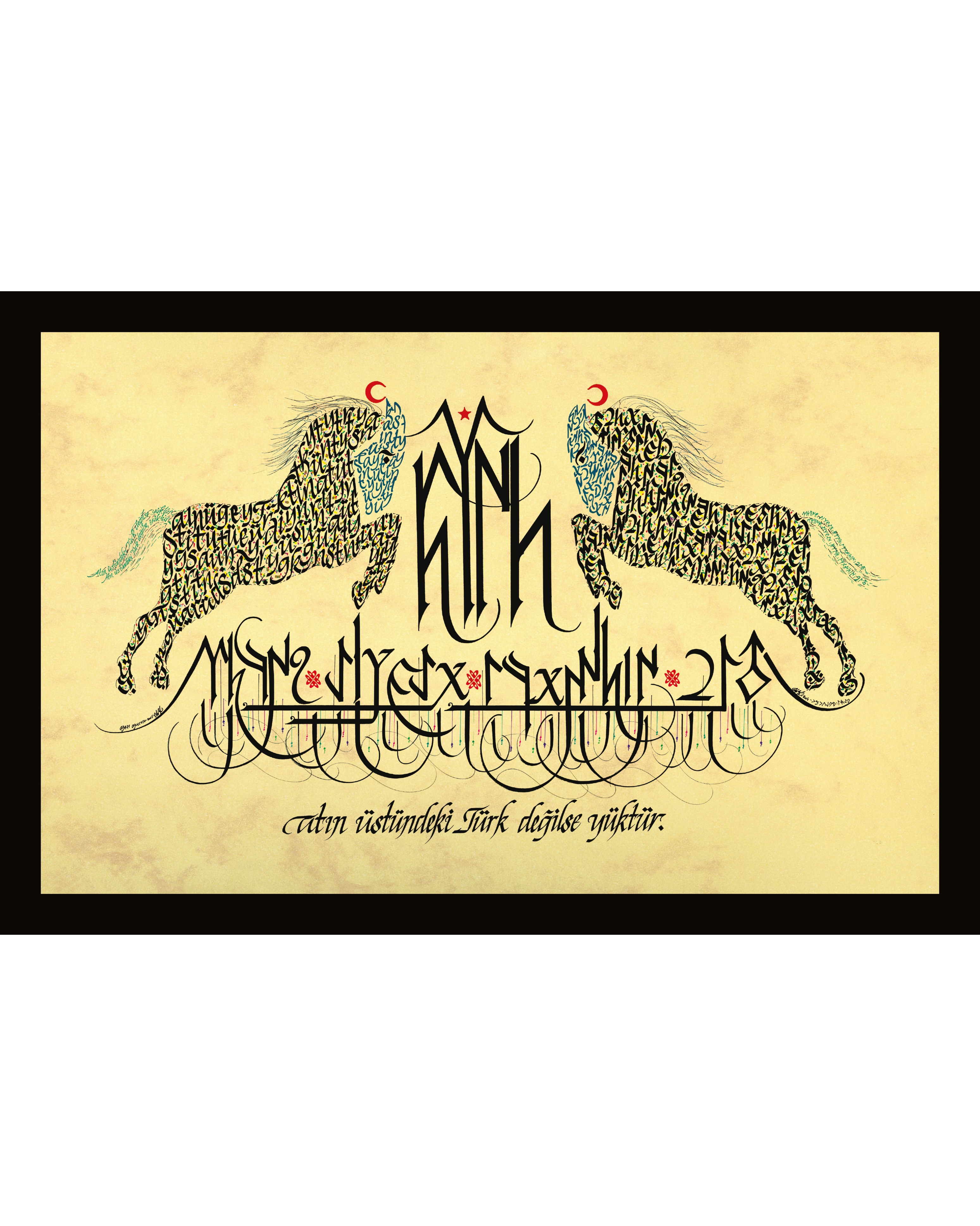 Türkçe ve Göktürkçe “Atın Üstündeki Türk Değilse Yüktür”. İki at arasında Göktürkçe “Türk” yazıyor. Atlar Latin ve Göktürk harfleriyle tasarlandı.