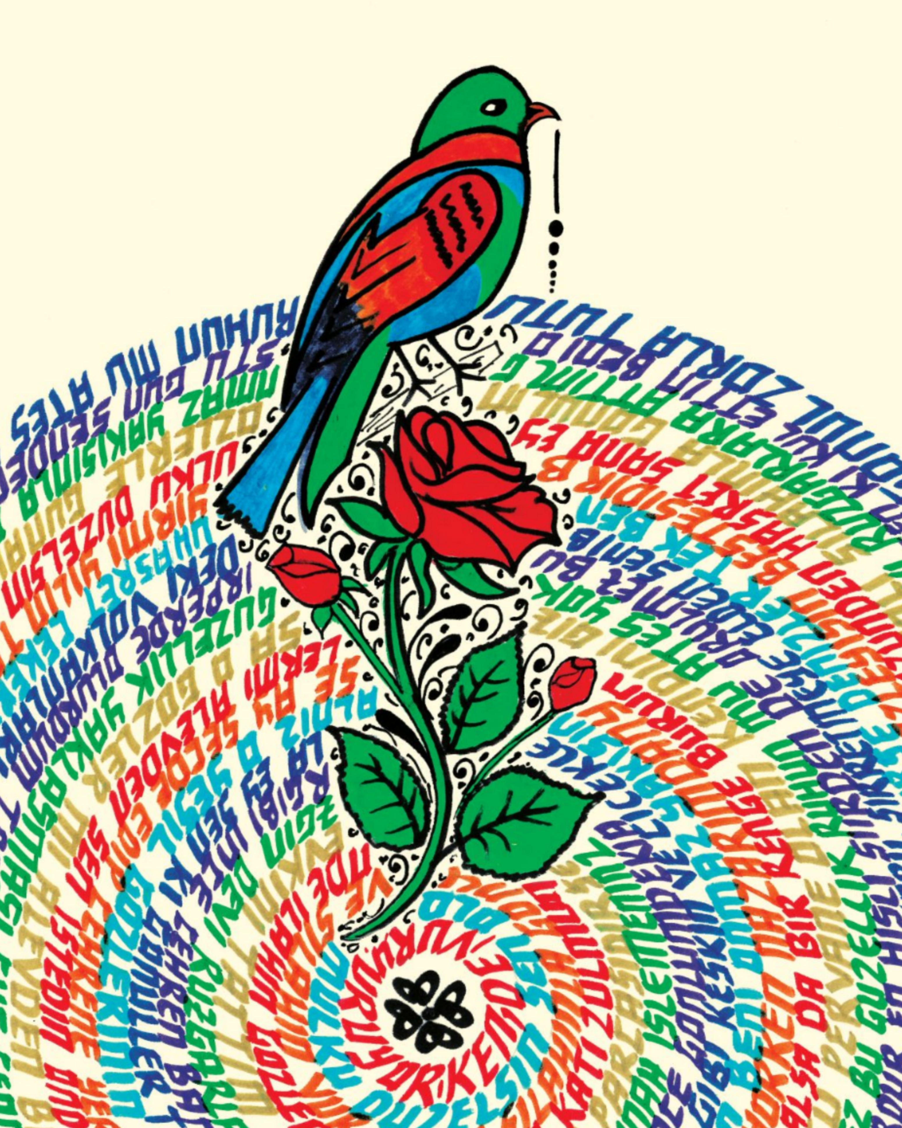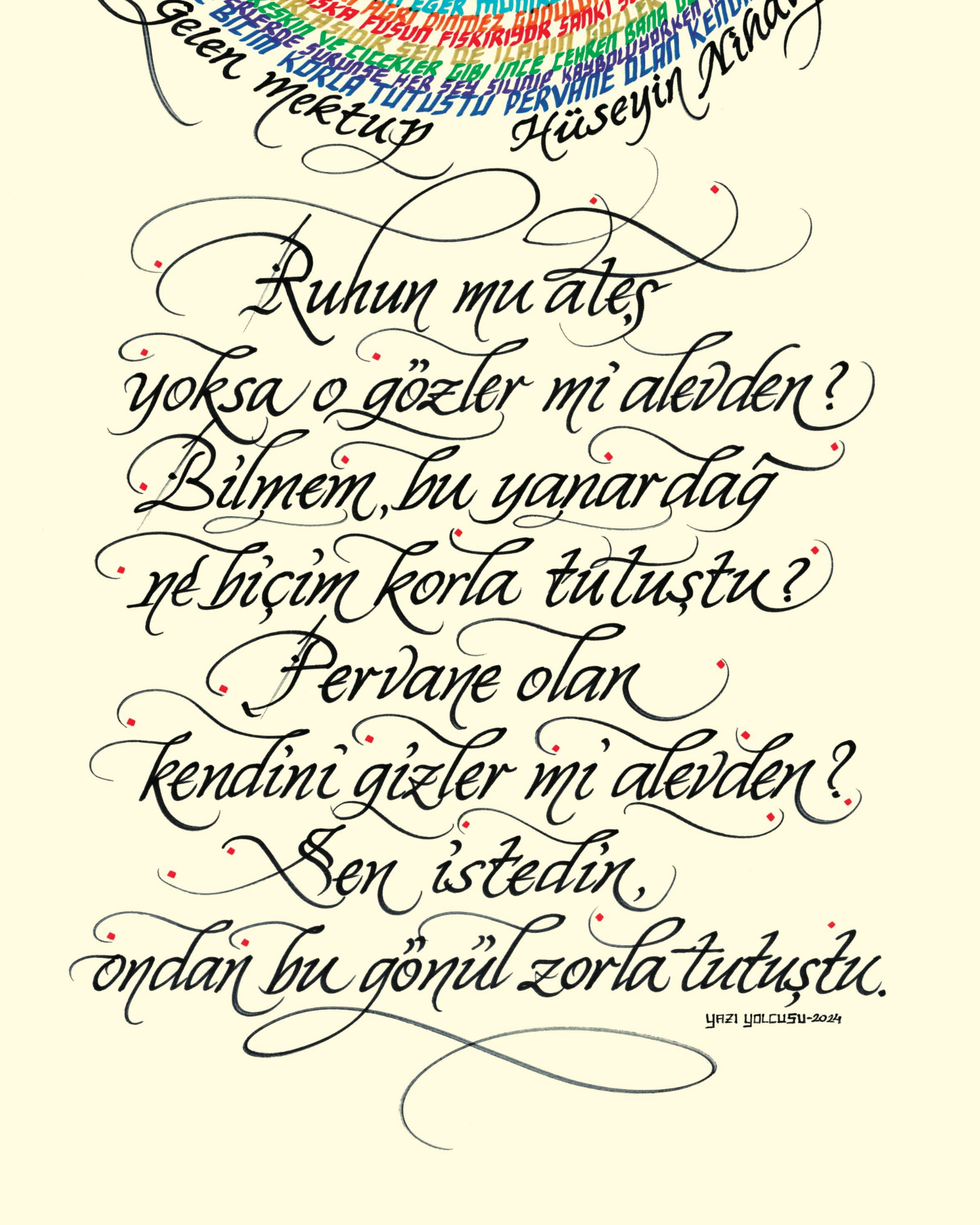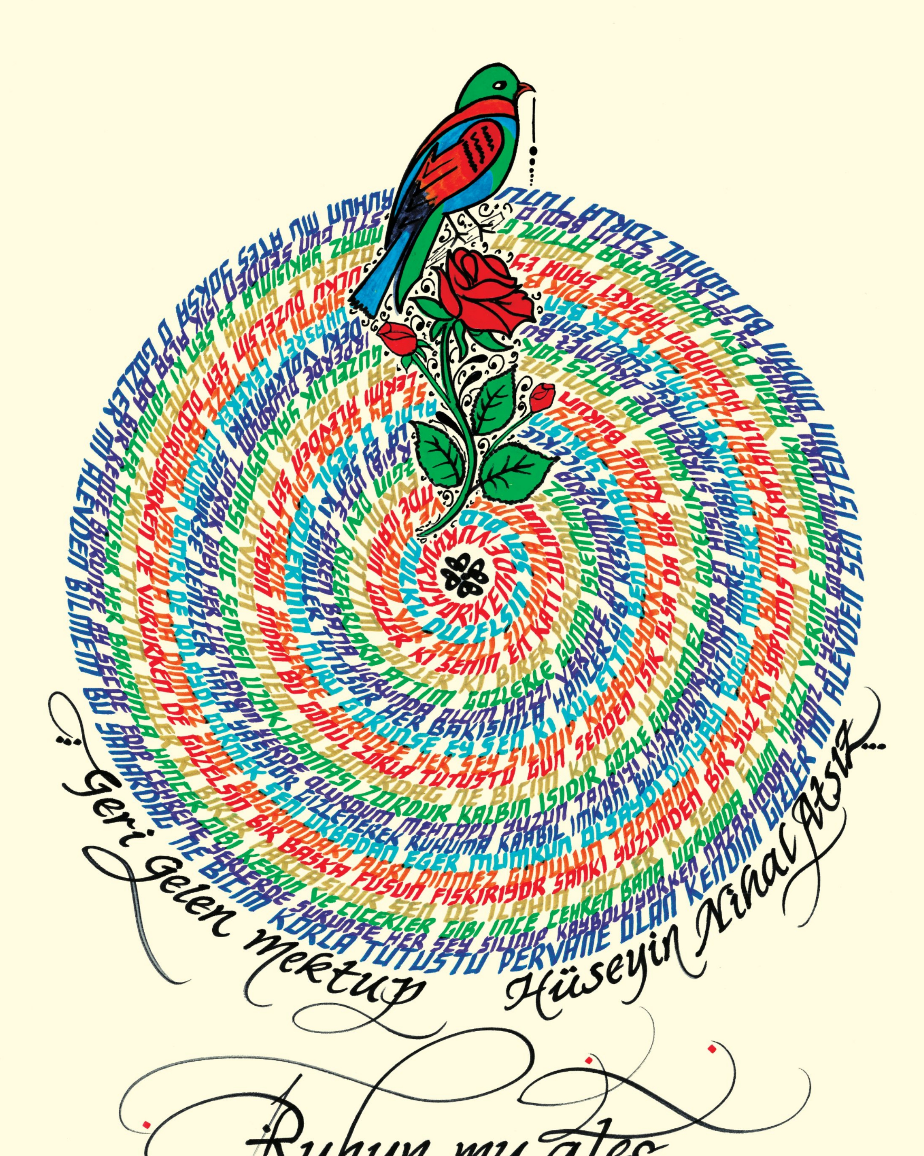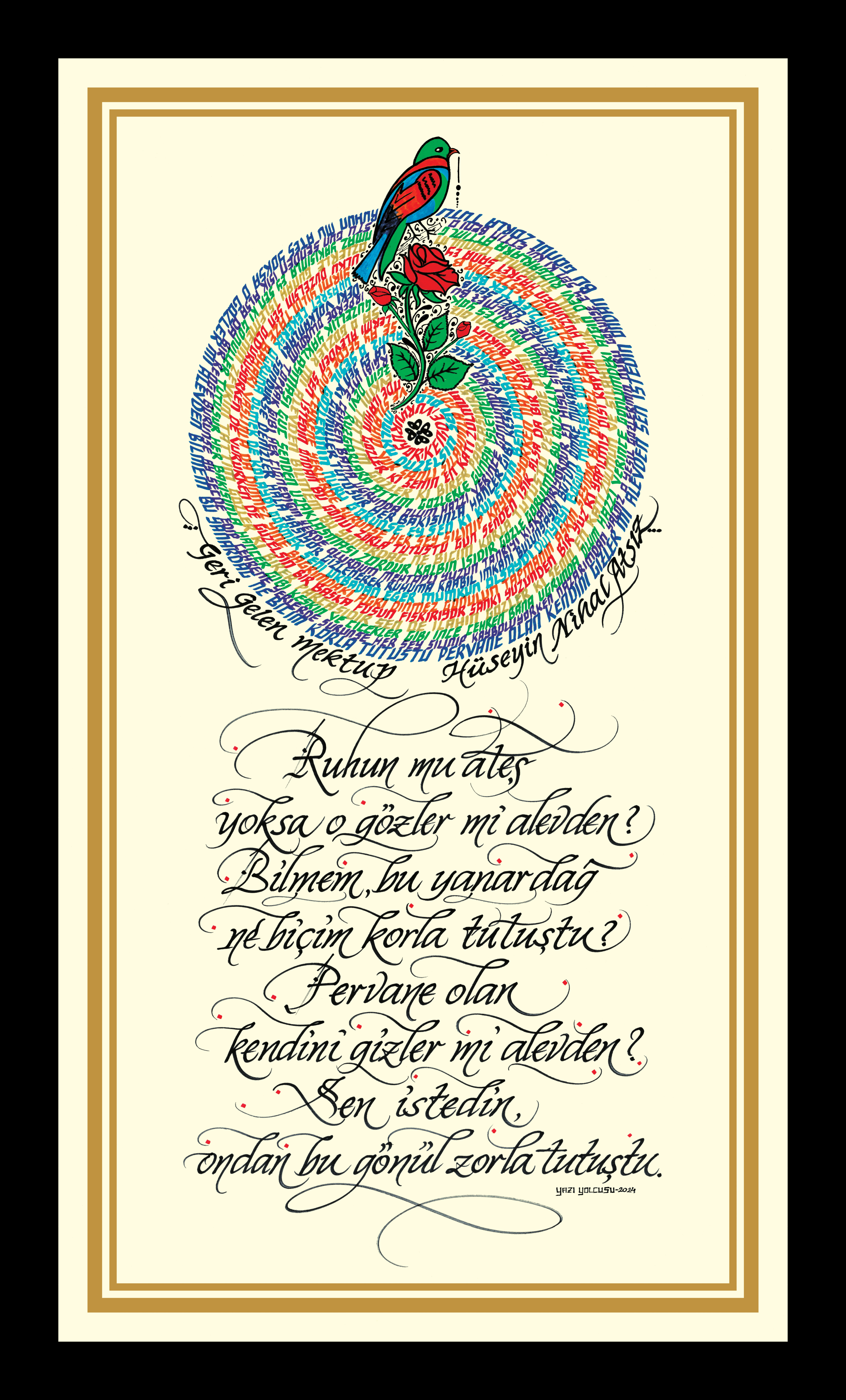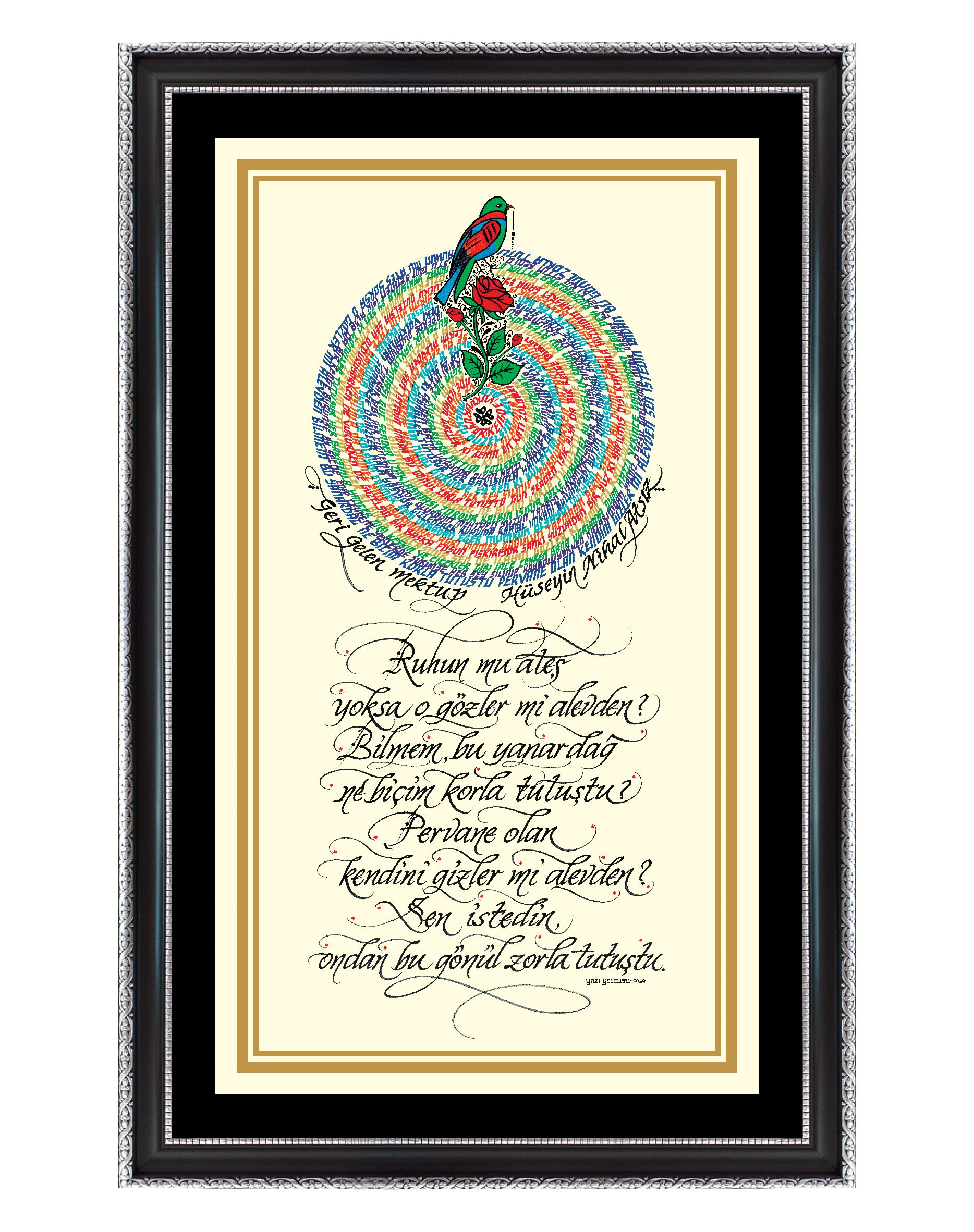 Nihal Atsız'ın "Geri Gelen Mektup" adlı şiiri. Daire bölümünde şiirin 2 tekrarı yer alıyor. Sözlerin mahiyeti bakımından Gül ile Bülbülün birbirine olan aşkına vurgu yaparak, daire görselinde pervâne yorumuyla betimledim. Alt bölüme şiirin ana teması olan ilk dörtlüğü yazarak eser tamamlandı. "Ruhun mu ateş, yoksa o gözler mi alevden? Bilmem, bu yanardağ ne biçim korla tutuştu? Pervane olan kendini gizler mi alevden; Sen istedin, ondan bu gönül zorla tutuştu."