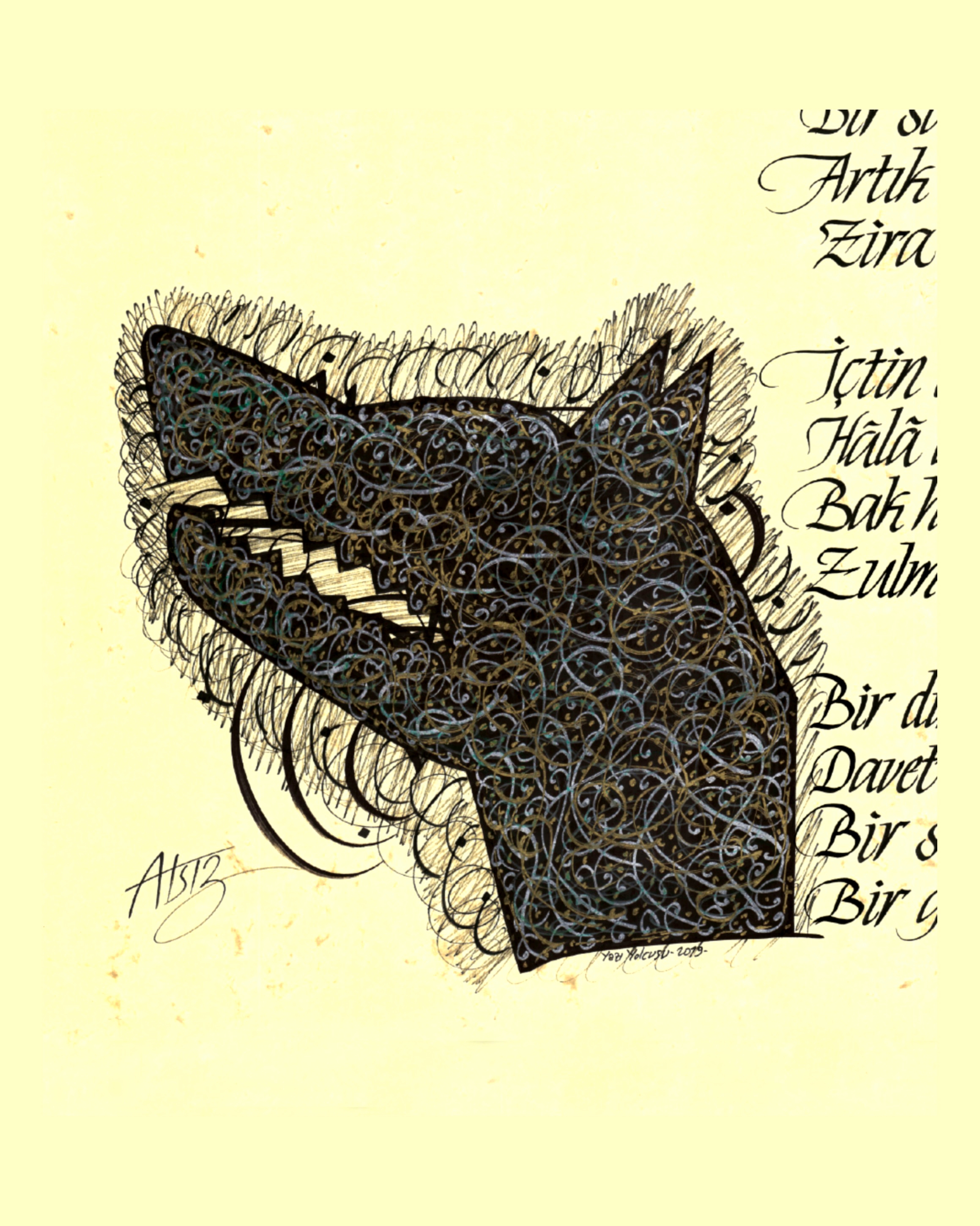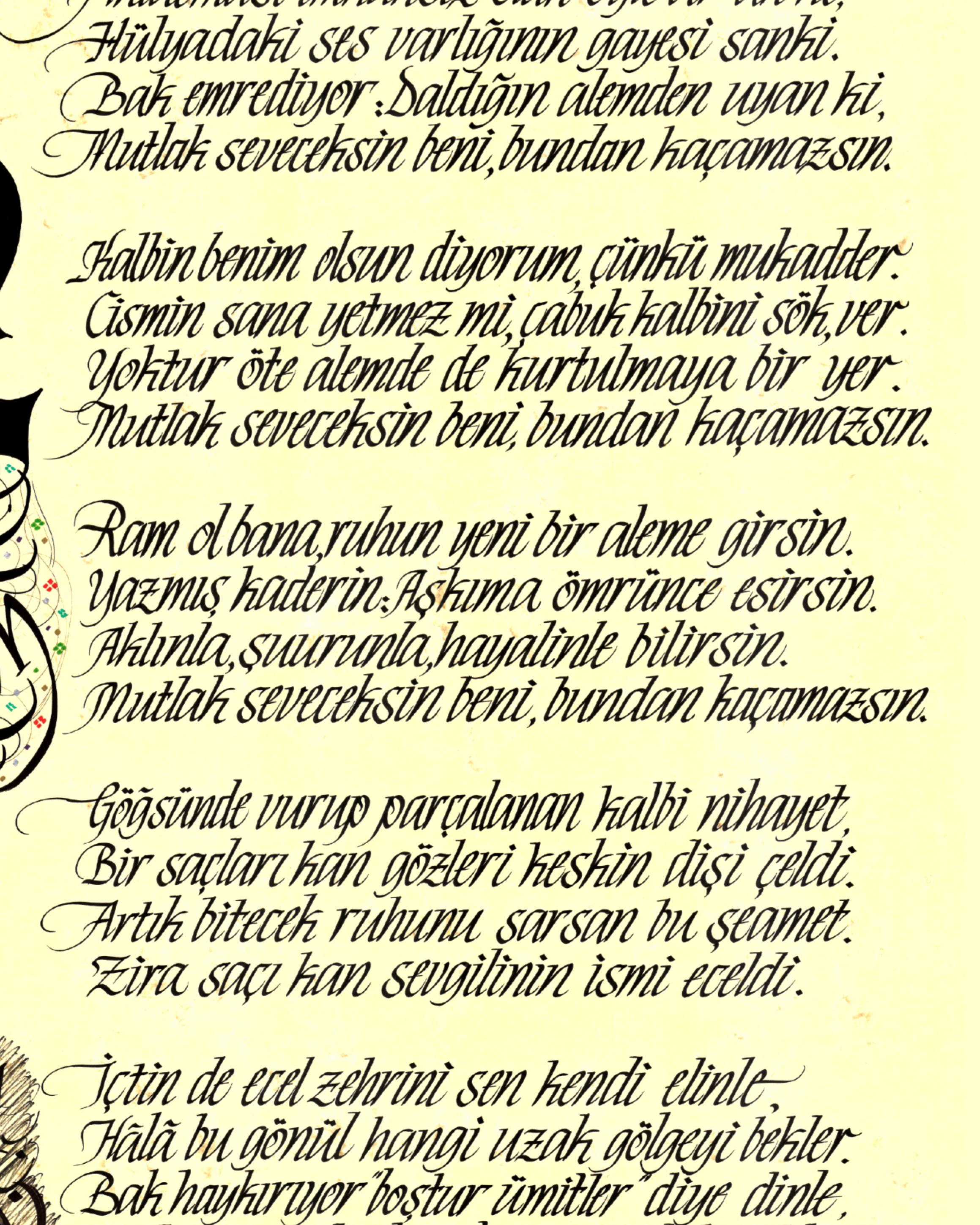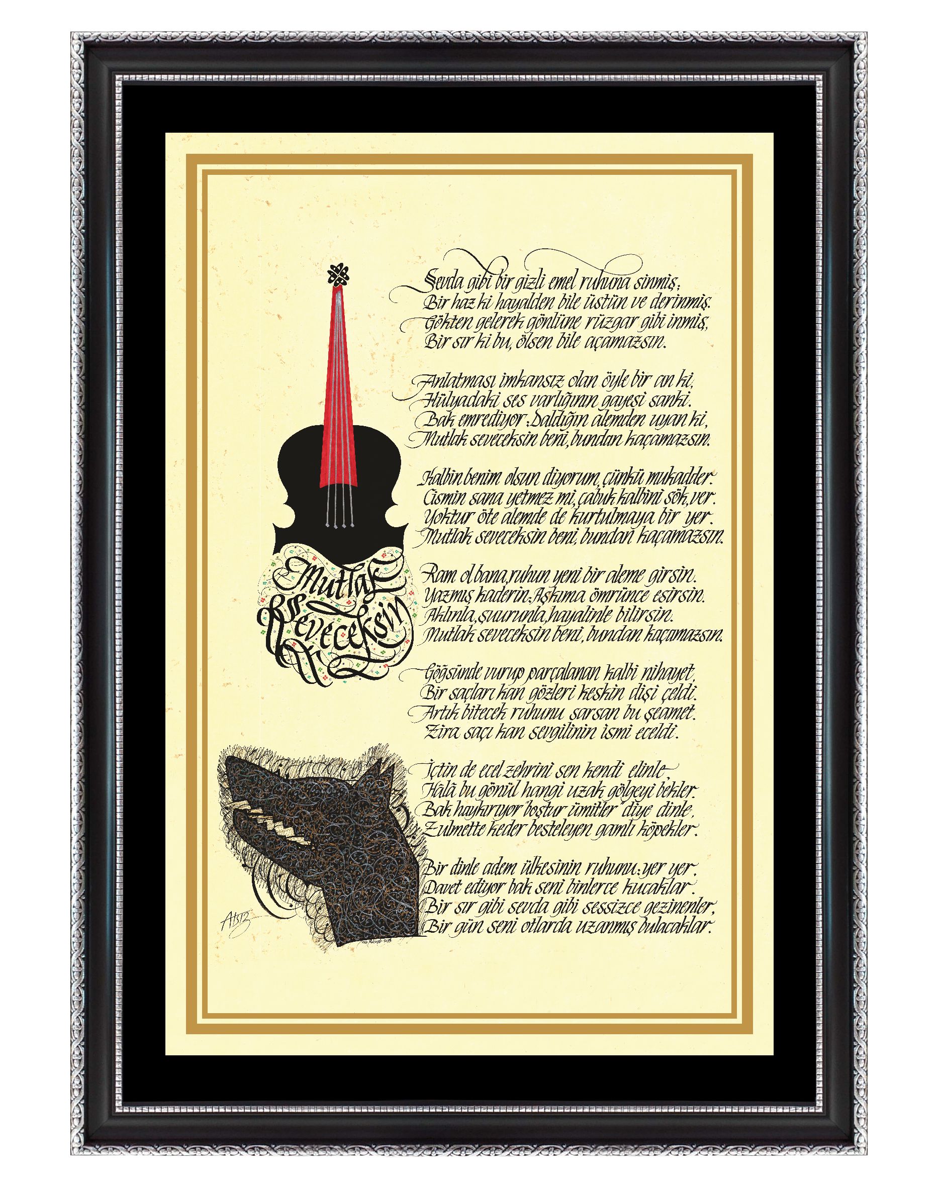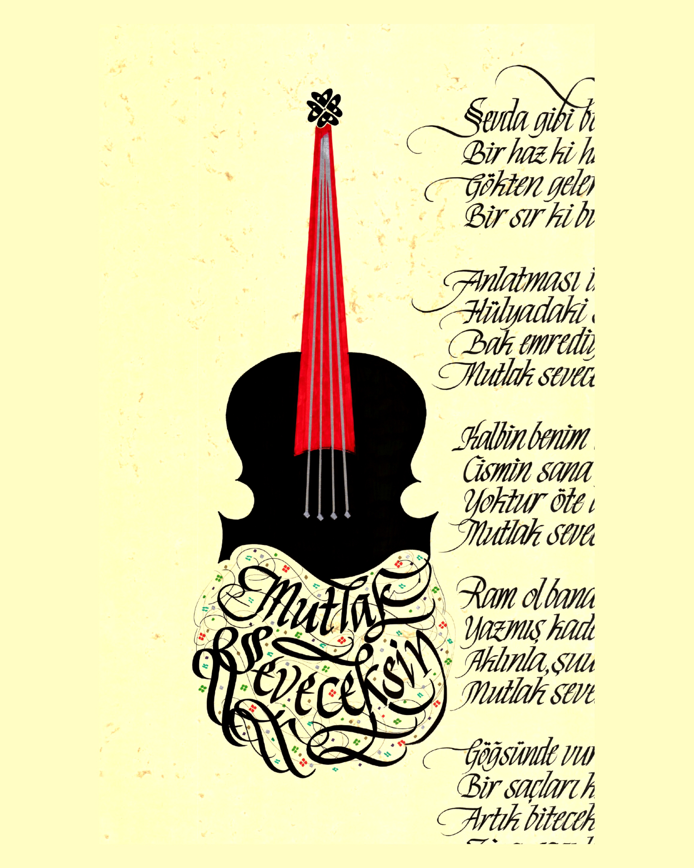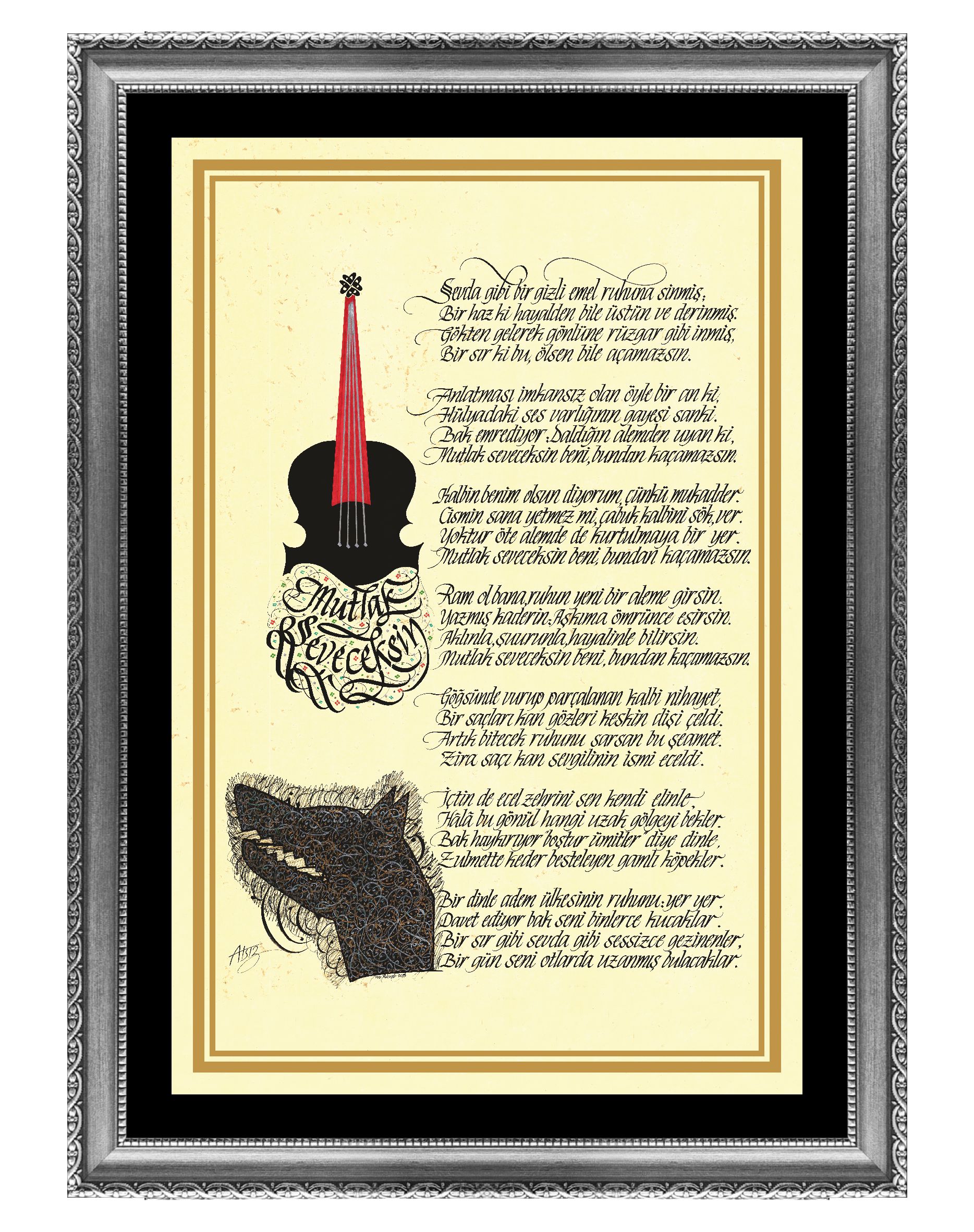 Nihal Atsız’ın “Mutlak Seveceksin” adlı şiiri. Keman içerisinde şiirin başlığı yer alıyor ve sol altta Göktürk Kurt başlı desen tasarımı çalışıldı.
