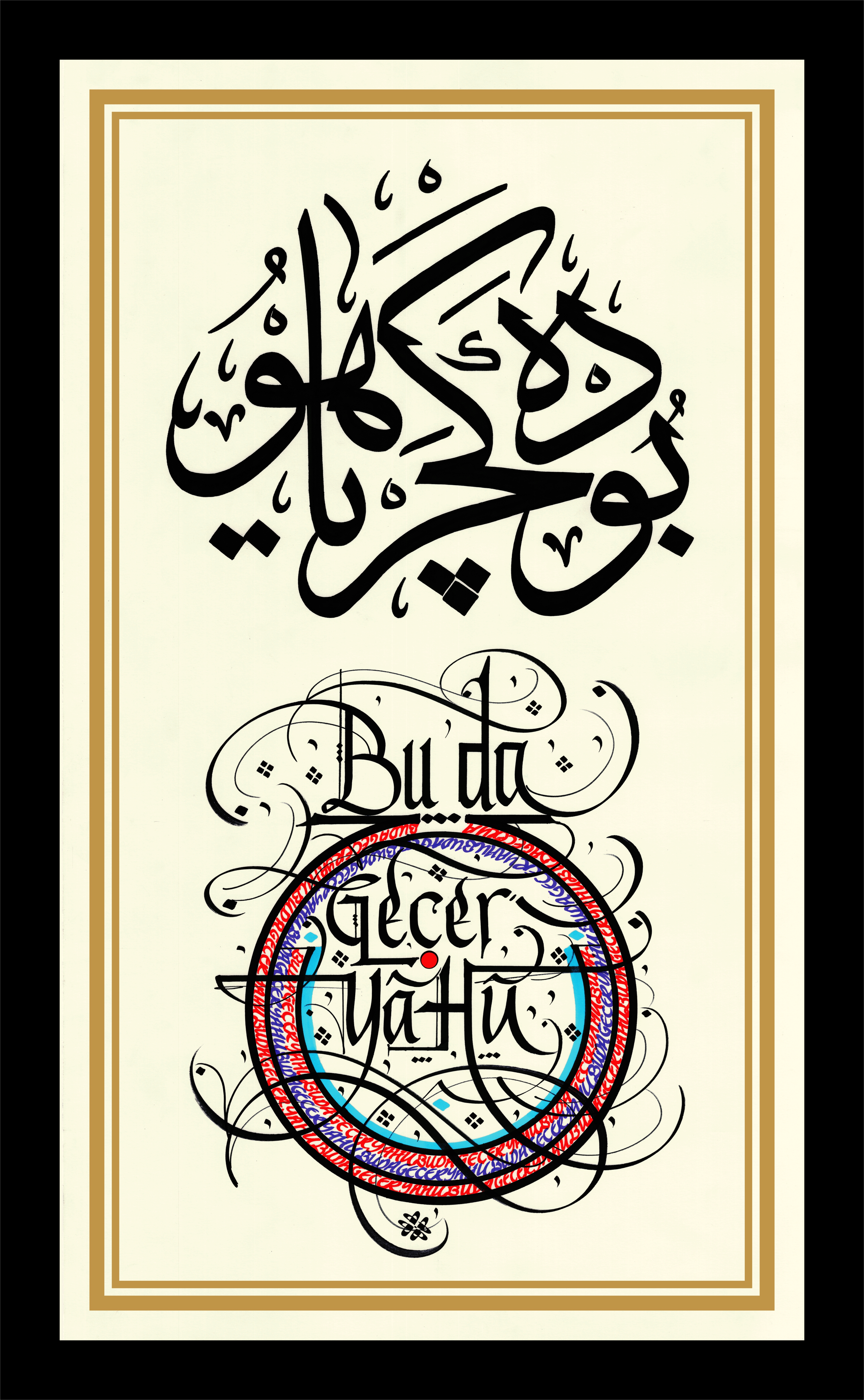 Sülüs yazı Osmanlı Türkçesiyle “Bu da geçer ya Hu” yazılarak alt bölüme daire formunda günümüz Türkçesiyle sözün tekrarı yazılı. Daire içerisine kırmızı ve mor renkle sözün aynısı nakşedildi.