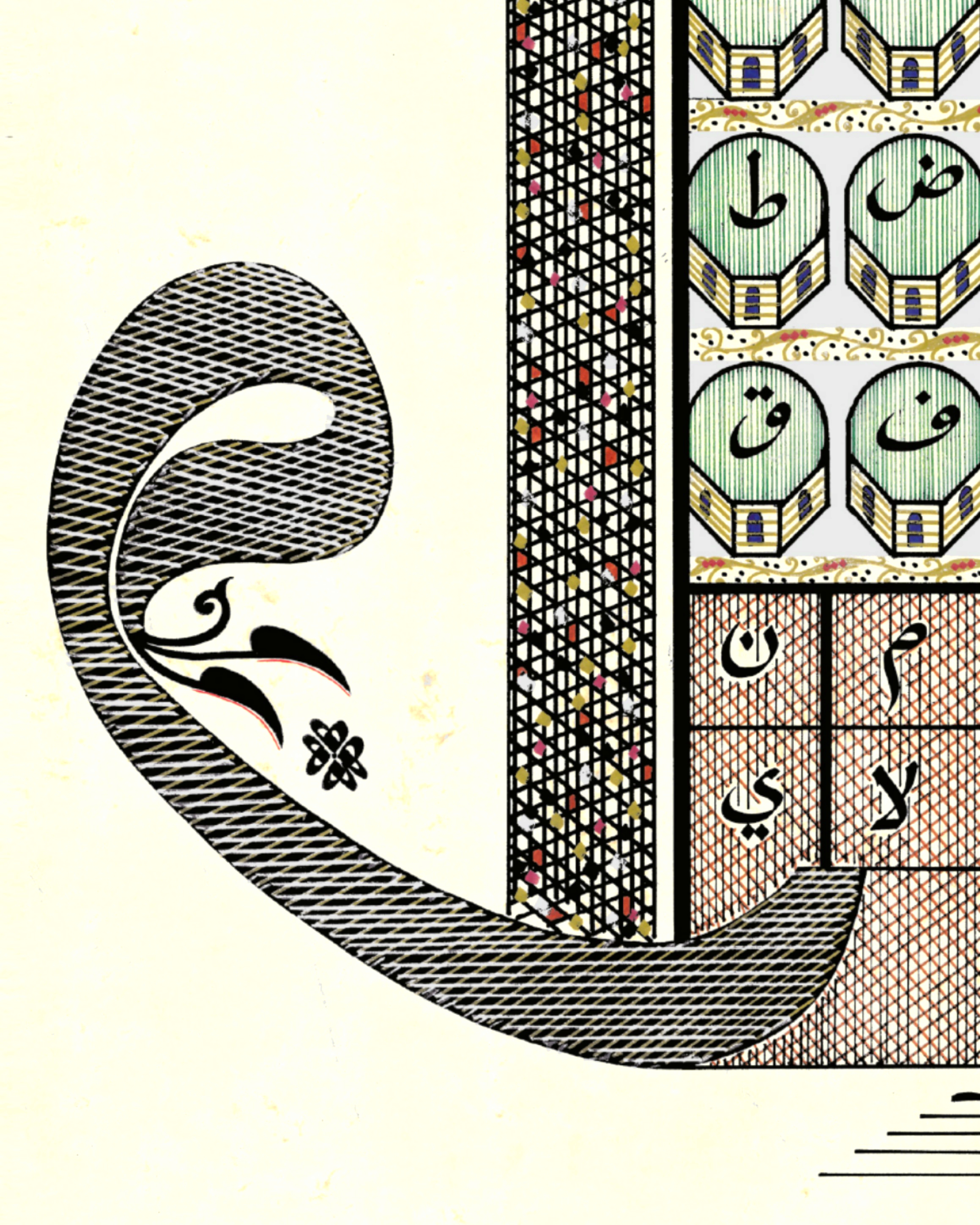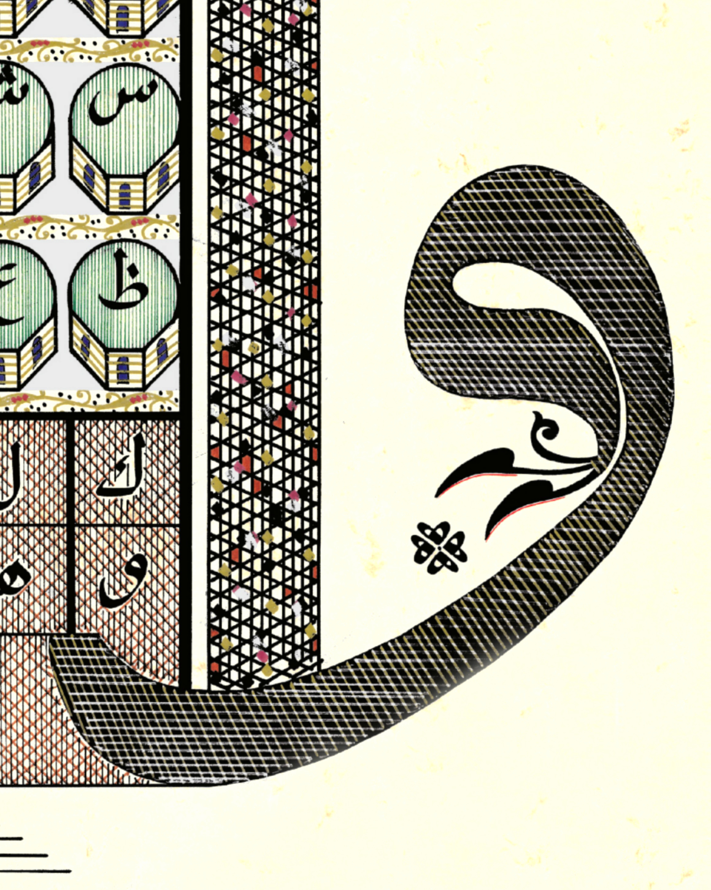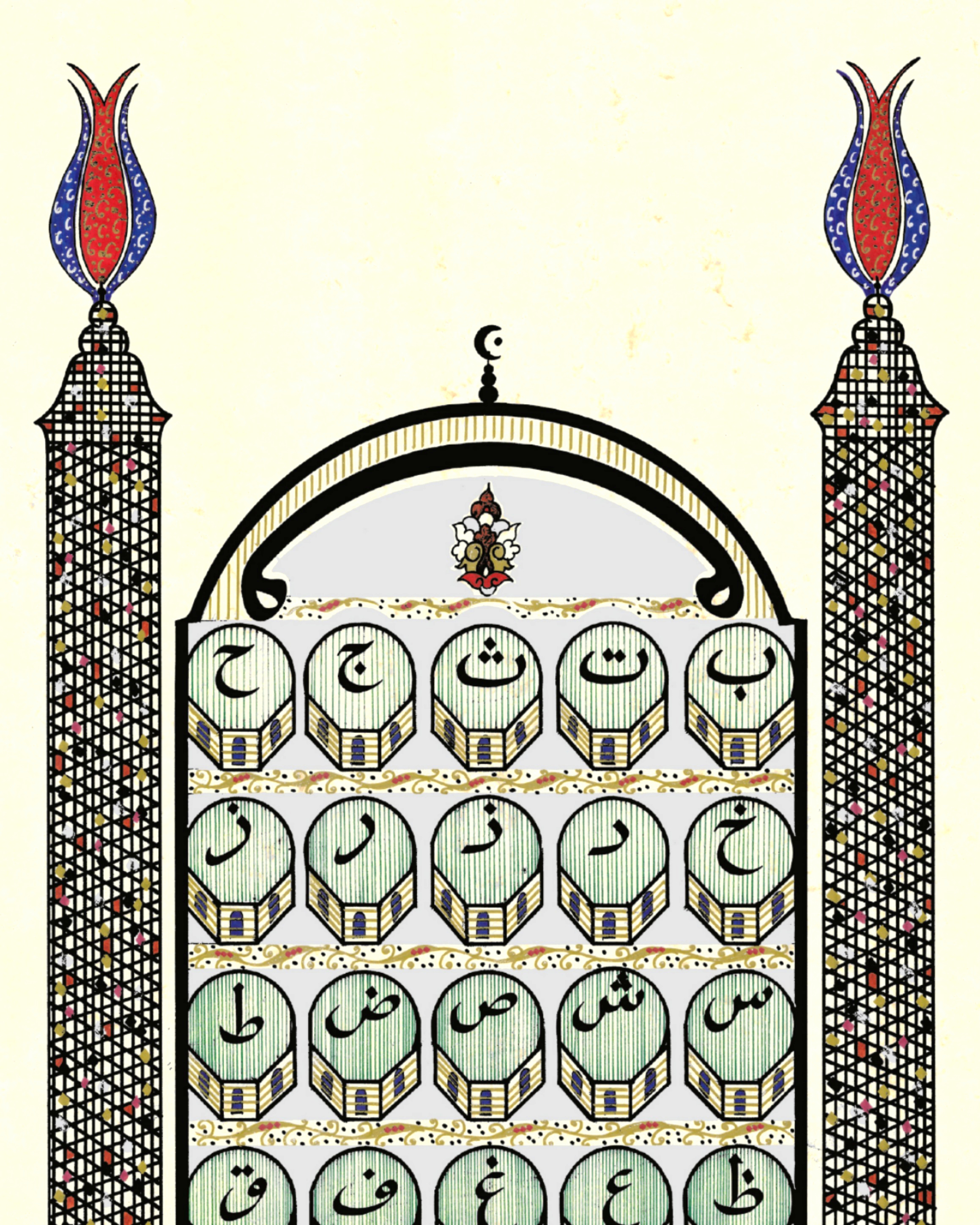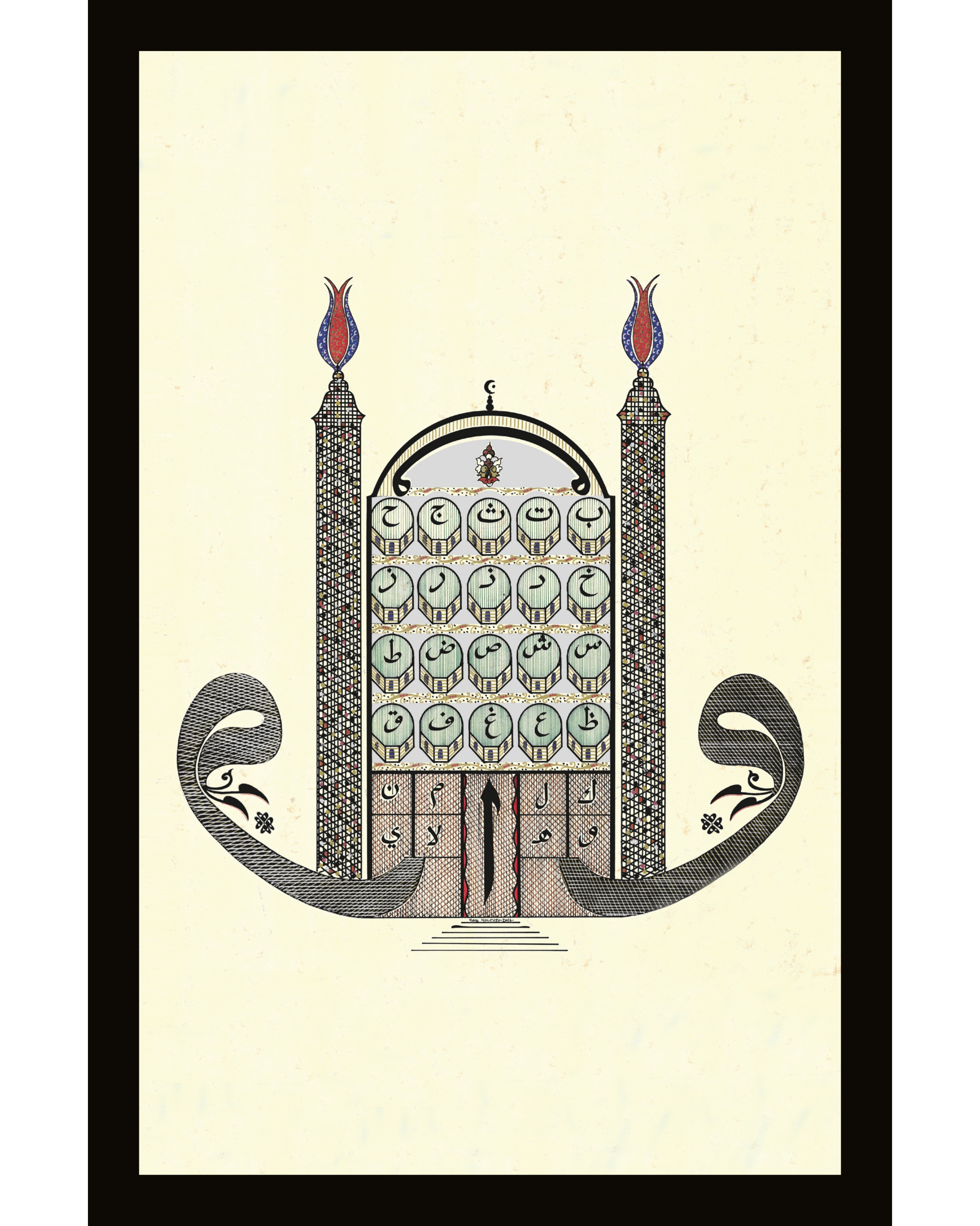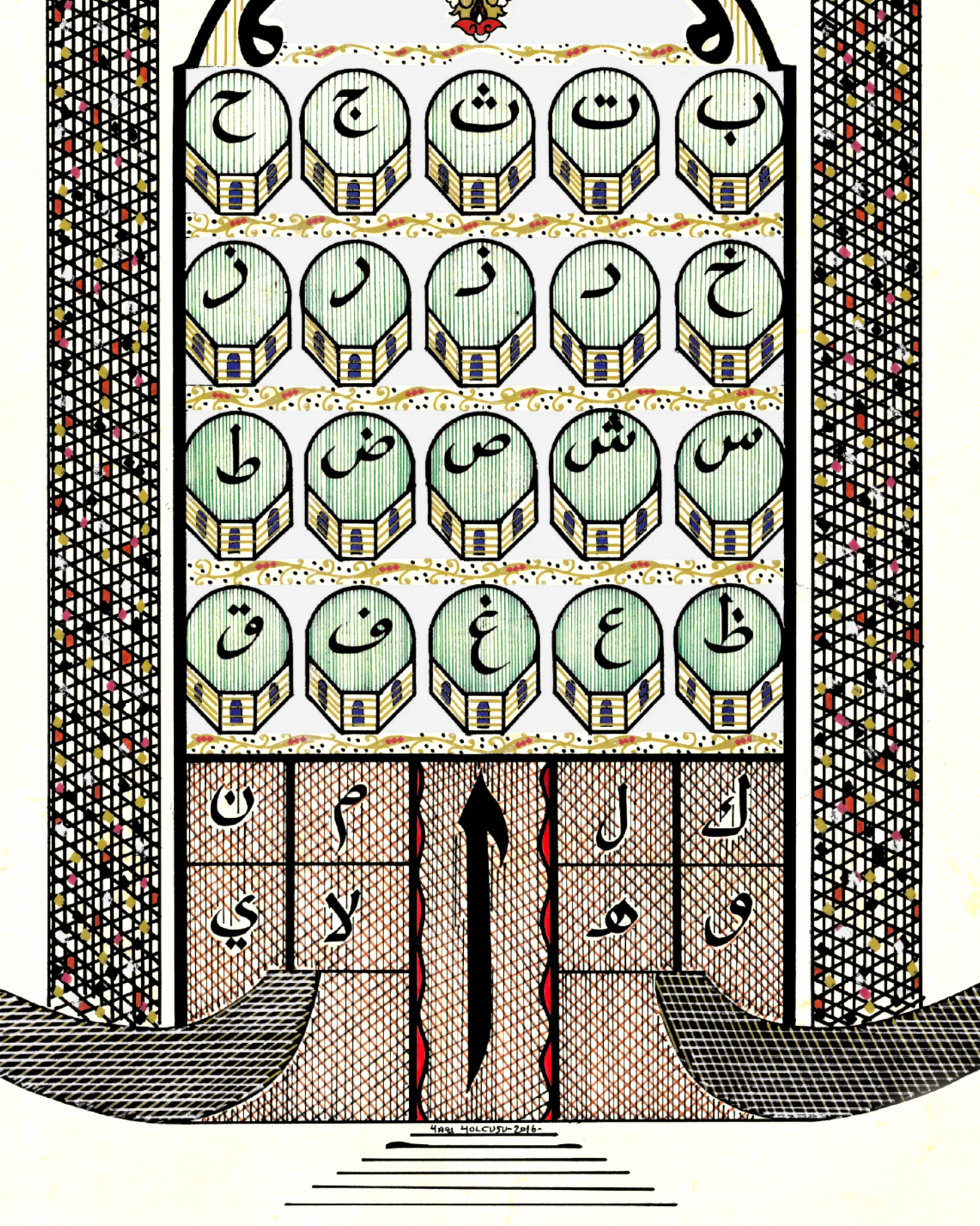 Bursa Ulucami tasarımı. Üzerinde 20 kubbeler içerisinde Arapça Elifba harflerinin tamamı yazılı. Kubbeler iki boyutlu tasarlandı ve ara boşlukları gümüş renkle bezendi. Her iki minare, Bursa Ulucami minarelerinin dış form özelliğinde ve bakla dilimleriyle meydana getirilerek, minare uçlarına Bursa Uluşehir’in logosunda yer alan motifleriyle nakşedildi. Sağ ve soldaki Vav harfleriyle, Ulucami’nin doğu ve batı kapısına işaret edilerek, ortadaki Elif harfiyle de kuzey kapısına vurgu yapıldı. Elif harfinin yer aldığı bölüme hasır görüntüsü verilerek harfin altında yer alan 6 çizgiyle de merdivenler oluşturuldu. En üstte ters biçimde çift başlı vav harfi yer alıyor, bununla da Cami içerisindeki çeşmeli havuza vurgu yapılarak eskitme zemine çalışıldı.