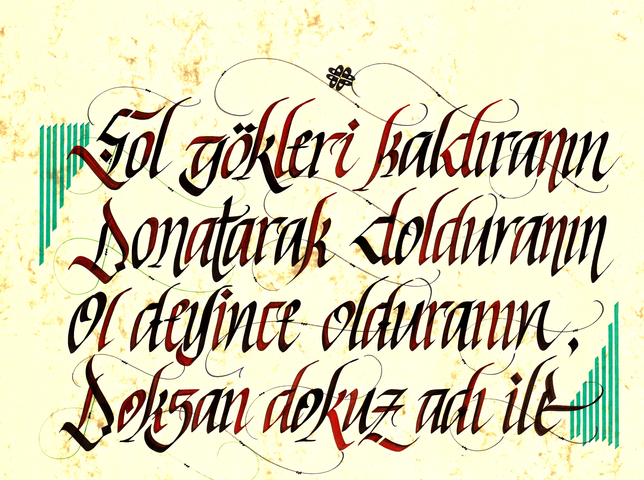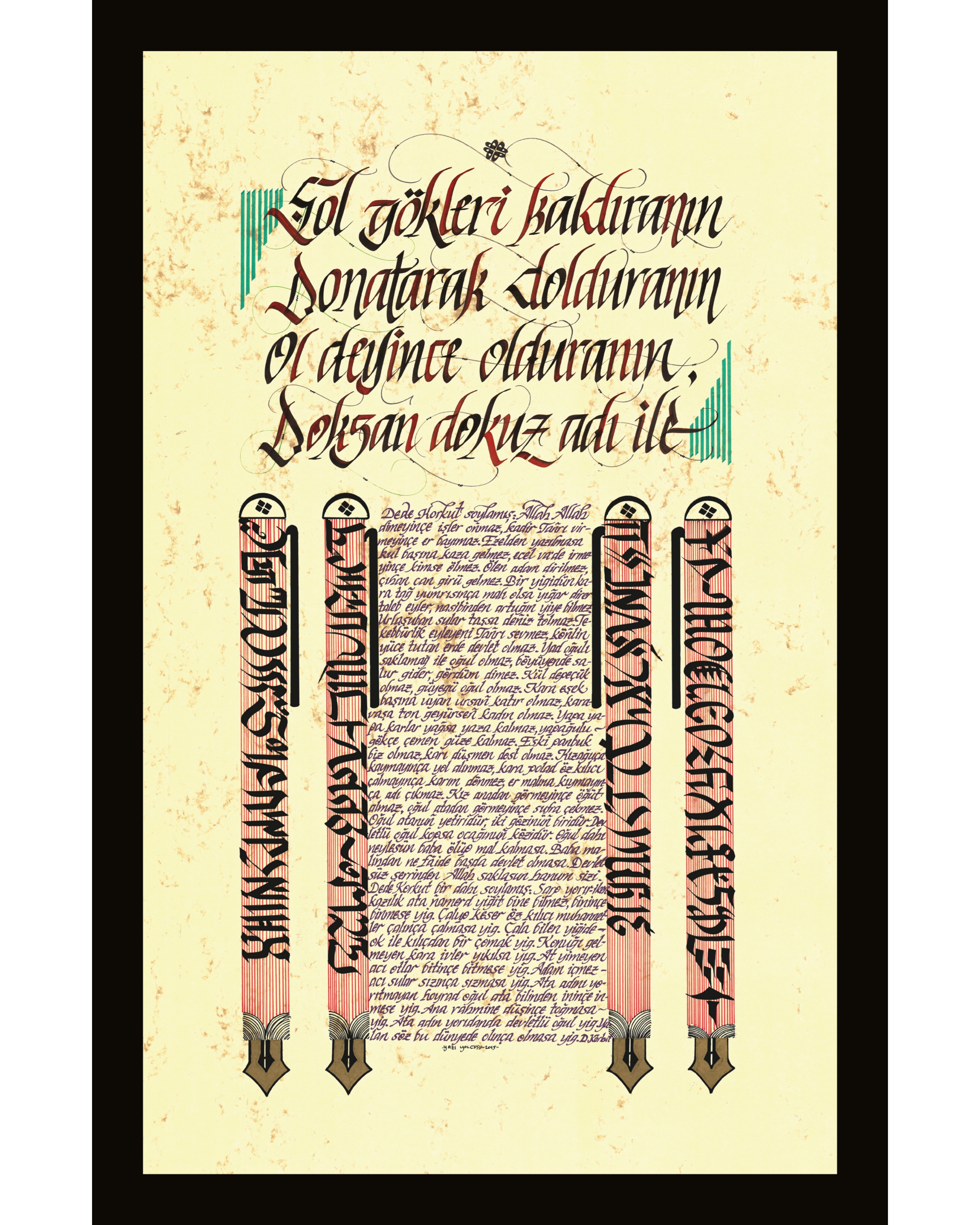 Üst bölümde “Şol gökleri kaldıranın, donatarak dolduranın, ol deyince olduranın, doksan dokuz adı ile”. Söz 74 harften oluşuyor. Kalem görsellerinin içinde 74 farklı dilin ses değerleriyle yine bu söz yer alıyor. Ortadaki mor renkli küçük yazı Dede Korkut’un giriş bölümü.