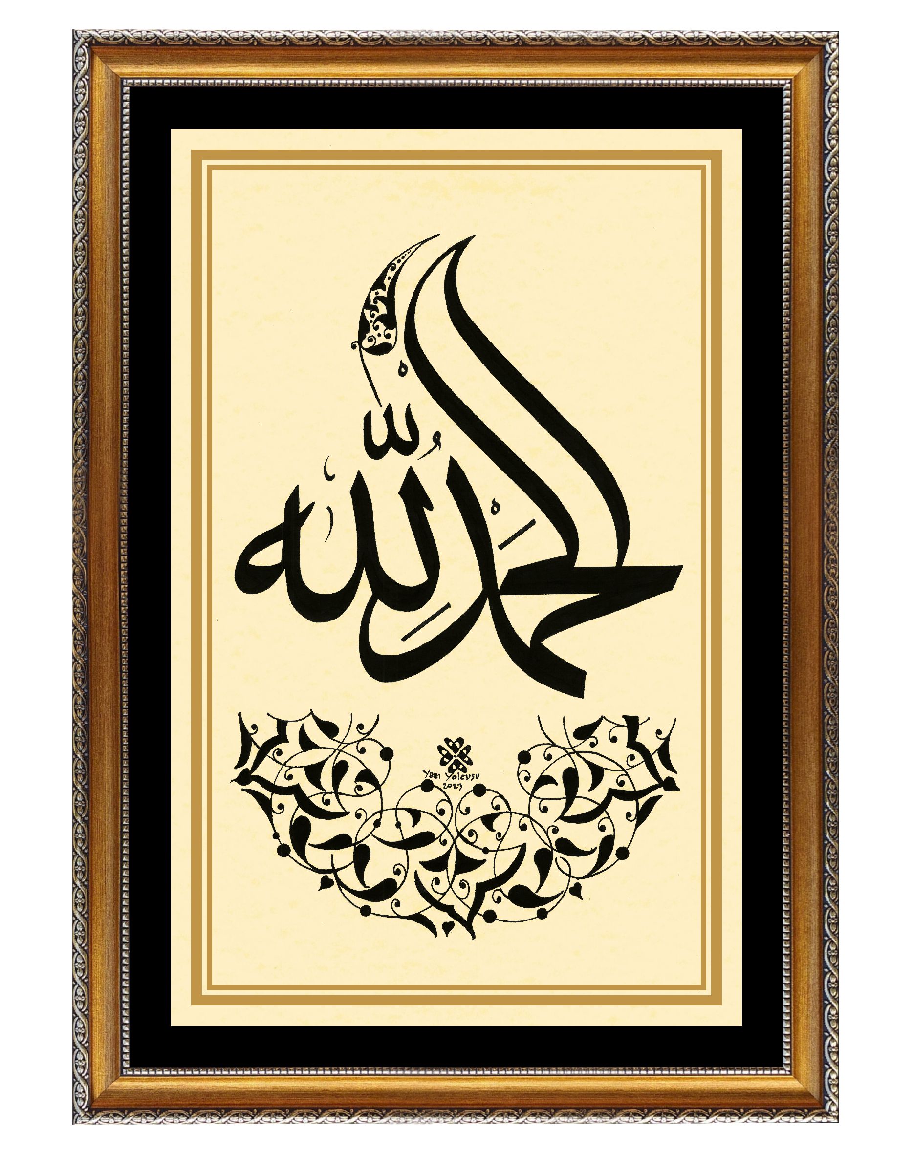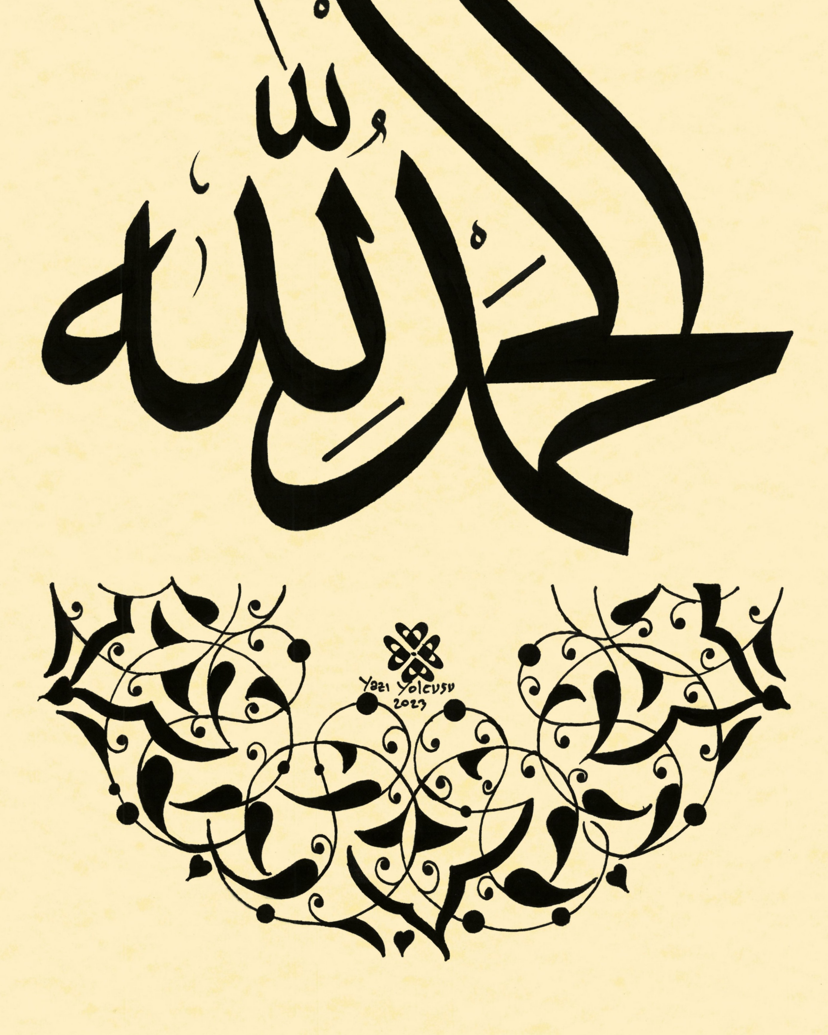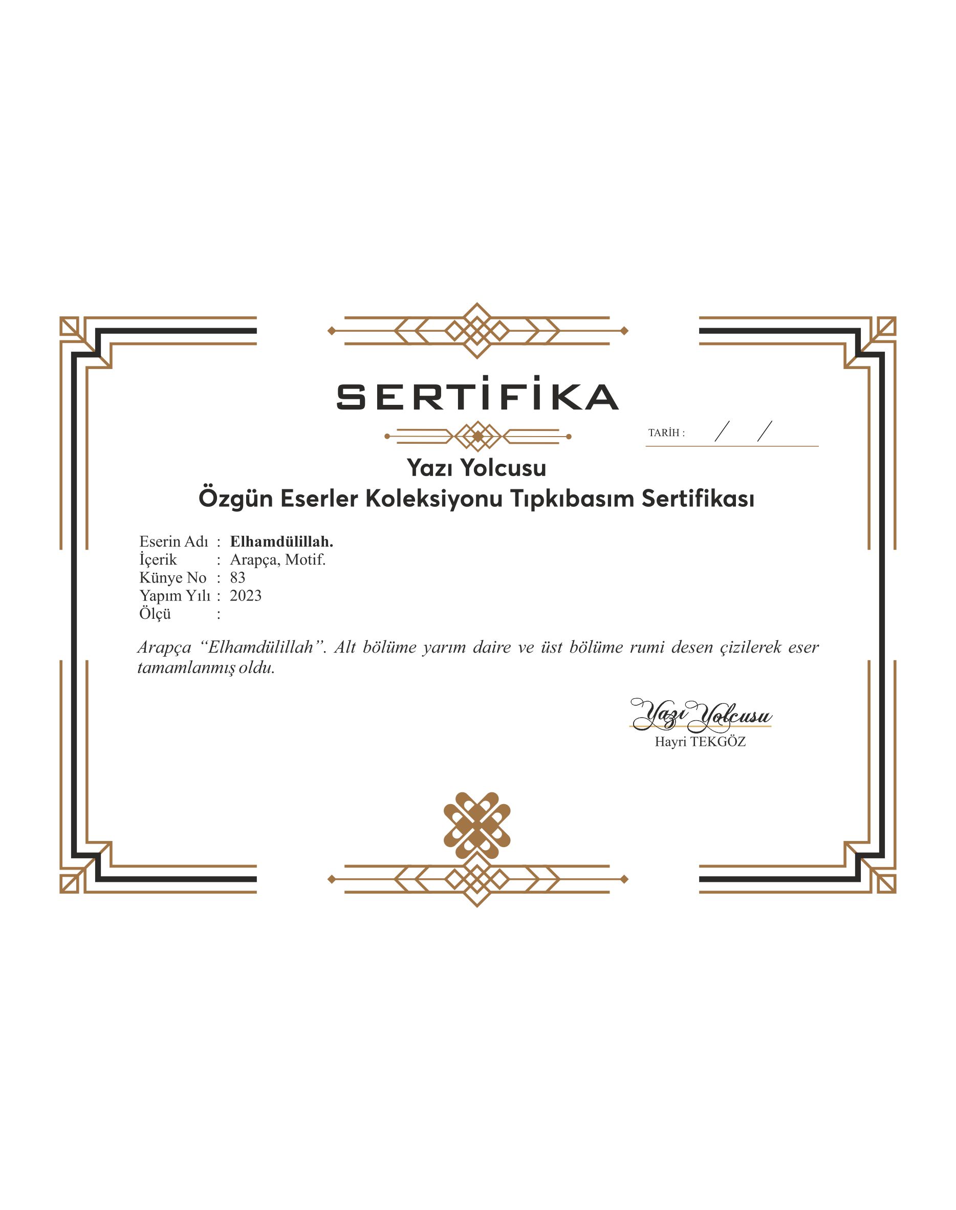Arapça “Elhamdülillah”. Alt bölüme yarım daire ve üst bölüme rumi desen çizilerek eser tamamlanmış oldu.