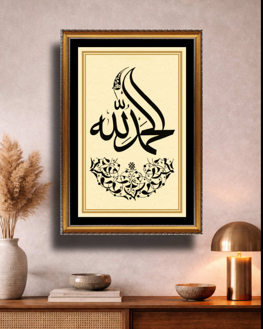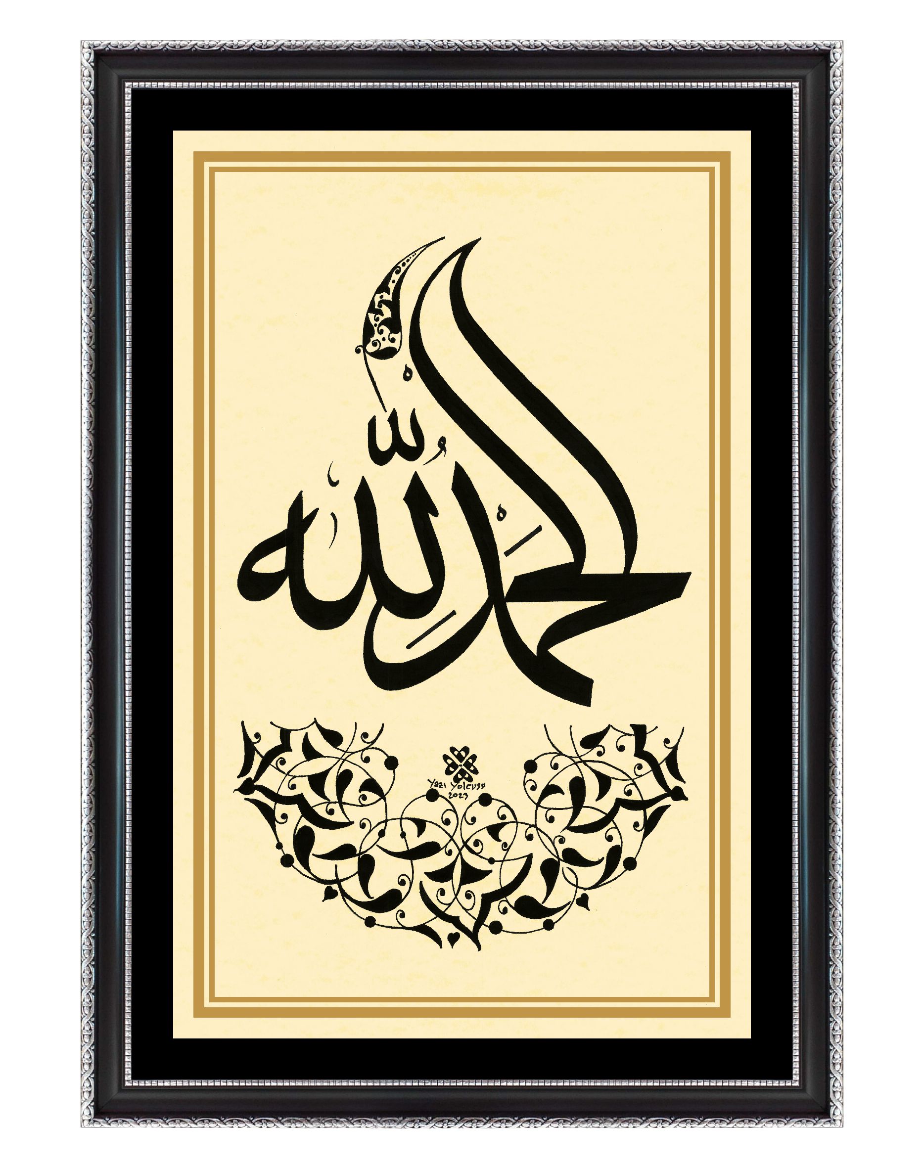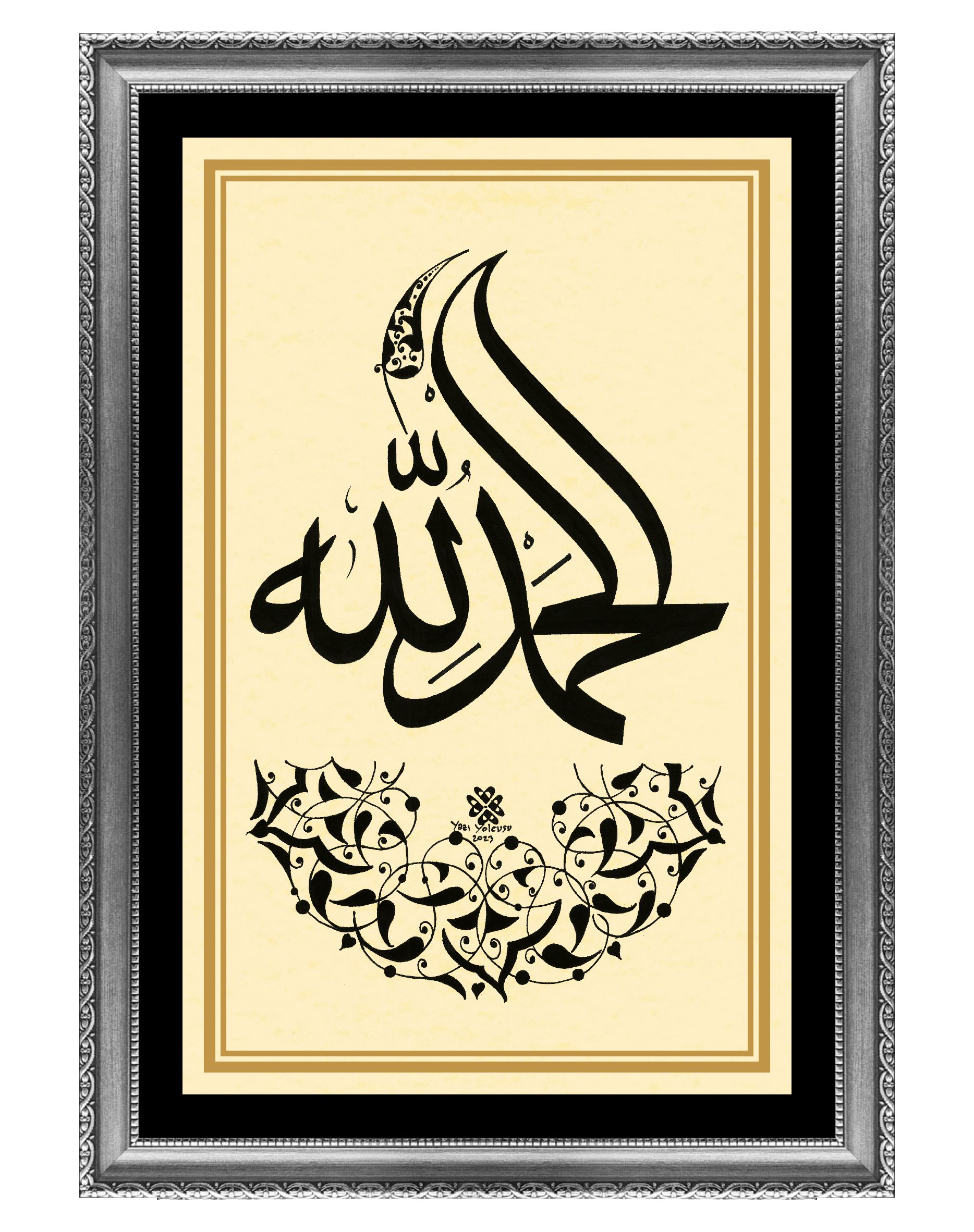 Arapça “Elhamdülillah”. Alt bölüme yarım daire ve üst bölüme rumi desen çizilerek eser tamamlanmış oldu.