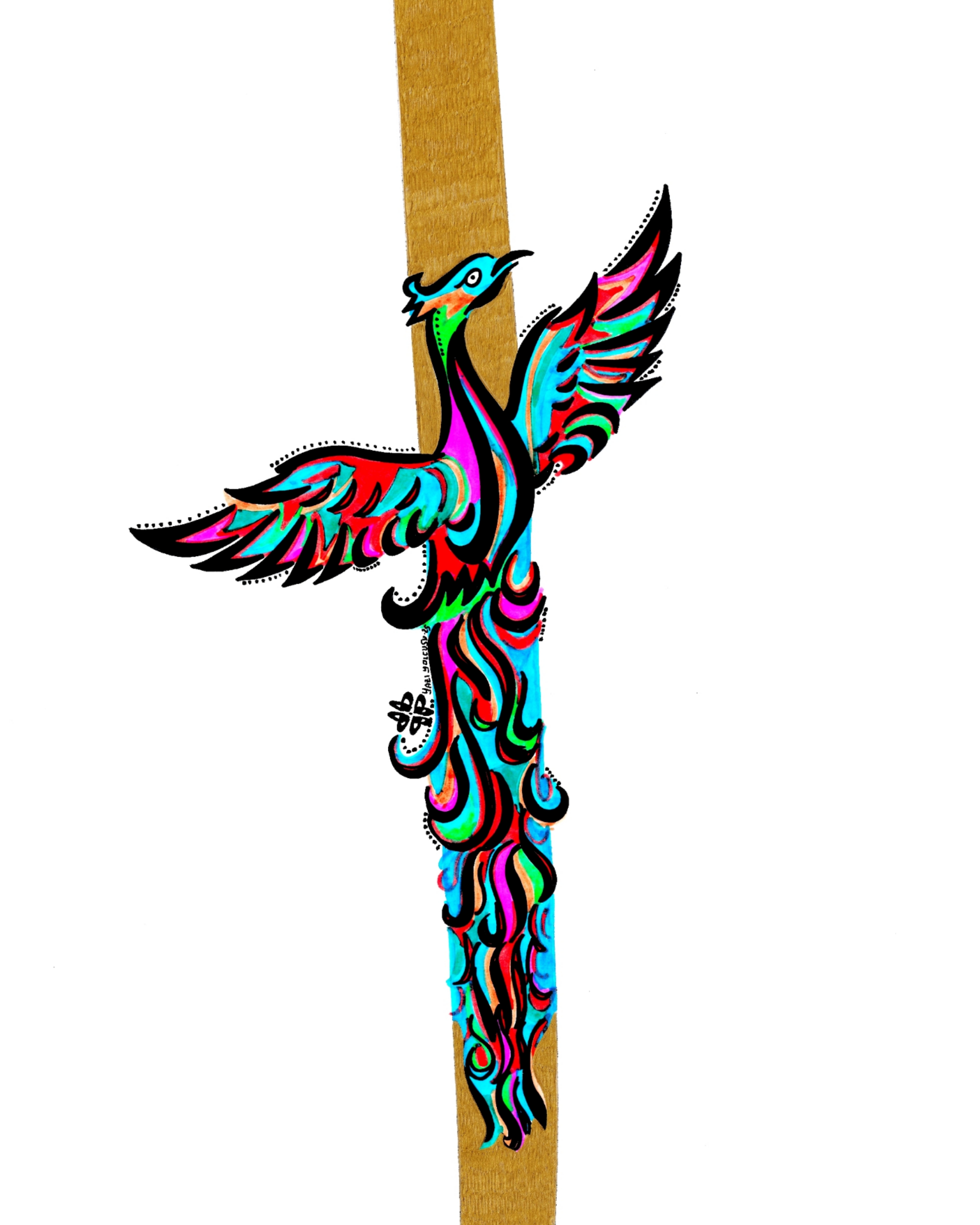 “Elif, Anka Tuğrul kuşu.” Beyaz zemin üzerine Arapça Elif harfi ve gövde kısmına Anka-Tuğrul kuşu nakışlı. Elif ve Anka kuşunun baktığı yön aynı yöne tasarlanarak doğruluk ve sadakat timsali bir yoldaşlığa vurgu yapılarak betimlendi.