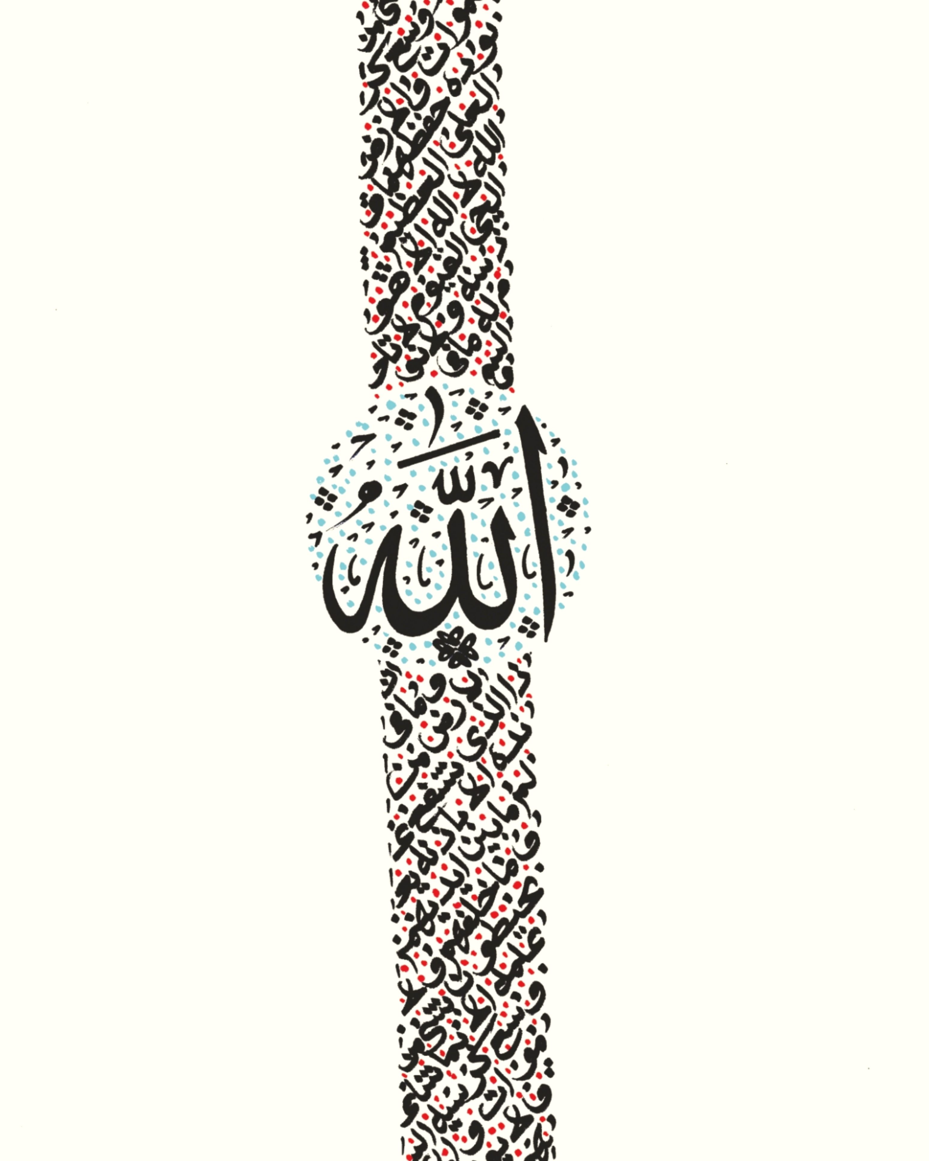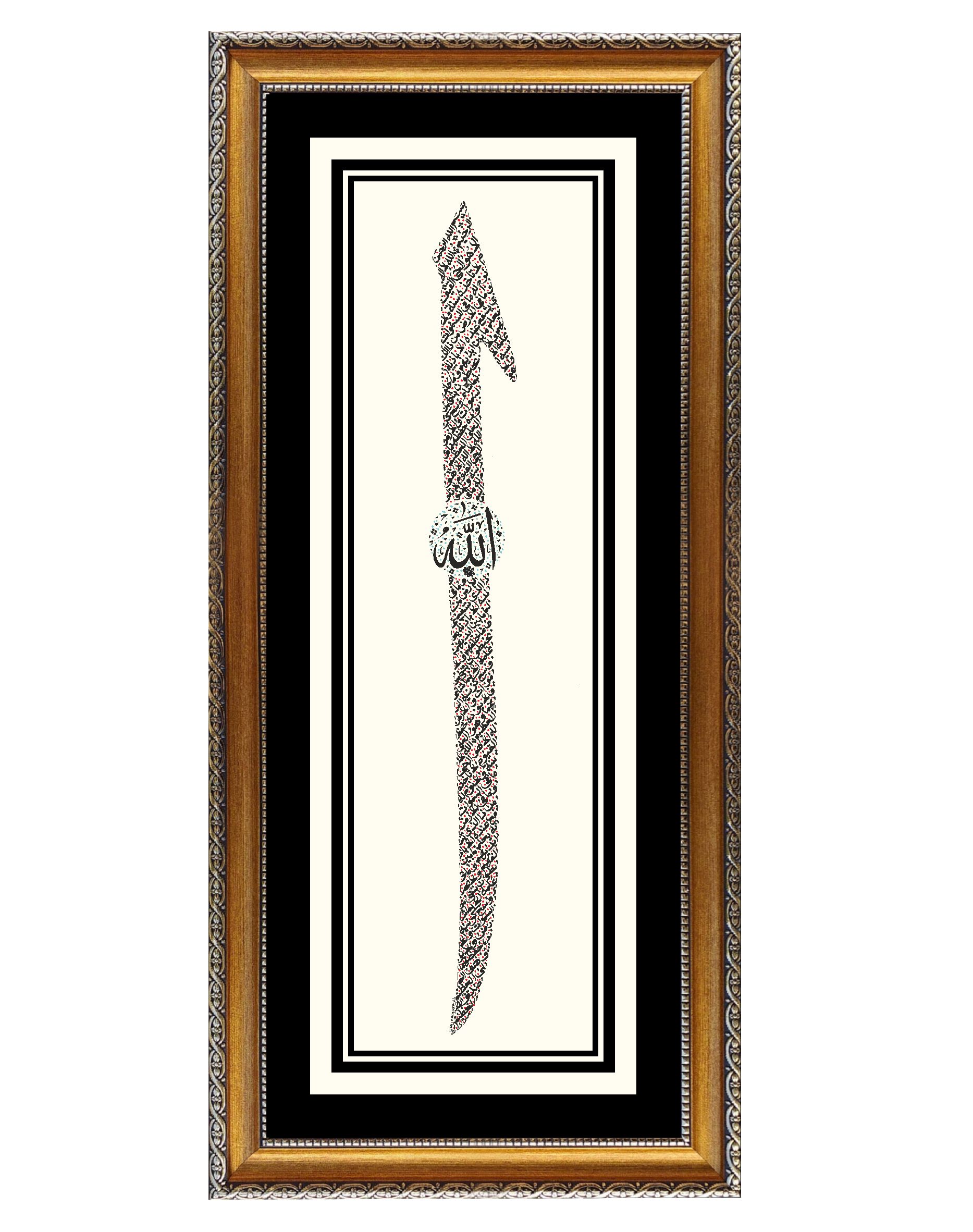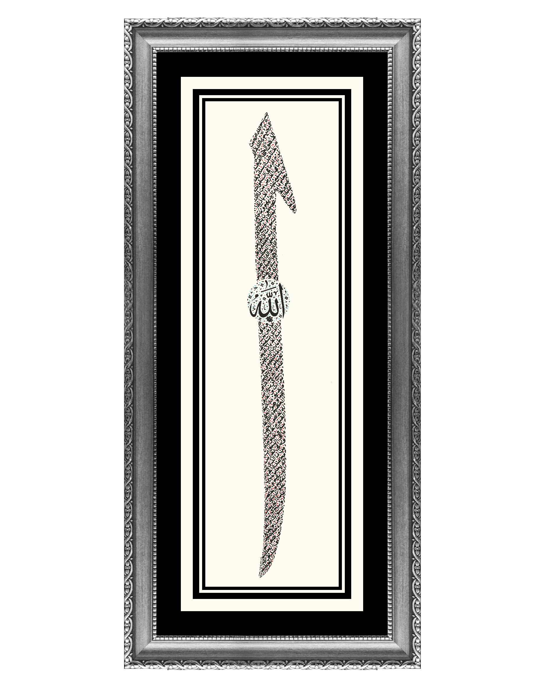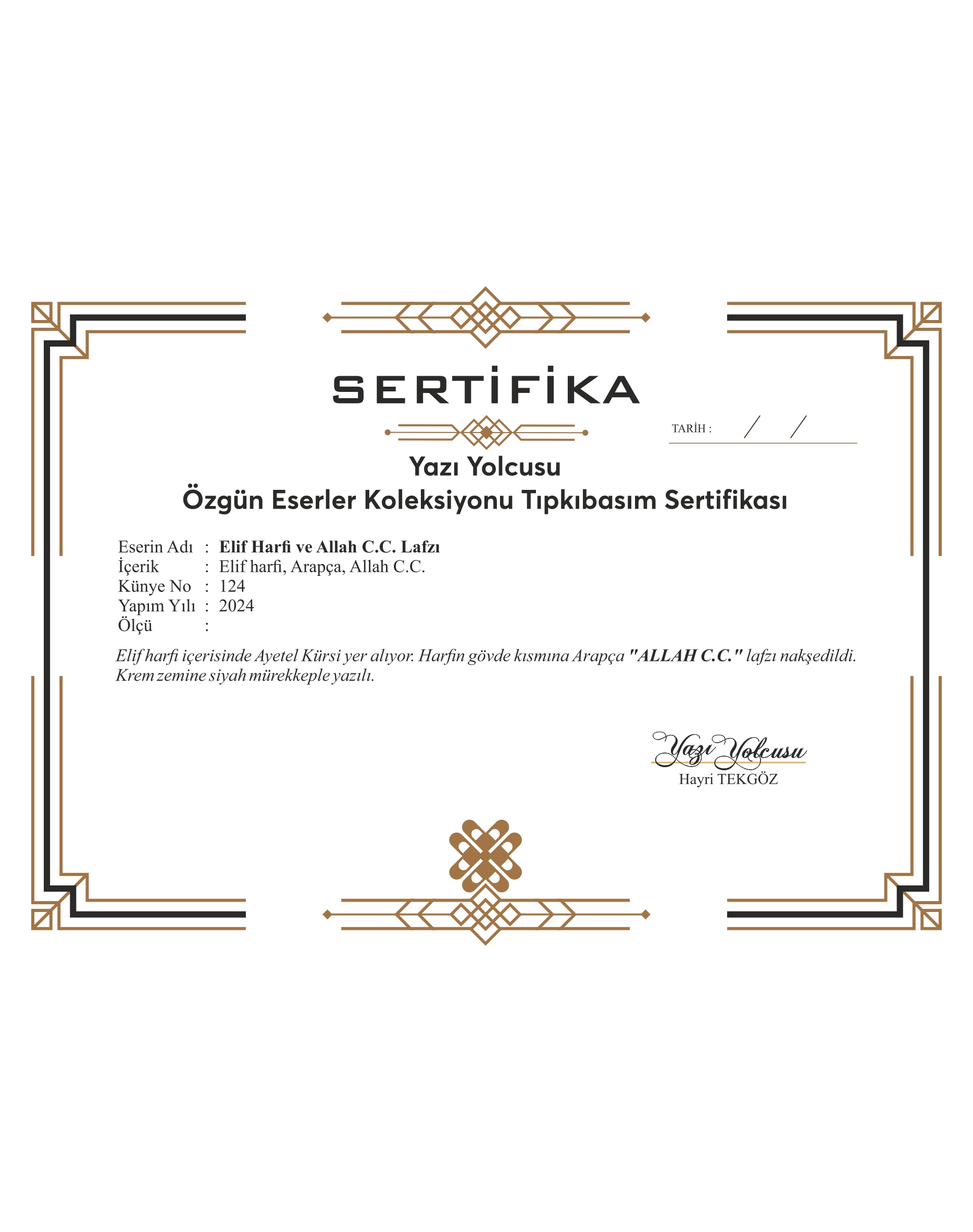 Elif harfi içerisinde Ayetel Kürsi yazılı. Harfin gövde kısmına Arapça “ALLAH C.C.” lafzı nakşedildi. Krem zemine siyah mürekkeple yazılı.