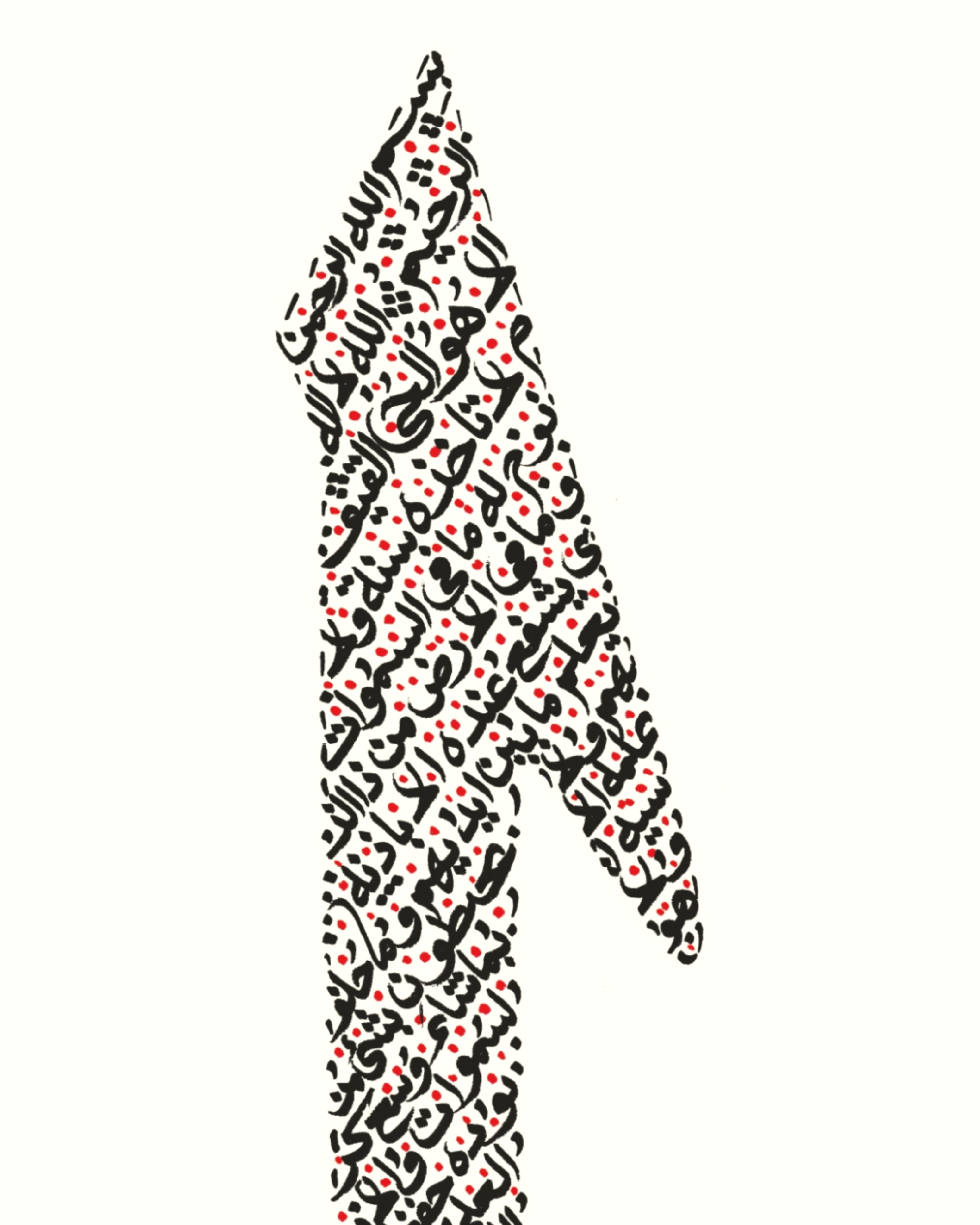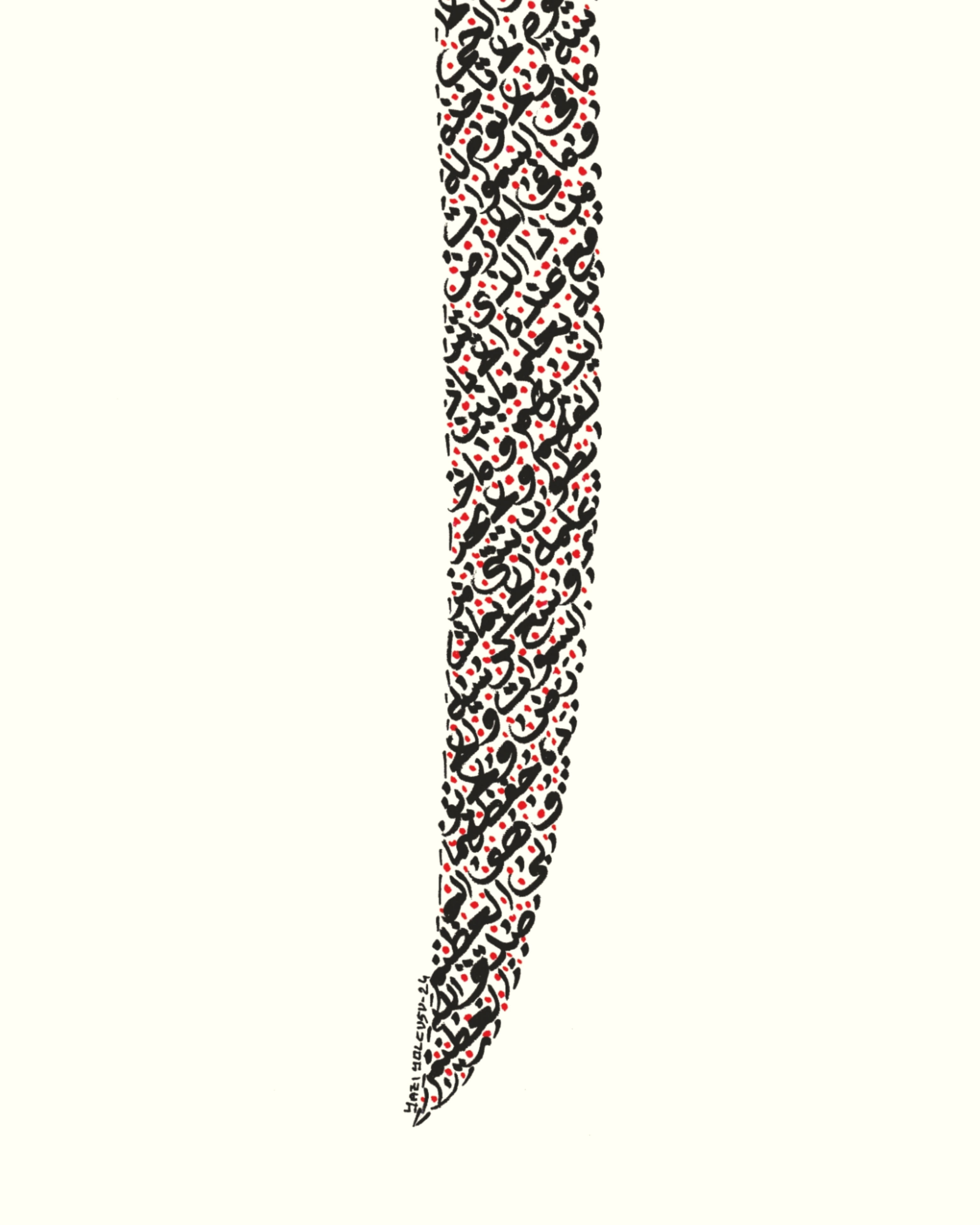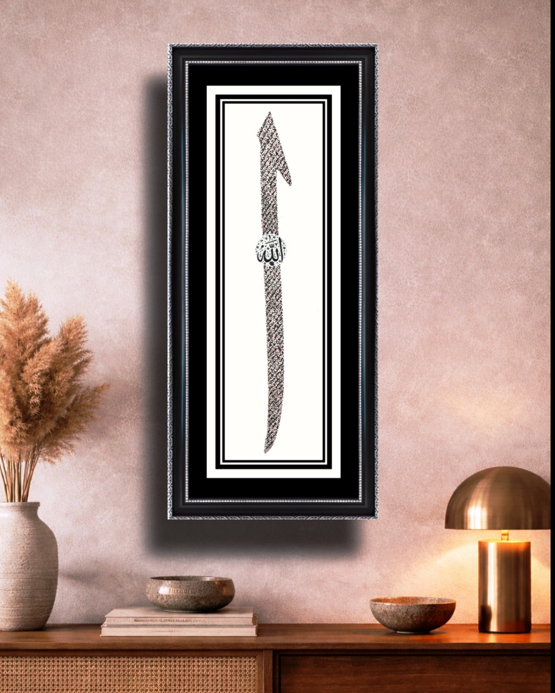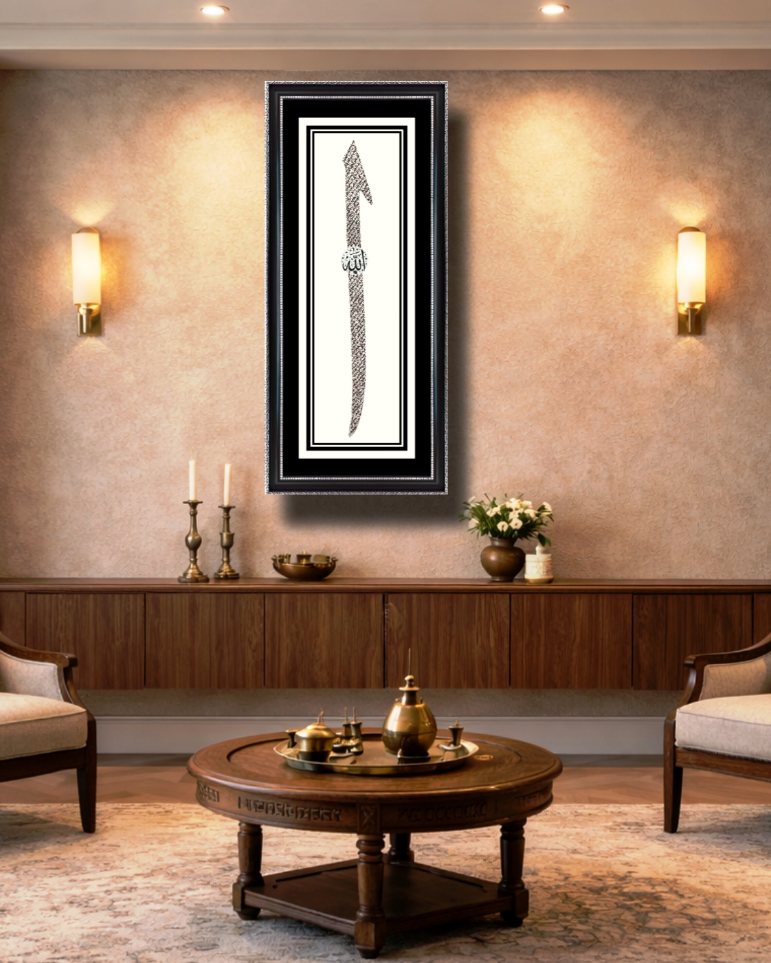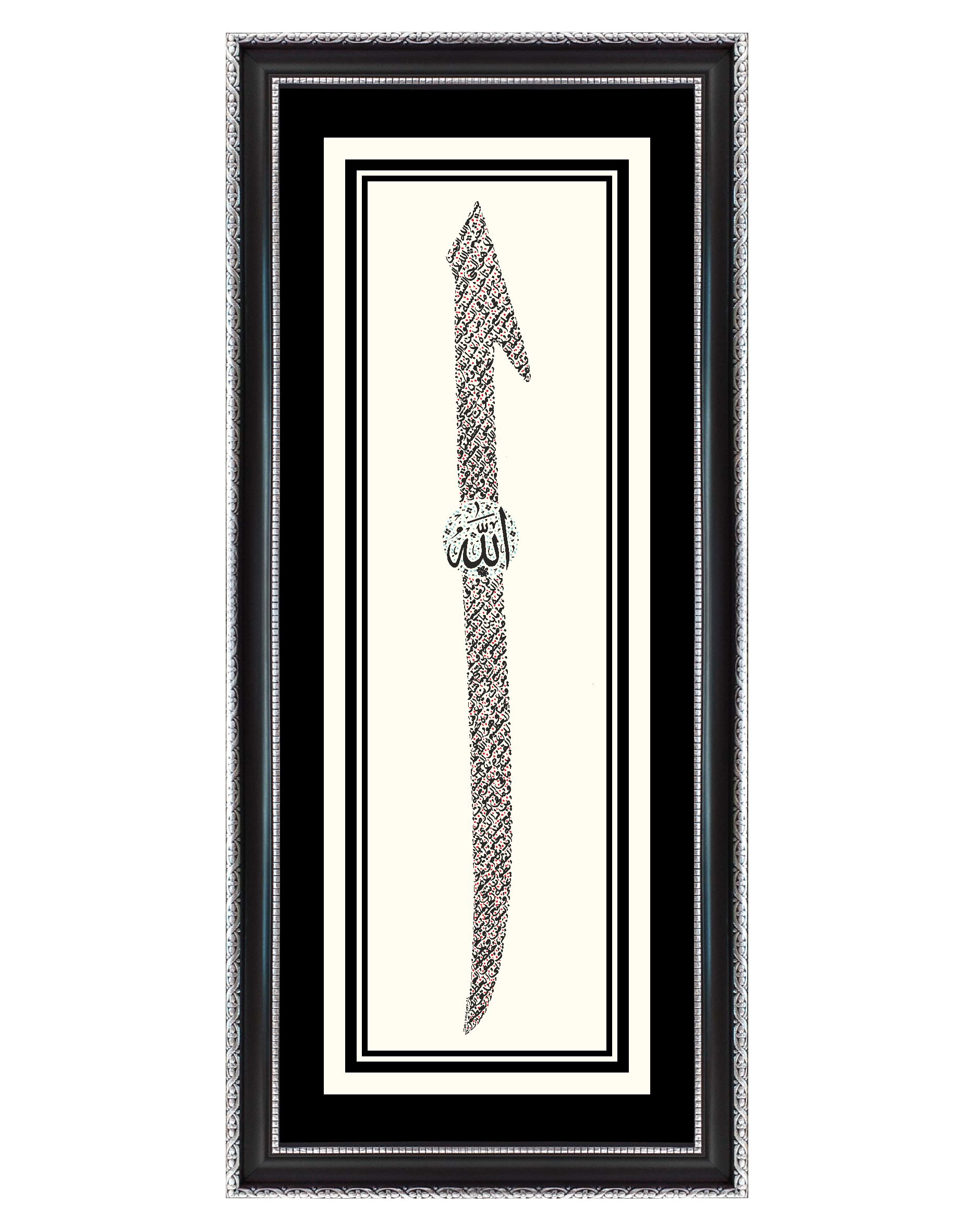 Elif harfi içerisinde Ayetel Kürsi yazılı. Harfin gövde kısmına Arapça “ALLAH C.C.” lafzı nakşedildi. Krem zemine siyah mürekkeple yazılı.