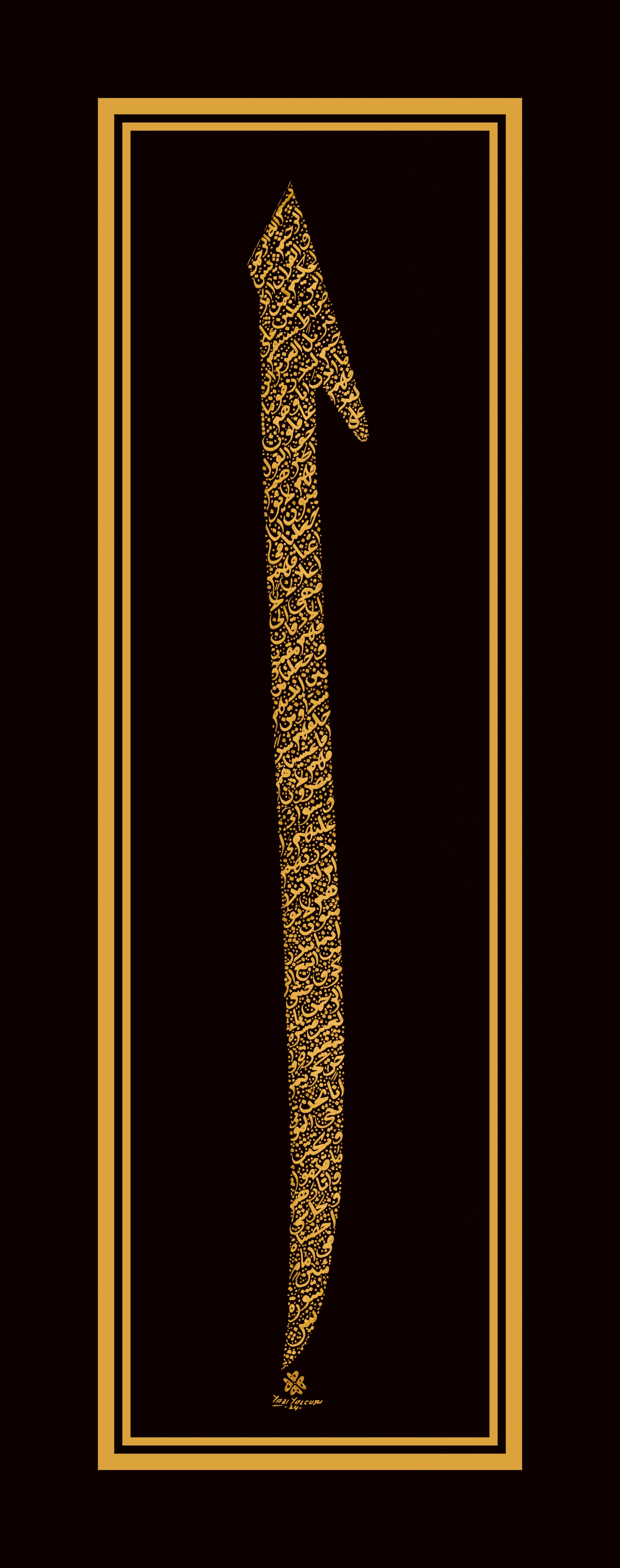 Elif harfi içerisinde Yasin Suresinin ilk sayfası yer alıyor. Siyah zemine altın yaldızla yazıldı.
