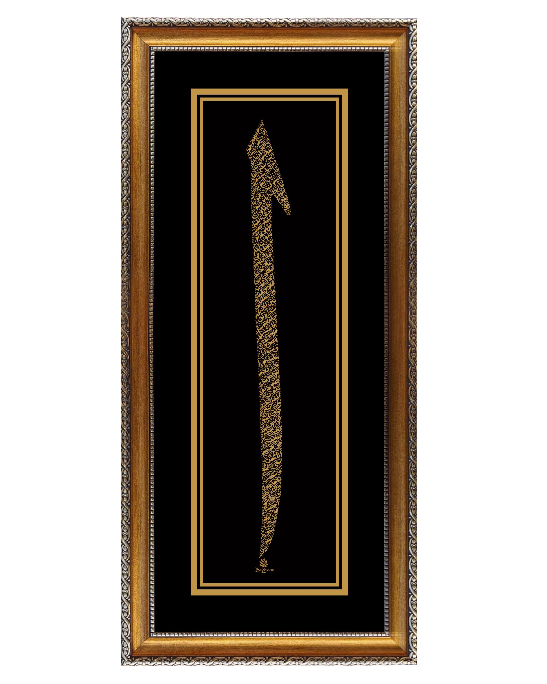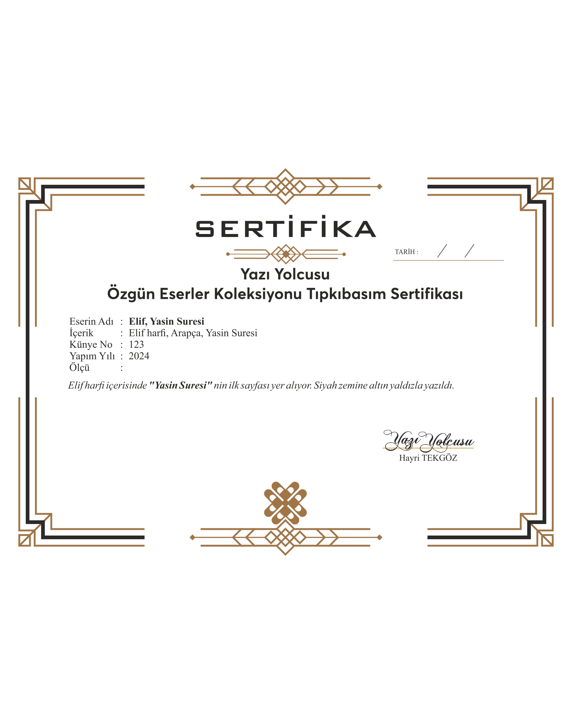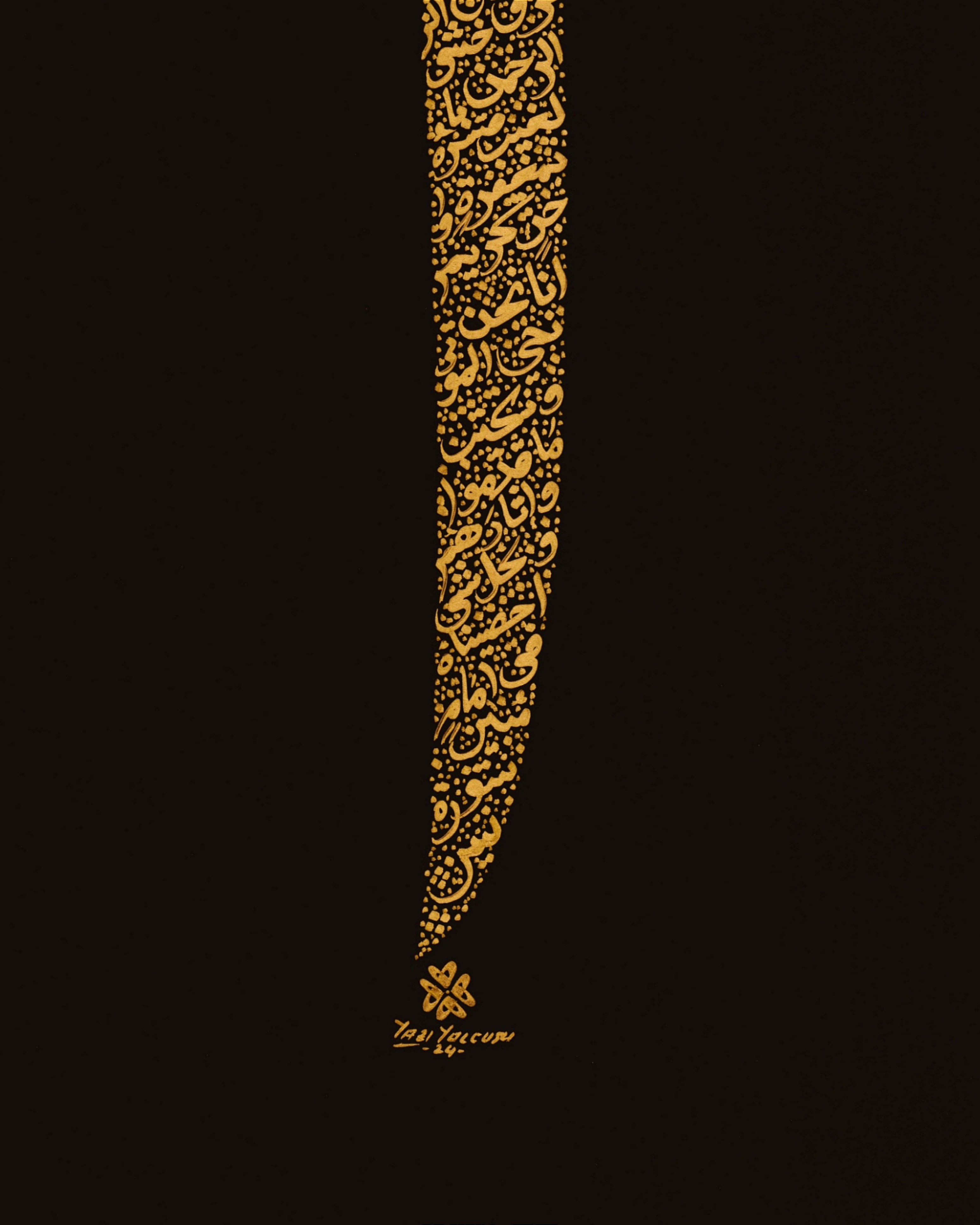 Elif harfi içerisinde Yasin Suresinin ilk sayfası yer alıyor. Siyah zemine altın yaldızla yazıldı.