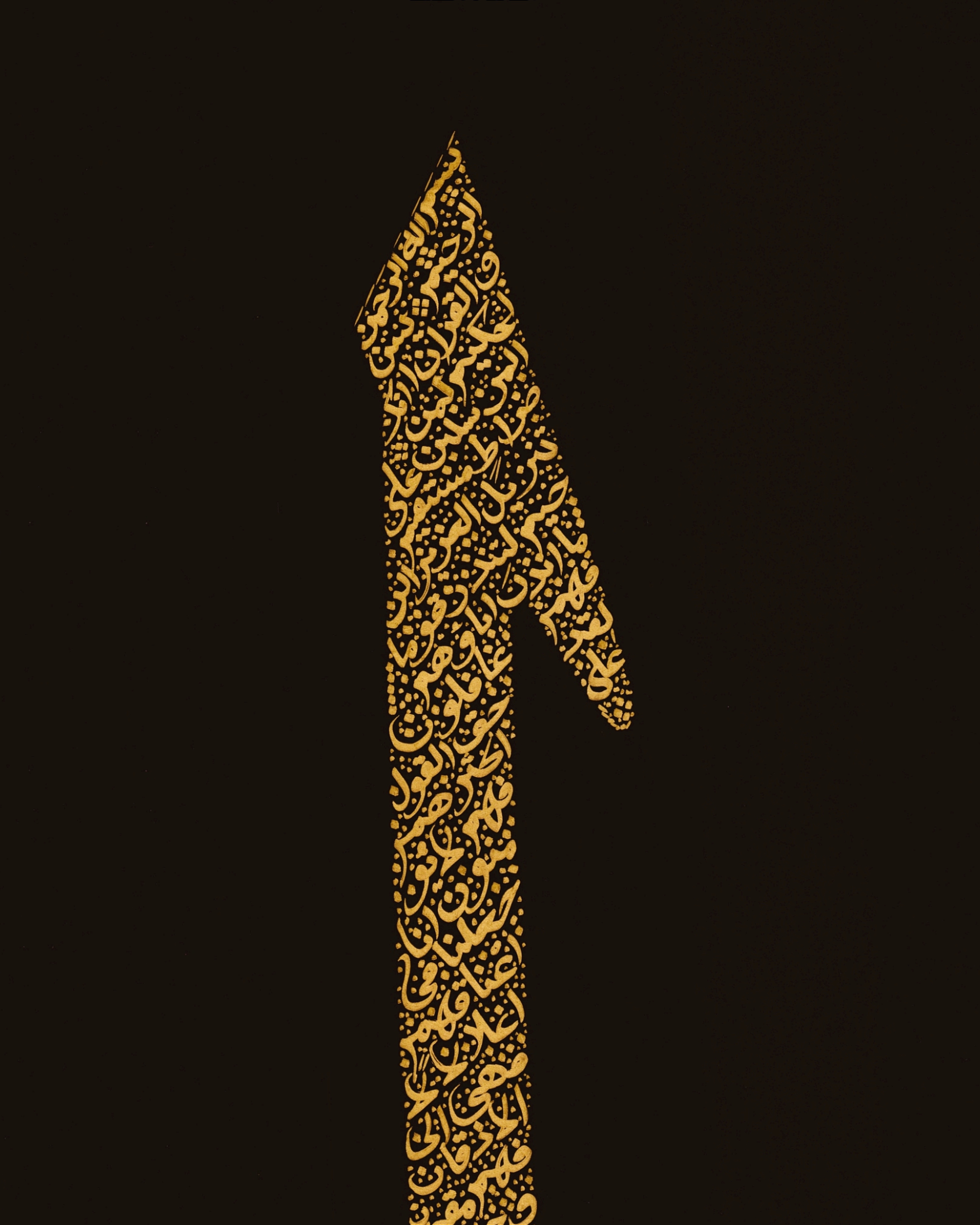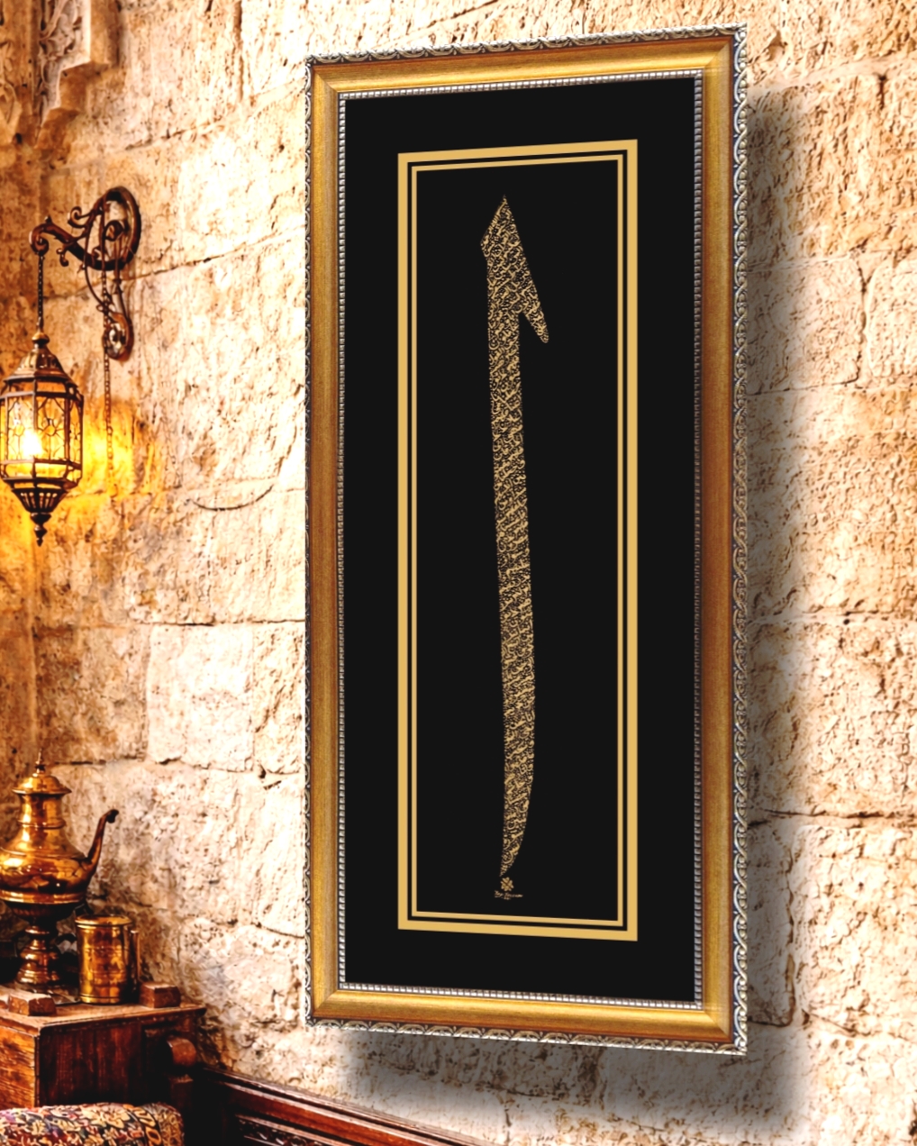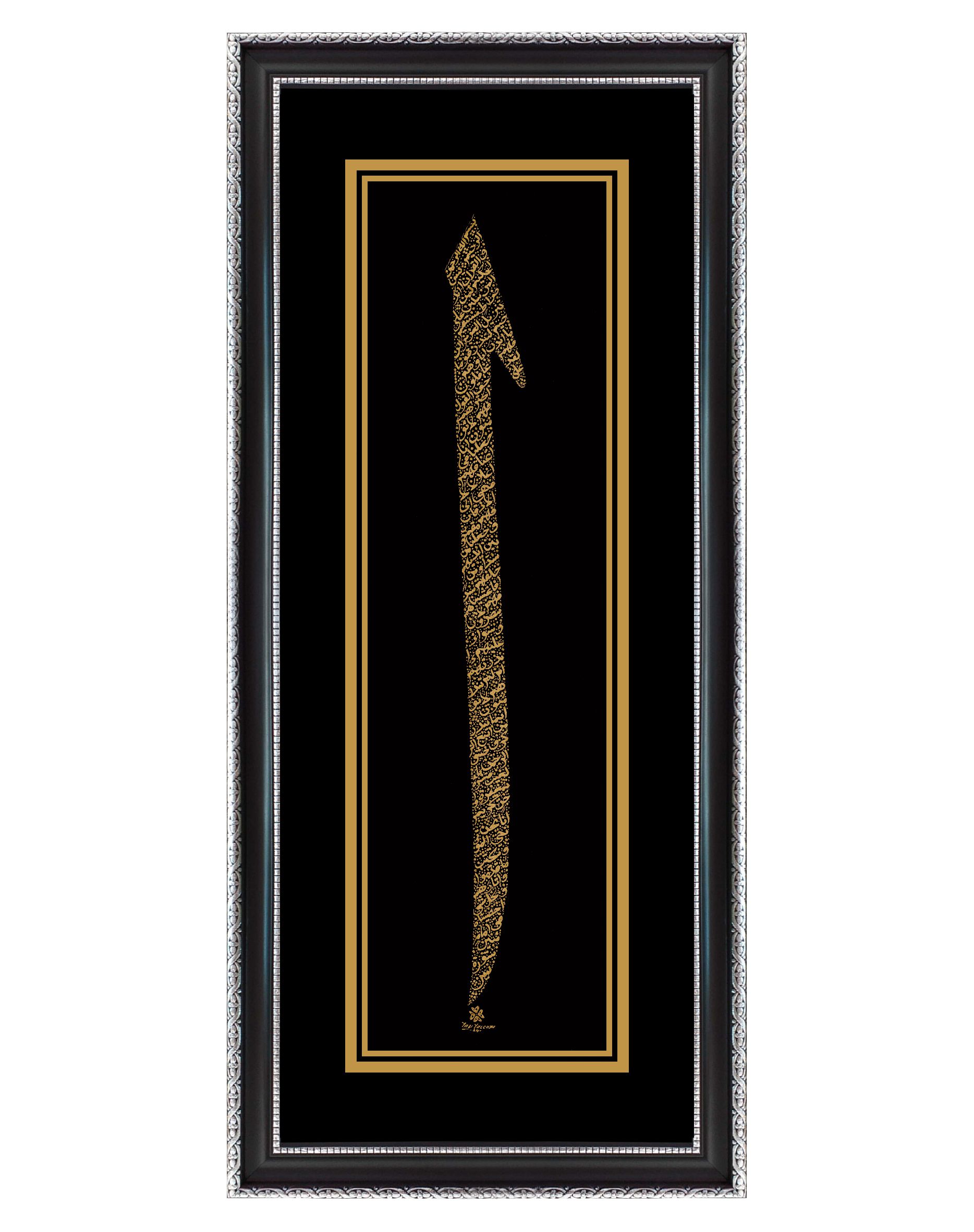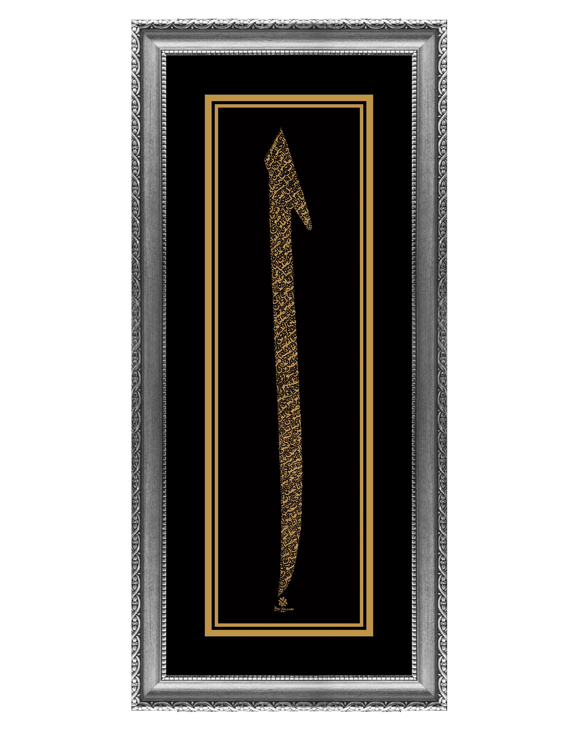 Elif harfi içerisinde Yasin Suresinin ilk sayfası yer alıyor. Siyah zemine altın yaldızla yazıldı.