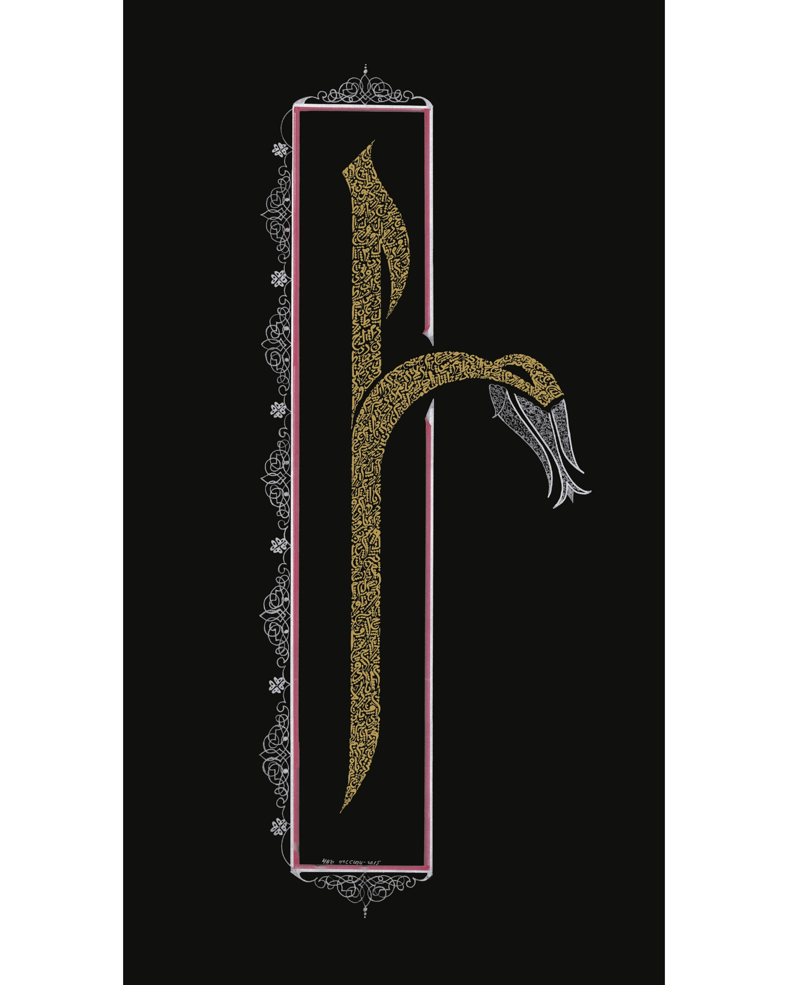 Arapça “Elif Mim” Siyah zemine altın sarısı ve gümüş renkle çalışıldı. Harflerin gövdesi, küçük Arapça harflerle tasarlandı. Mim harfinin baş kısmı, gümüş renkle lale görseliyle ve çalışmanın etrafı da gümüş renk bordürle bezendi.