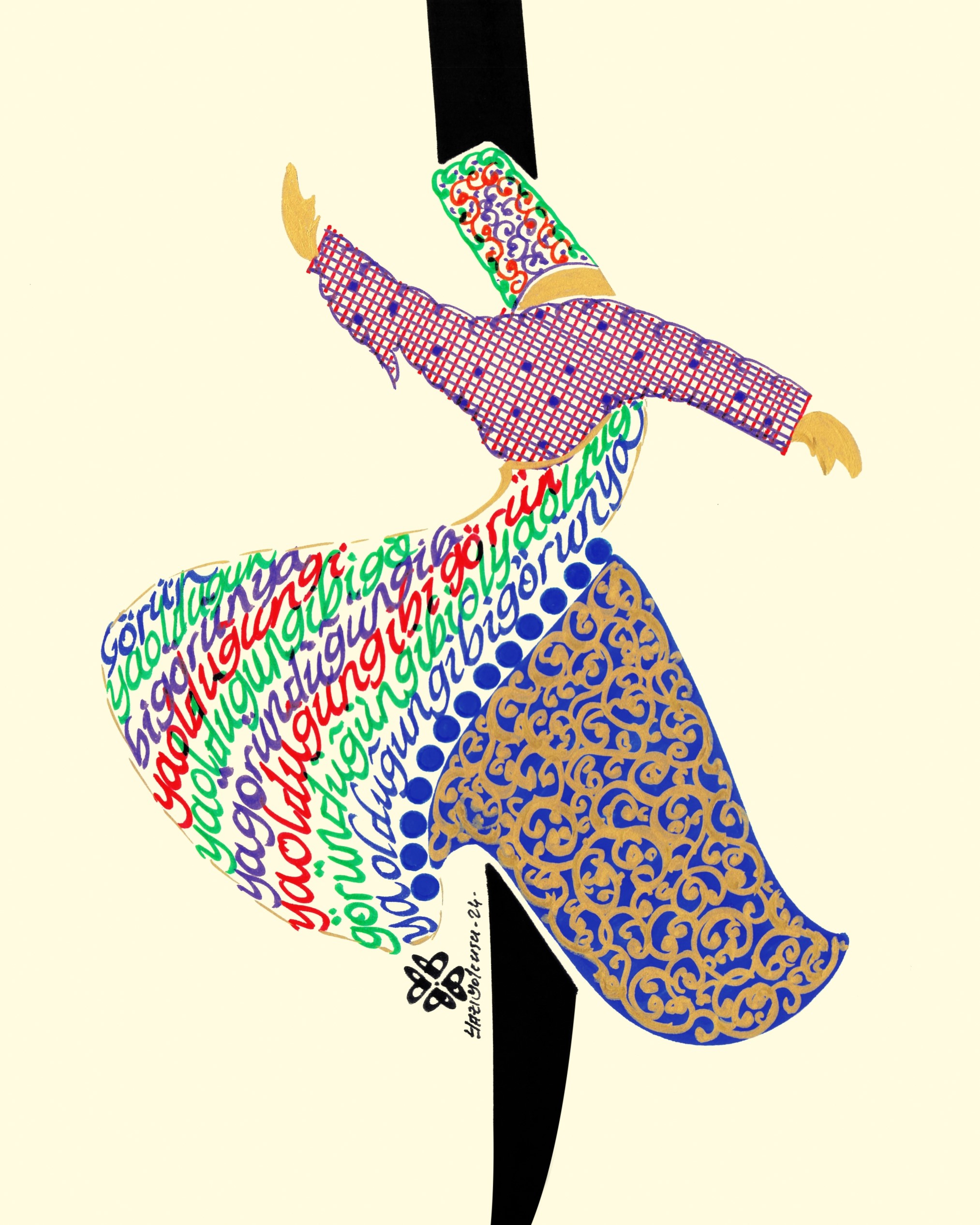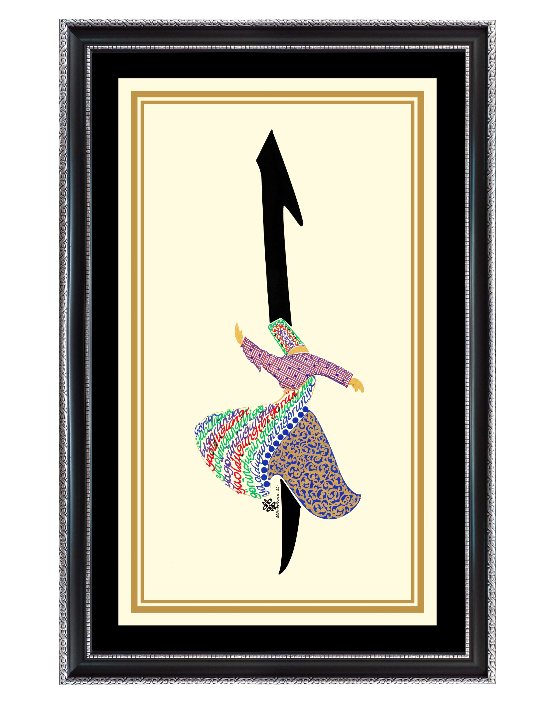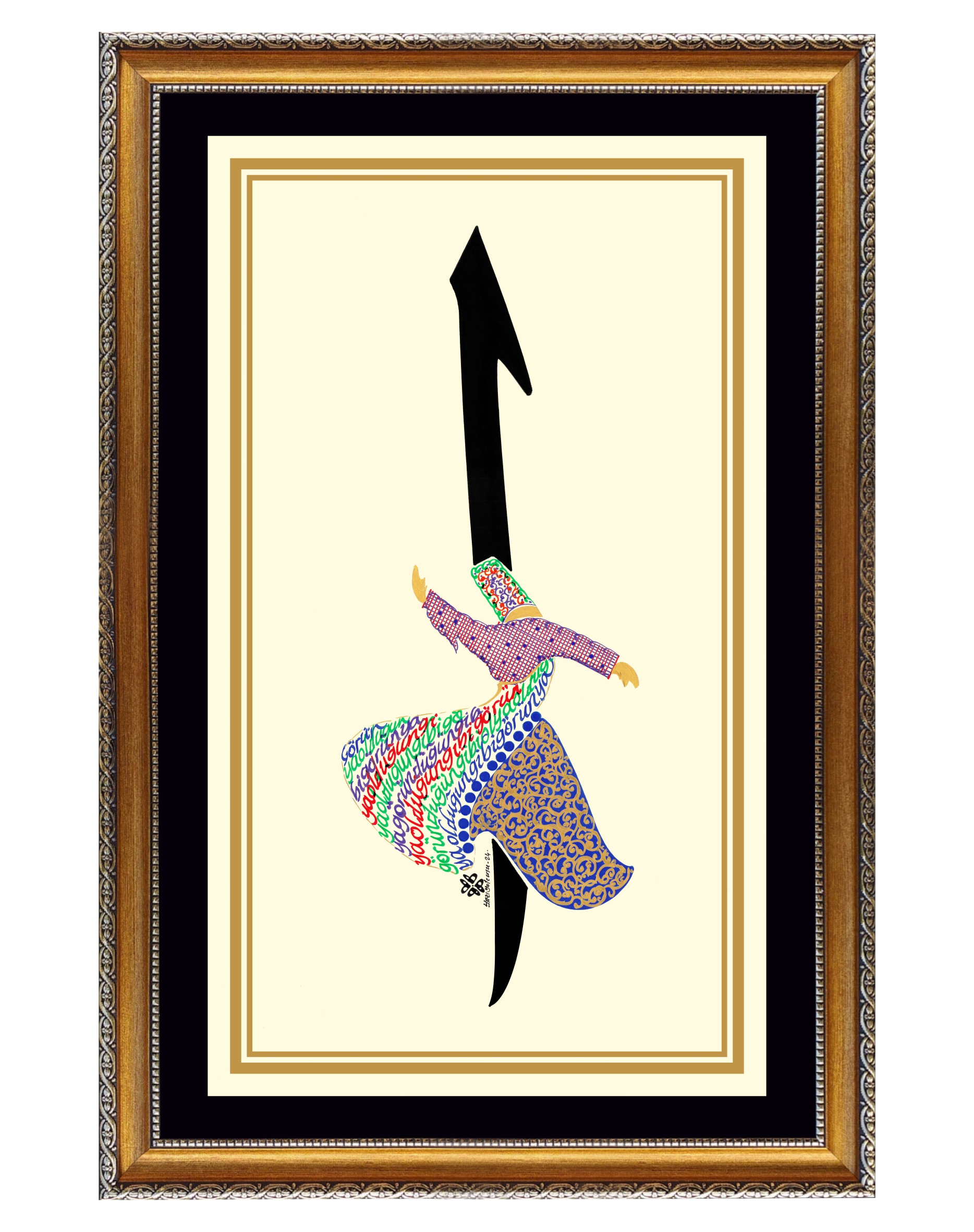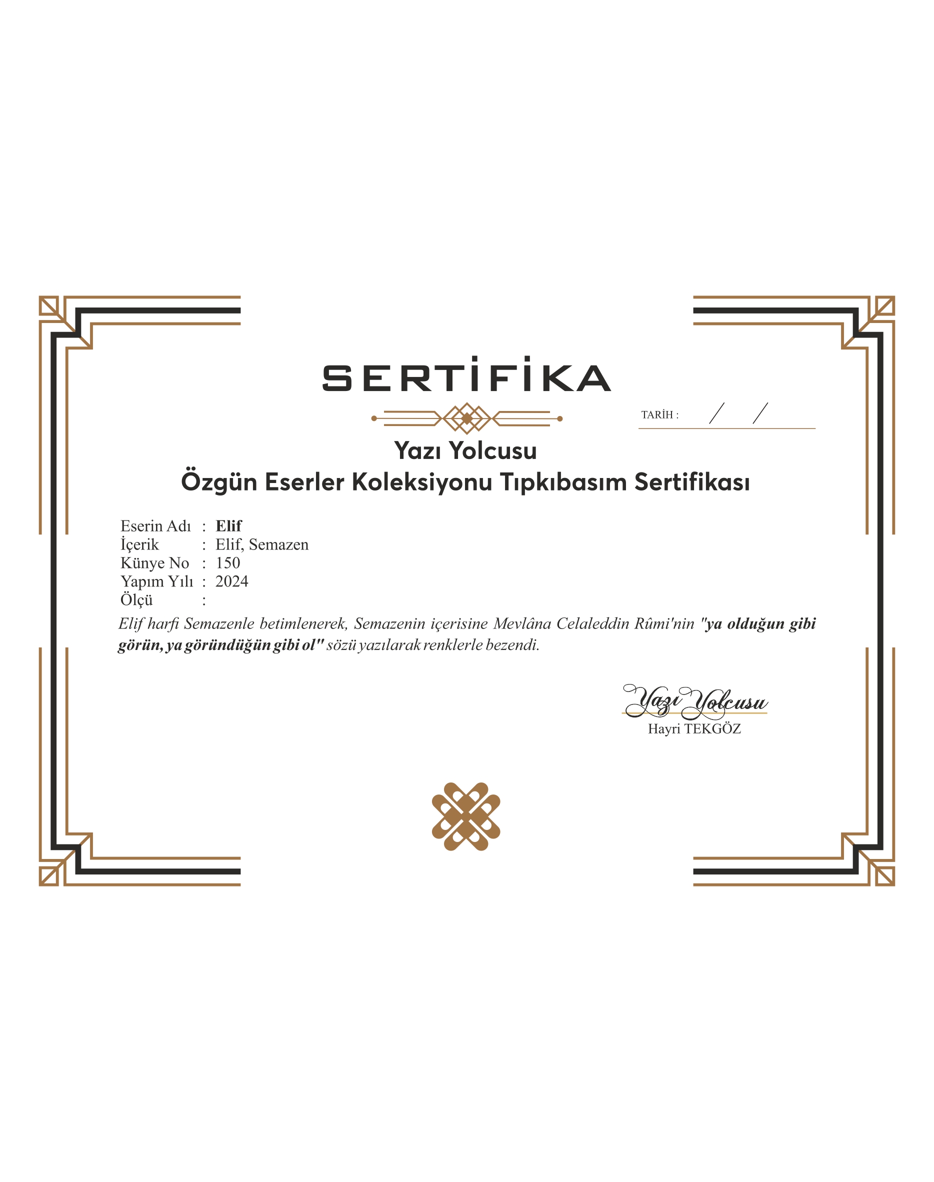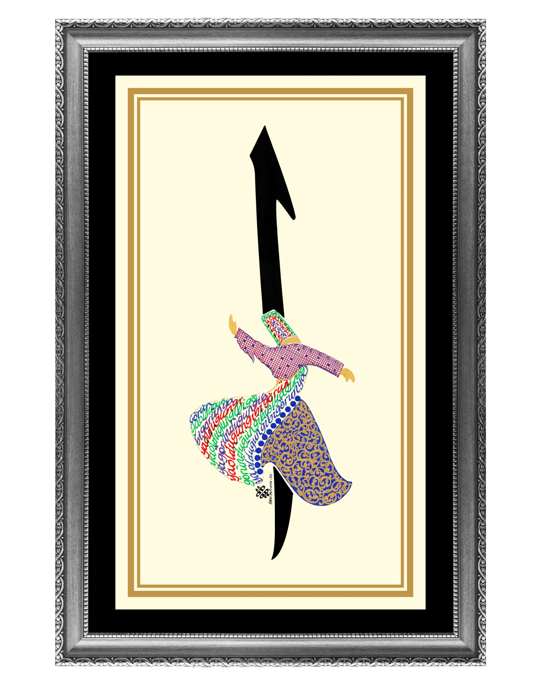 Elif, Semazen. Elif harfi semazenle betimlenerek içerisinde Mevlana Celaleddin Rumi’nin sözü günümüz Türkçesiyle “Ya olduğun gibi görün, ya göründüğün gibi ol” yazmaktadır.
