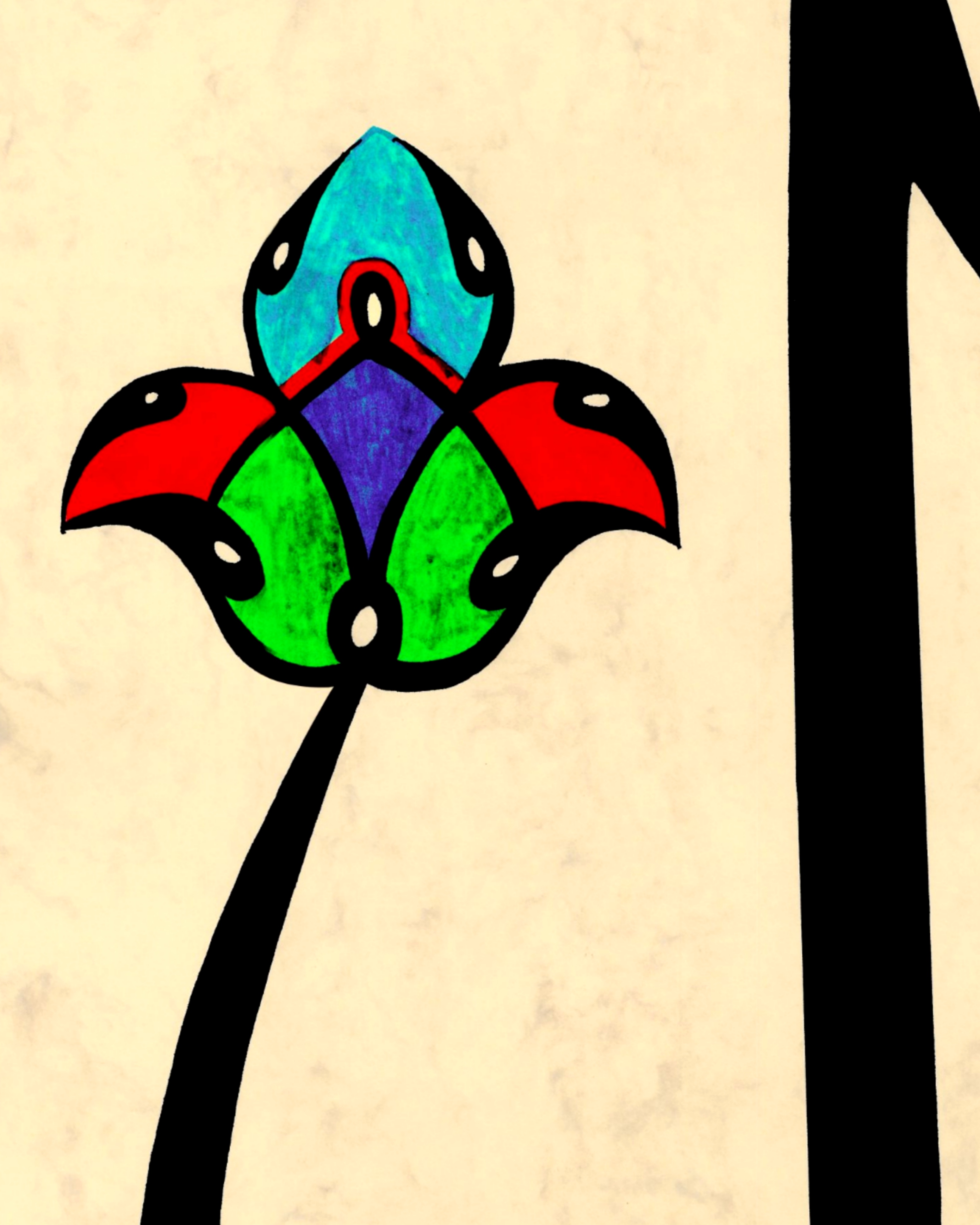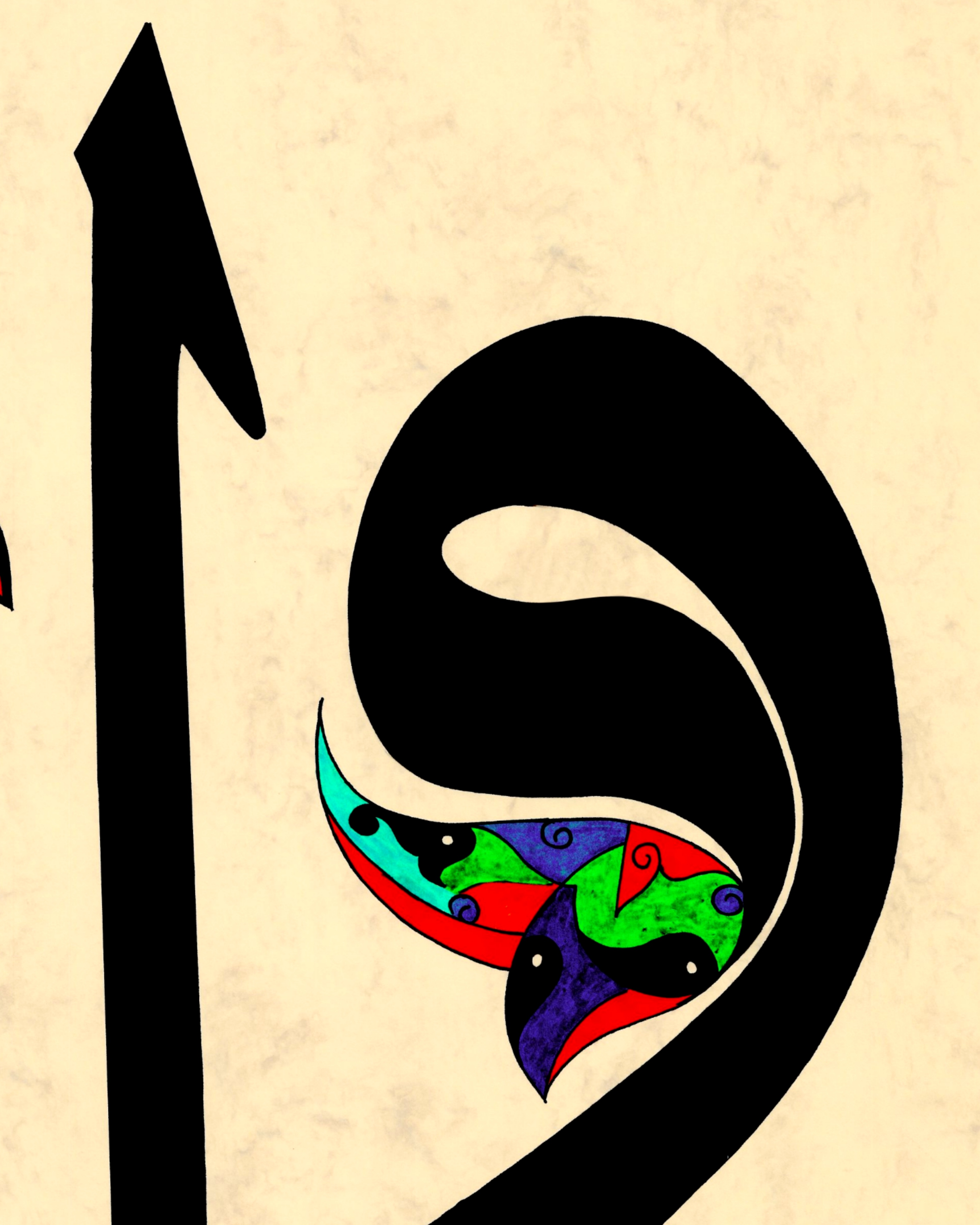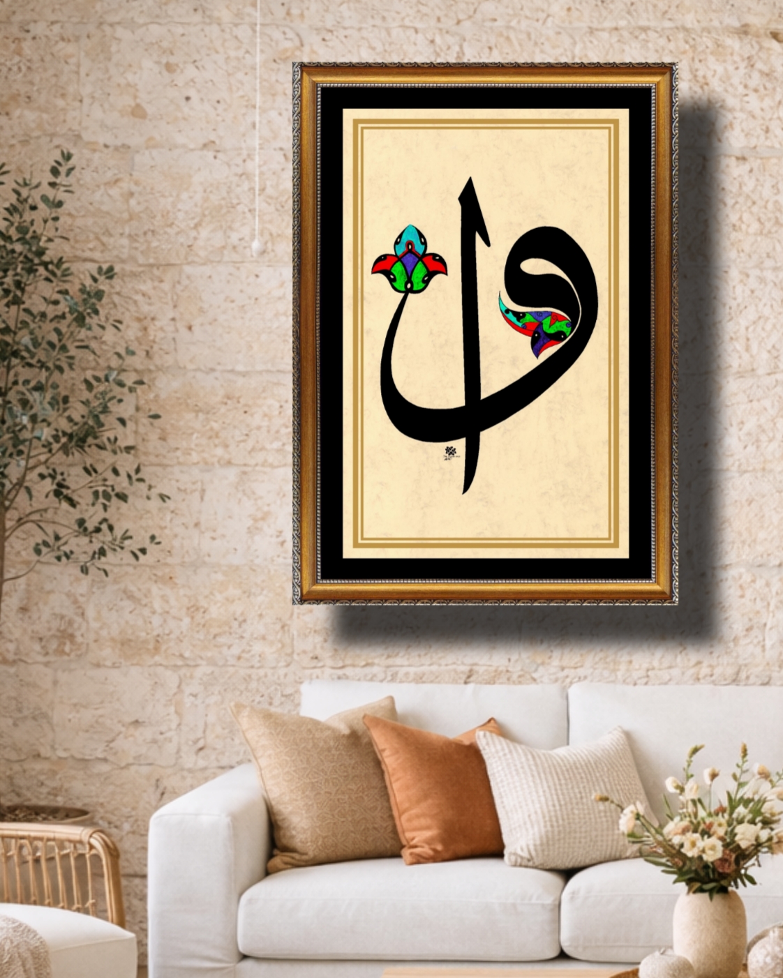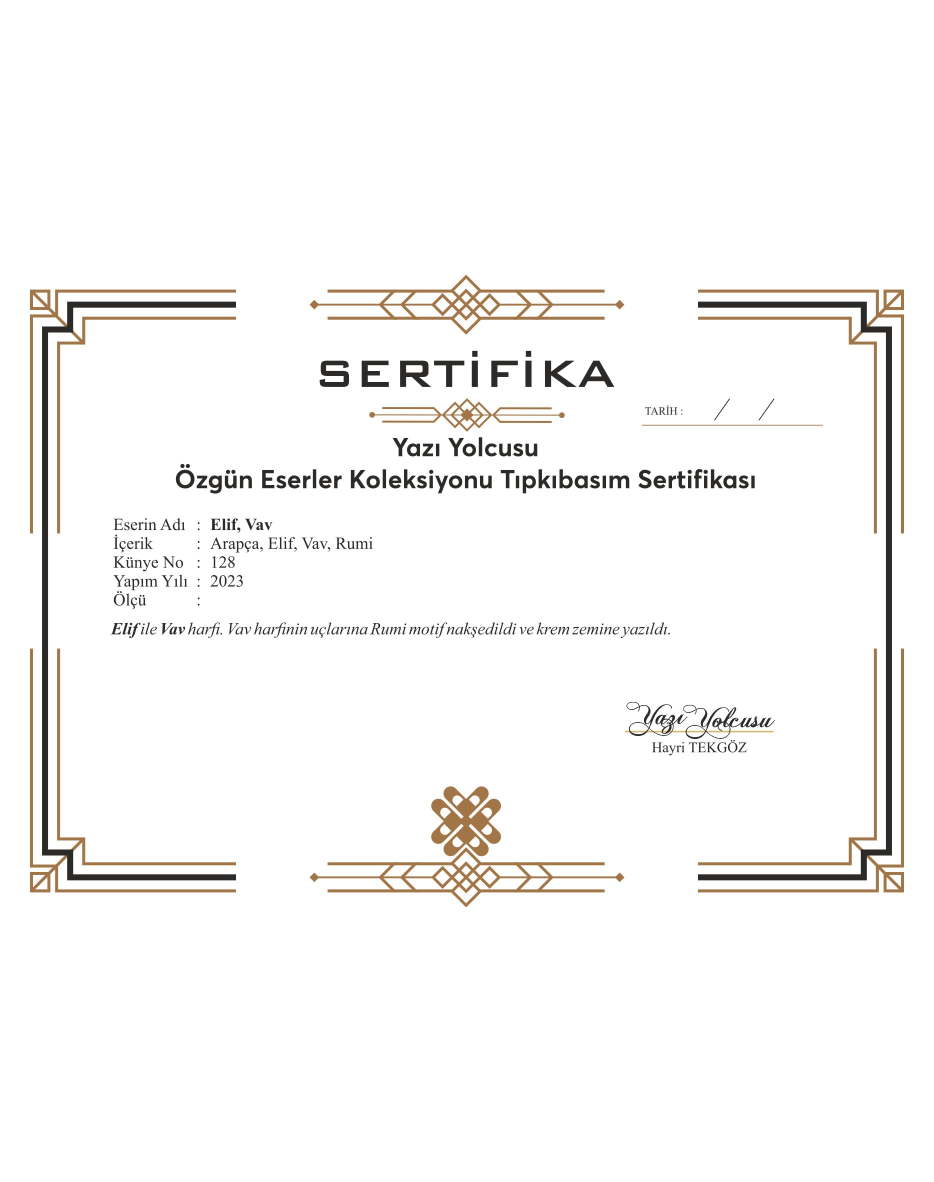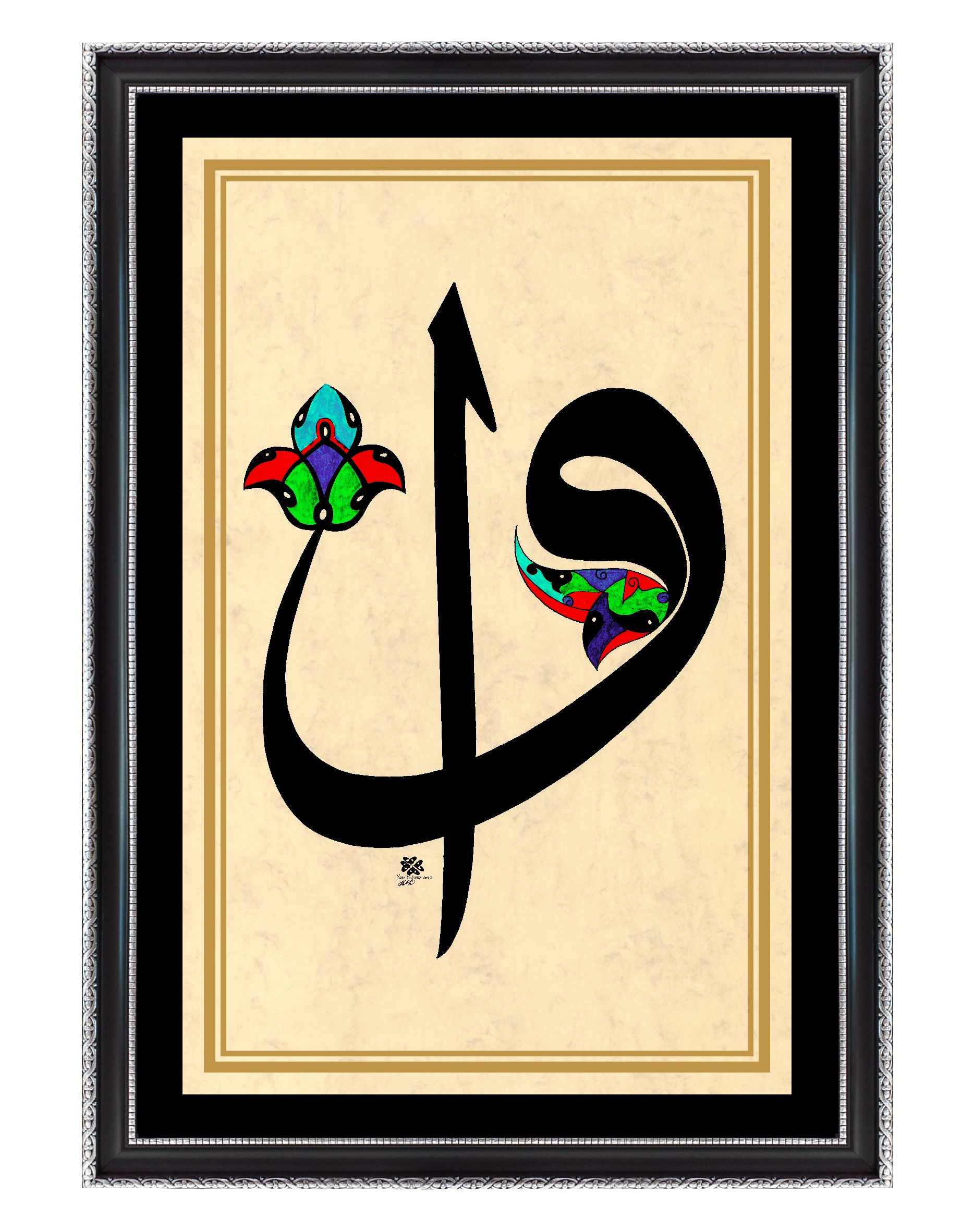 Elif ve Vav harfi. Vav harfinin uçlarına rumi motif nakşedildi ve krem zemine yazıldı.