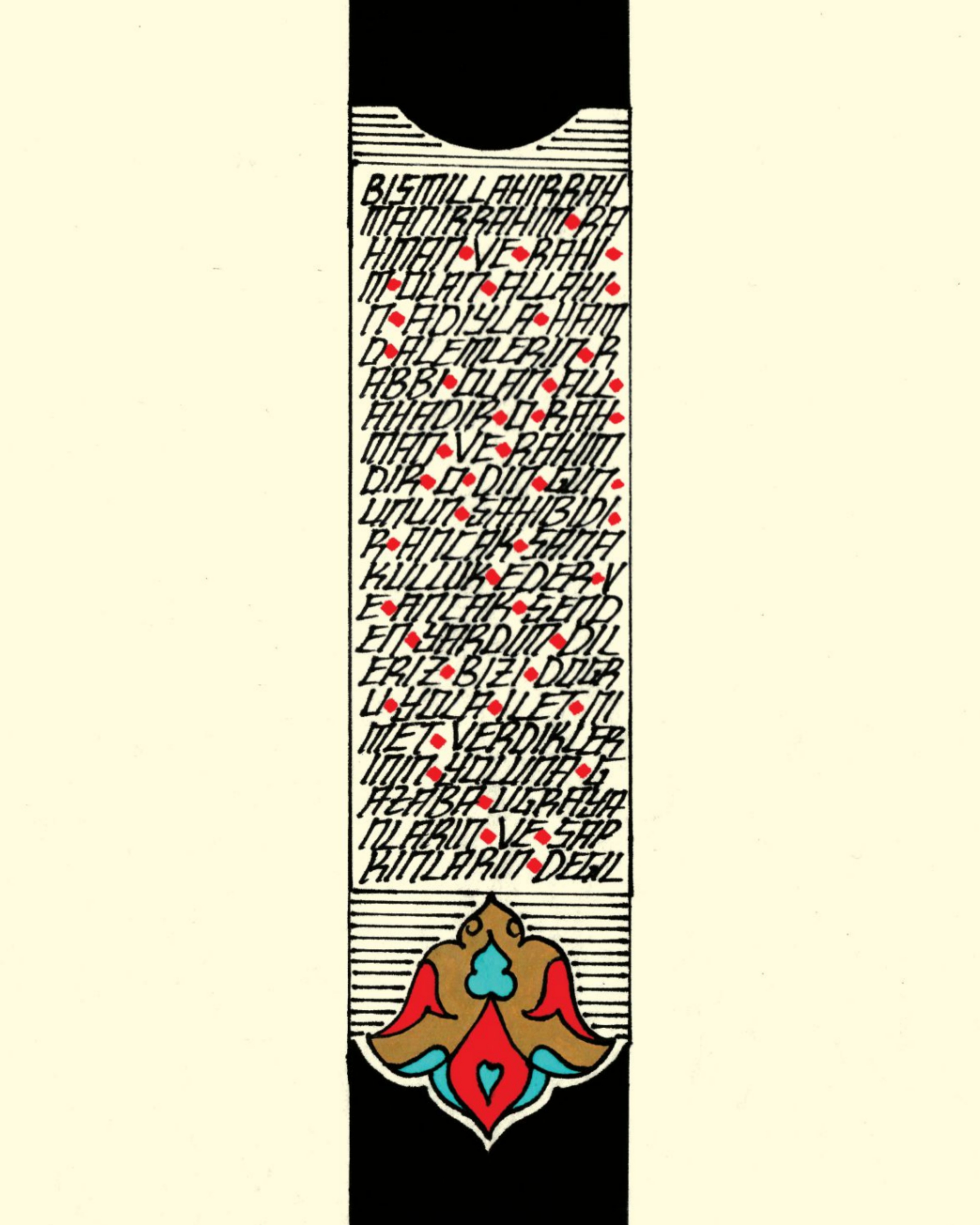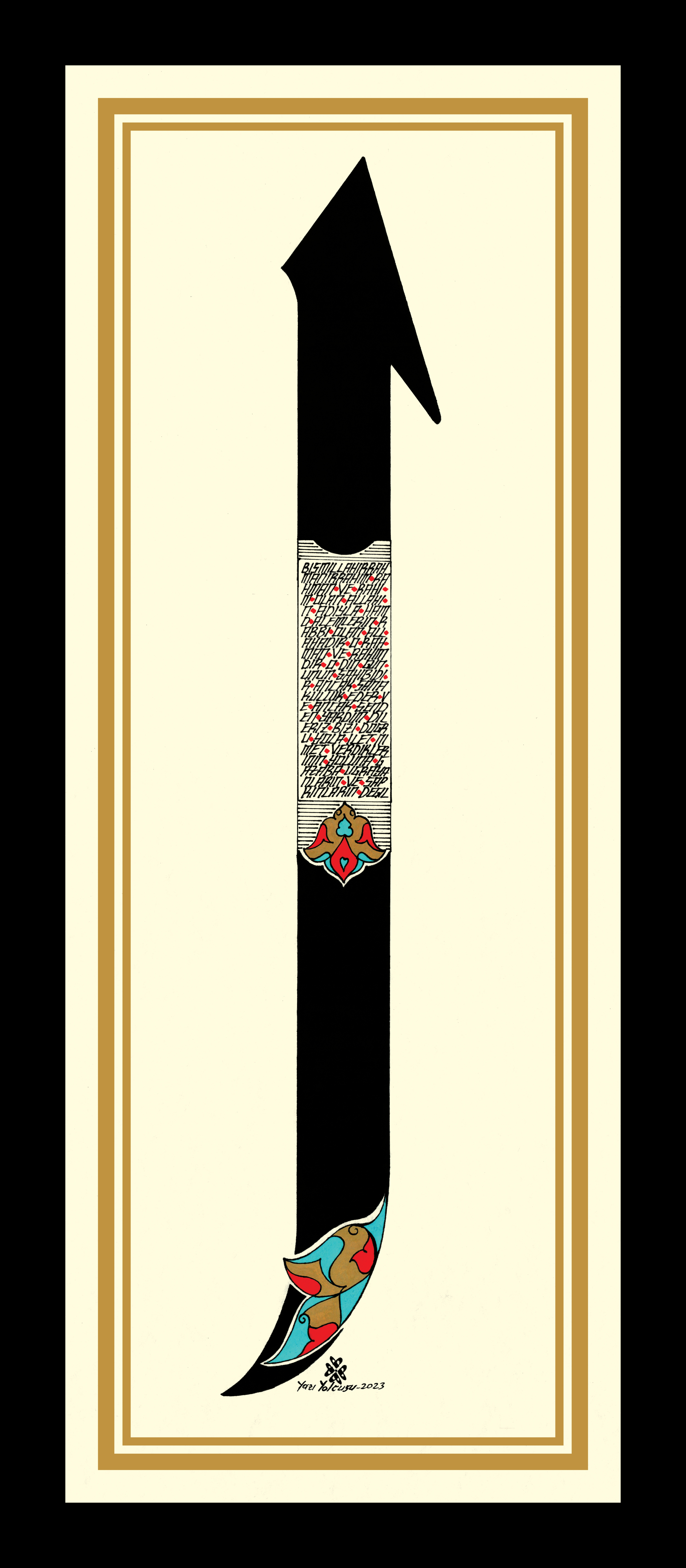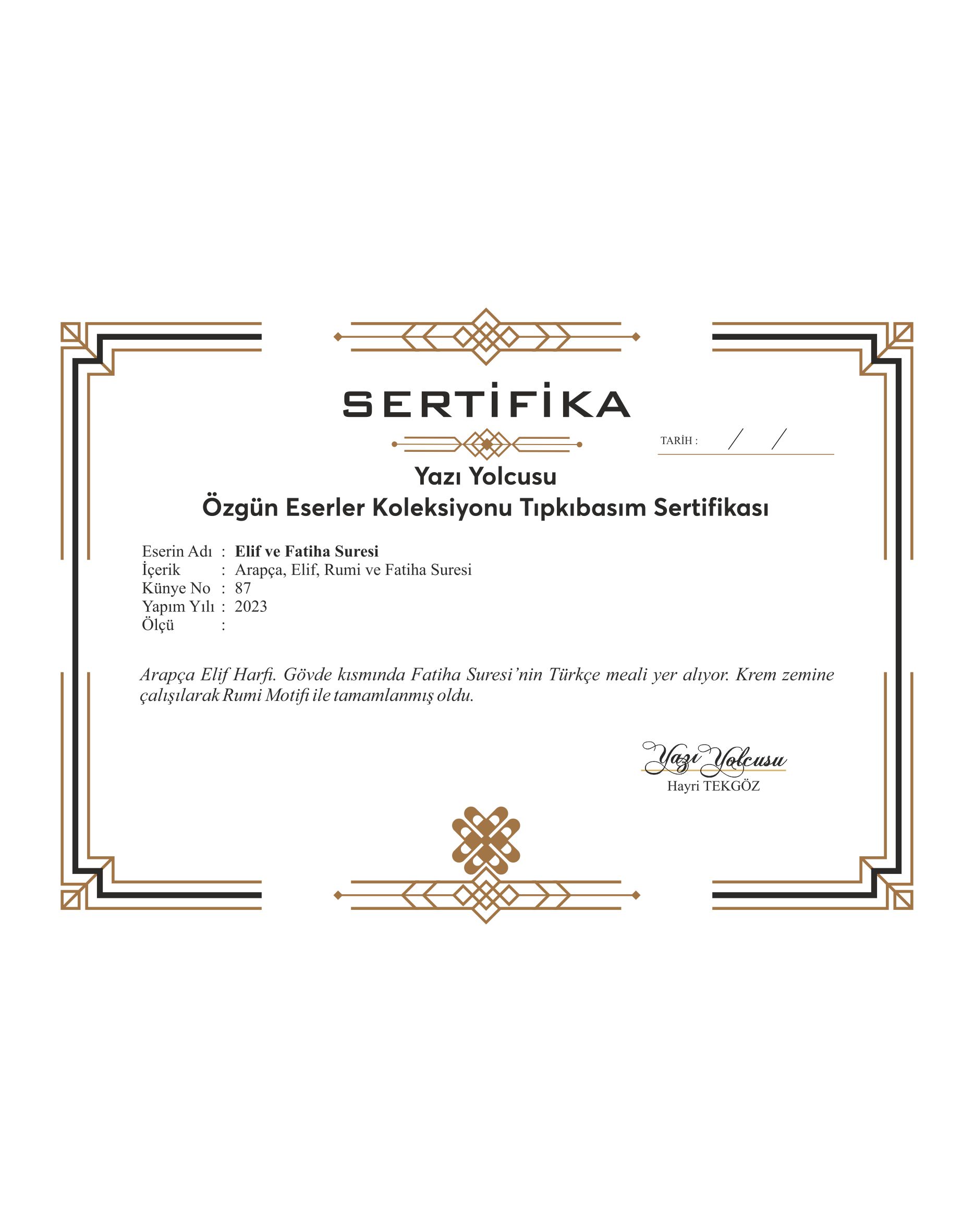 Arapça Elif harfi. Gövde kısmında Fatiha Suresi’nin Türkçe meali yer alıyor. Krem zemine çalışılarak Rumi motifi ile tamamlanmış oldu.