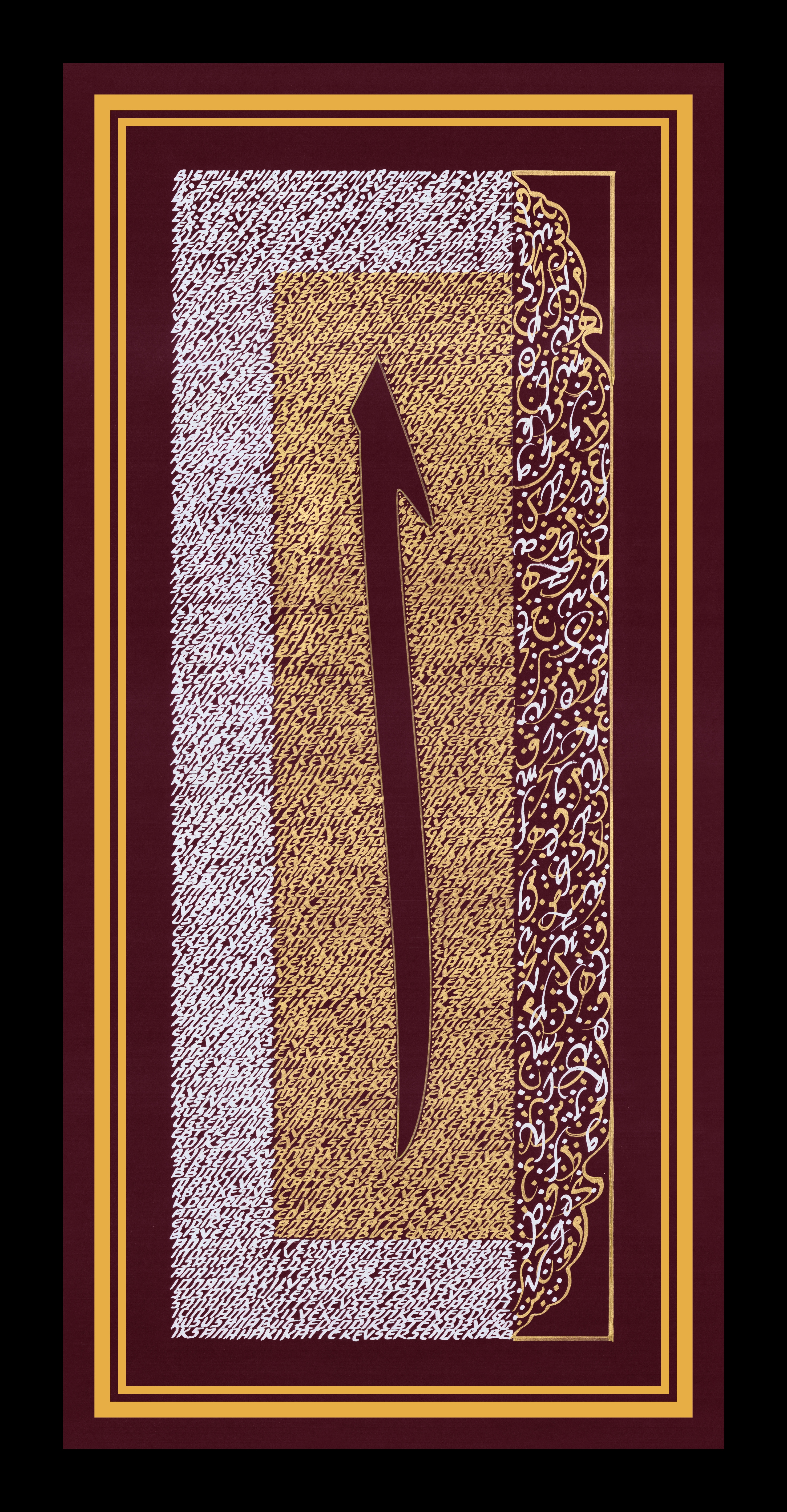 "Elif Harfi ve Harfler.” Elif harfi doğruluk timsali tasarlanarak altın sarısı ve gümüş renk harflerle bütünleştirildi. Elif harfinin etrafındaki küçük yazılar, Elmalılı Hamdi Yazır'ın Kevser Suresinin Özgün Türkçe Meali’nden oluşuyor. Harfin sağında yer alan iç içe geçmeli sarı harfler Arapça harflerden oluşurken, gümüş renkli harfler de ters açıdan Latin harflerinden oluşturuldu. Eser bordo zemine çalışıldı. Surenin özgün meali; "Biz verdik sana hakikatte kevser. Rabbın için namaz kıl ve kurban kesiver. Doğrusu sana buğz edendir ebter."