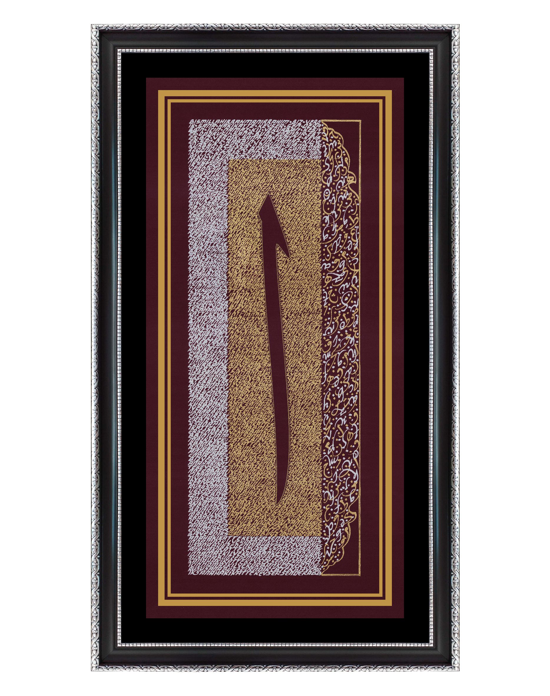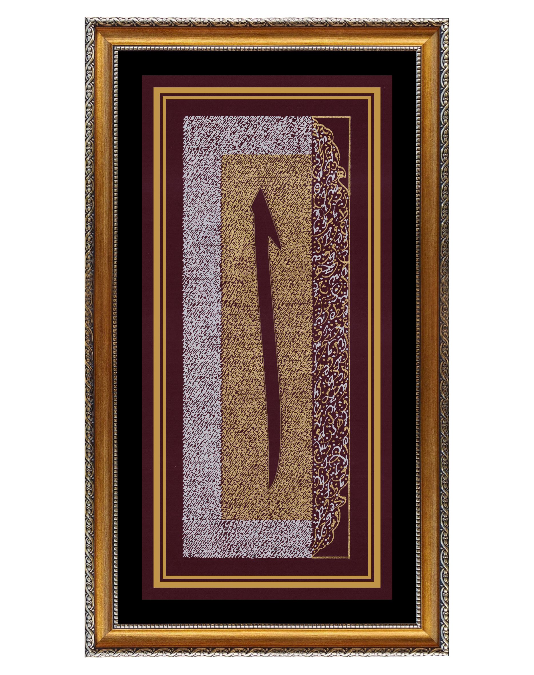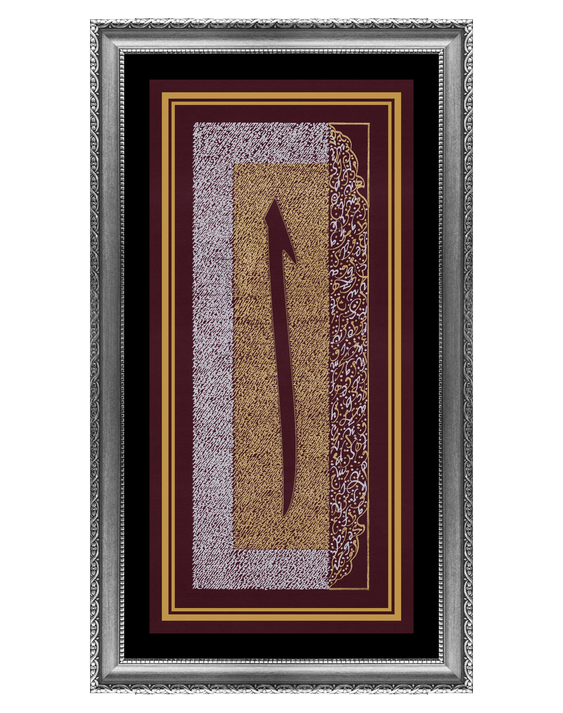 "Elif Harfi ve Harfler.” Elif harfi doğruluk timsali tasarlanarak altın sarısı ve gümüş renk harflerle bütünleştirildi. Elif harfinin etrafındaki küçük yazılar, Elmalılı Hamdi Yazır'ın Kevser Suresinin Özgün Türkçe Meali’nden oluşuyor. Harfin sağında yer alan iç içe geçmeli sarı harfler Arapça harflerden oluşurken, gümüş renkli harfler de ters açıdan Latin harflerinden oluşturuldu. Eser bordo zemine çalışıldı. Surenin özgün meali; "Biz verdik sana hakikatte kevser. Rabbın için namaz kıl ve kurban kesiver. Doğrusu sana buğz edendir ebter."