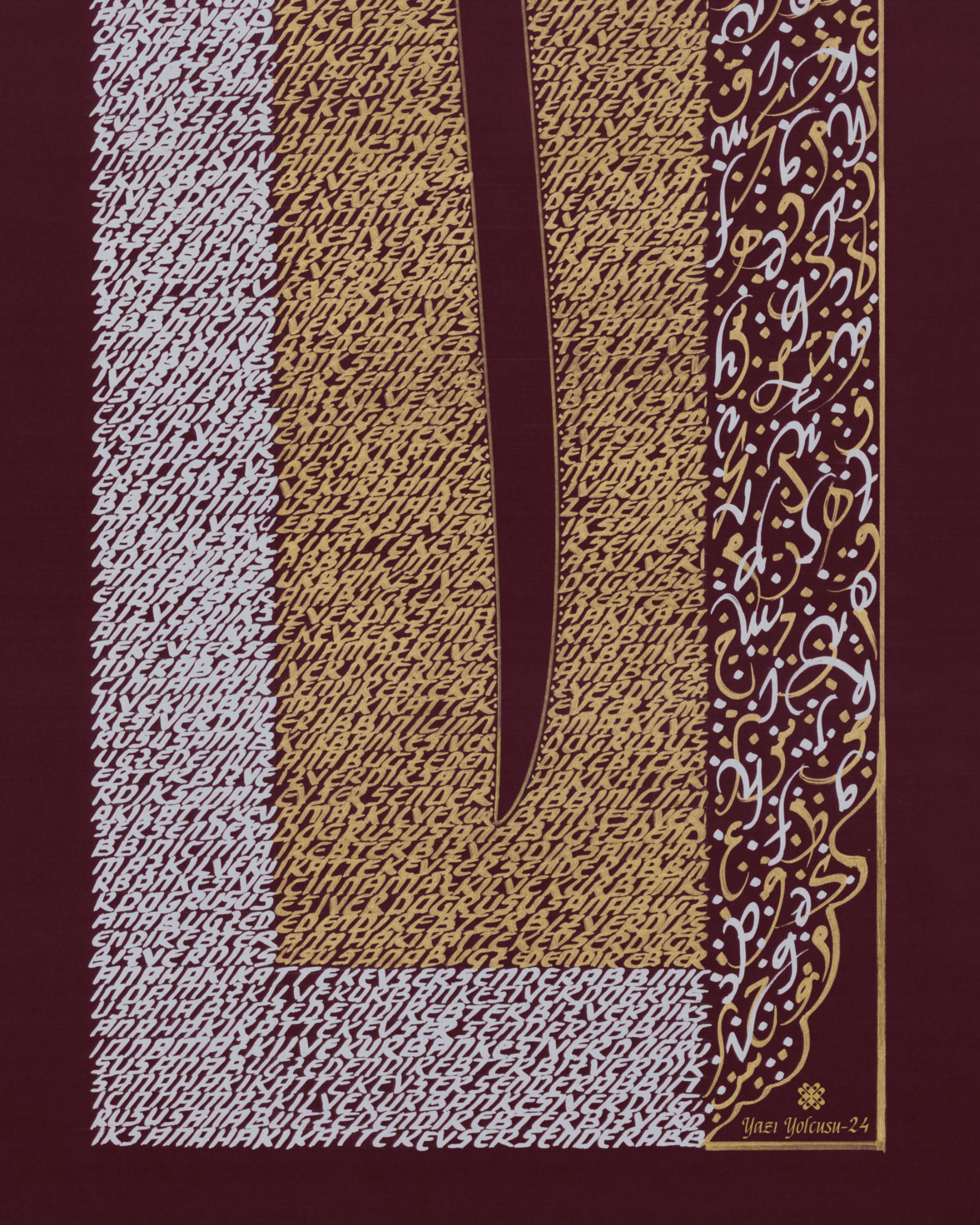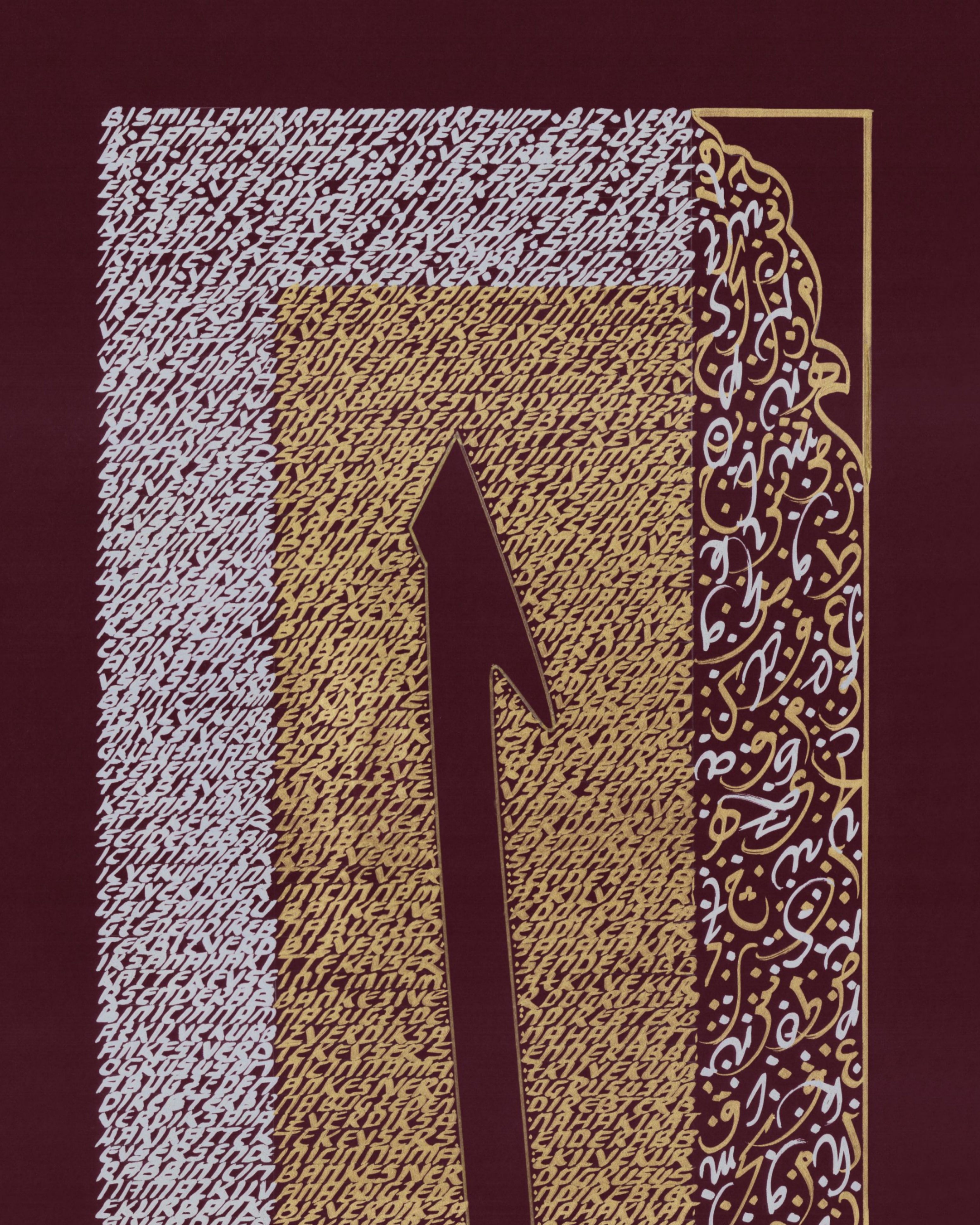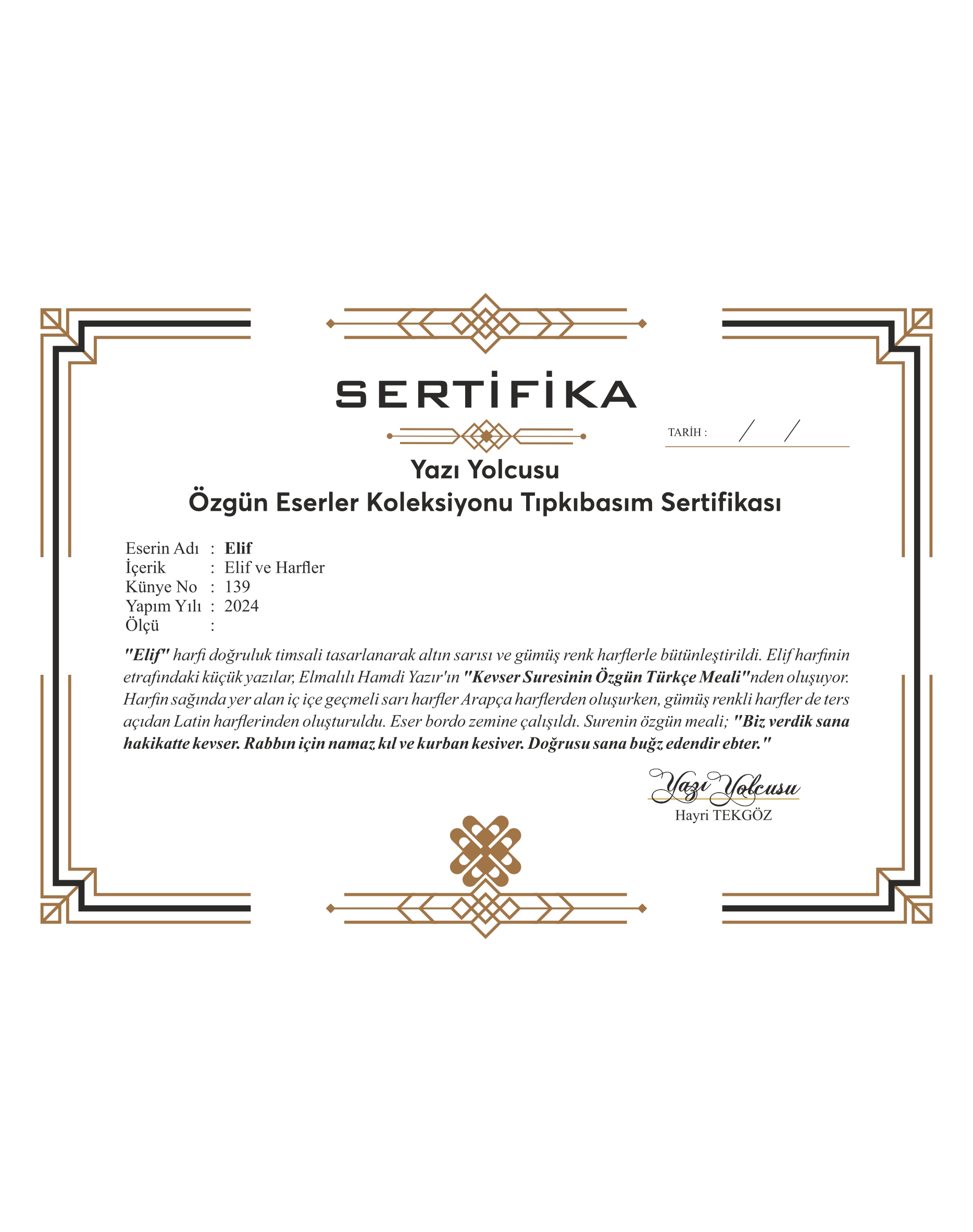 "Elif Harfi ve Harfler.” Elif harfi doğruluk timsali tasarlanarak altın sarısı ve gümüş renk harflerle bütünleştirildi. Elif harfinin etrafındaki küçük yazılar, Elmalılı Hamdi Yazır'ın Kevser Suresinin Özgün Türkçe Meali’nden oluşuyor. Harfin sağında yer alan iç içe geçmeli sarı harfler Arapça harflerden oluşurken, gümüş renkli harfler de ters açıdan Latin harflerinden oluşturuldu. Eser bordo zemine çalışıldı. Surenin özgün meali; "Biz verdik sana hakikatte kevser. Rabbın için namaz kıl ve kurban kesiver. Doğrusu sana buğz edendir ebter."