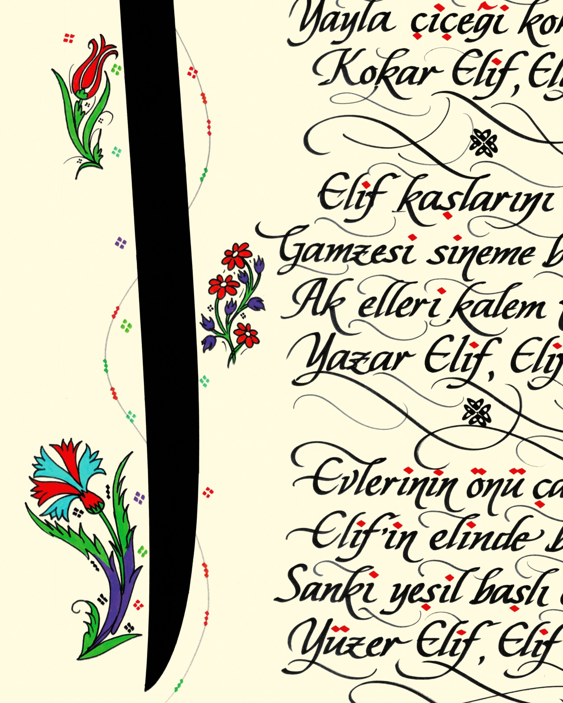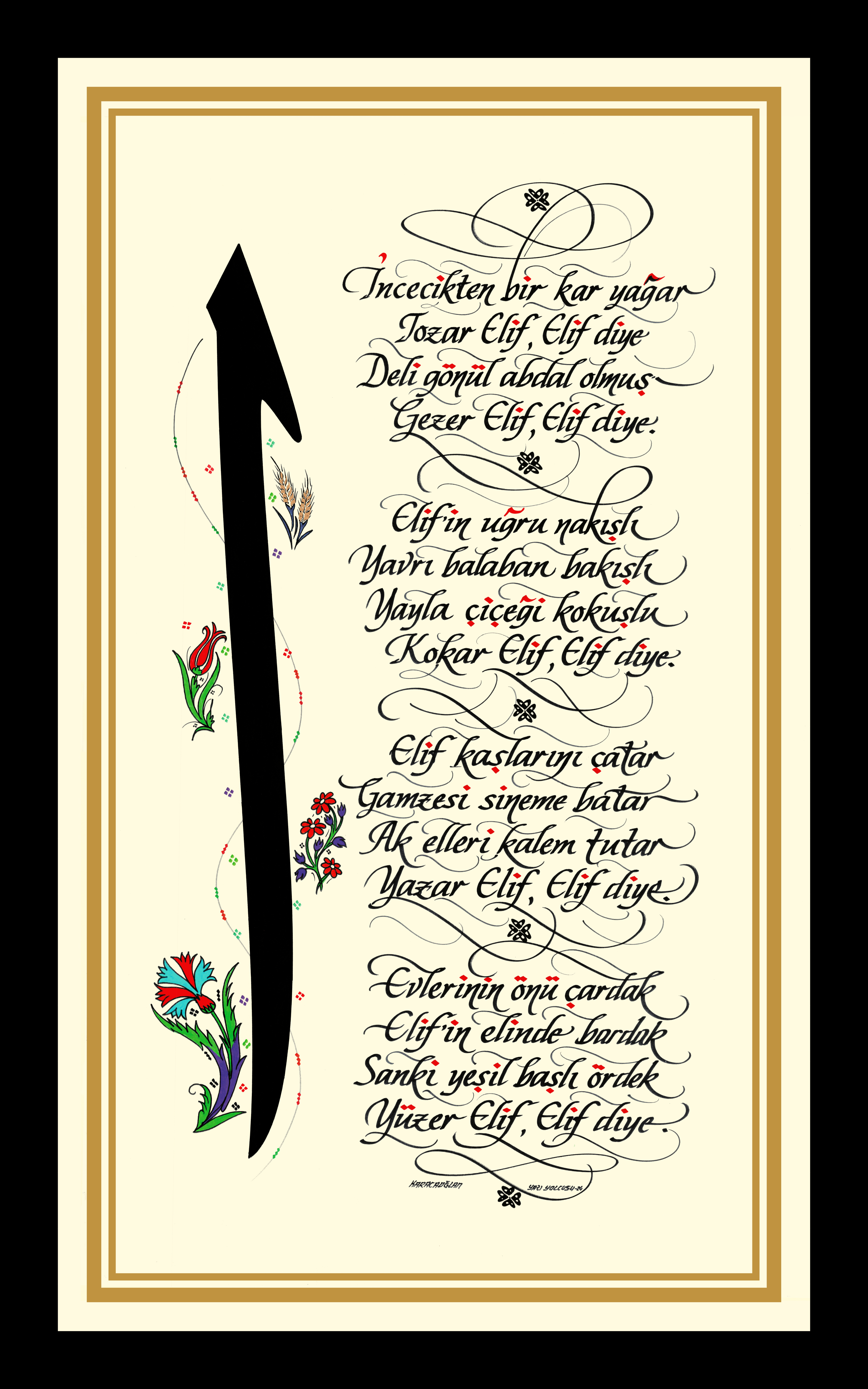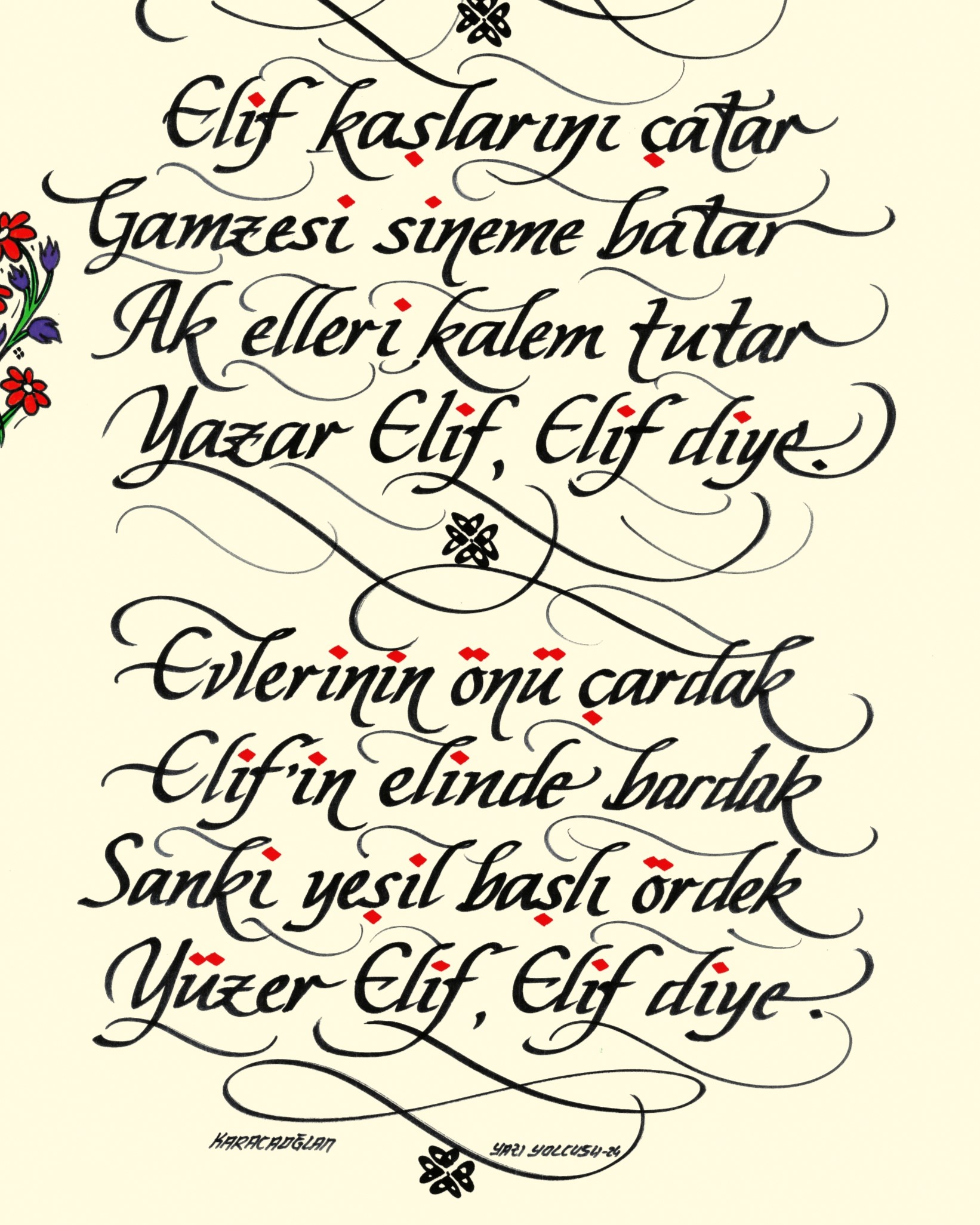 “Elif ve Karacaoğlan’ın Şiiri”. Karacaoğlan’ın Elif şiiri Arapça Elif harfiyle betimlenerek karanfil, papatya, lale ve başak motifleriyle bezendi. Şiir;