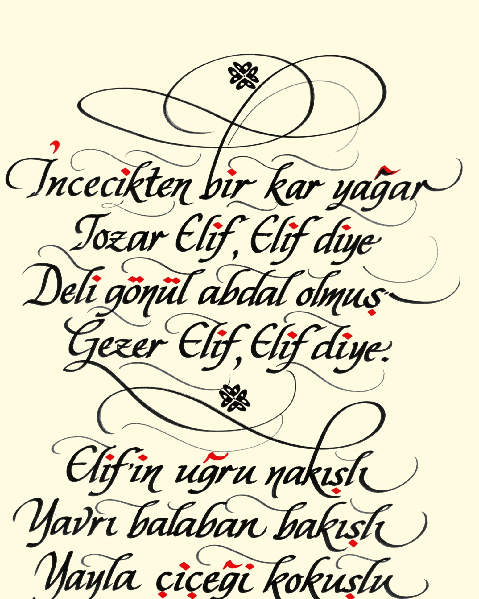 “İncecikten bir kar yağar, Tozar Elif Elif diye, Deli gönül abdal olmuş, Gezer Elif Elif diye. Elif’in uğru nakışlı, Yavrı balaban bakışlı, Yayla çiçeği kokuşlu, Kokar Elif Elif diye. Elif kaşlarını çatar, Gamzesi sineme batar, Ak elleri kalem tutar, Yazar Elif Elif diye. Evlerinin önü çardak, Elif'in elinde bardak, Sanki yeşil başlı ördek, Yüzer Elif Elif diye”.