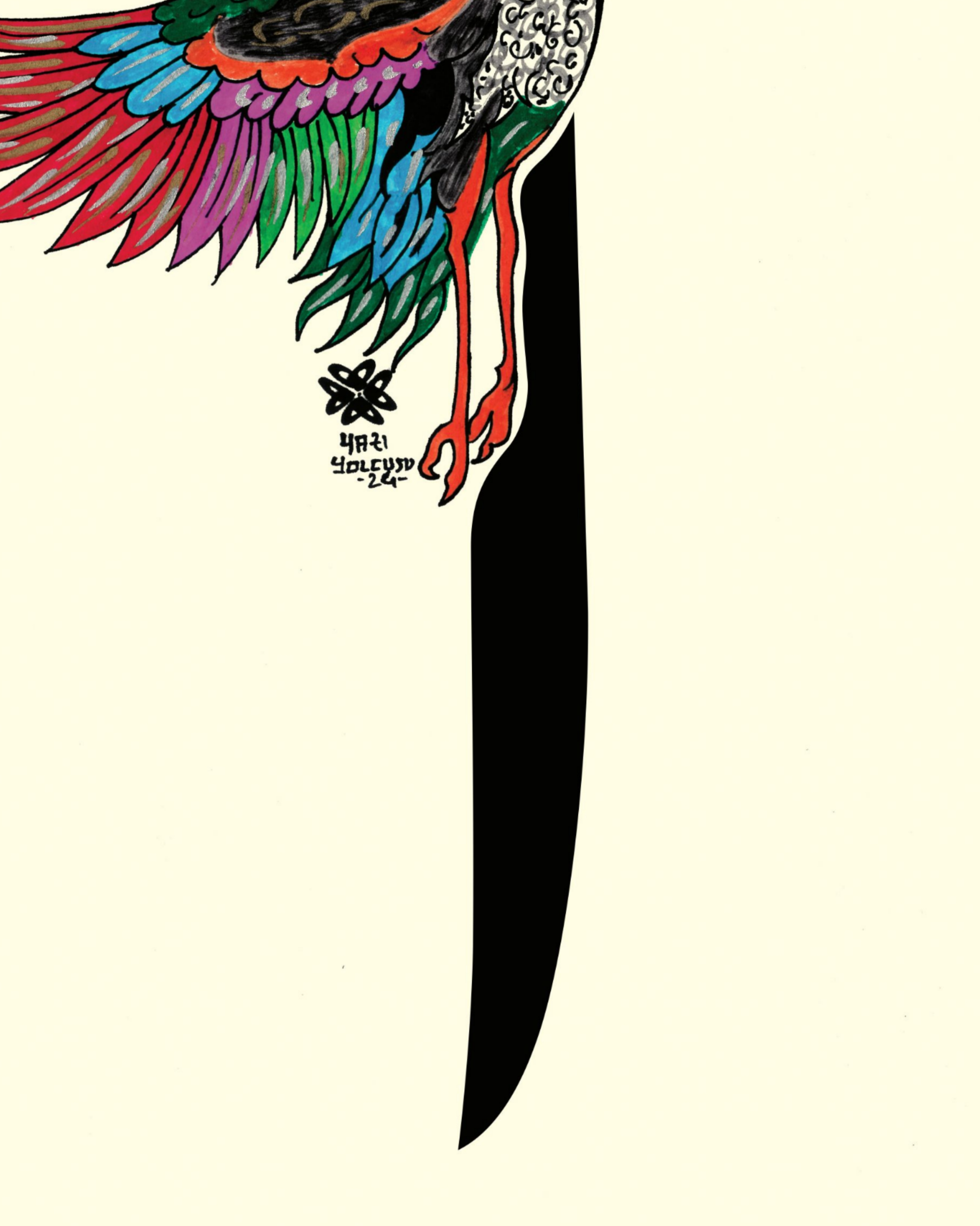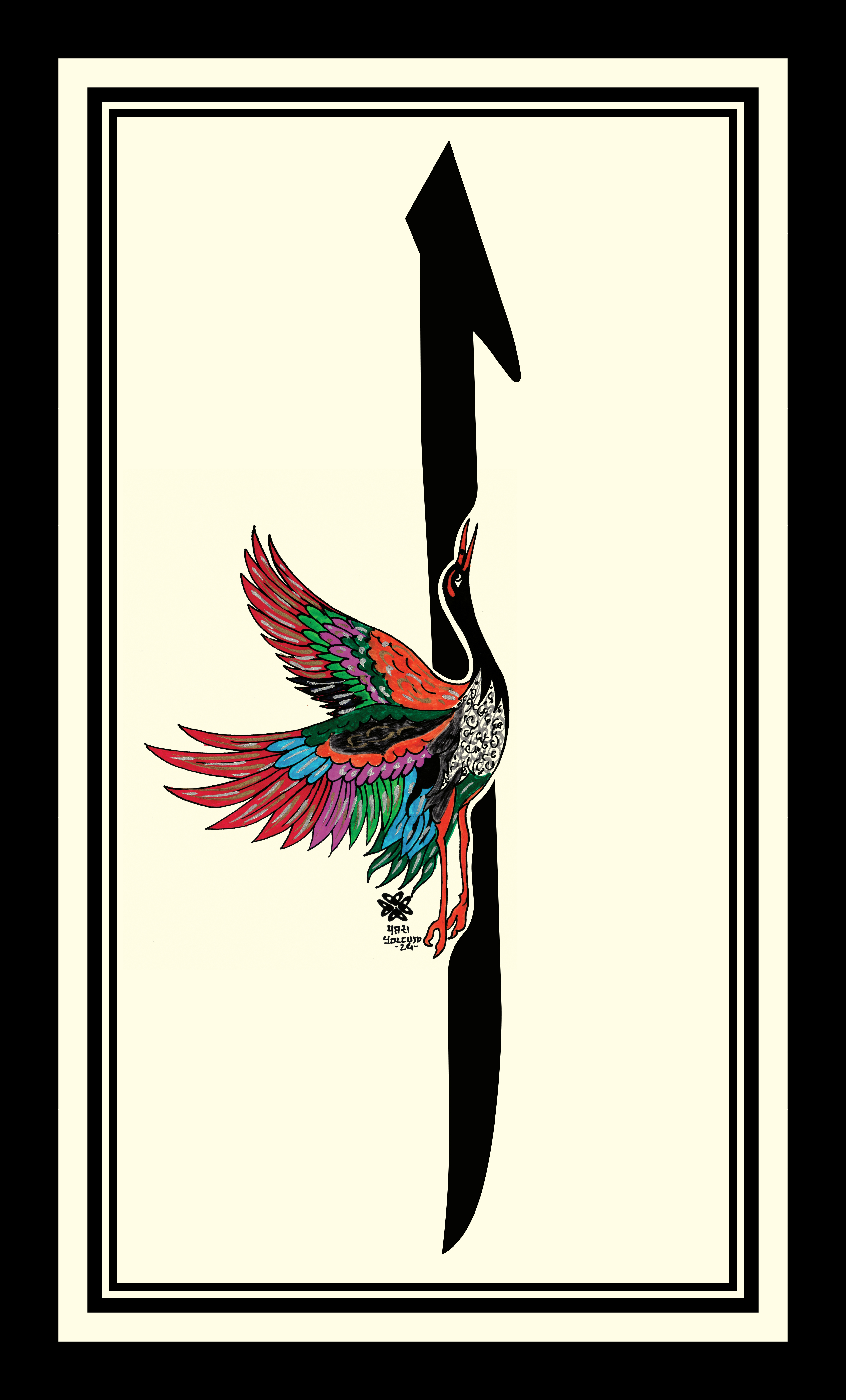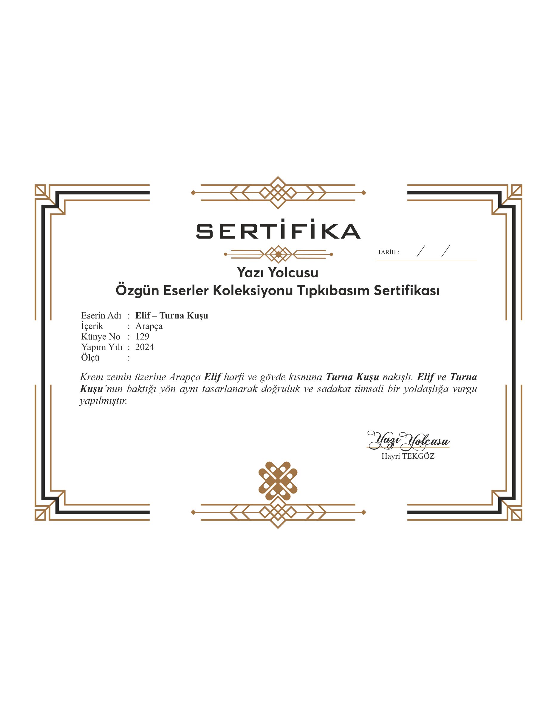 Elif ve Turna kuşu. Elif harfinin gövde kısmına Turna Kuşu nakışlı. Elif ve Turna kuşunun baktığı yön aynı tasarlanarak doğruluk ve sadakat timsali bir yoldaşlığa vurgu yapılmıştır. Krem zemin üzerine çalışıldı.