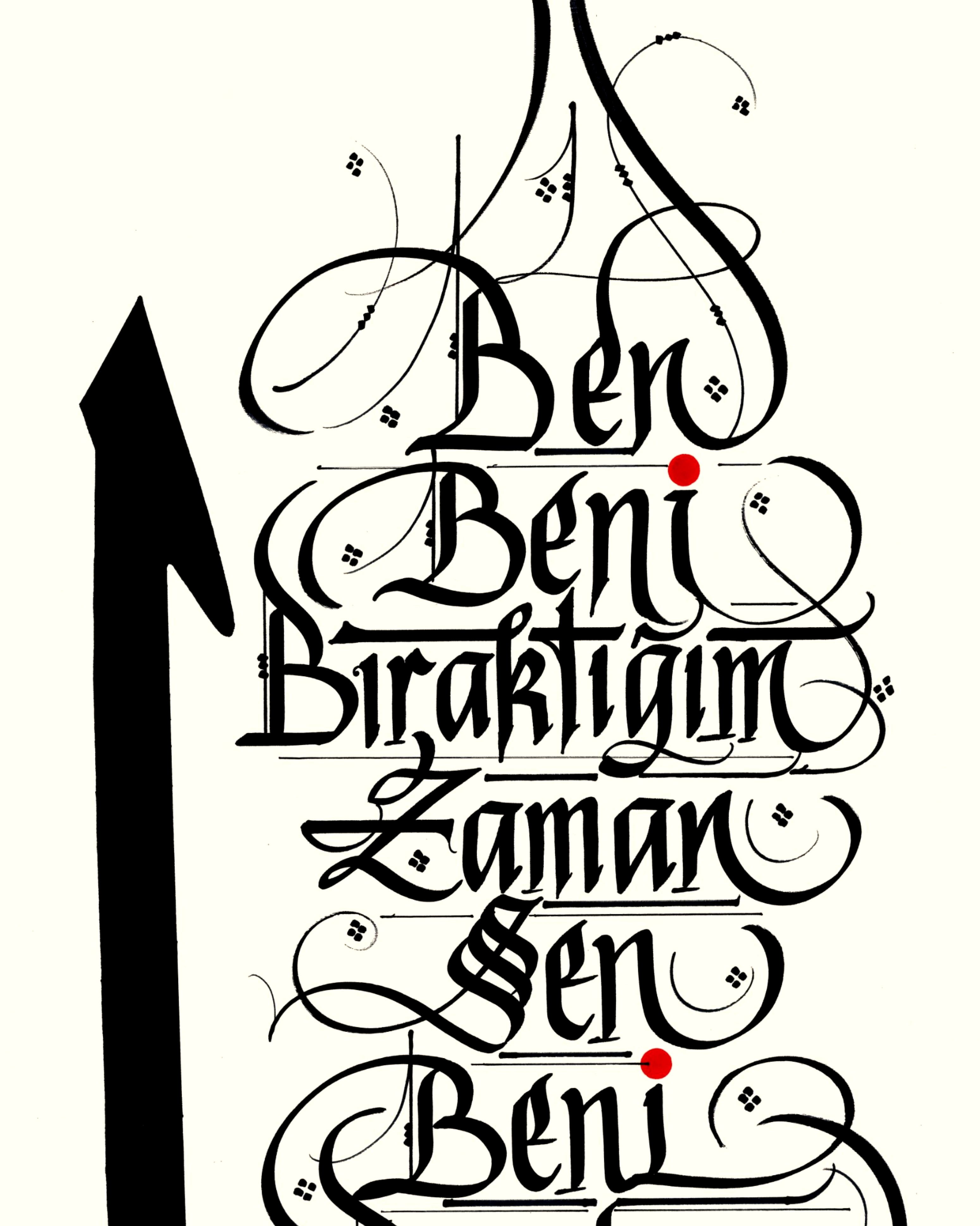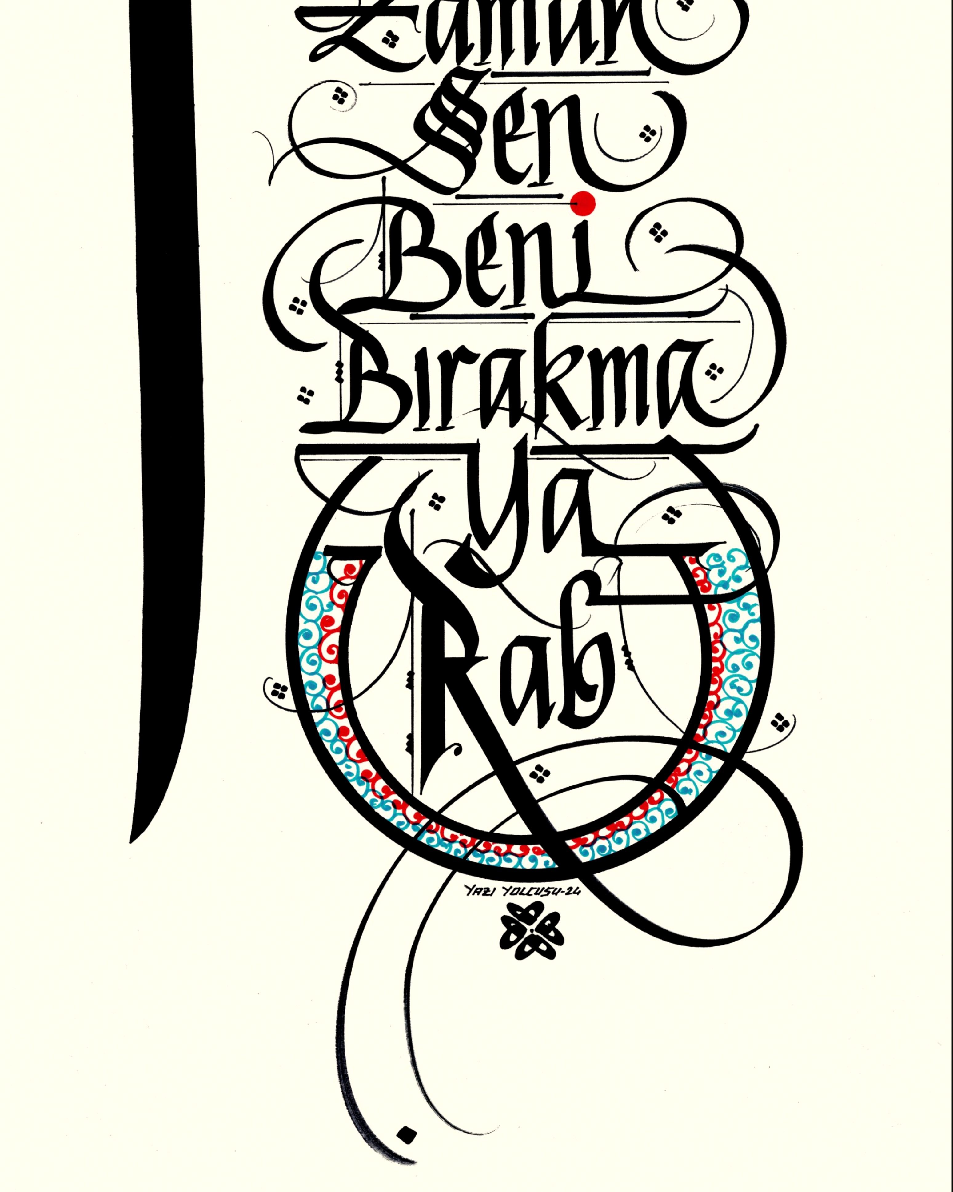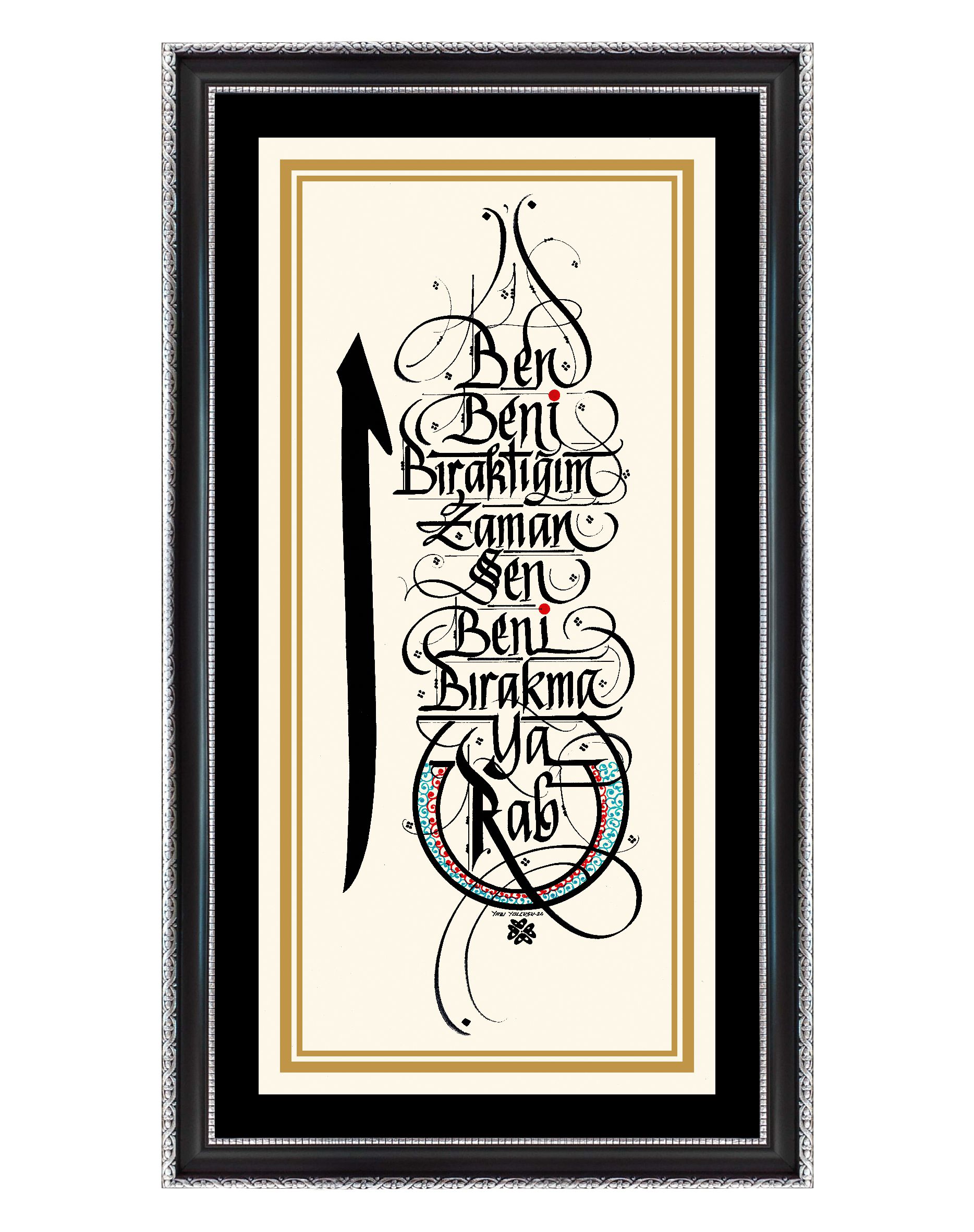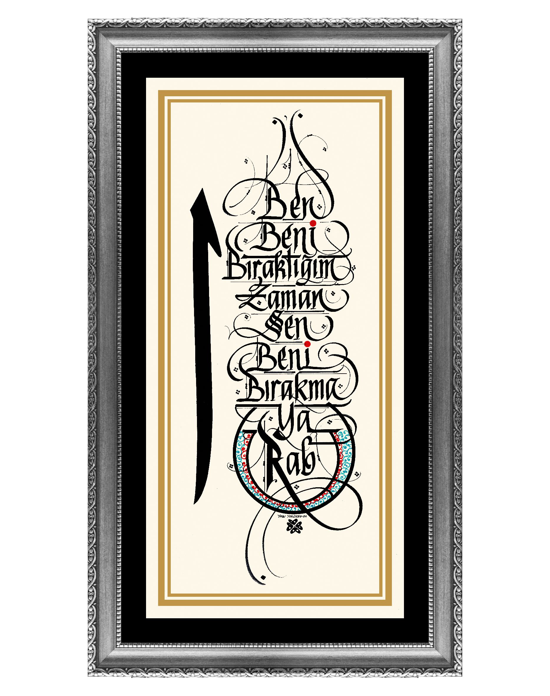 Sol bölüme Arapça Elif harfi tasarlanarak Yunus Emre’nin sözüyle bütünleştirildi. “Ben beni bıraktığım zaman sen beni bırakma ya Rab”. Krem zemine siyah mürekkeple yazılı.