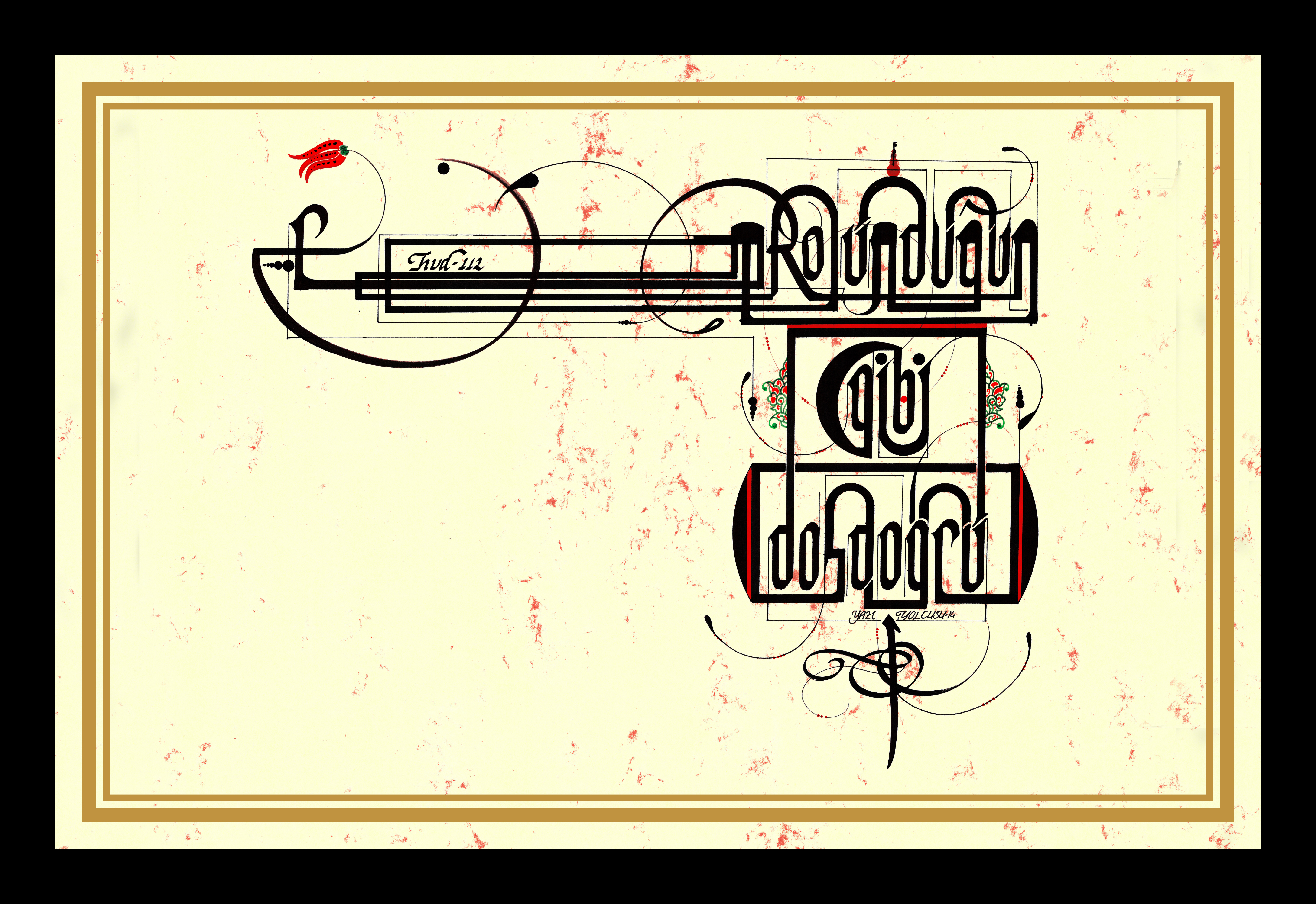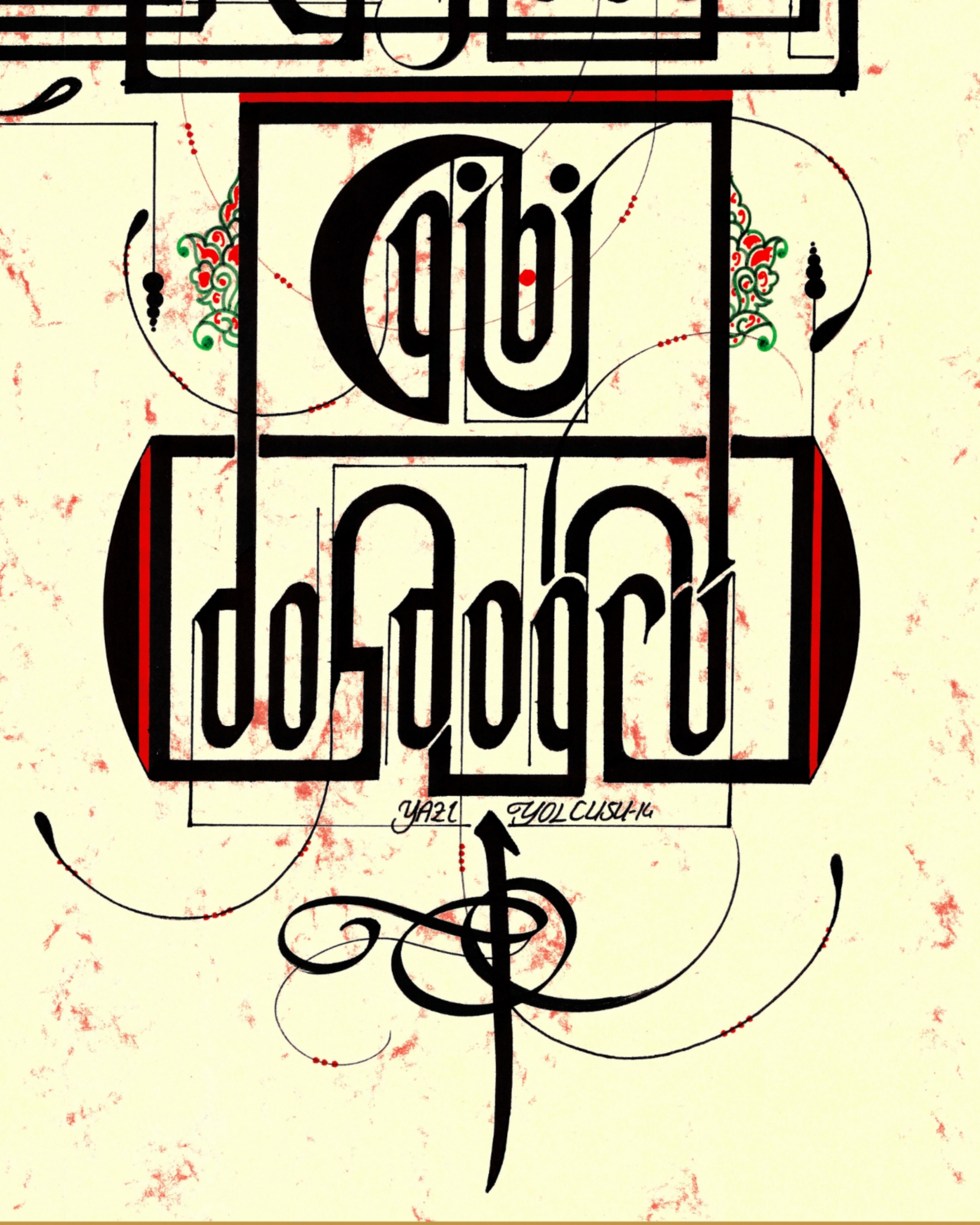 Hud Suresi 112’nci Ayet. “Emrolunduğun gibi dosdoğru ol.” Harflere kubbe ve kümbet görseli sağlanarak E harfi sol üst köşe de Lale ile tasarlandı ve Ol kelimesindeki L harfi Elif harfiyle tamamlanarak eskitme sarı zemine çalışıldı. Eser; doğruluğa vurgu yapılarak, hedefe nişan alan bir silah görselinde betimlendi.