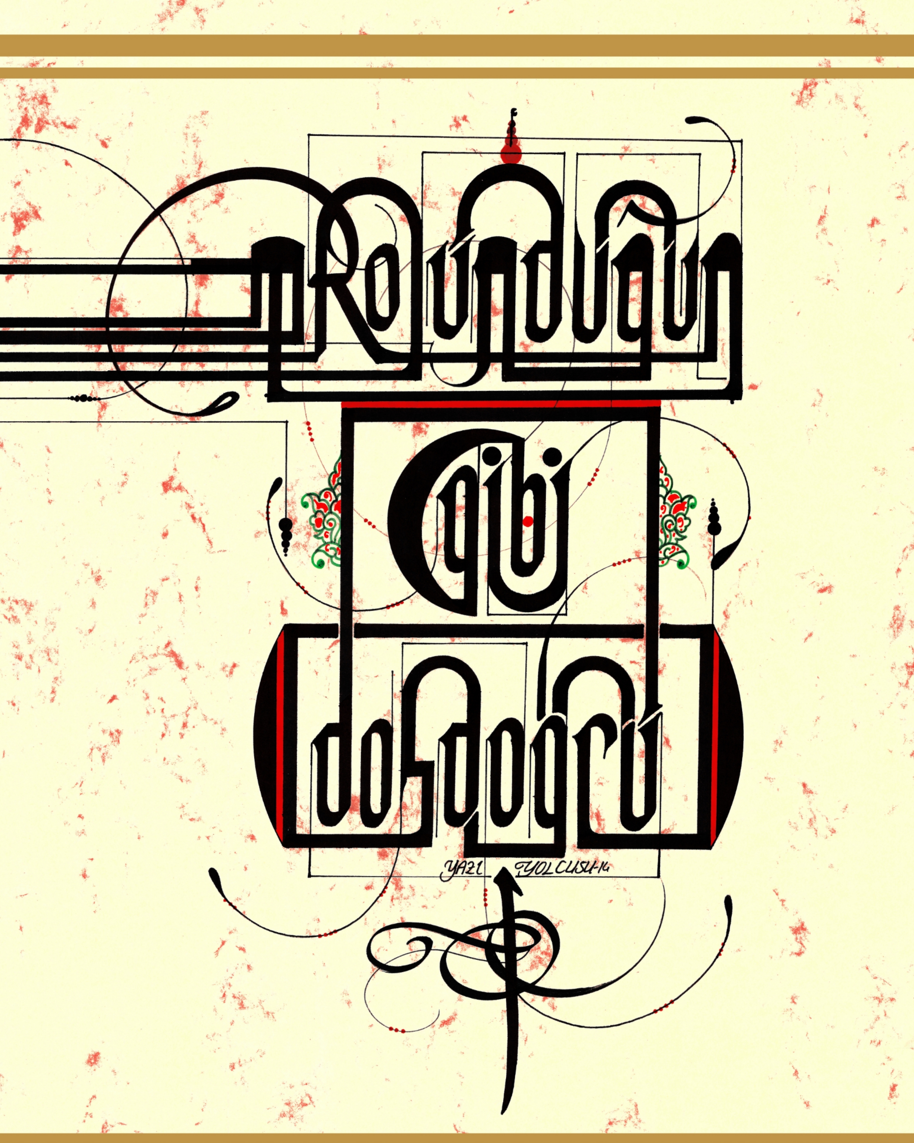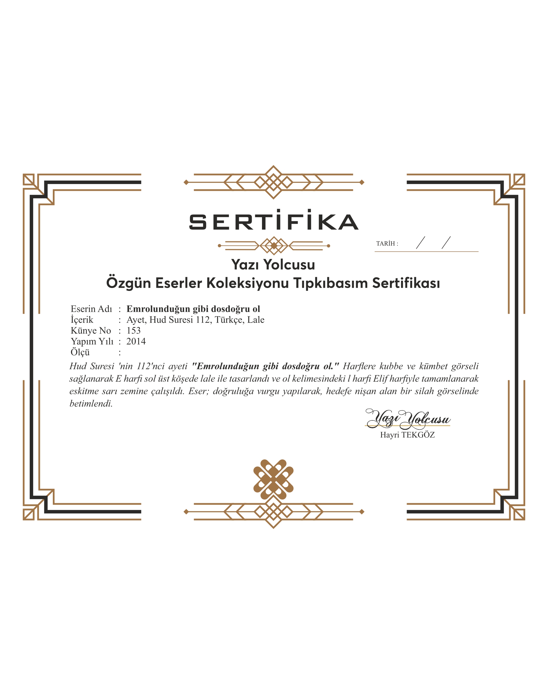 Hud Suresi 112’nci Ayet. “Emrolunduğun gibi dosdoğru ol.” Harflere kubbe ve kümbet görseli sağlanarak E harfi sol üst köşe de Lale ile tasarlandı ve Ol kelimesindeki L harfi Elif harfiyle tamamlanarak eskitme sarı zemine çalışıldı. Eser; doğruluğa vurgu yapılarak, hedefe nişan alan bir silah görselinde betimlendi.