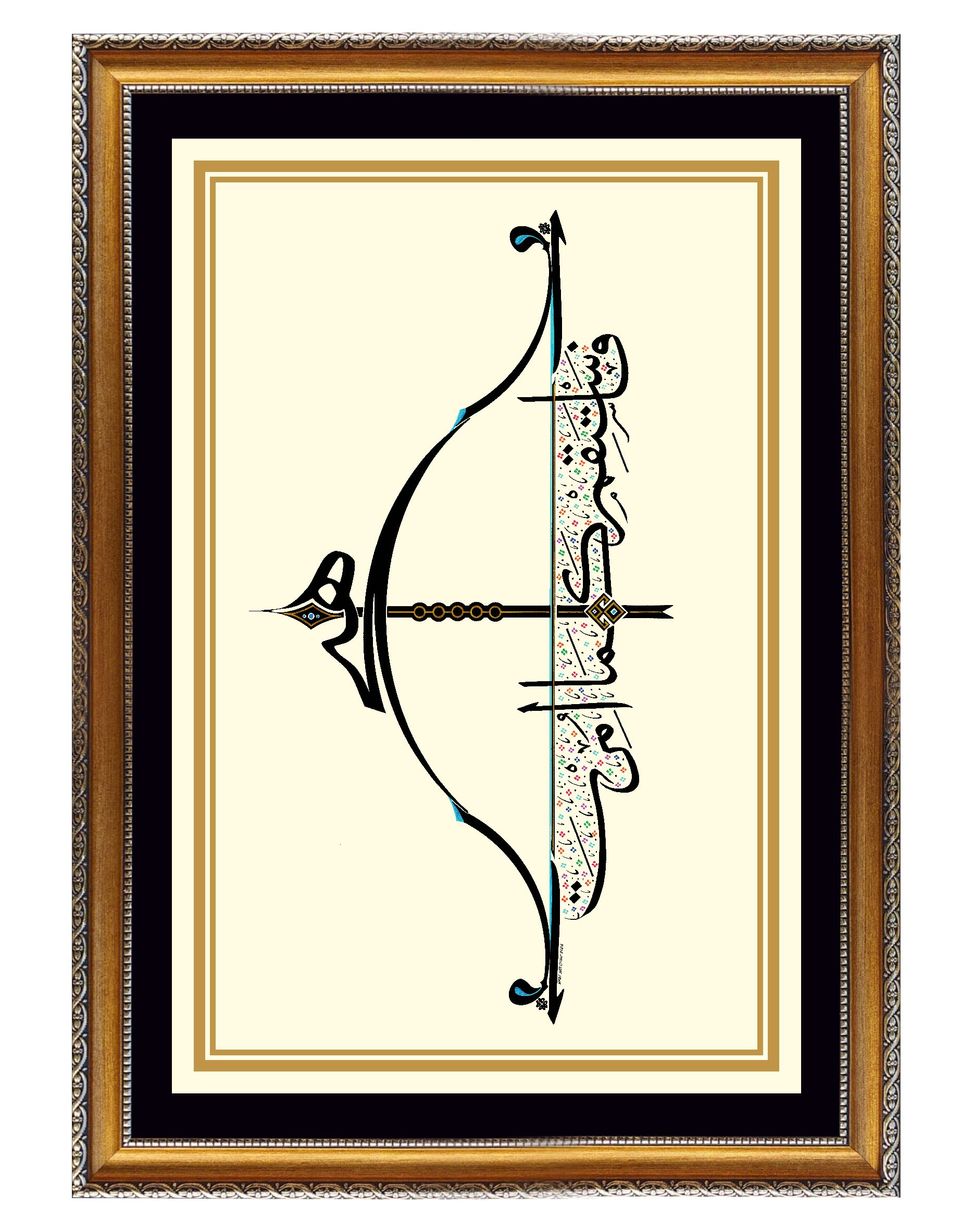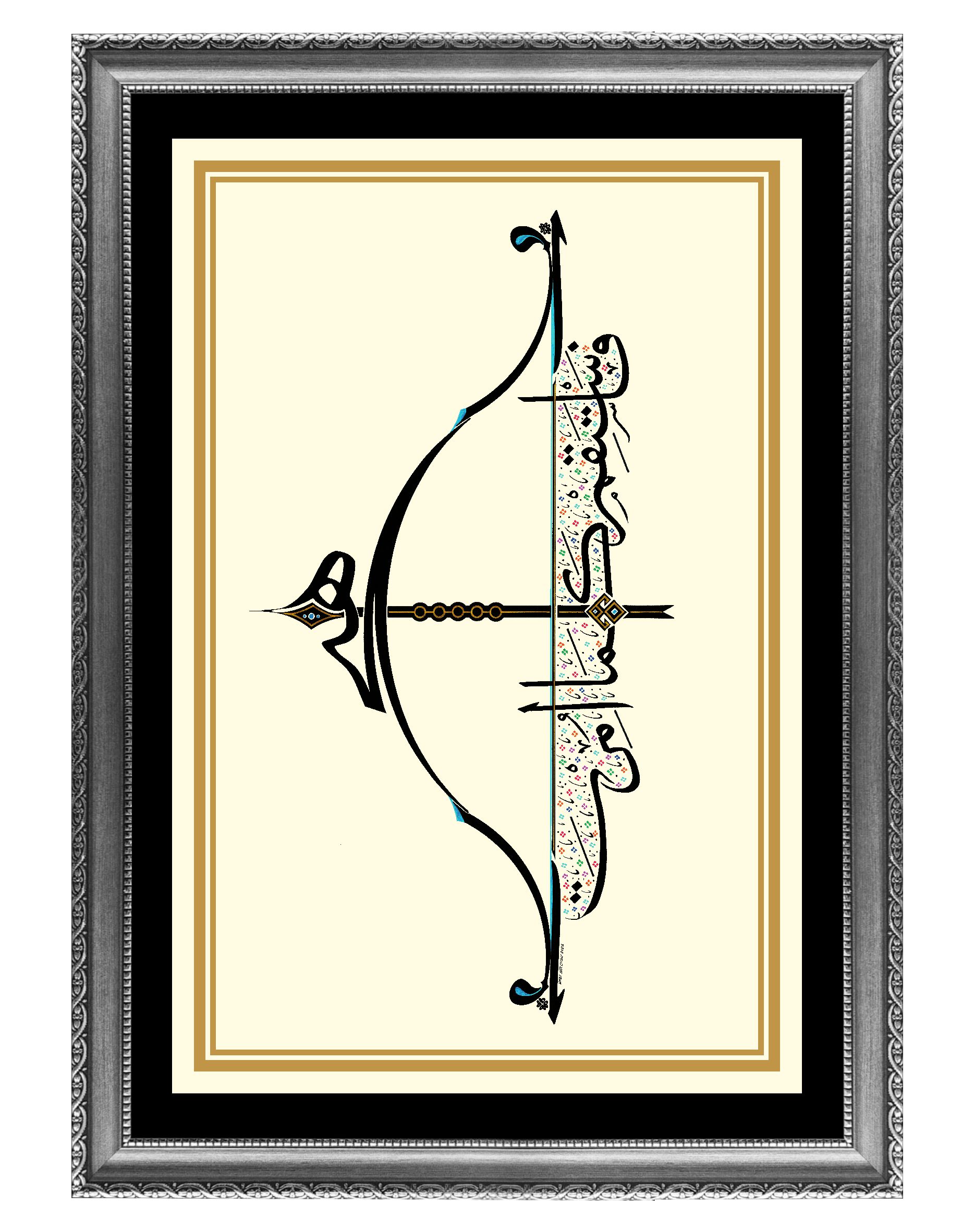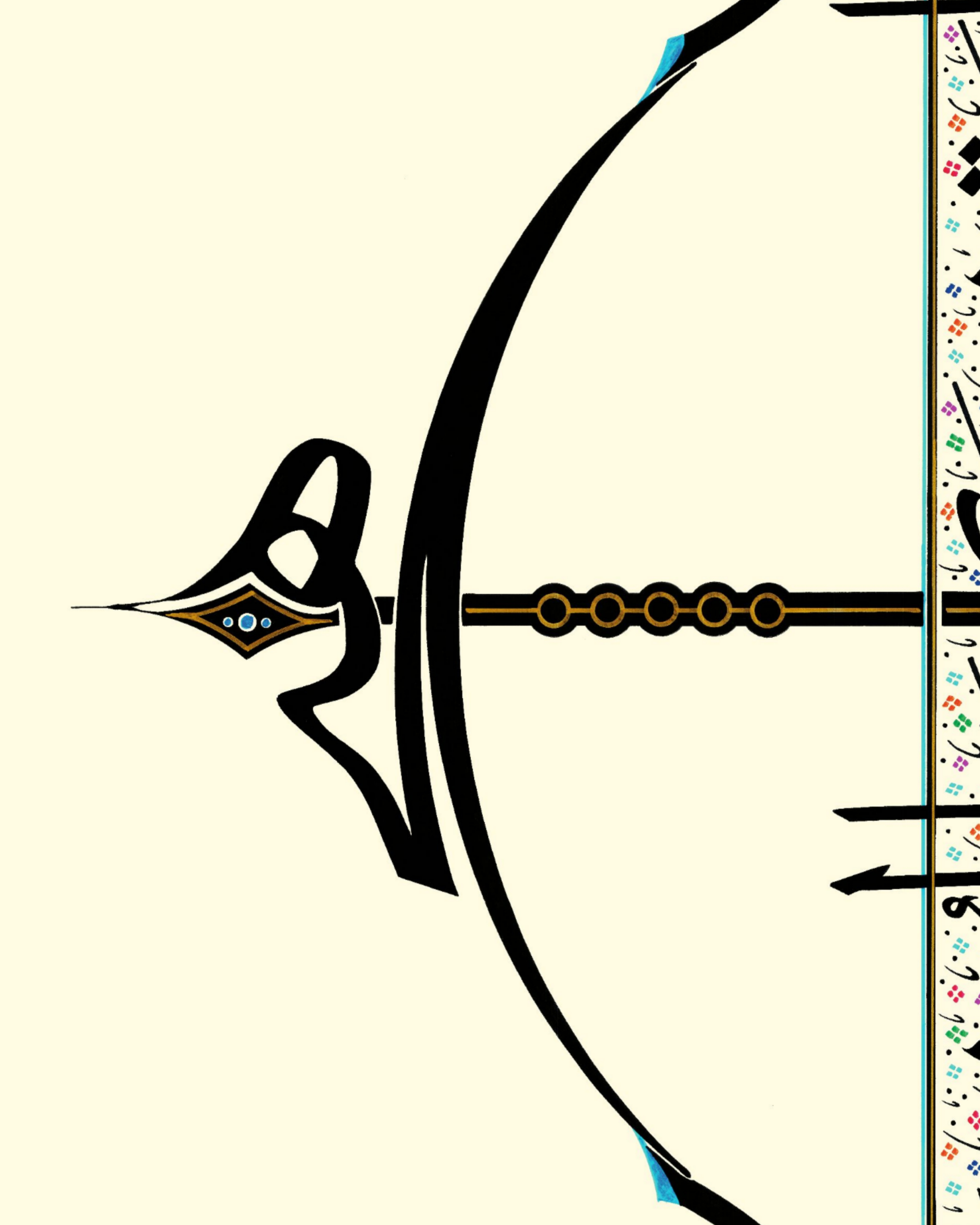 Okun uç kısmında “Hiç” yazılı. Çile veya kiriş adıyla bilinen germe ip üzerinde yukarıdan aşağı “Emrolunduğun gibi dosdoğru ol” Hud Suresi 112’nci ayetin Arapçası yazılıdır. Yayın üst ve alt uçları “Elif” ve “Vav” harfleriyle bütünleştirildi. Okun yelpaze bölümüne “Bereket” damgası nakşedildi. Tasarım; doğu, batı ve göğe doğru üç farklı cepheden okunabilmektedir. Bu anlayışla, okun yere atılamayacağına da işaret edilmiştir.