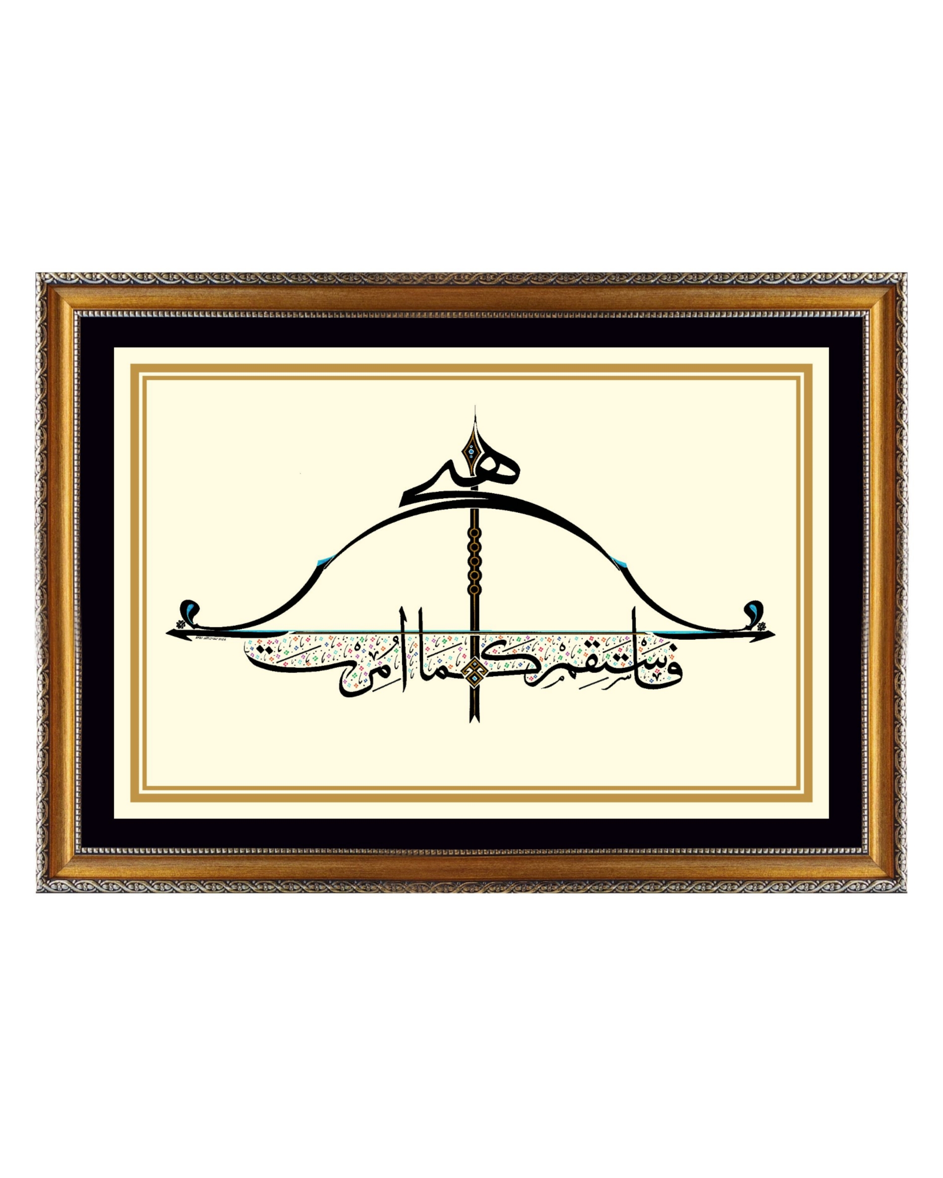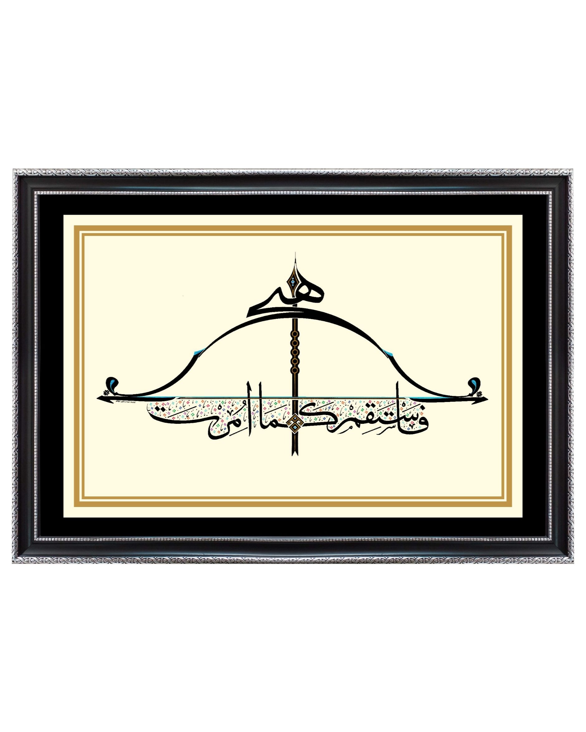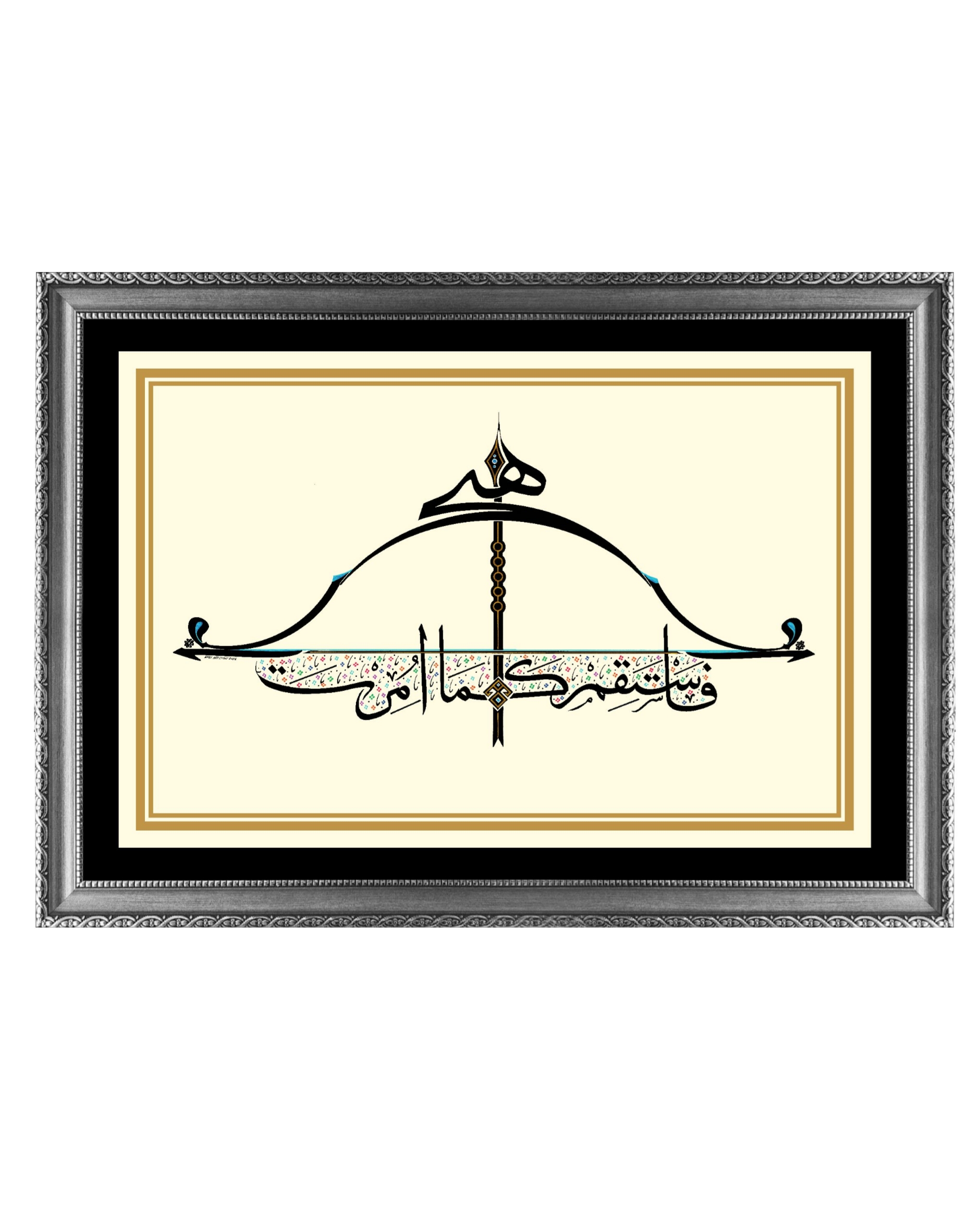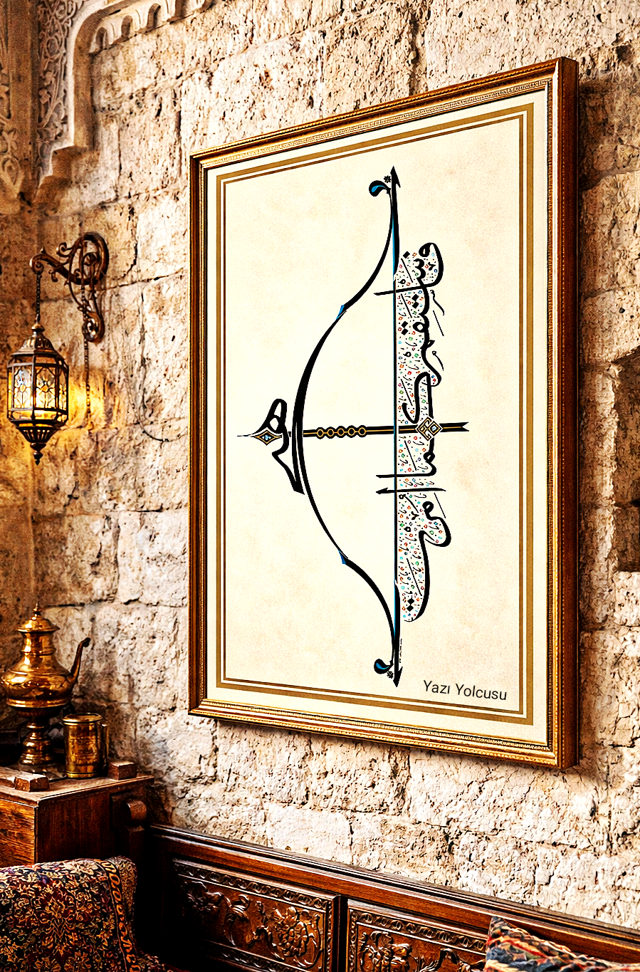 Okun uç kısmında “Hiç” yazılı. Çile veya kiriş adıyla bilinen germe ip üzerinde yukarıdan aşağı “Emrolunduğun gibi dosdoğru ol” Hud Suresi 112’nci ayetin Arapçası yazılıdır. Yayın üst ve alt uçları “Elif” ve “Vav” harfleriyle bütünleştirildi. Okun yelpaze bölümüne “Bereket” damgası nakşedildi. Tasarım; doğu, batı ve göğe doğru üç farklı cepheden okunabilmektedir. Bu anlayışla, okun yere atılamayacağına da işaret edilmiştir.