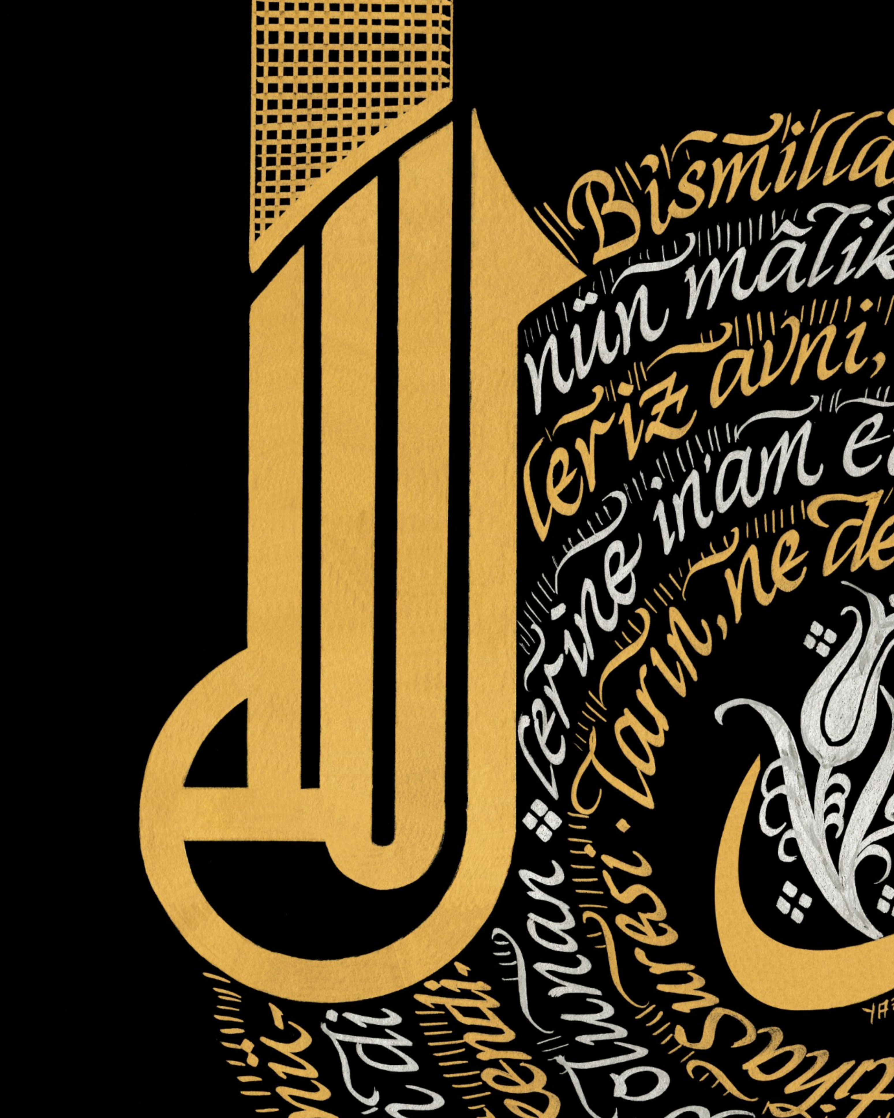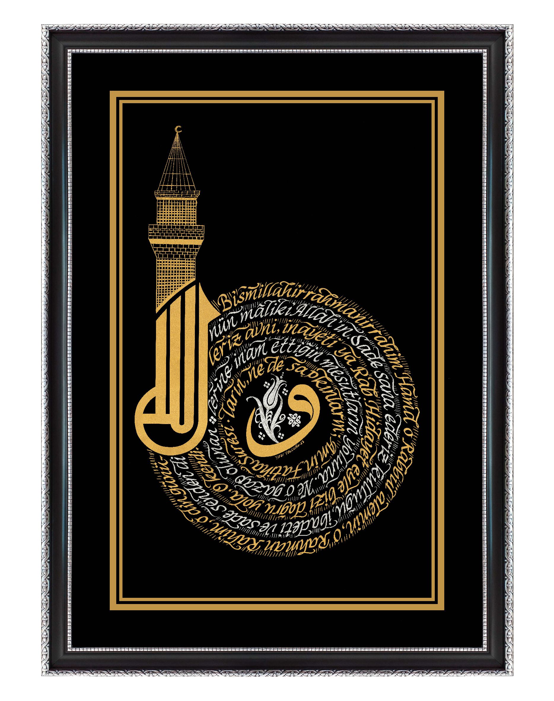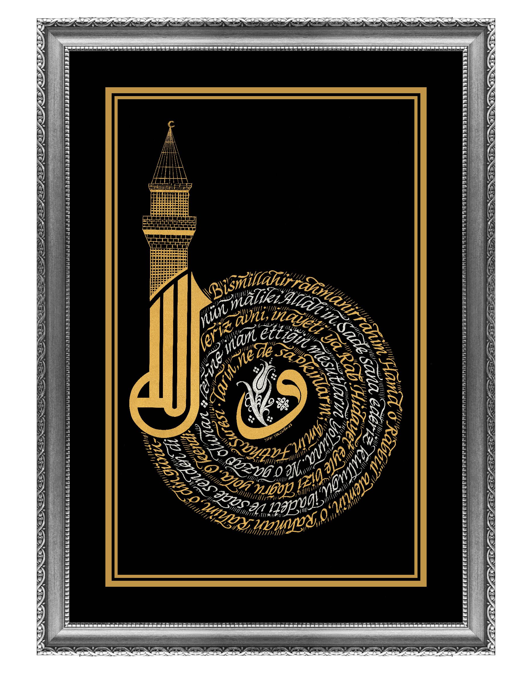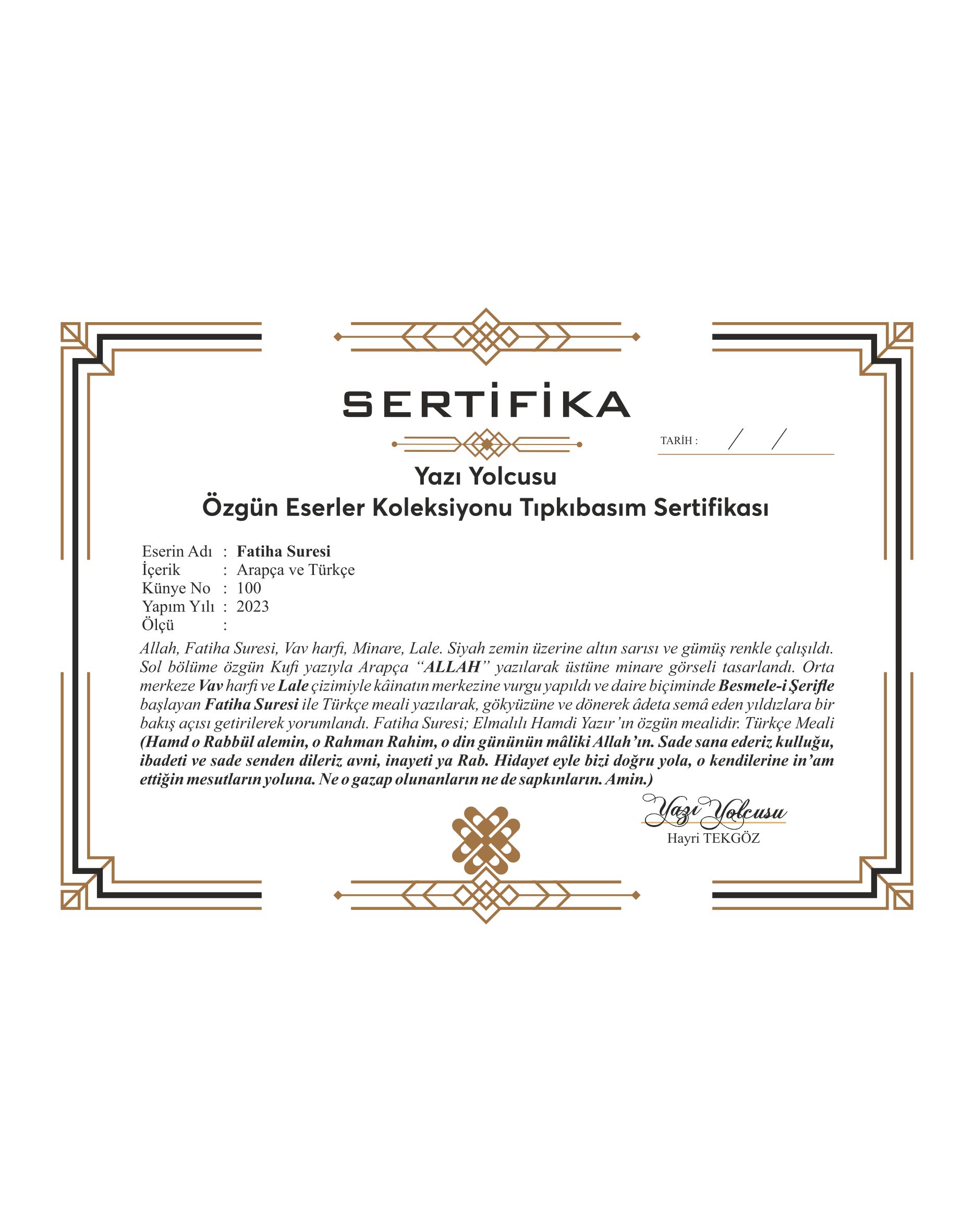 Allah, Fatiha Suresi, Vav harfi, Minare, Lale. Siyah zemin üzerine altın sarısı ve gümüş renkle çalışıldı. Sol bölüme özgün Kufi yazıyla Arapça “ALLAH” yazılarak üstüne minare görseli tasarlandı. Orta merkeze Vav harfi ve Lale çizimiyle kâinatın merkezine vurgu yapıldı ve daire biçiminde Besmele-i Şerifle başlayan Fatiha Suresi ile Türkçe meali yazılarak, gökyüzüne ve dönerek semâ eden yıldızlara bir bakış açısı getirilerek yorumlandı. Fatiha Suresi; Elmalılı Hamdi Yazır’ın özgün mealidir. Türkçe Meali (Hamd o Rabbül alemin, o Rahman Rahim, o din gününün mâliki Allah’ın. Sade sana ederiz kulluğu, ibadeti ve sade senden dileriz avni, inayeti ya Rab. Hidayet eyle bizi doğru yola, o kendilerine in’am ettiğin mesutların yoluna. Ne o gazap olunanların ne de sapkınların. Amin.)