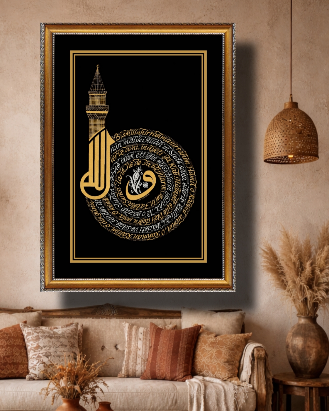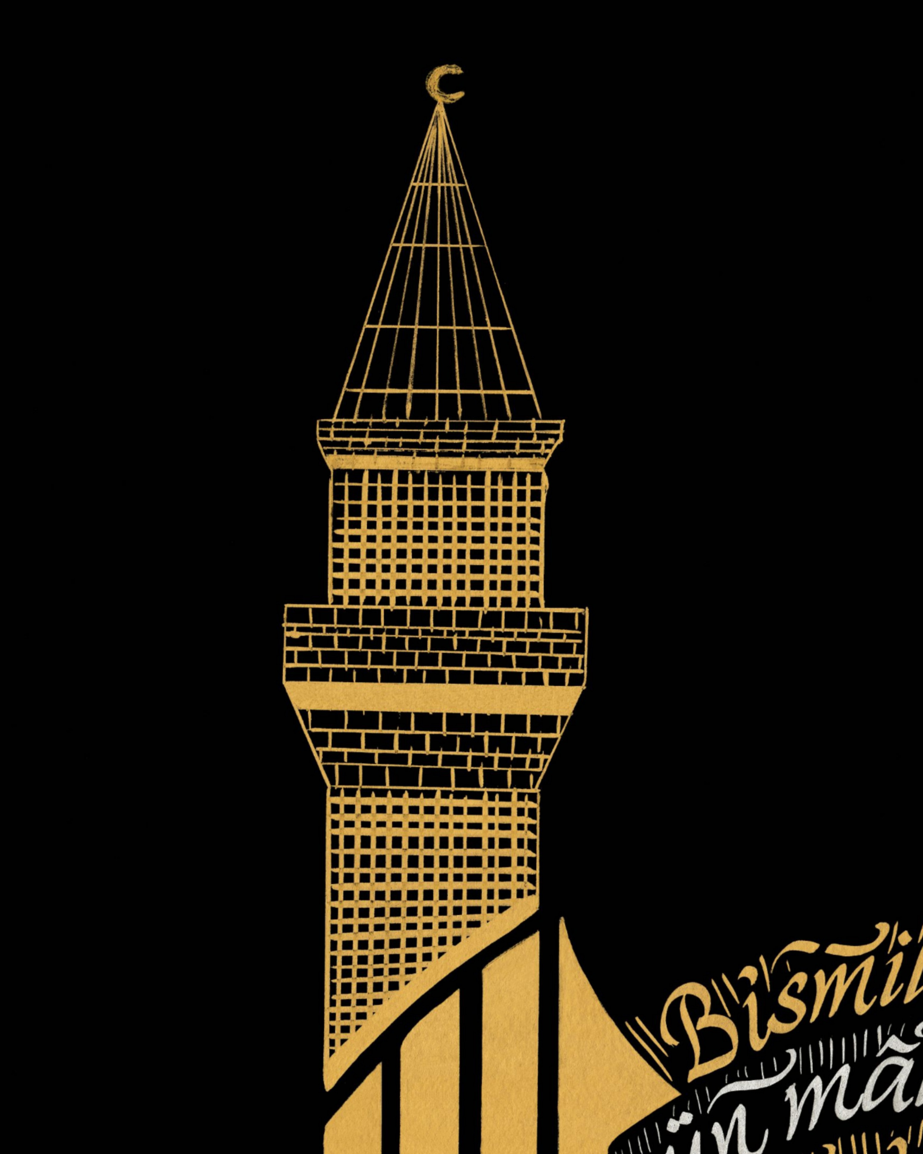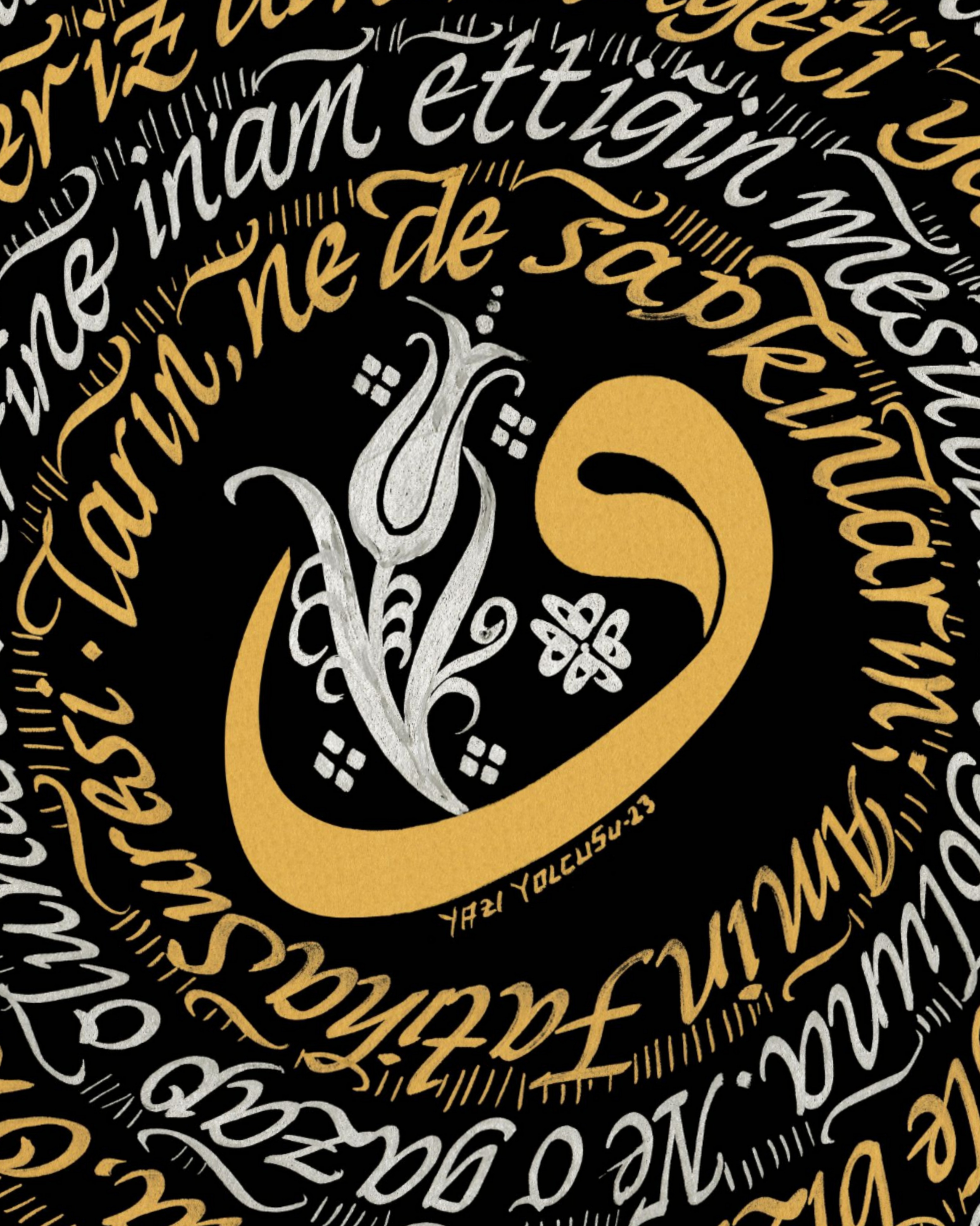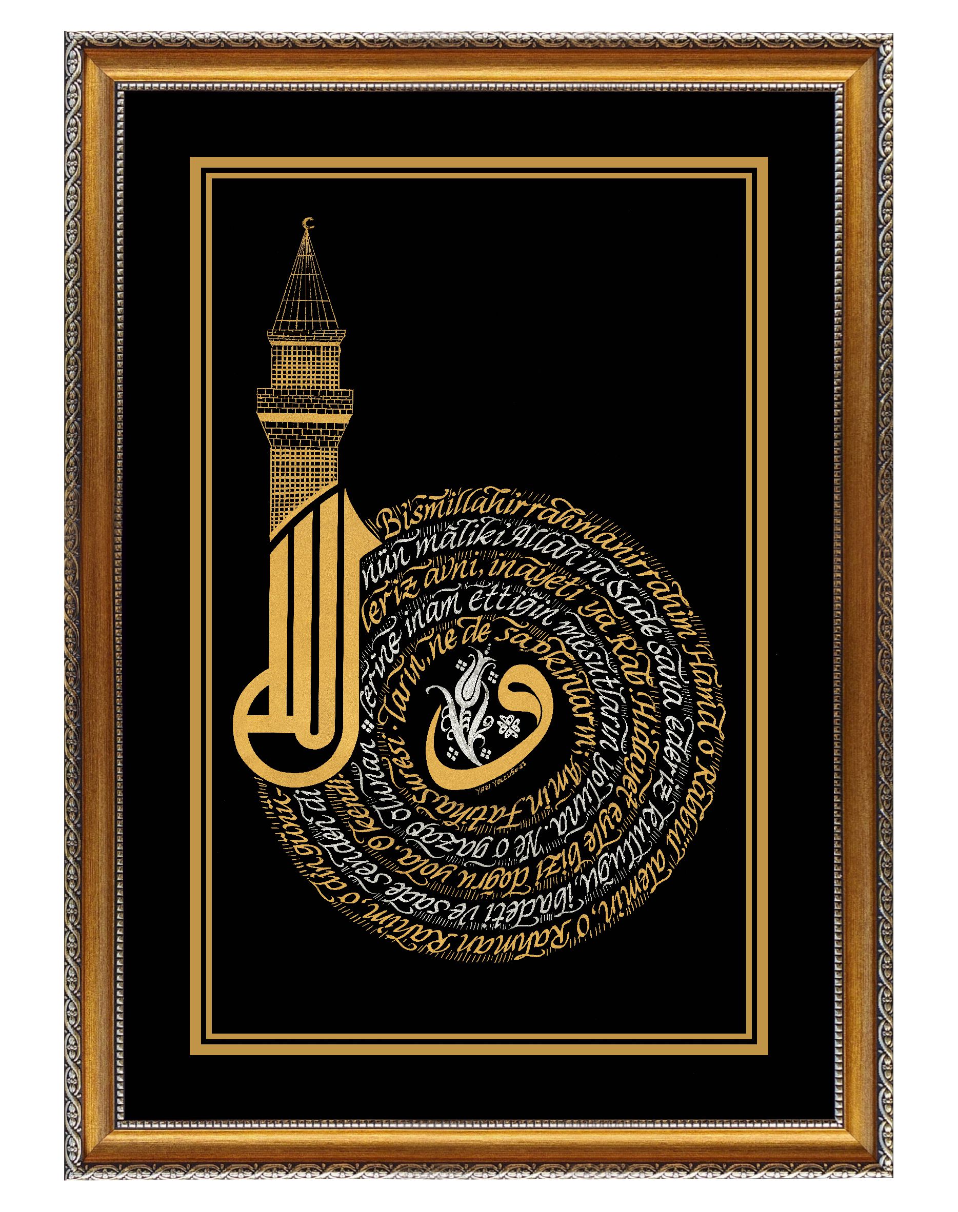 Allah, Fatiha Suresi, Vav harfi, Minare, Lale. Siyah zemin üzerine altın sarısı ve gümüş renkle çalışıldı. Sol bölüme özgün Kufi yazıyla Arapça “ALLAH” yazılarak üstüne minare görseli tasarlandı. Orta merkeze Vav harfi ve Lale çizimiyle kâinatın merkezine vurgu yapıldı ve daire biçiminde Besmele-i Şerifle başlayan Fatiha Suresi ile Türkçe meali yazılarak, gökyüzüne ve dönerek semâ eden yıldızlara bir bakış açısı getirilerek yorumlandı. Fatiha Suresi; Elmalılı Hamdi Yazır’ın özgün mealidir. Türkçe Meali (Hamd o Rabbül alemin, o Rahman Rahim, o din gününün mâliki Allah’ın. Sade sana ederiz kulluğu, ibadeti ve sade senden dileriz avni, inayeti ya Rab. Hidayet eyle bizi doğru yola, o kendilerine in’am ettiğin mesutların yoluna. Ne o gazap olunanların ne de sapkınların. Amin.)