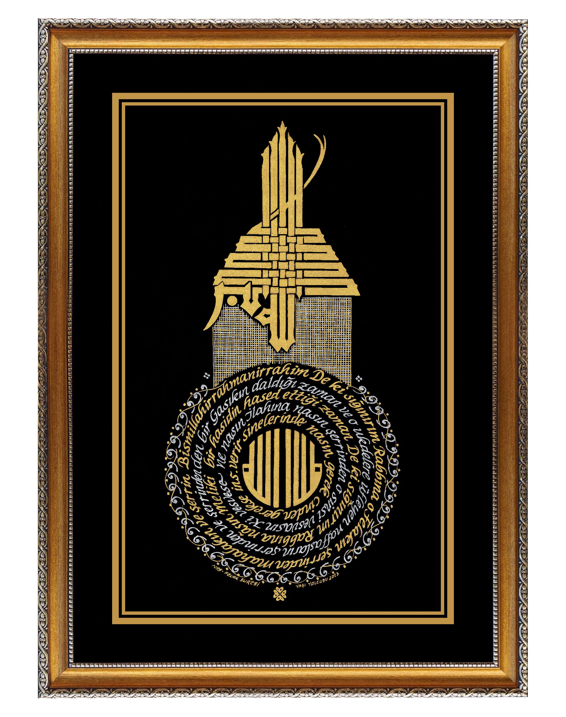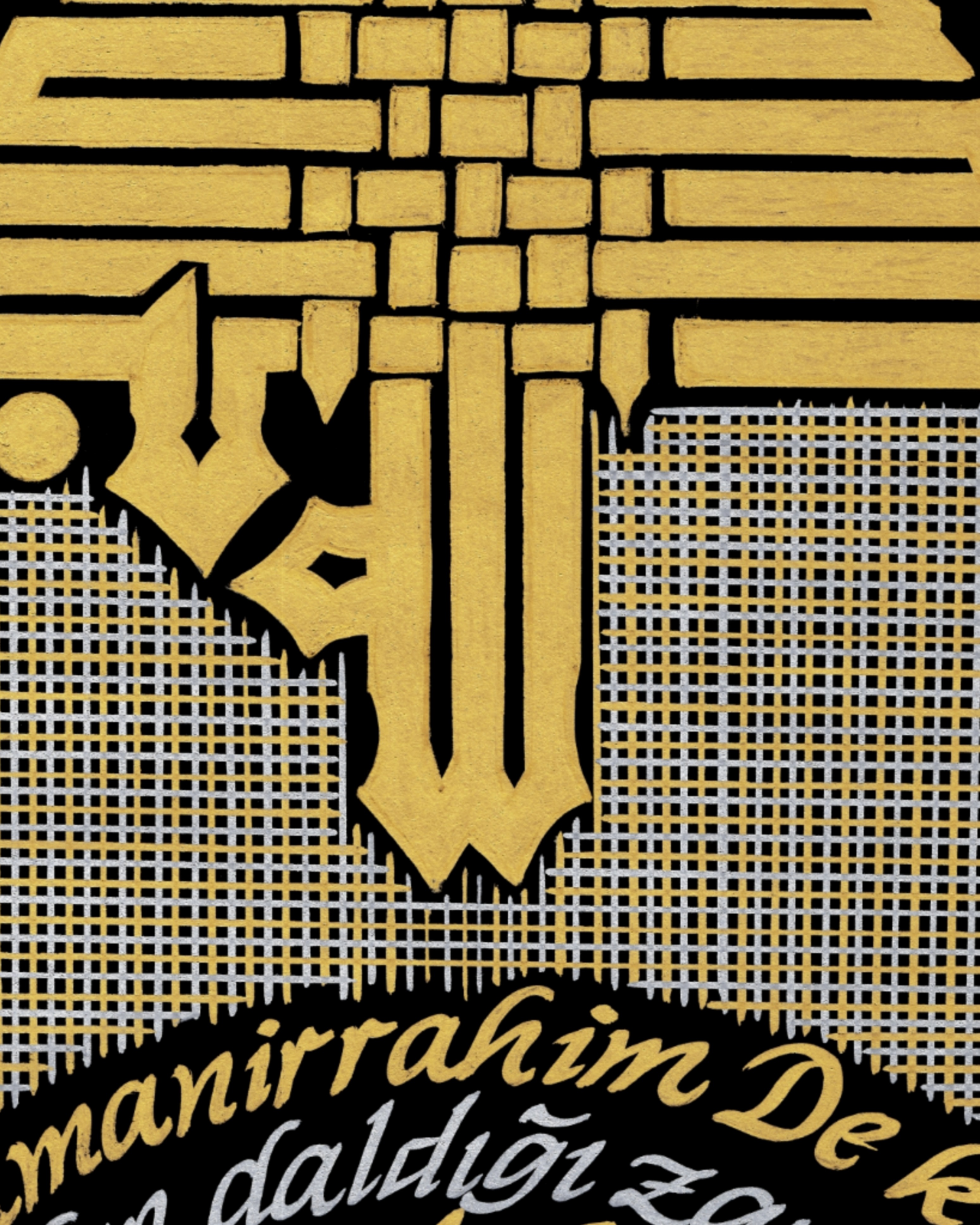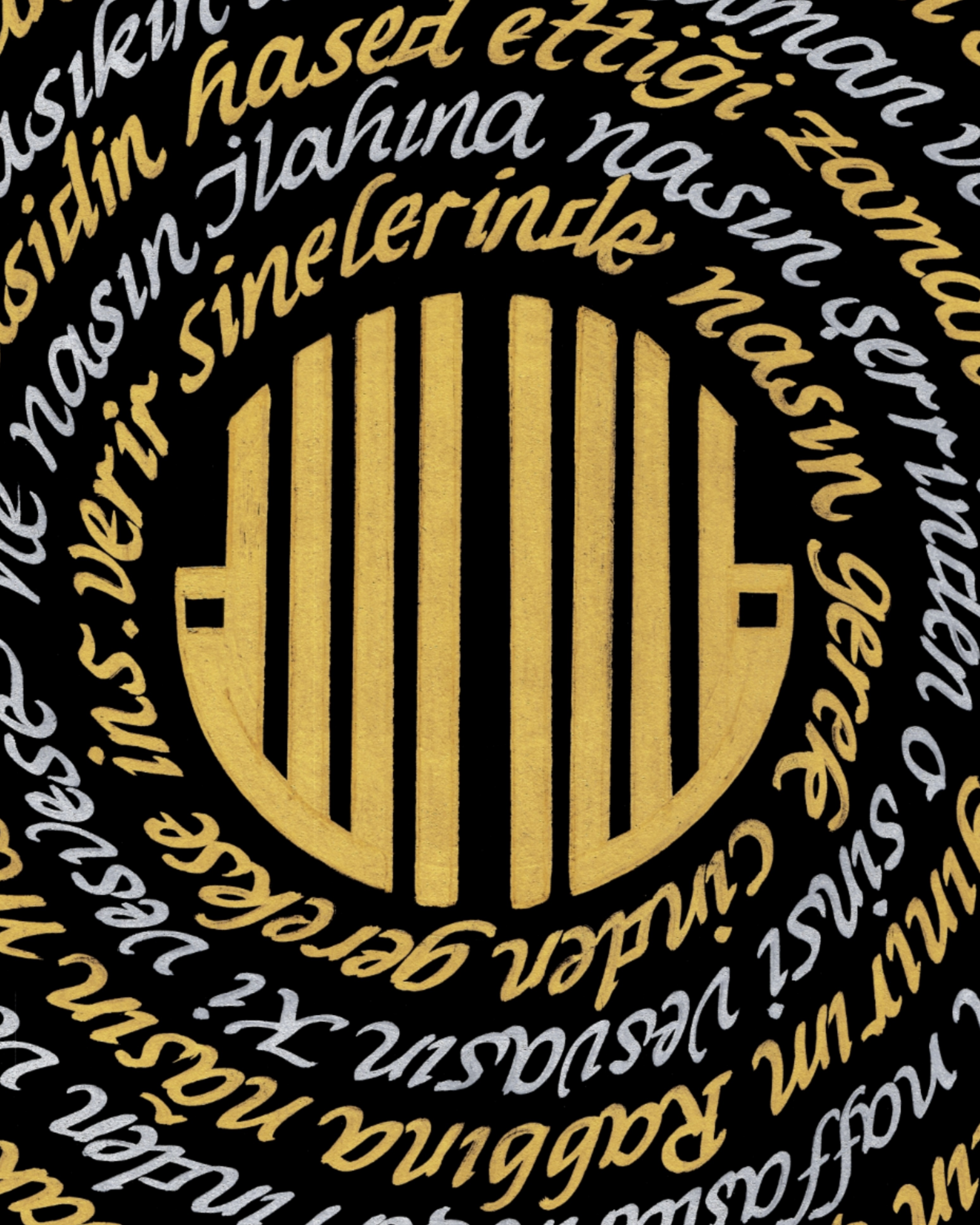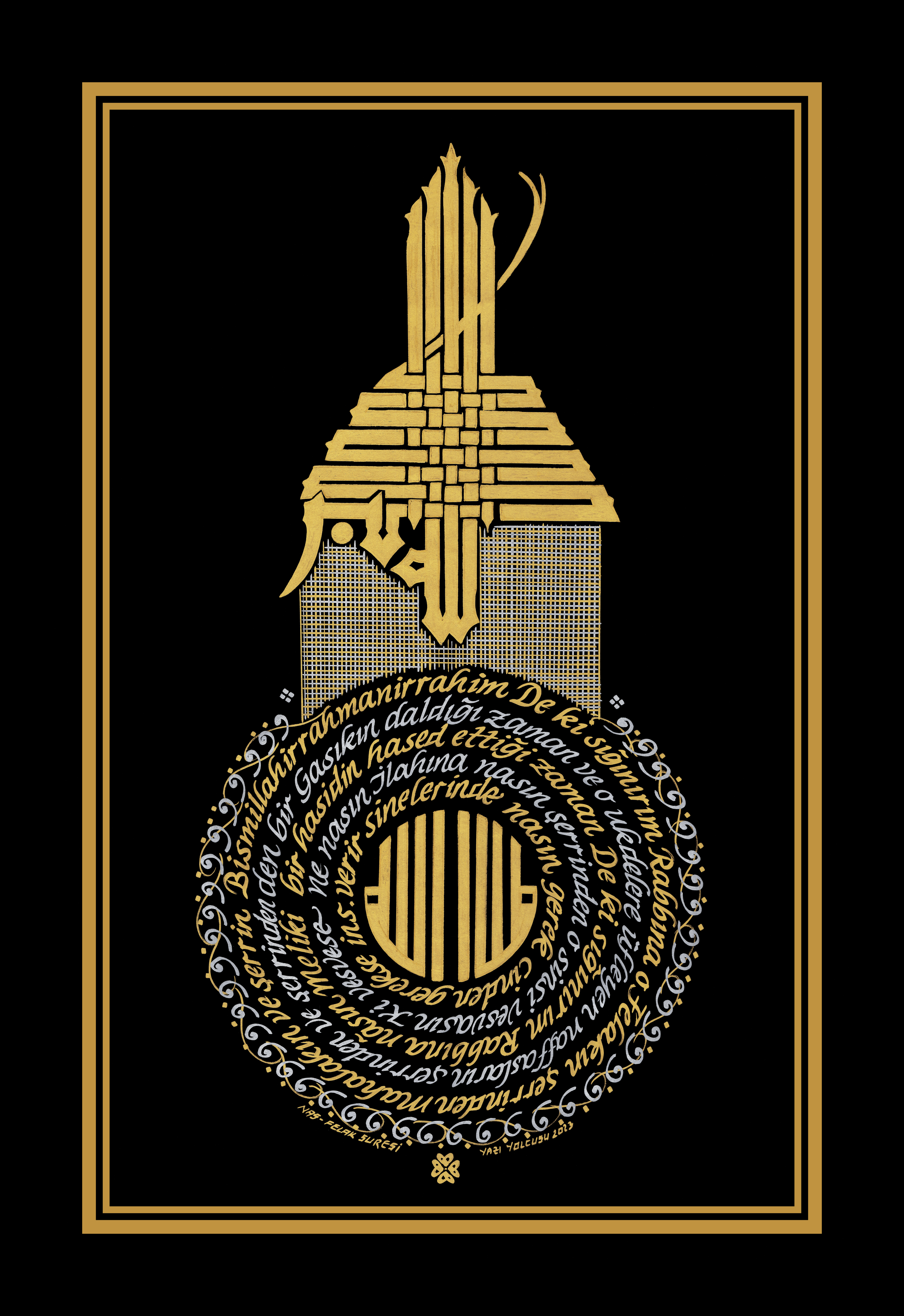 Nas, Felak Suresi, Allah, Allahu Ekber. Siyah zemin üzerine altın sarısı ve gümüş renk ile çalışıldı. Üst bölüme özgün kufi yazı ile Arapça “Allahu Ekber” tasarlanarak, alt daire içerisinde Arapça aynalı-müsenna yazı ile “Allah” yazılıdır. Daire biçiminde “BismillahirRahmanirRahim” ile başlayarak surenin devamı sağlandı. Bu vesile ile gökyüzünde dönerek sema eden yıldızlara yorumlandı. Sure, Elmalılı Hamdi Yazır’ın sadeleştirilmeyen ilk Türkçe mealidir. Kelime ve dönemin meal hazinesini görmemize de imkan sağlıyor.