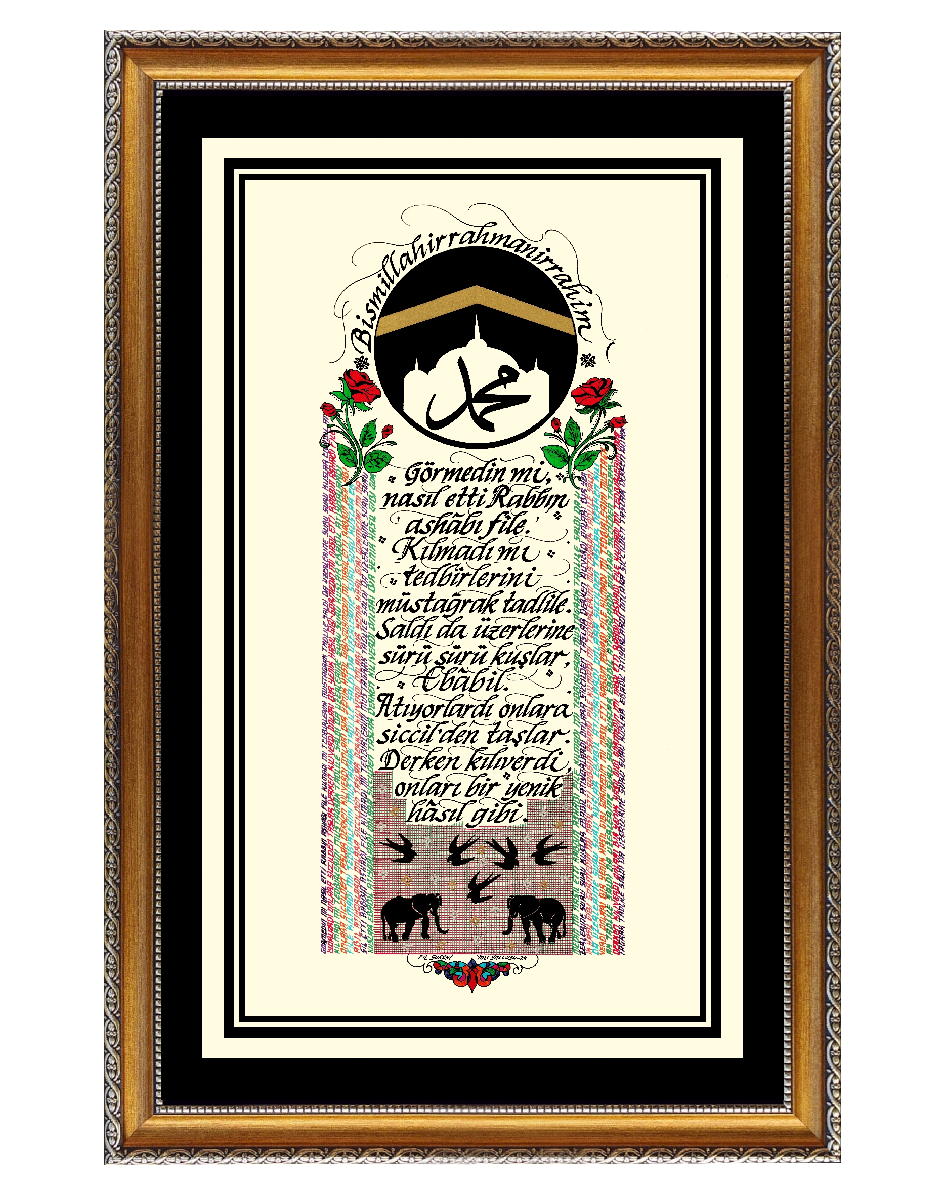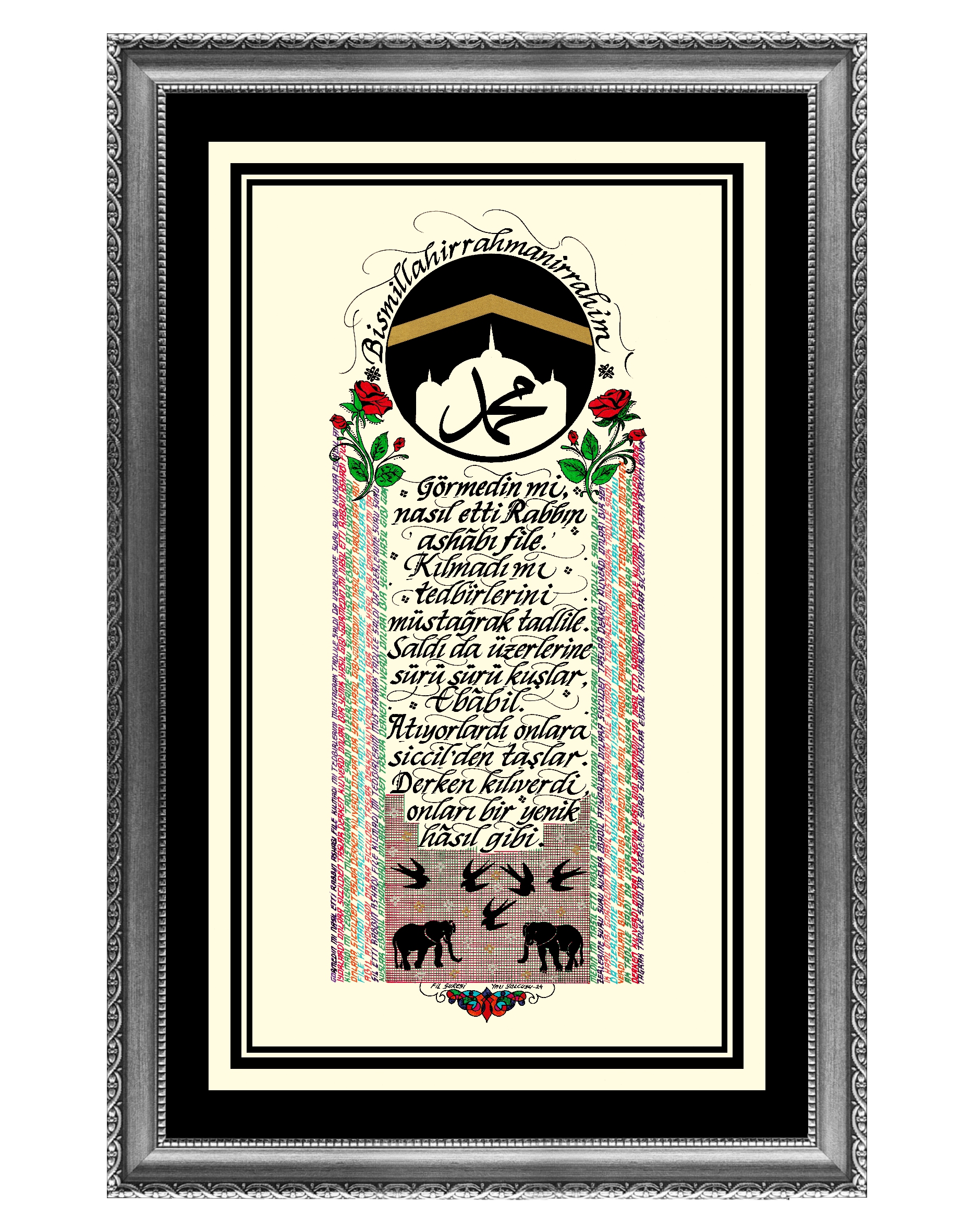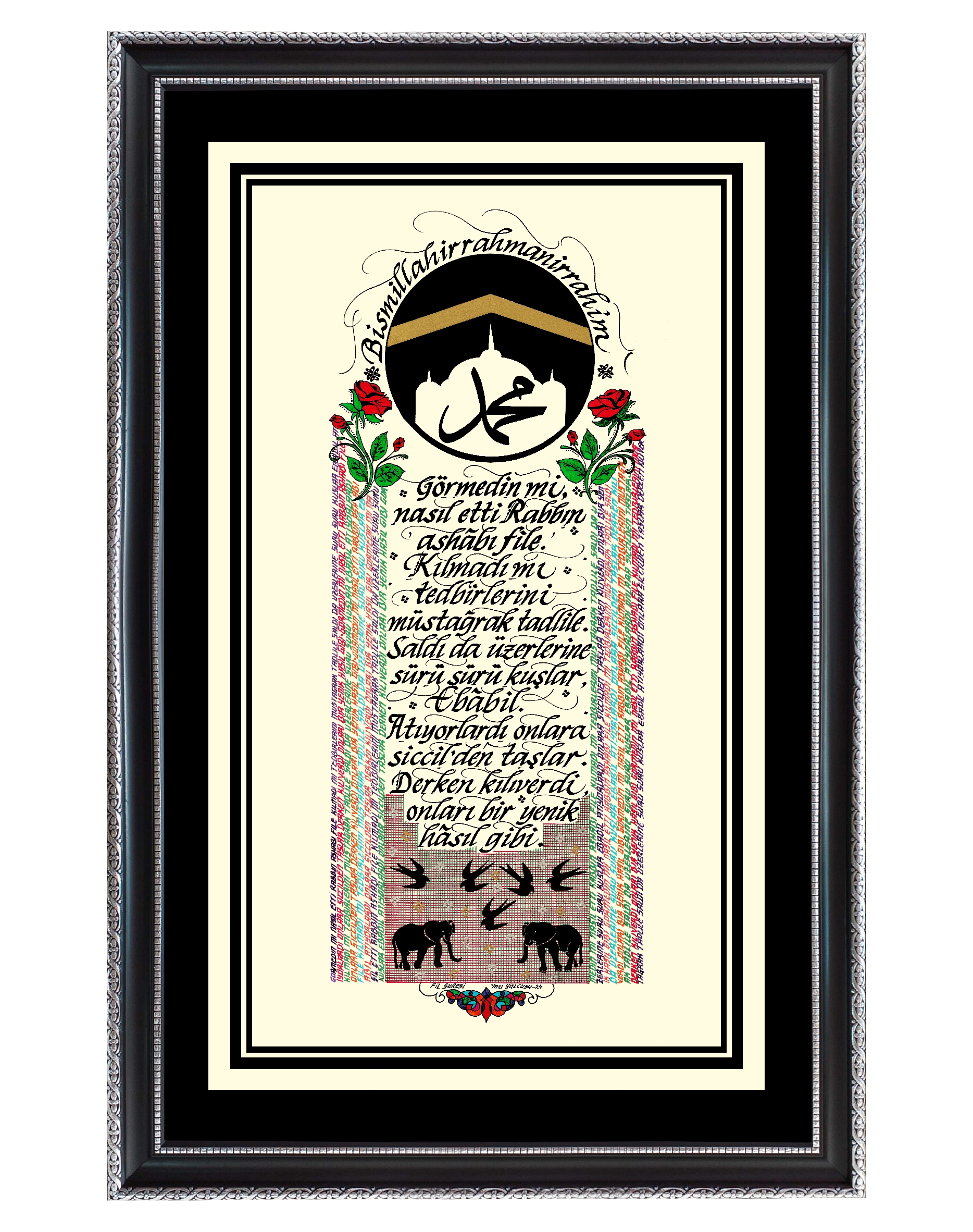 Fil Suresi. Elmalılı Hamdi Yazır’ın özgün Türkçe meali. Üst bölüme Kabe ve Cami görseli çizilerek gövdesine Arapça Muhammed S.A.V. ismi yazılı. Tepe kısmına yay biçiminde “BismillahirRahmanirRahim” tasarlanarak Sûre’nin Türkçe meali eserin gövdesine yazılı. Sağ ve soldaki renkli sütunlara Sûre’nin tekrarı yazılarak gül çiçekleriyle nakşedildi. Alt bölüm Fil ve Ebâbil Kuşlarıyla bezenerek eser tamamlanmıştır. Surenin Türkçe Meali; “BismillâhirRahmânirRahim. Görmedin mi, nasıl etti Rabbın ashâbı file. Kılmadı mı tedbirlerini müstağrak tadlîle. Saldı da üzerlerine sürü sürü kuşlar, Ebabil. Atıyorlardı onlara siccil’den taşlar. Derken kılıverdi, onları bir yenik hâsıl gibi.”