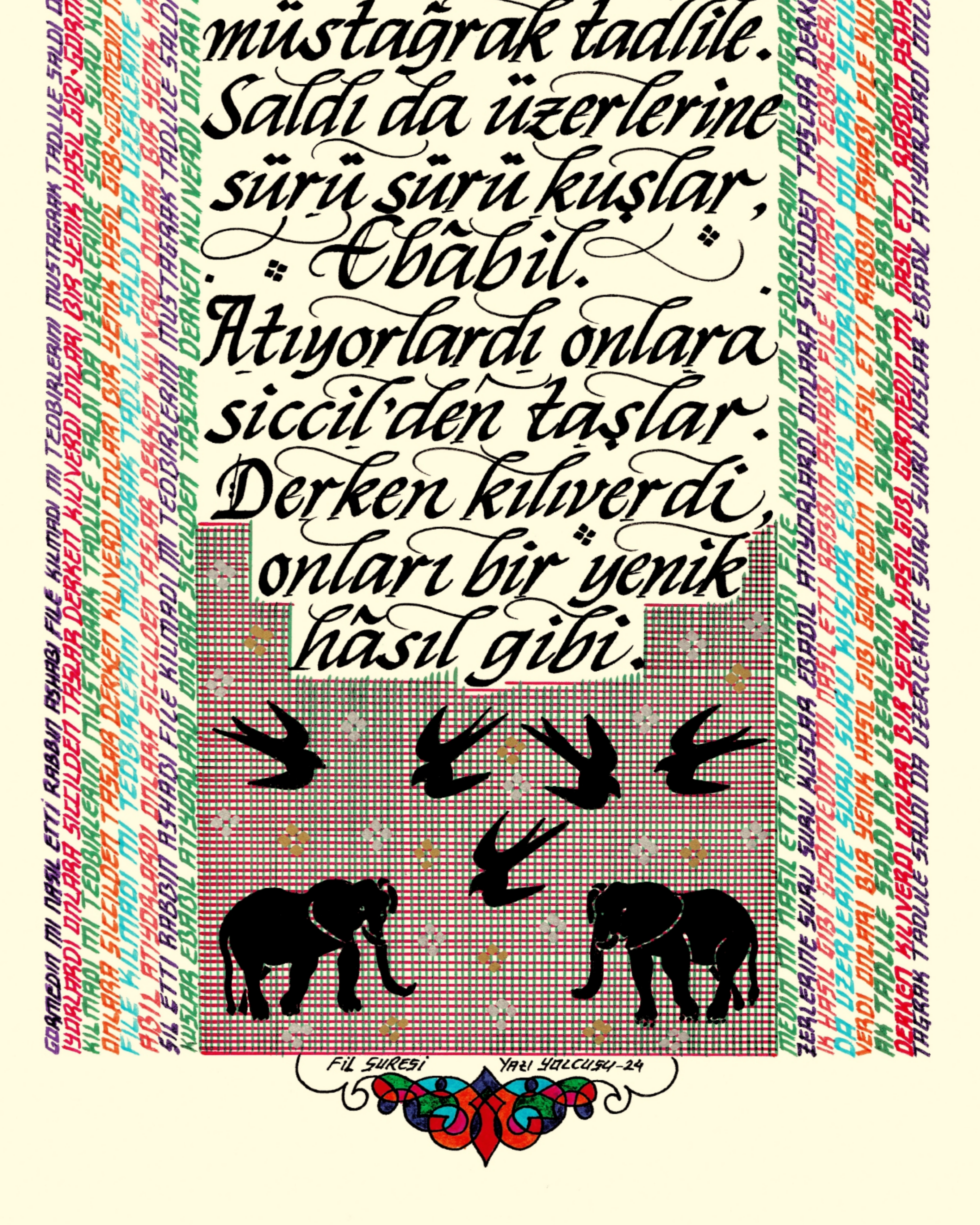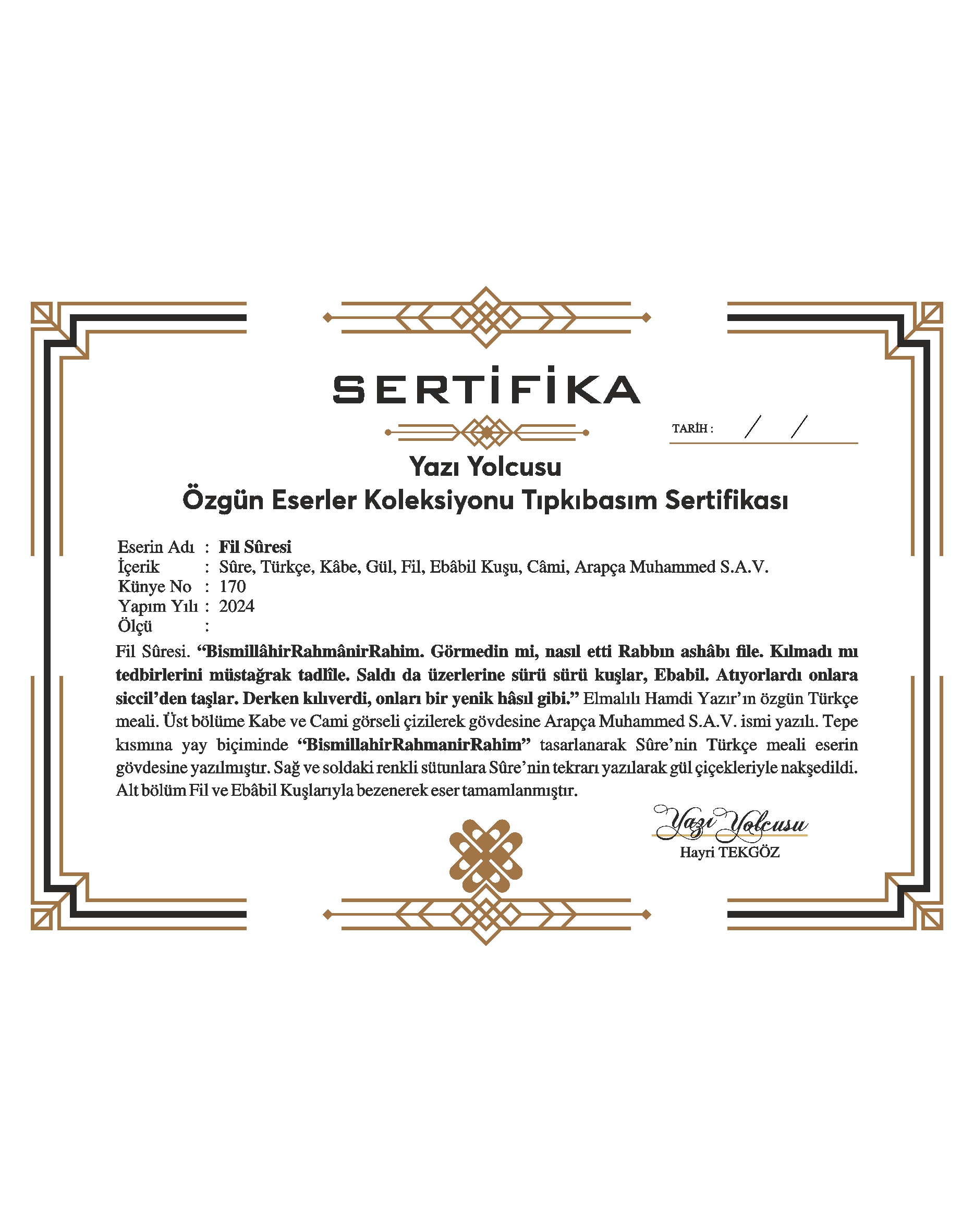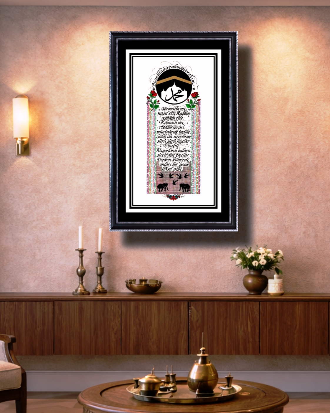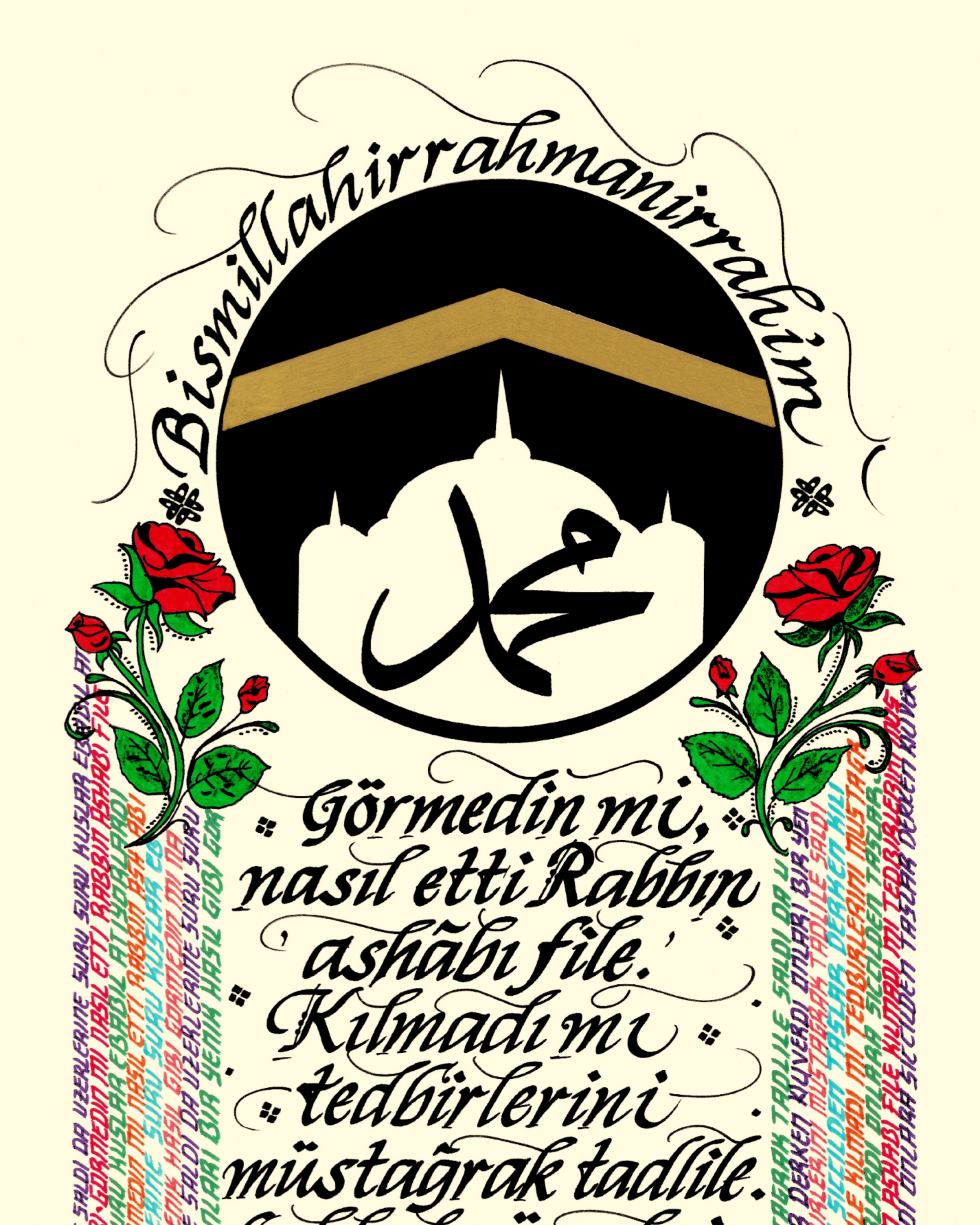 Fil Suresi. Elmalılı Hamdi Yazır’ın özgün Türkçe meali. Üst bölüme Kabe ve Cami görseli çizilerek gövdesine Arapça Muhammed S.A.V. ismi yazılı. Tepe kısmına yay biçiminde “BismillahirRahmanirRahim” tasarlanarak Sûre’nin Türkçe meali eserin gövdesine yazılı. Sağ ve soldaki renkli sütunlara Sûre’nin tekrarı yazılarak gül çiçekleriyle nakşedildi. Alt bölüm Fil ve Ebâbil Kuşlarıyla bezenerek eser tamamlanmıştır. Surenin Türkçe Meali; “BismillâhirRahmânirRahim. Görmedin mi, nasıl etti Rabbın ashâbı file. Kılmadı mı tedbirlerini müstağrak tadlîle. Saldı da üzerlerine sürü sürü kuşlar, Ebabil. Atıyorlardı onlara siccil’den taşlar. Derken kılıverdi, onları bir yenik hâsıl gibi.”