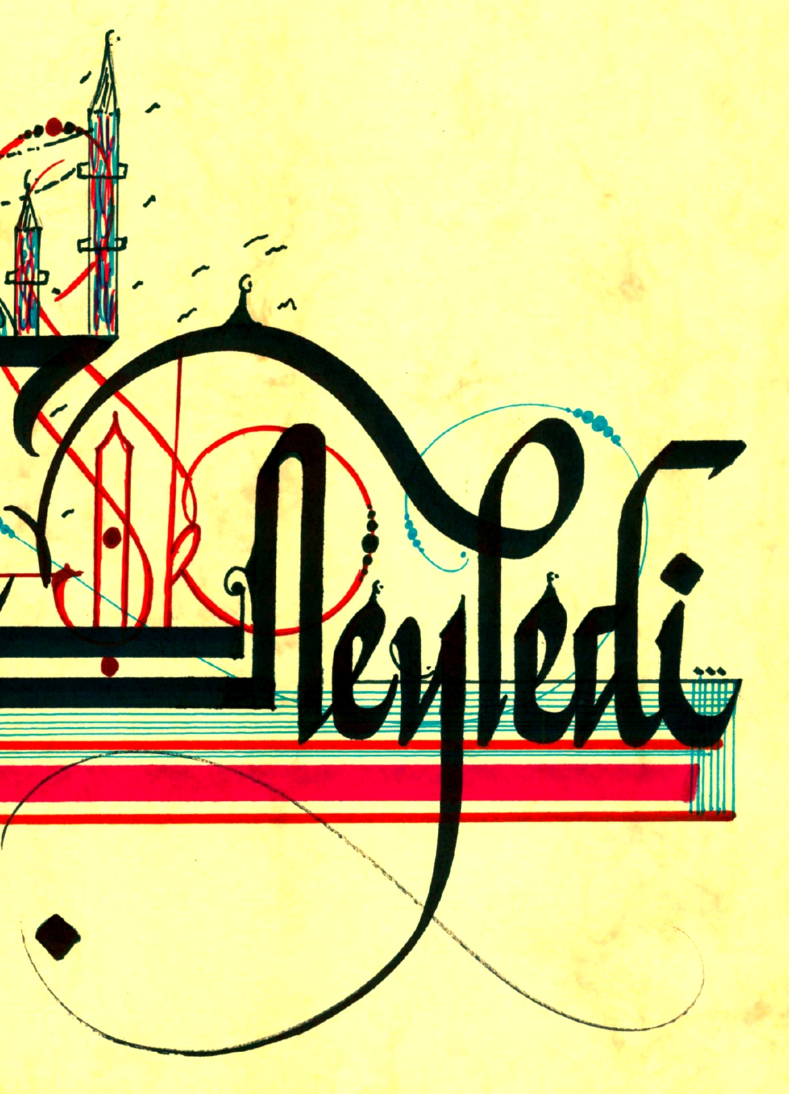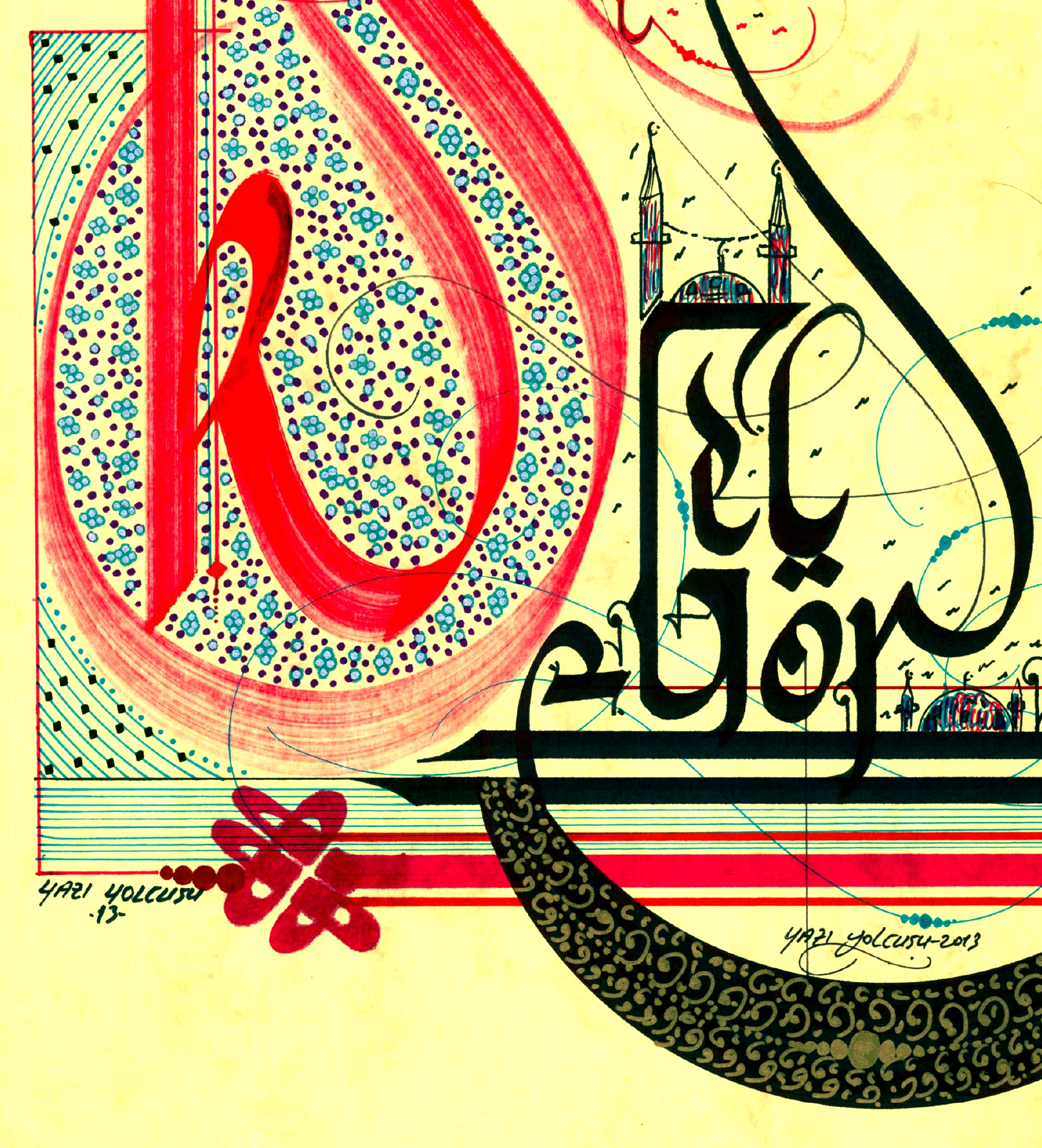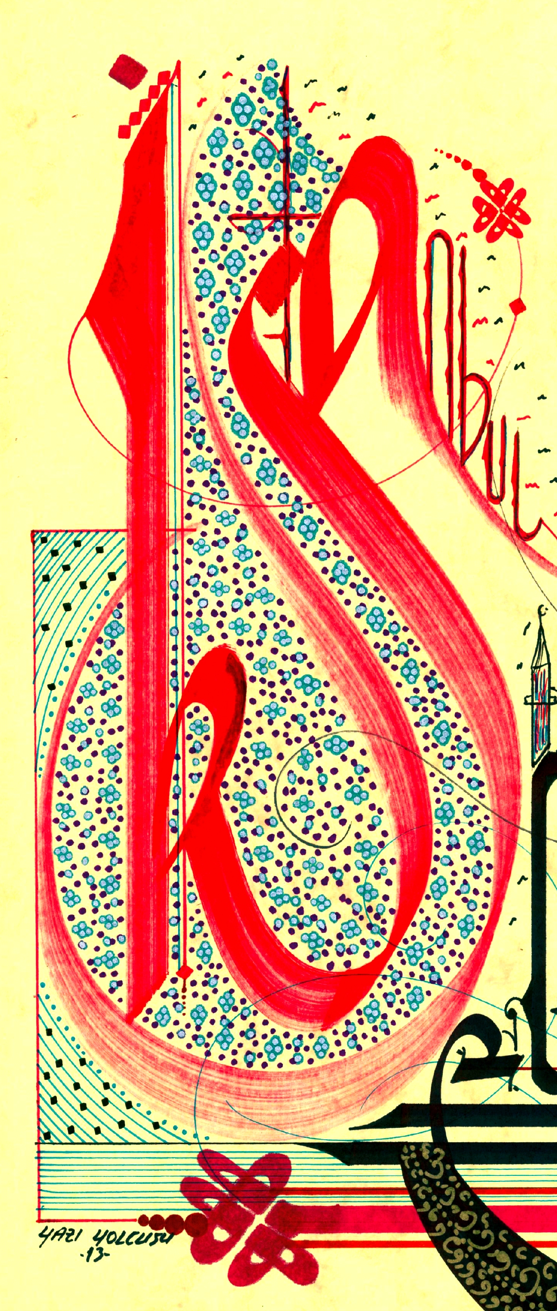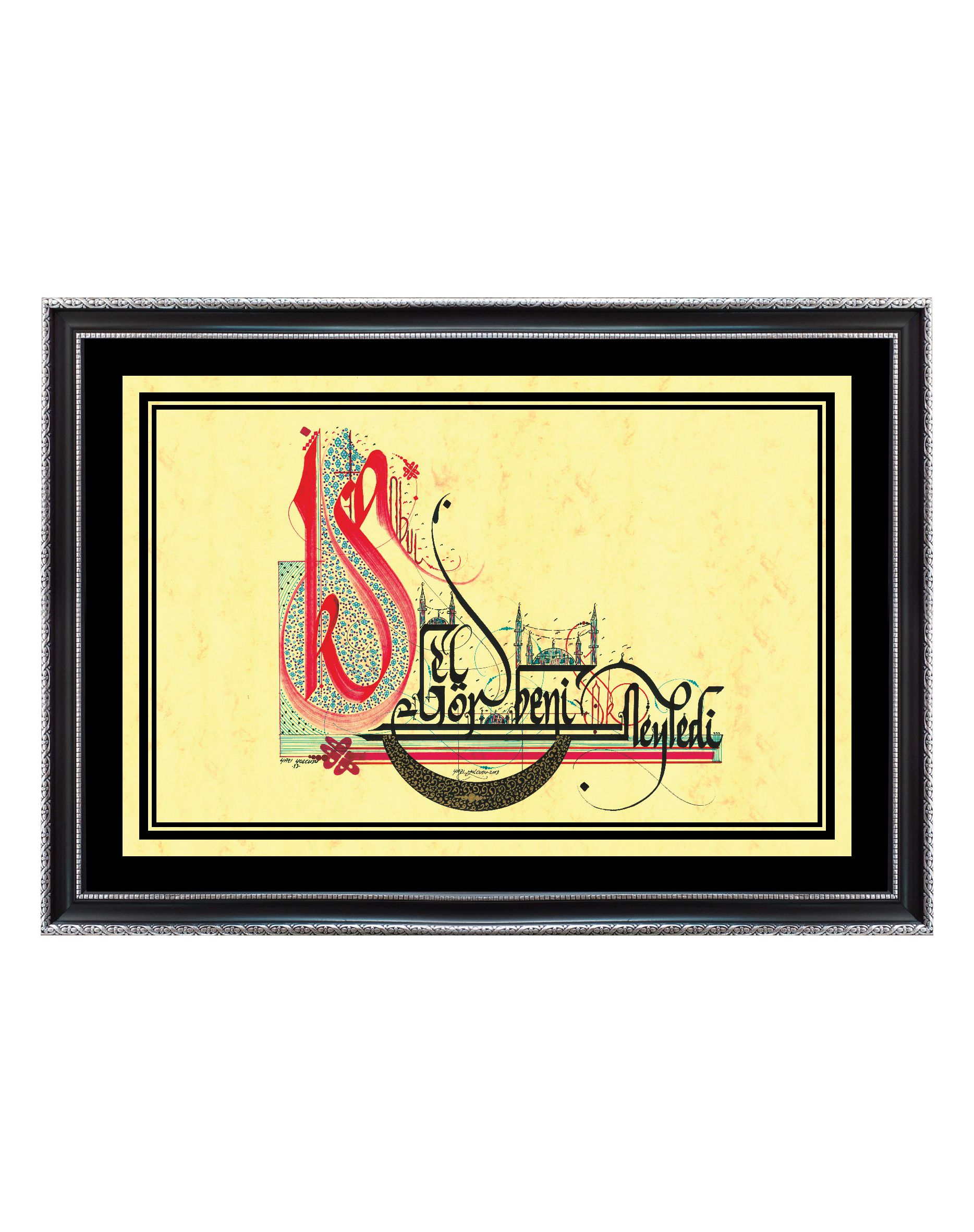 Sarı eskitme zemin üzerine Yunus Emre’nin “Gel gör beni aşk neyledi” sözü. Kırmızı renkli bölüm “Aşk” ve “İstanbul”. Harfler küçük motiflerle süslenerek estetik biçimde özgün eser halinde çalışıldı.