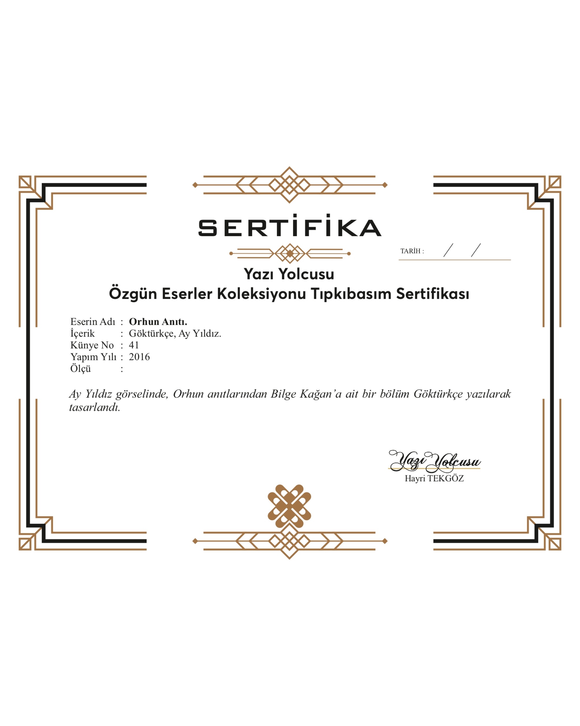 İç ölçü 48x26 cm. Camlı çerçeveli. Yüksek çözünürlükte tıpkıbasım. 2016 yılına ait Yazı Yolcusu özgün eserler koleksiyonundan sertifikalı. Gümüş, sarı ve siyah renk seçenekli çerçeve modelini lütfen belirtiniz. Fiyatlarımıza kargo ücreti ve %20 KDV tutarı dahildir.