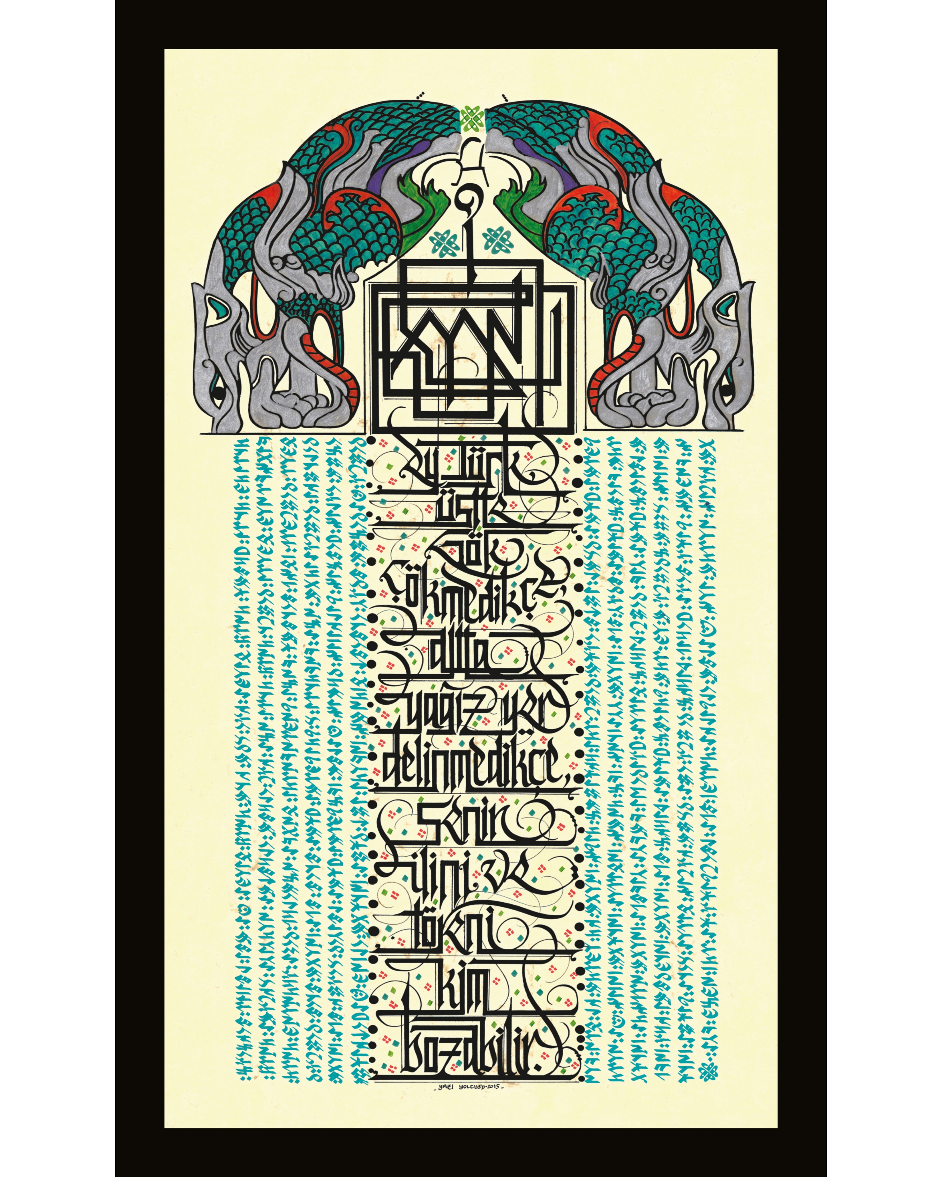 Orhun anıtlarından Kül Tigin ve Bilge Kağan yazıtları görselinde tasarlandı. Üstte çift başlı ejderha motifi, ejderha arasında labirent kufi yazı çeşidiyle Göktürkçe “Ey Türk” yazıyor. Sağ ve sol sütünlarda, açık mavi renkle Göktürkçe yazıtlardan bir bölüm yer alıyor. Yukarıdan aşağıya orta bölümde Bilge Kağan’ın sözü Türkçe yazılı. “Ey Türk, üstte gök çökmedikçe, altta yer delinmedikçe senin ilini ve töreni kim bozabilir”.