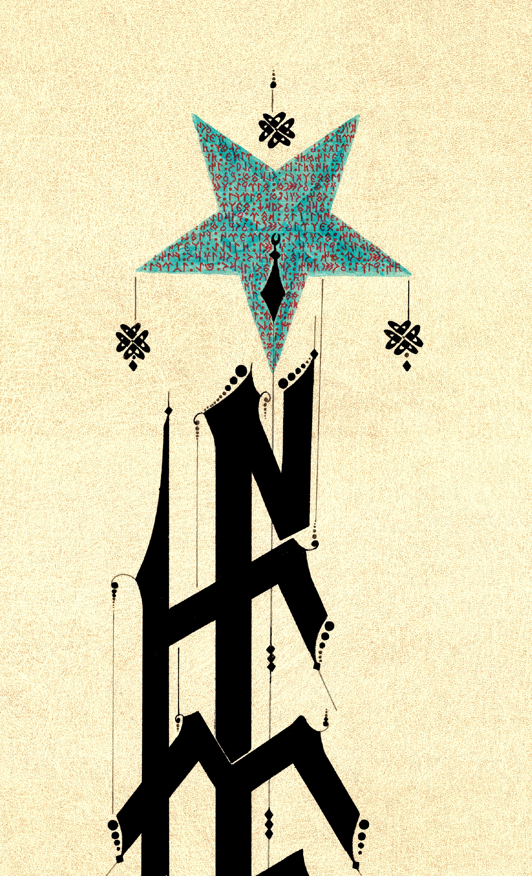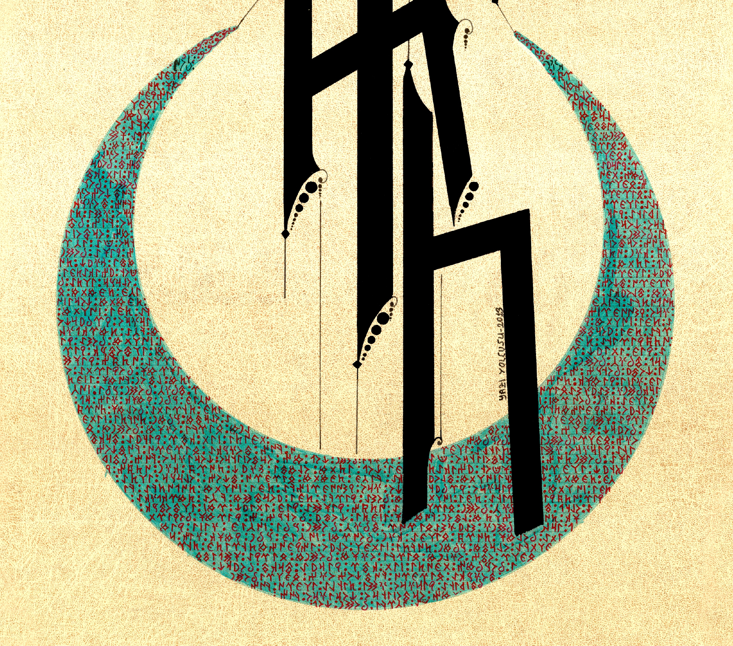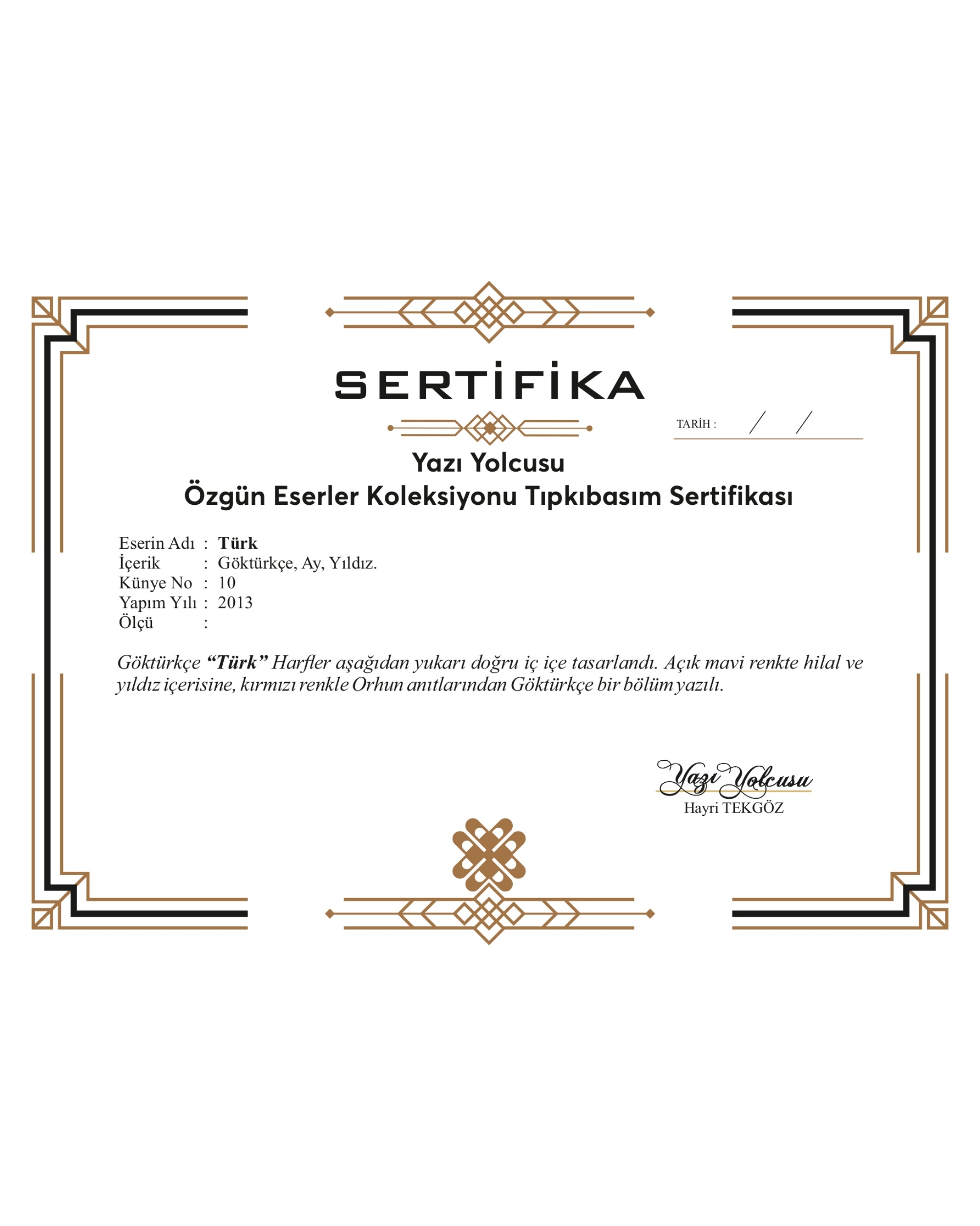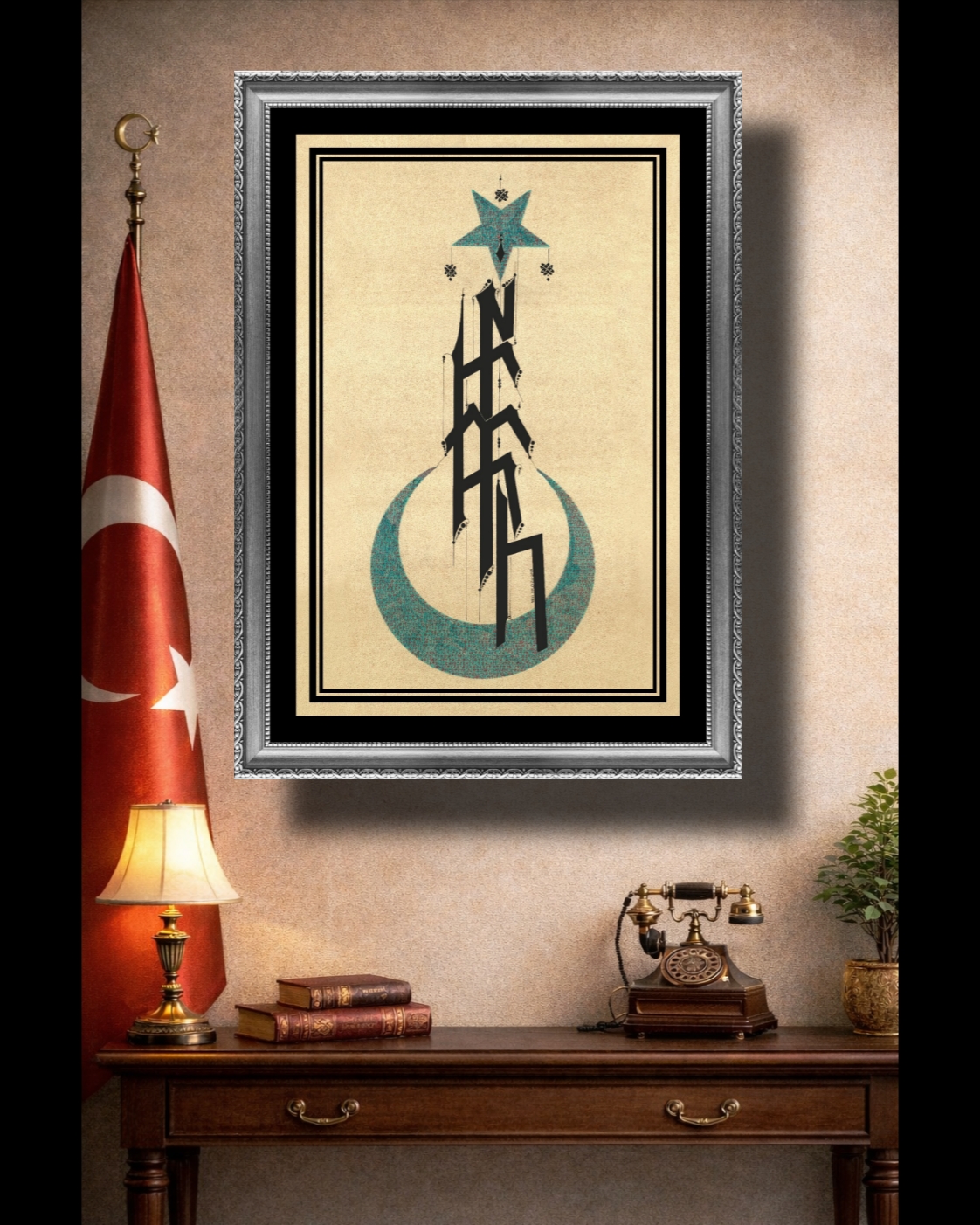 Göktürkçe “Türk”. Harfler aşağıdan yukarı doğru iç içe tasarlandı. Açık mavi renkte hilal ve yıldız içerisine, kırmızı renkle Orhun anıtlarından Göktürkçe bir bölüm yazılı.