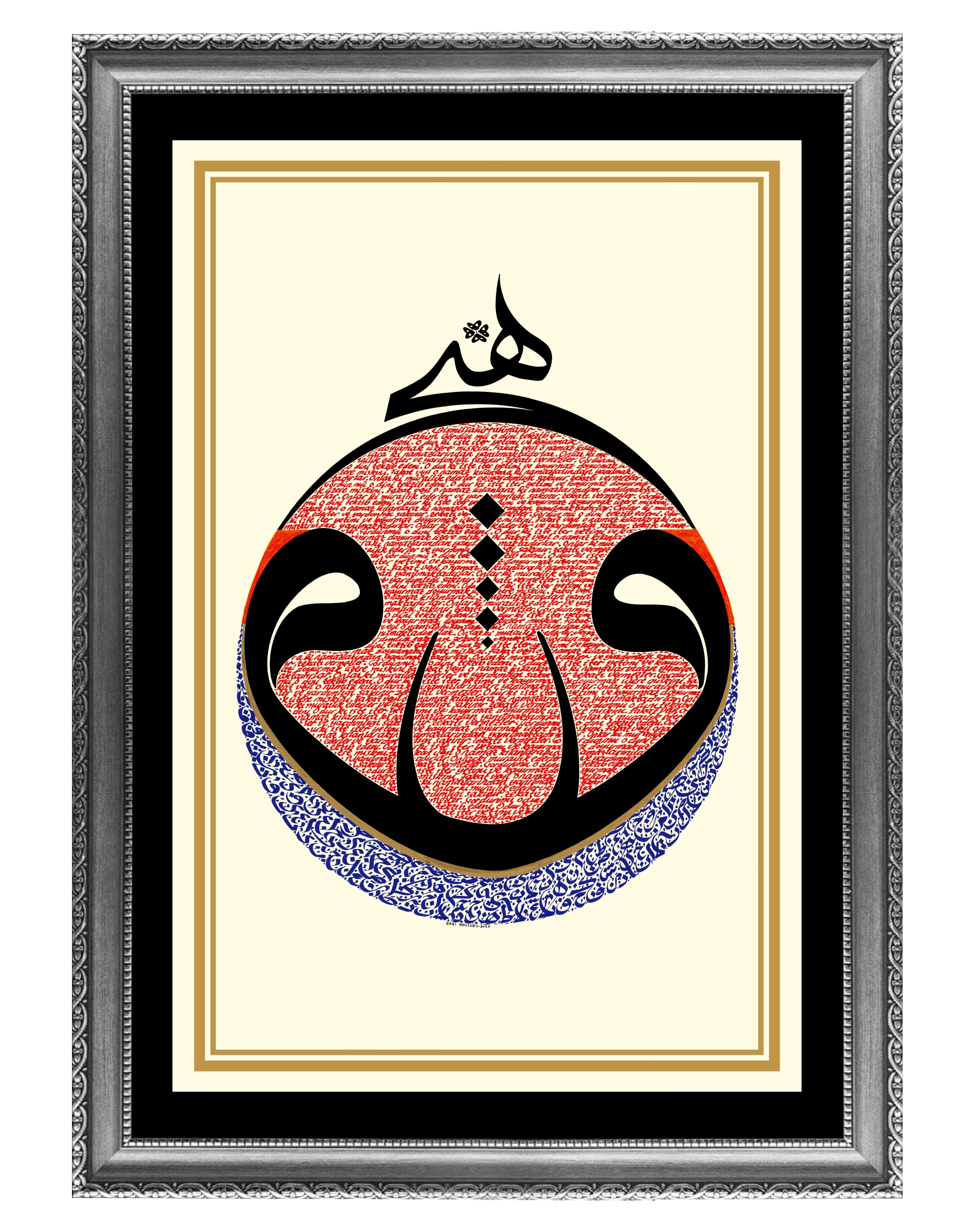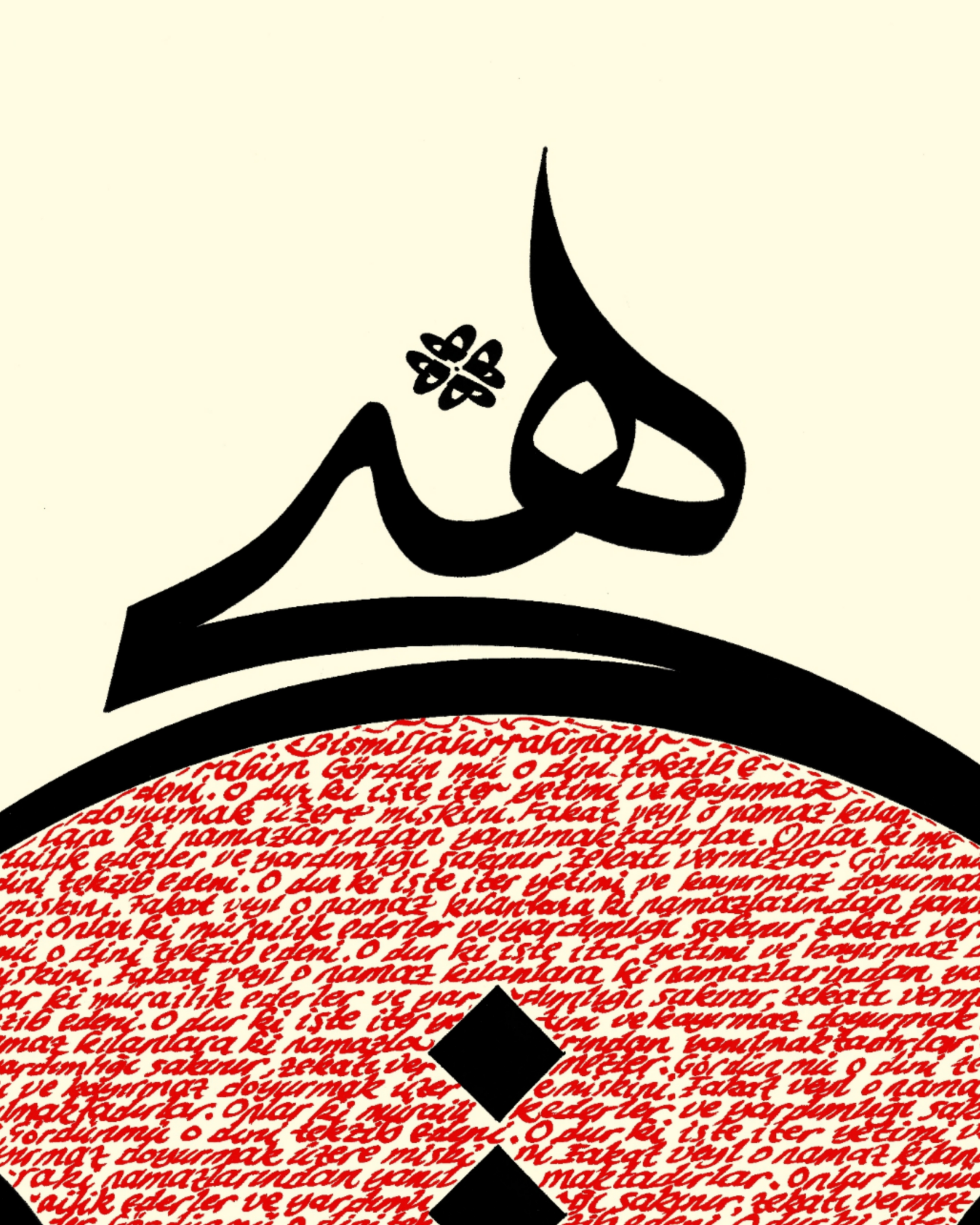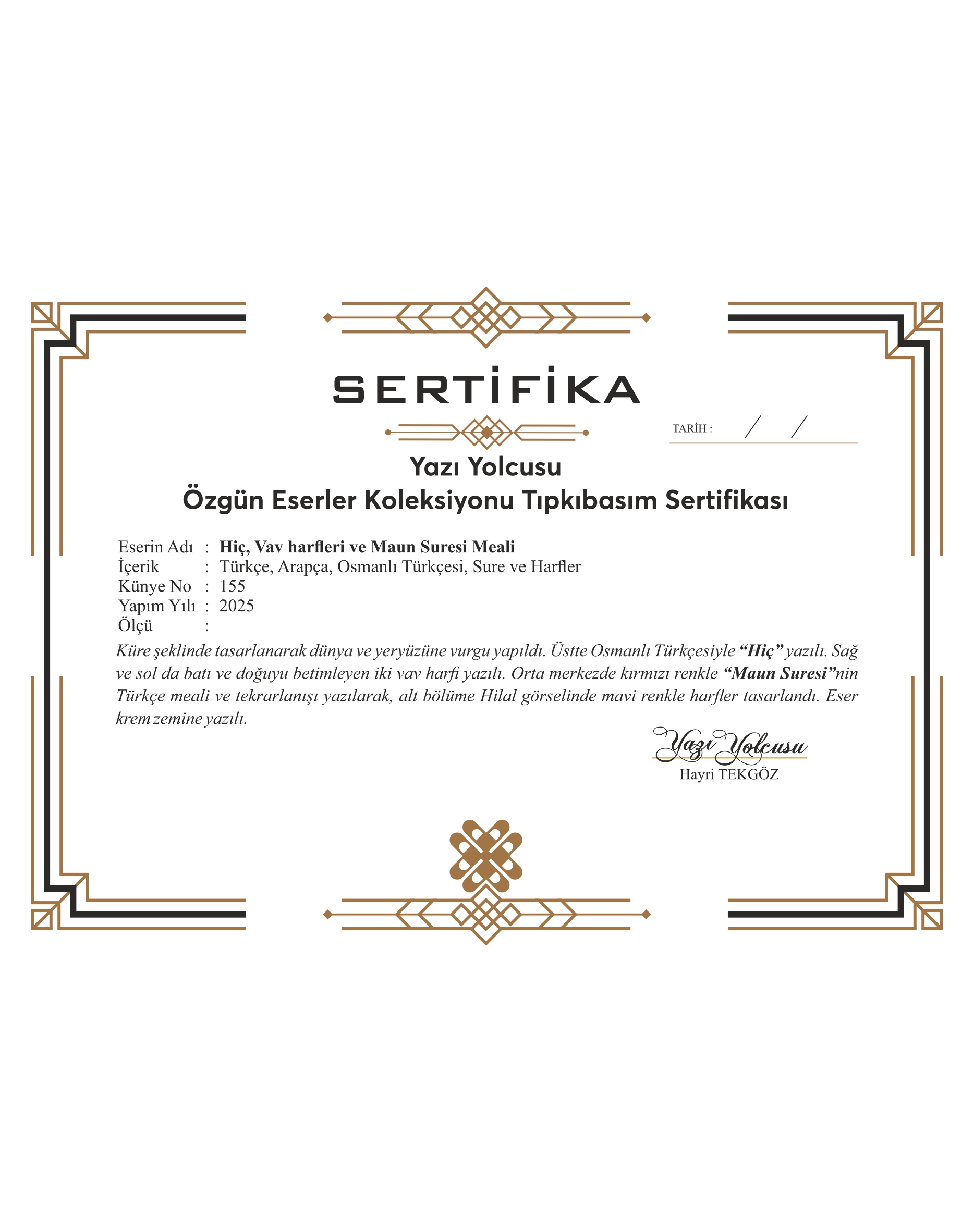 Hiç, Vav, Maun Suresi Meali. Küre şeklinde tasarlanarak dünya ve yeryüzüne vurgu yapıldı. Üstte Osmanlı Türkçesiyle “Hiç” yazılı. Sağ ve sol da batı ve doğuyu betimleyen iki vav harfi yazılı. Orta merkezde kırmızı renkle “Maun Suresi”nin Türkçe meali ve tekrarlanışı yazılarak alt bölüme Hilal görselinde mavi renkle harfler tasarlandı. Eser krem zemine yazılı.