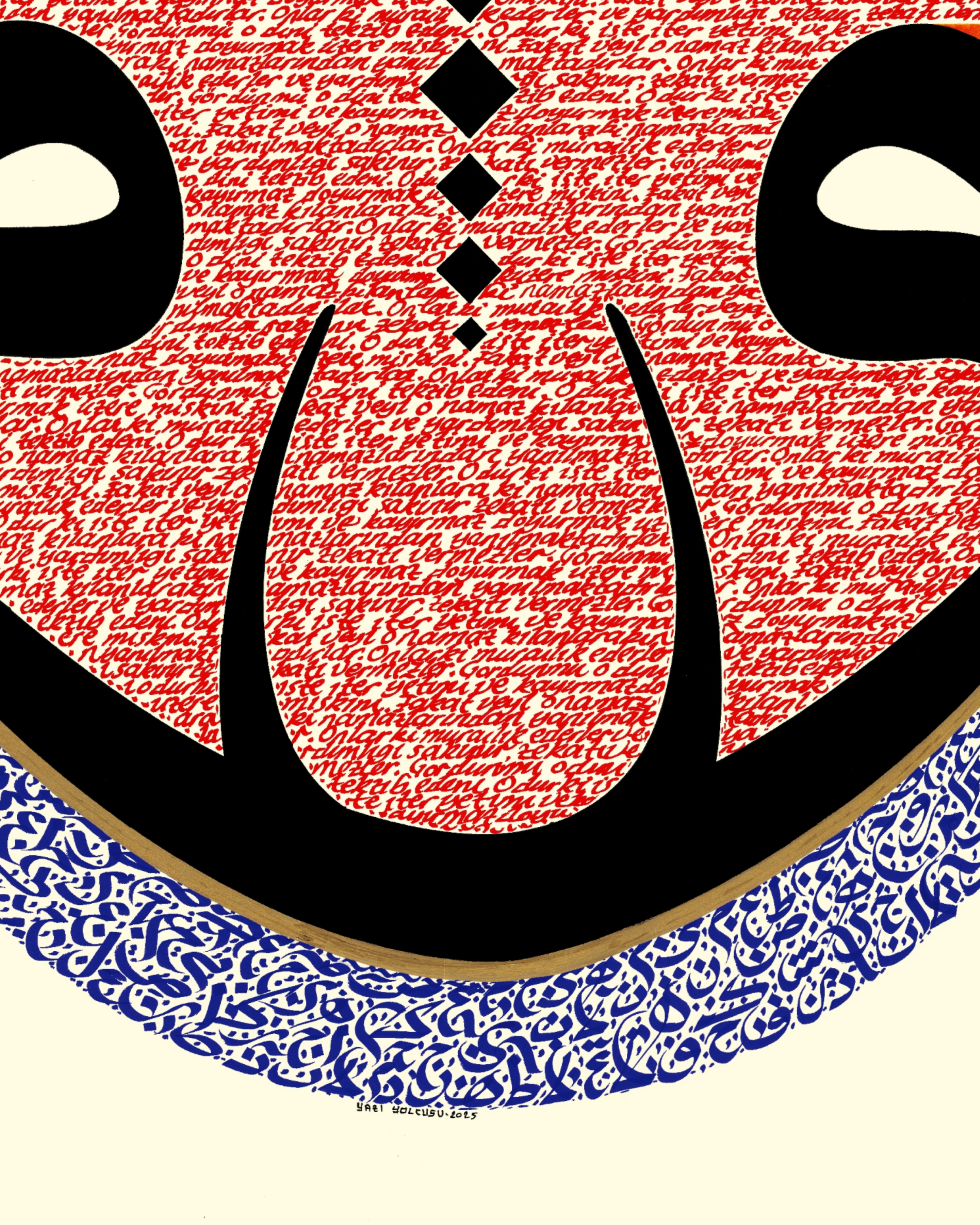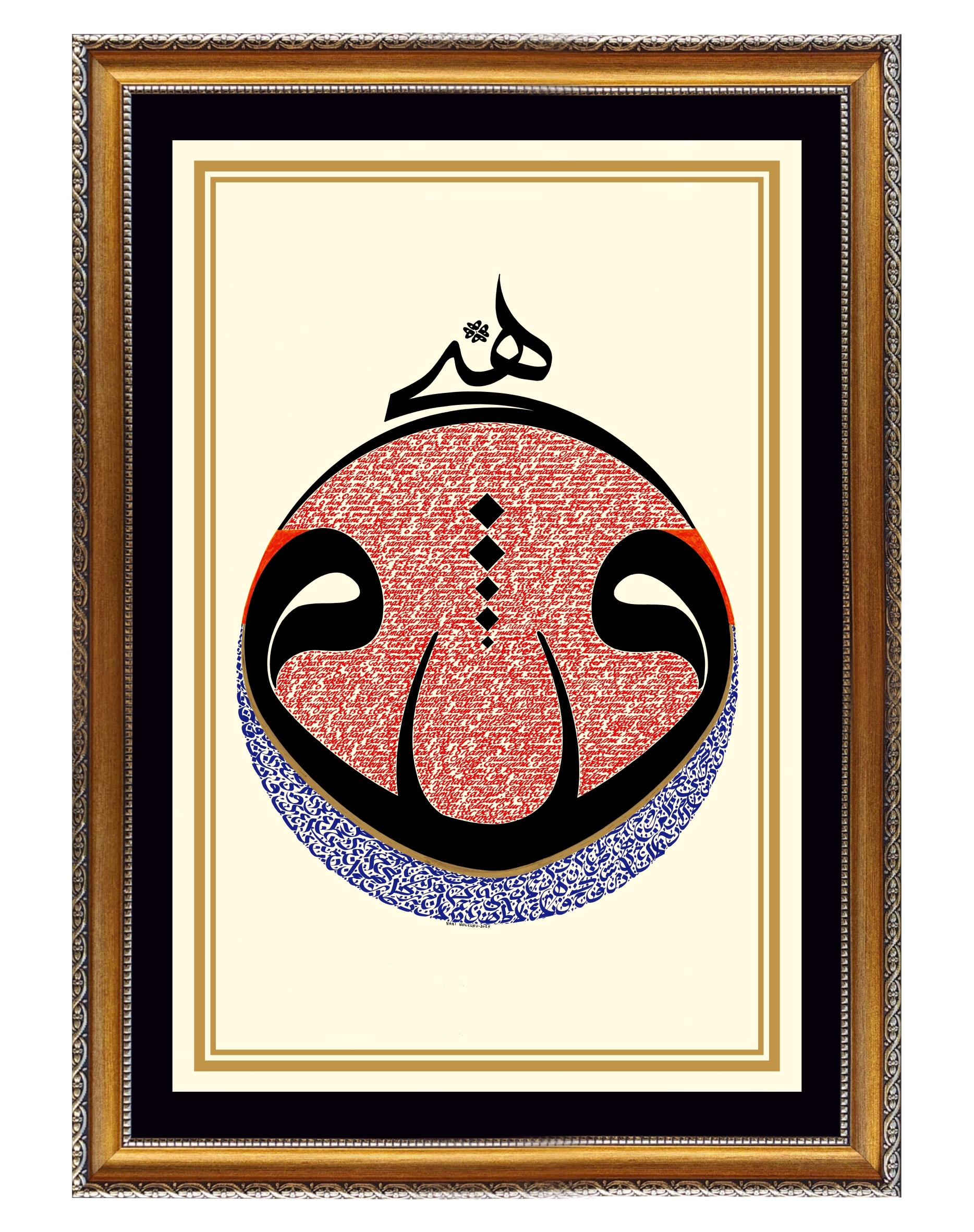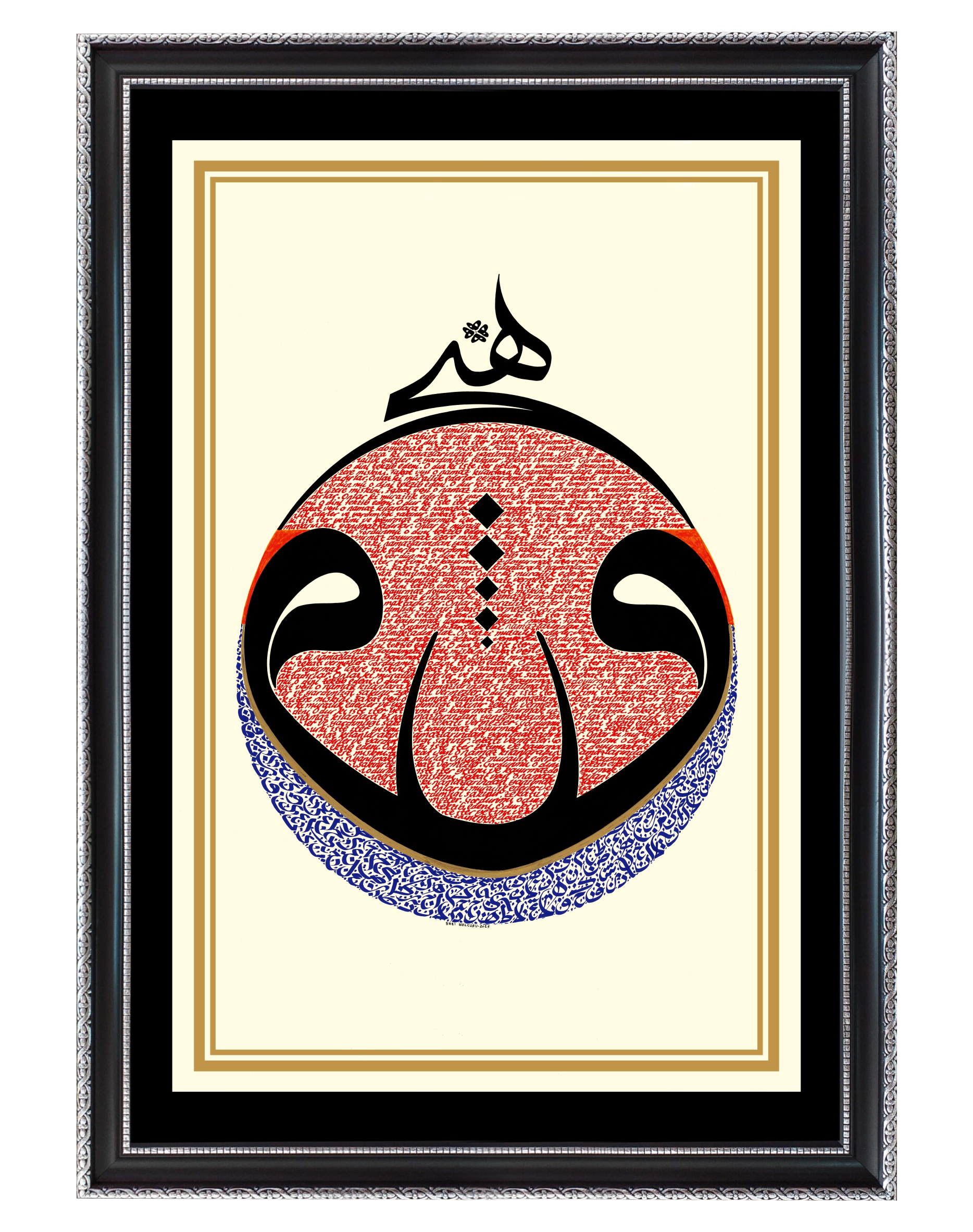 Hiç, Vav, Maun Suresi Meali. Küre şeklinde tasarlanarak dünya ve yeryüzüne vurgu yapıldı. Üstte Osmanlı Türkçesiyle “Hiç” yazılı. Sağ ve sol da batı ve doğuyu betimleyen iki vav harfi yazılı. Orta merkezde kırmızı renkle “Maun Suresi”nin Türkçe meali ve tekrarlanışı yazılarak alt bölüme Hilal görselinde mavi renkle harfler tasarlandı. Eser krem zemine yazılı.